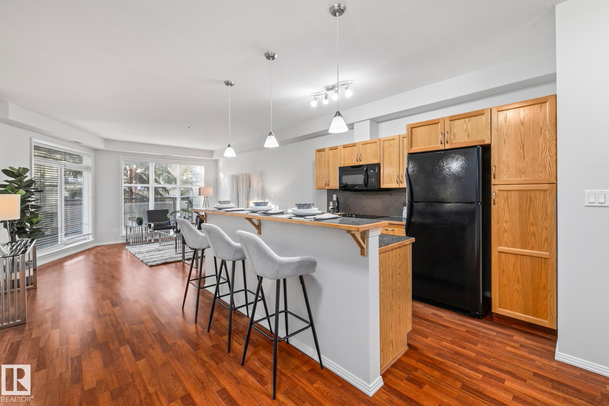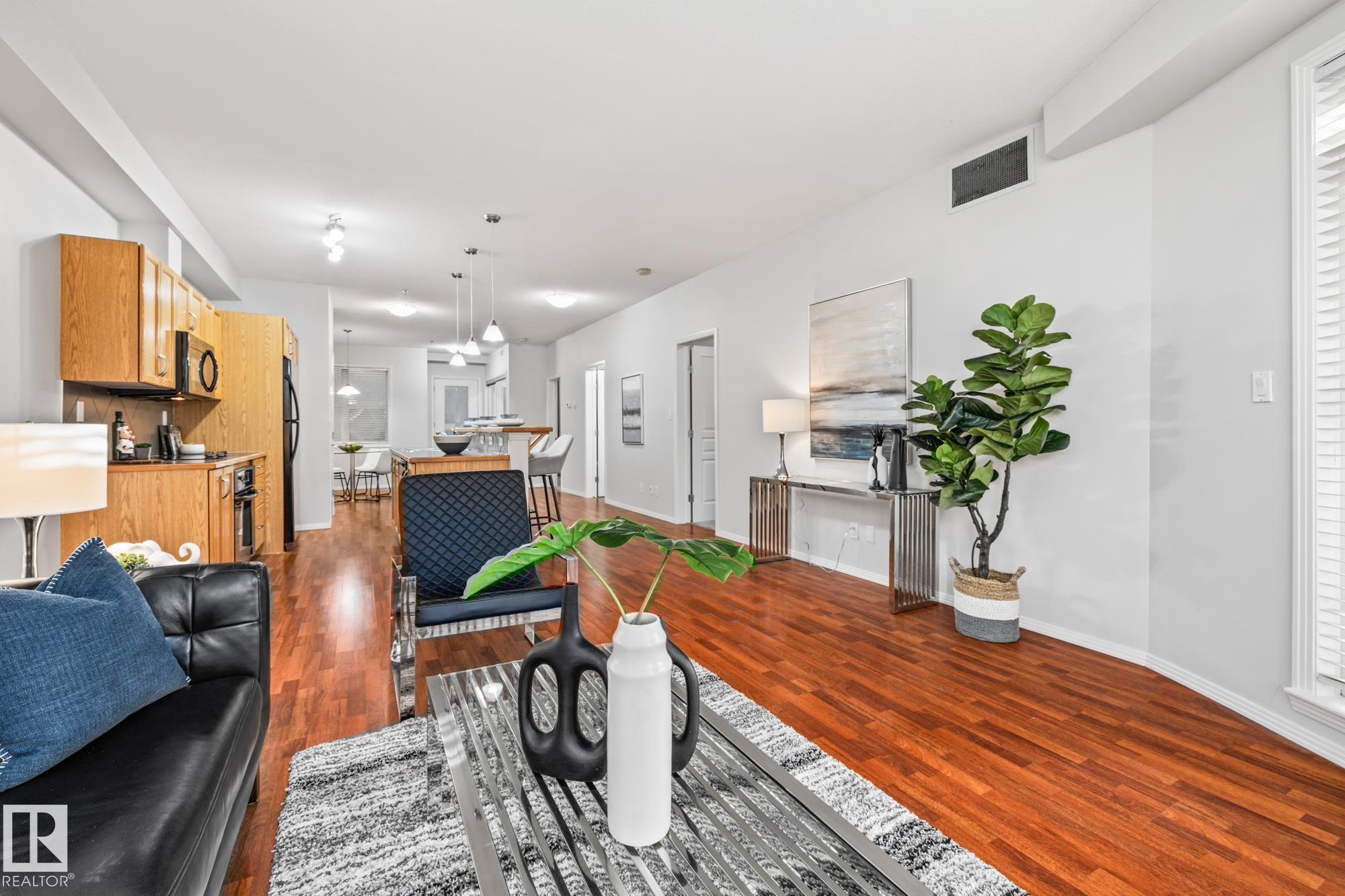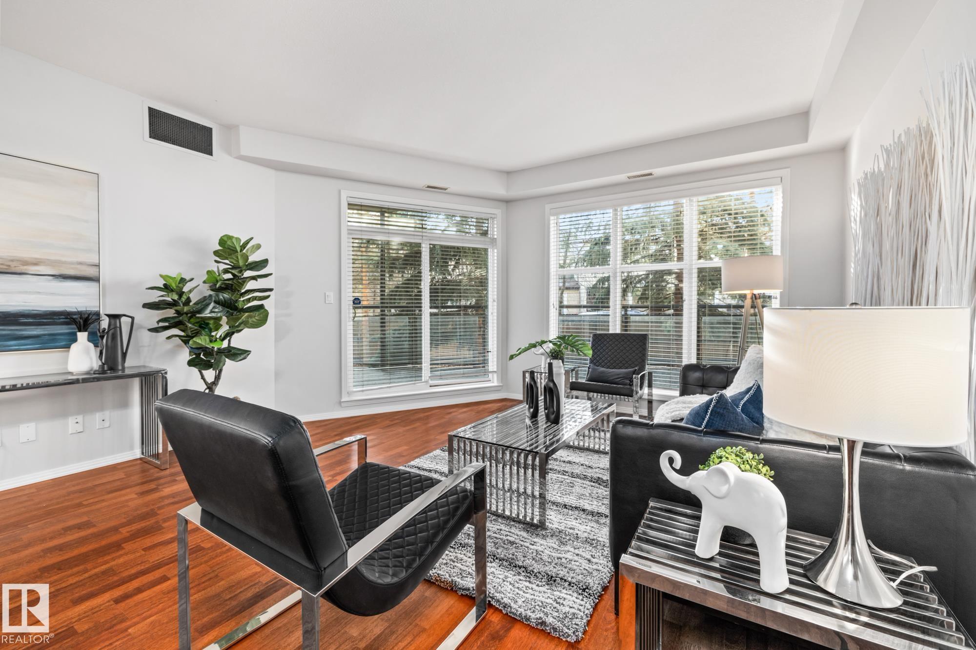 Presenting a flawless, newly refreshed condo with 1,052 sq ft and 10-foot ceilings?a must-see! This is not a typical ground-floor unit; the private, south-facing balcony is raised, providing an elevated outdoor retreat over landscaping. The open living area features laminate floors and vast windows, ensuring a bright setting. The kitchen includes all appliances and a large eat-at island. Step out to your raised, secluded balcony?a peaceful spot for sun and relaxation. The unit offers two bedrooms, including a large main suite with a walk-in closet and a three-piece ensuite (walk-in shower). The second room is ideal as a study or den. Convenience items include a four-piece main bath, in-suite laundry, and a storage locker. A sought-after titled tandem parking stall fits two vehicles! Located perfectly, you get high walkability with easy access to groceries, shops (including the Italian Centre), and major roadways. Don't miss this opportunity for a great home in the prime community of Empire Park!