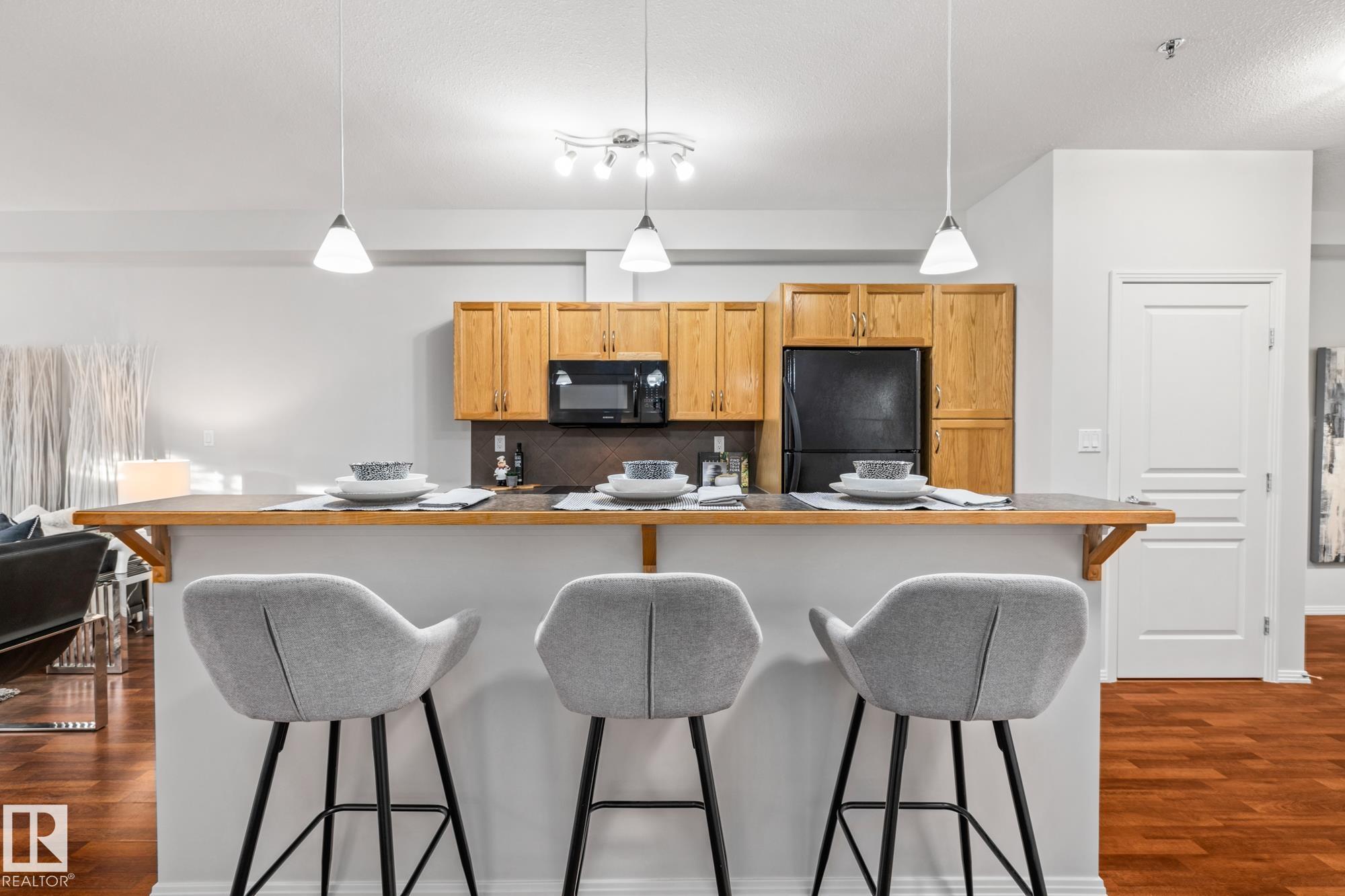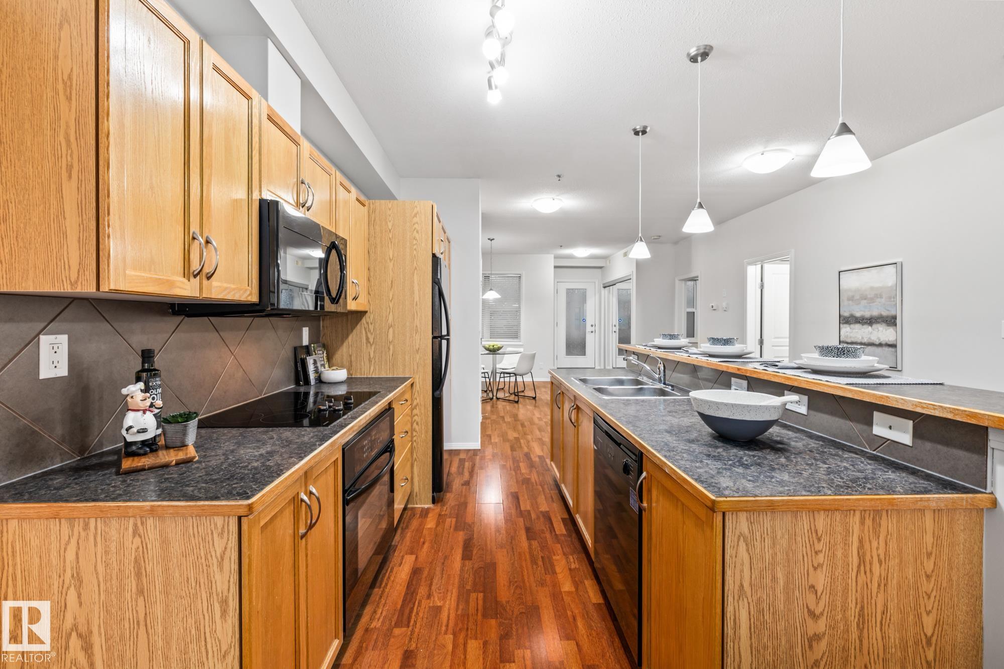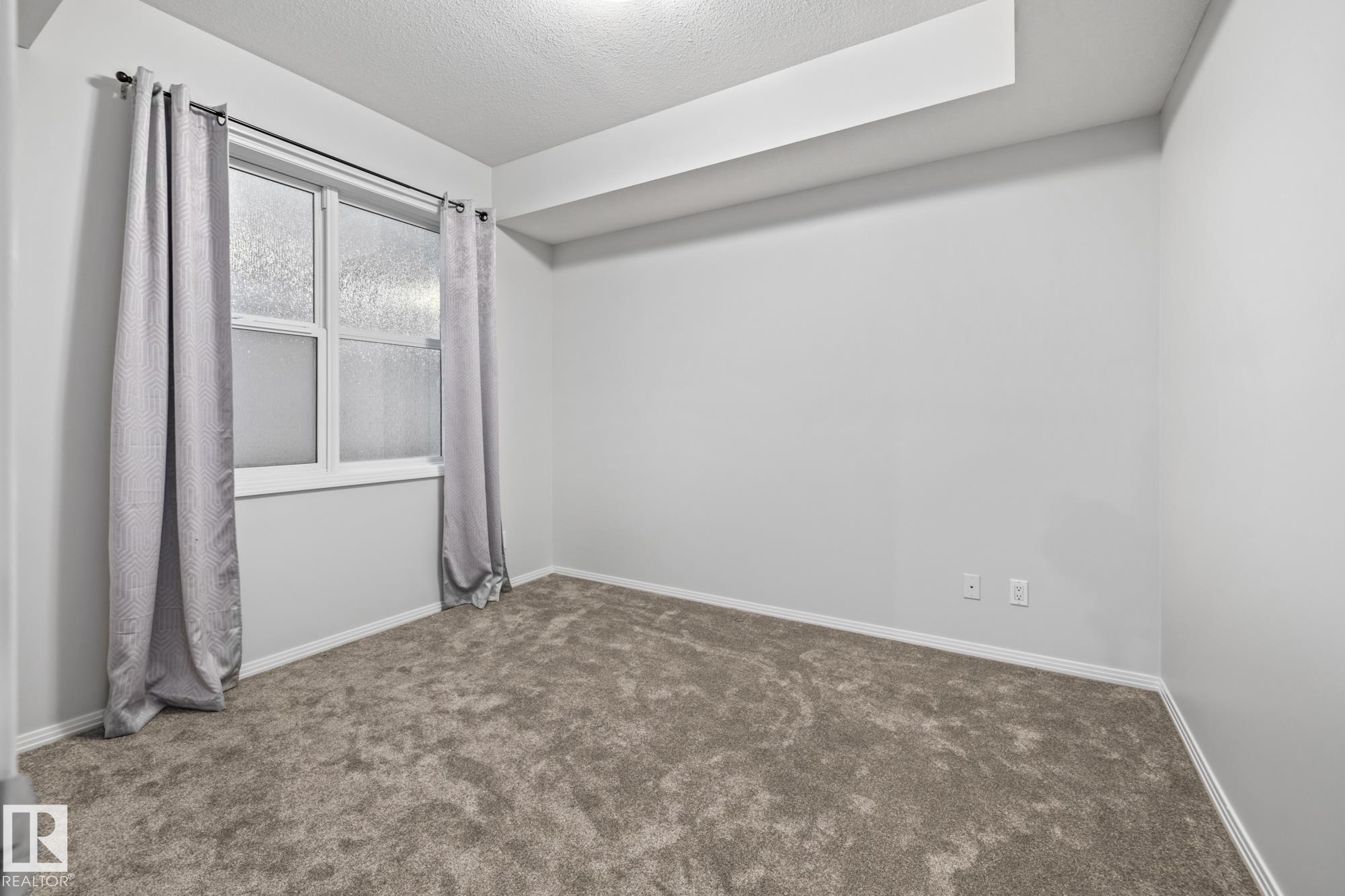 Presenting a flawless, newly refreshed condo with 1,052 sq ft and 10-foot ceilings?a must-see! This is not a typical ground-floor unit; the private, south-facing balcony is raised, providing an elevated outdoor retreat over landscaping. The open living area features laminate floors and vast windows, ensuring a bright setting. The kitchen includes all appliances and a large eat-at island. Step out to your raised, secluded balcony?a peaceful spot for sun and relaxation. The unit offers two bedrooms, including a large main suite with a walk-in closet and a three-piece ensuite (walk-in shower). The second room is ideal as a study or den. Convenience items include a four-piece main bath, in-suite laundry, and a storage locker. A sought-after titled tandem parking stall fits two vehicles! Located perfectly, you get high walkability with easy access to groceries, shops (including the Italian Centre), and major roadways. Don't miss this opportunity for a great home in the prime community of Empire Park!