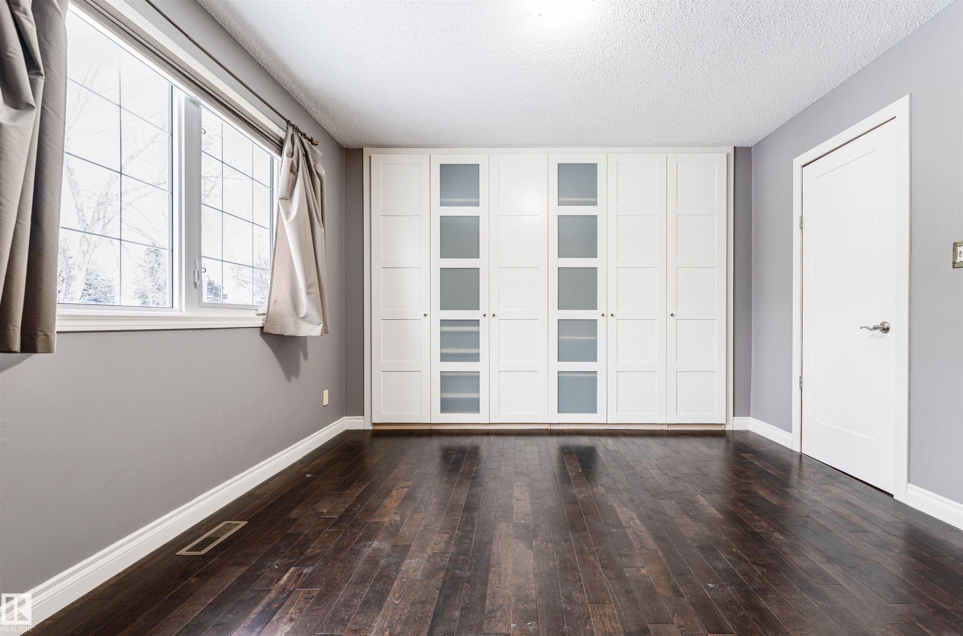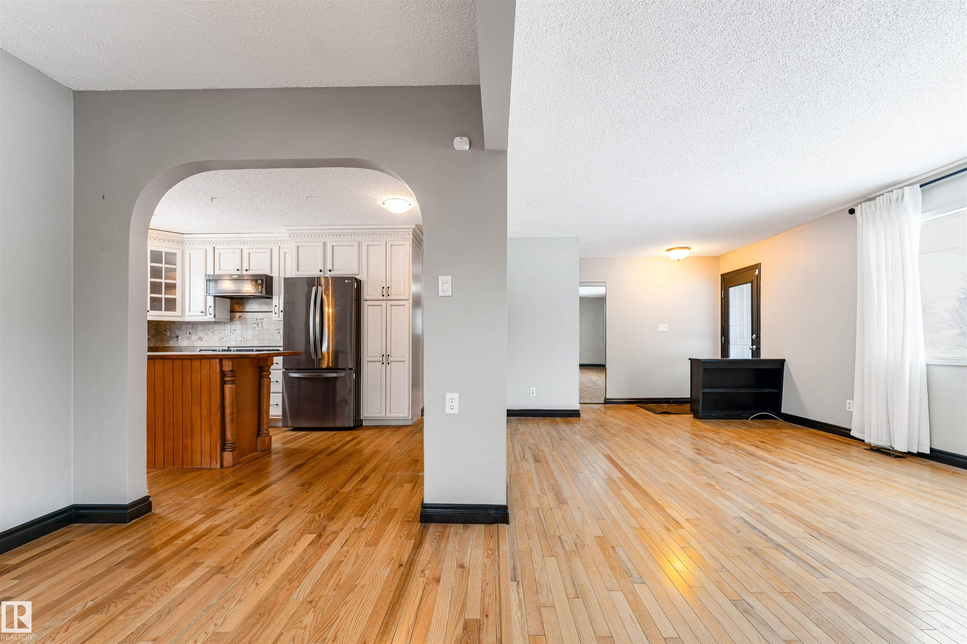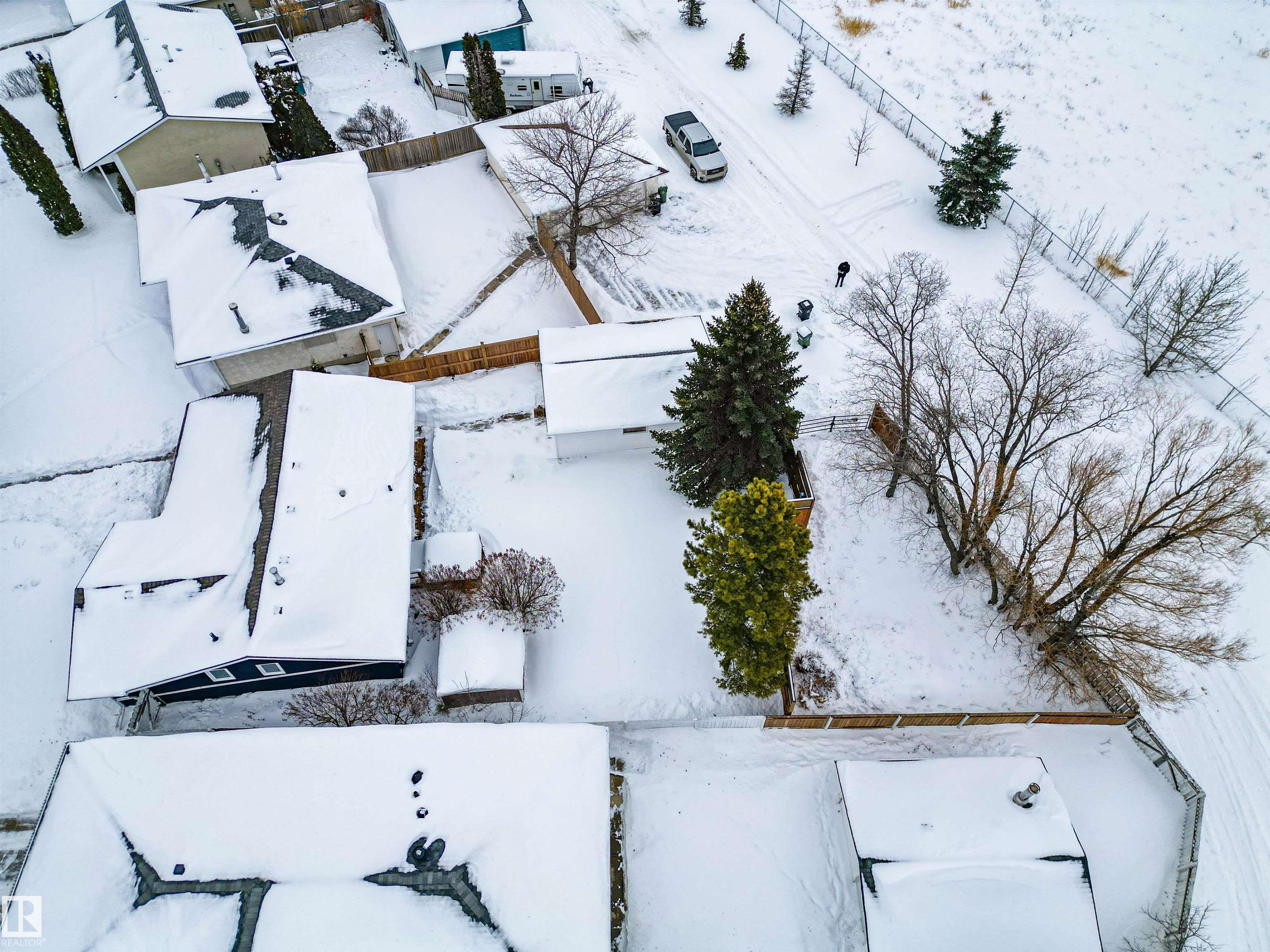 Well-maintained bungalow on a large pie-shaped lot with no rear neighbours, close to schools & parks, with easy road access out of town. The main floor features hardwood flooring, an upgraded kitchen, three bedrooms, and a 1.5 bath layout including a full bathroom with tub/shower and a primary bedroom with ensuite & custom built-in closet system. The functional layout offers comfortable everyday living with excellent natural light. The fully developed basement includes a spacious rec room, enclosed bar area, two additional rooms suitable for a variety of uses such as office, hobby, or flex space, and a full bathroom with shower. Recent updates include newer furnace, hot water tank & shingles. Outside, the private backyard features mature trees, an 8? privacy fence, deck & hot tub. Beyond the privacy fence is a separate fenced section with a wide gate, offering excellent space for trailers, RVs, or additional storage. Double detached garage with rear lane access.