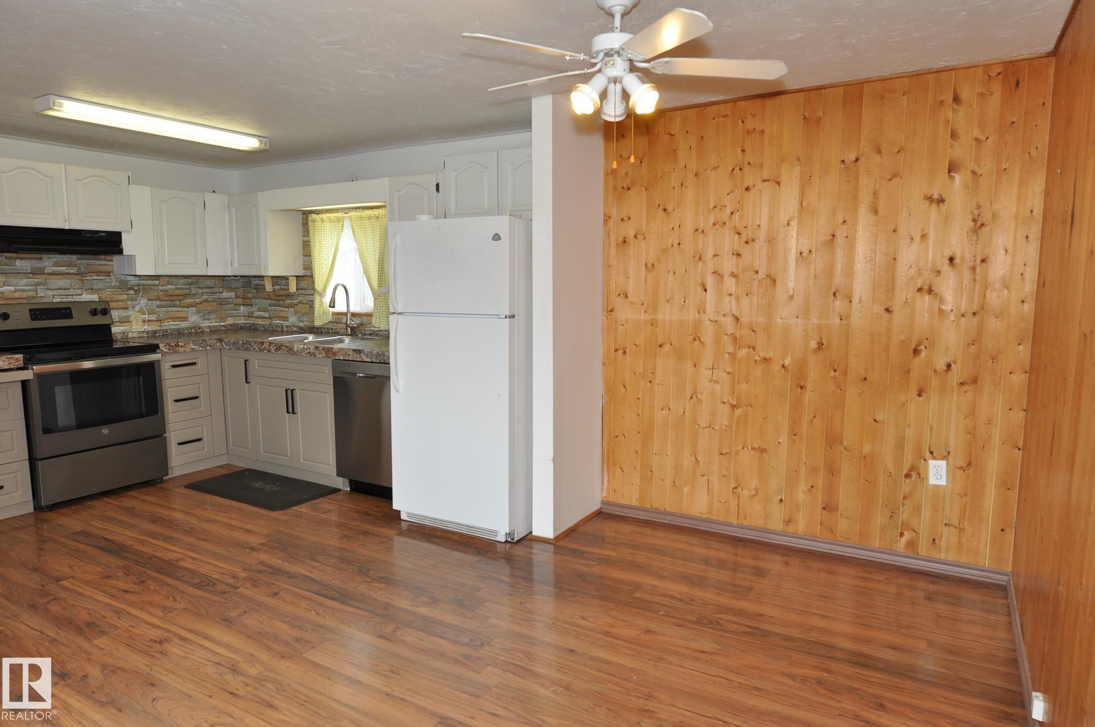 AFFORDABLE LIVING IN GIBBONS! This lovely two-bedroom, one-bathroom mobile home located in the Gibbons Mobile Home Park offers a cozy and updated living. The home features real pine wood walls and laminate floors throughout. The wood walls can be left natural or be painted if desired. The open-concept kitchen boasts plenty of updated cabinets with a built-in cutting board, stylish backsplash, a new stainless steel dishwasher, a pantry, and a window above the sink. There's also ample room for a storage cabinet and kitchen table with chairs. The spacious living room has three large windows and plenty of space for your furniture. Down the hall you'll find a four-piece bathroom, a laundry area, and two good-sized bedrooms, with the primary bedroom featuring a walk-in closet. Outside, the fully fenced and landscaped yard includes an apple tree, a small deck and shed. More updates include siding, roof, fence, decks and exterior doors. This affordable little gem won't last long so don't wait, come see it today!