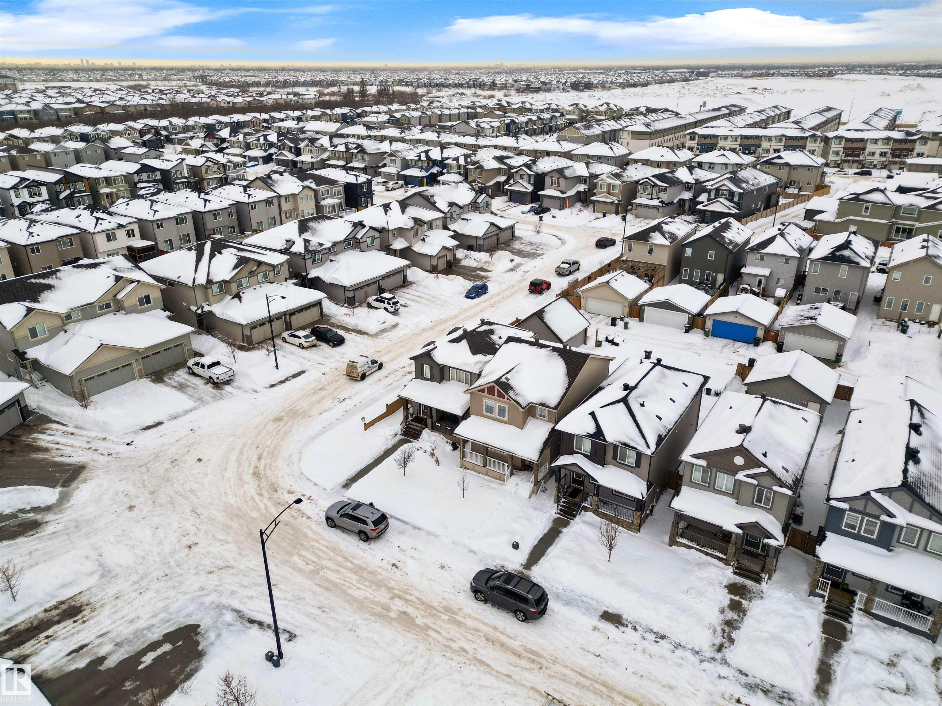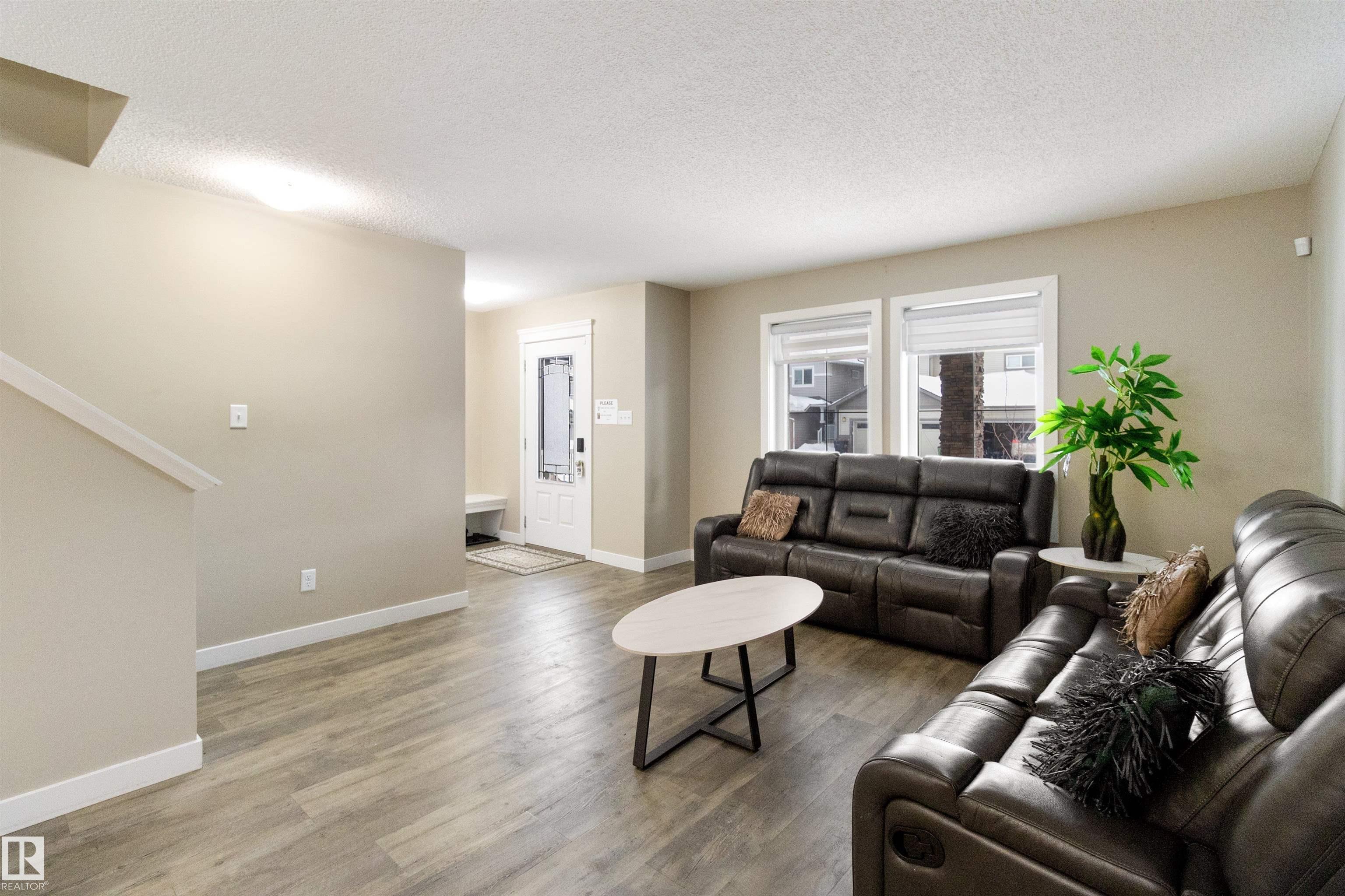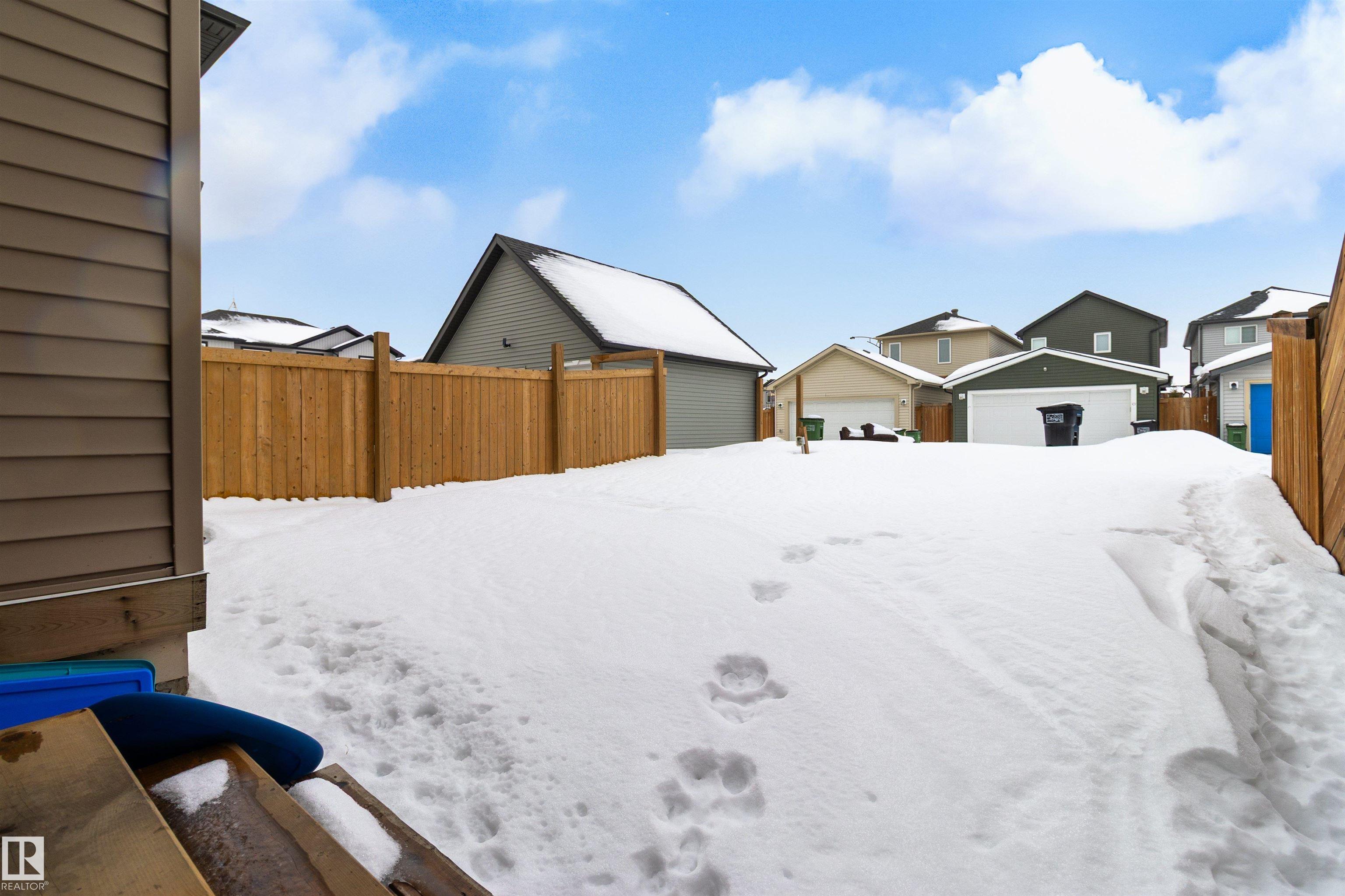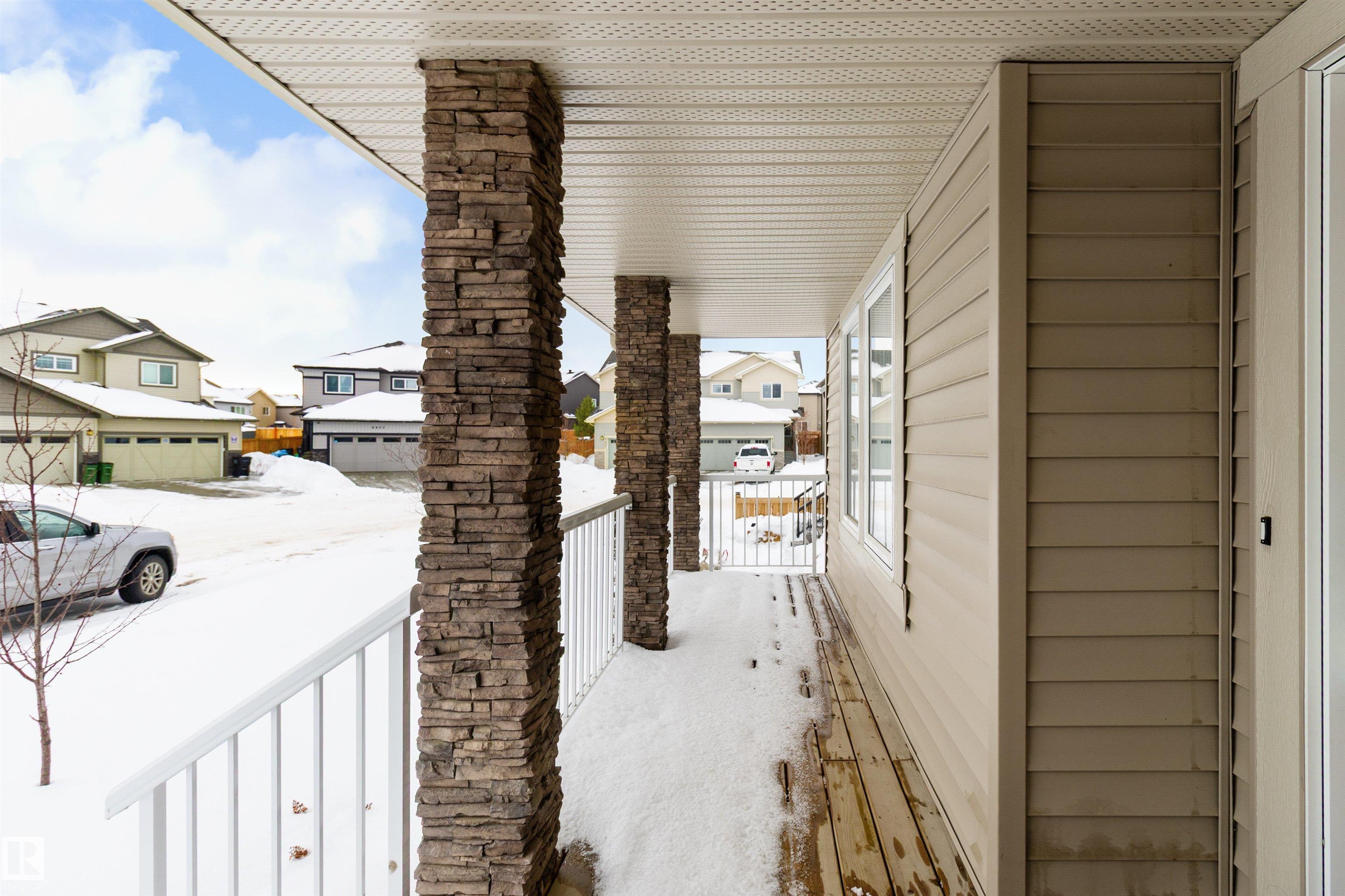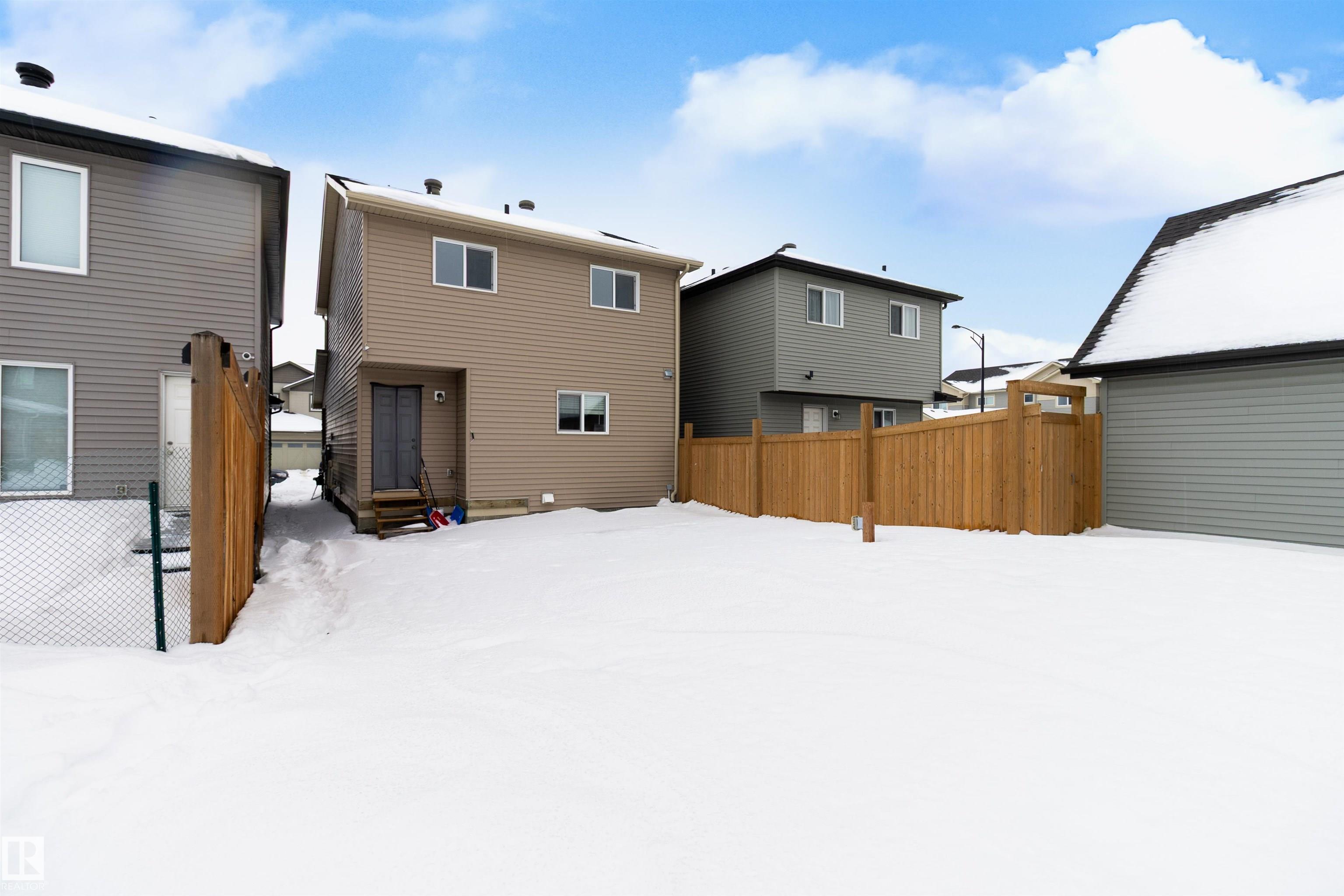 Welcome to this beautiful open-concept home in sought-after McConachie! Featuring a charming front porch, this property offers both style and functionality. The main floor boasts a bright, open layout with a spacious living room, eating nook, and a modern kitchen complete with quartz countertops, stainless steel appliances, ample cabinetry, and a large island with drawers?perfect for everyday living and entertaining. Additional main-floor conveniences include a 2-piece bath, laundry area, and rear entrance. Durable vinyl plank flooring complements the main level, with carpet throughout the upper floor. Upstairs, the generous primary bedroom features a walk-in closet and a 5-piece ensuite. Two additional well-sized bedrooms and a 4-piece main bath complete the second level. The unfinished basement offers excellent future development potential. Outside, the yard includes side fencing and a cement parking pad with power. Close to parks, schools, shopping, and amenities in a family-friendly area.