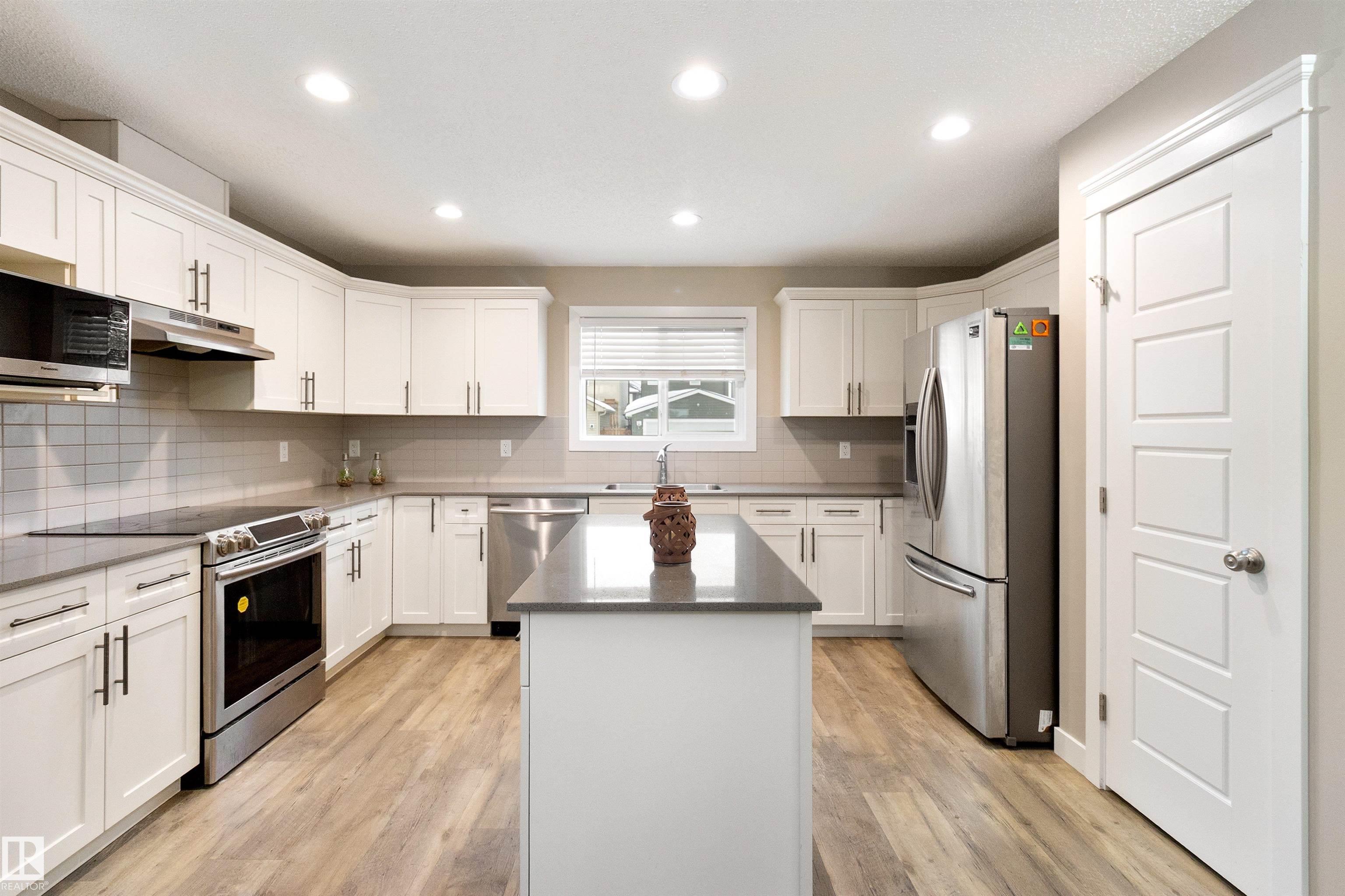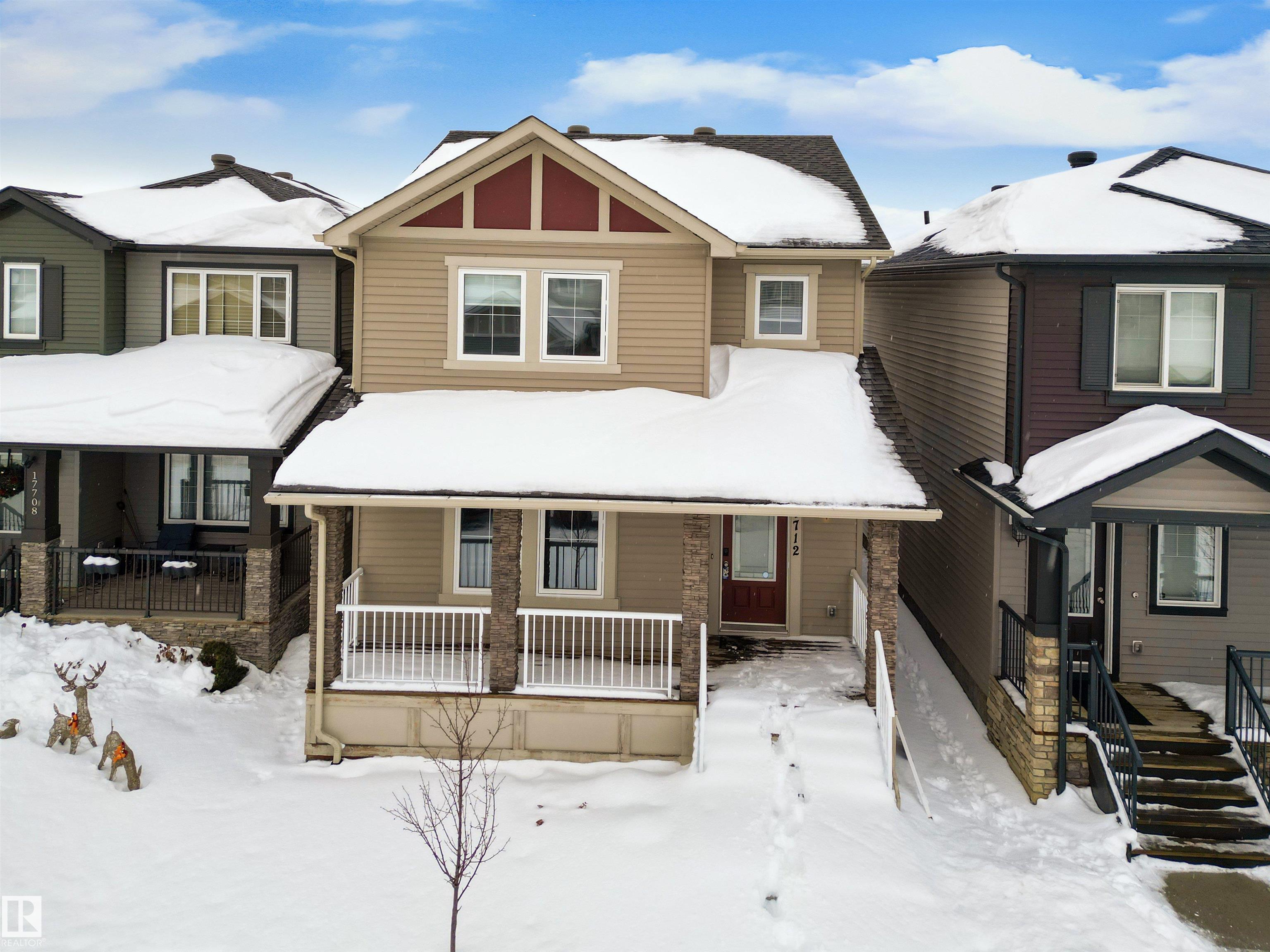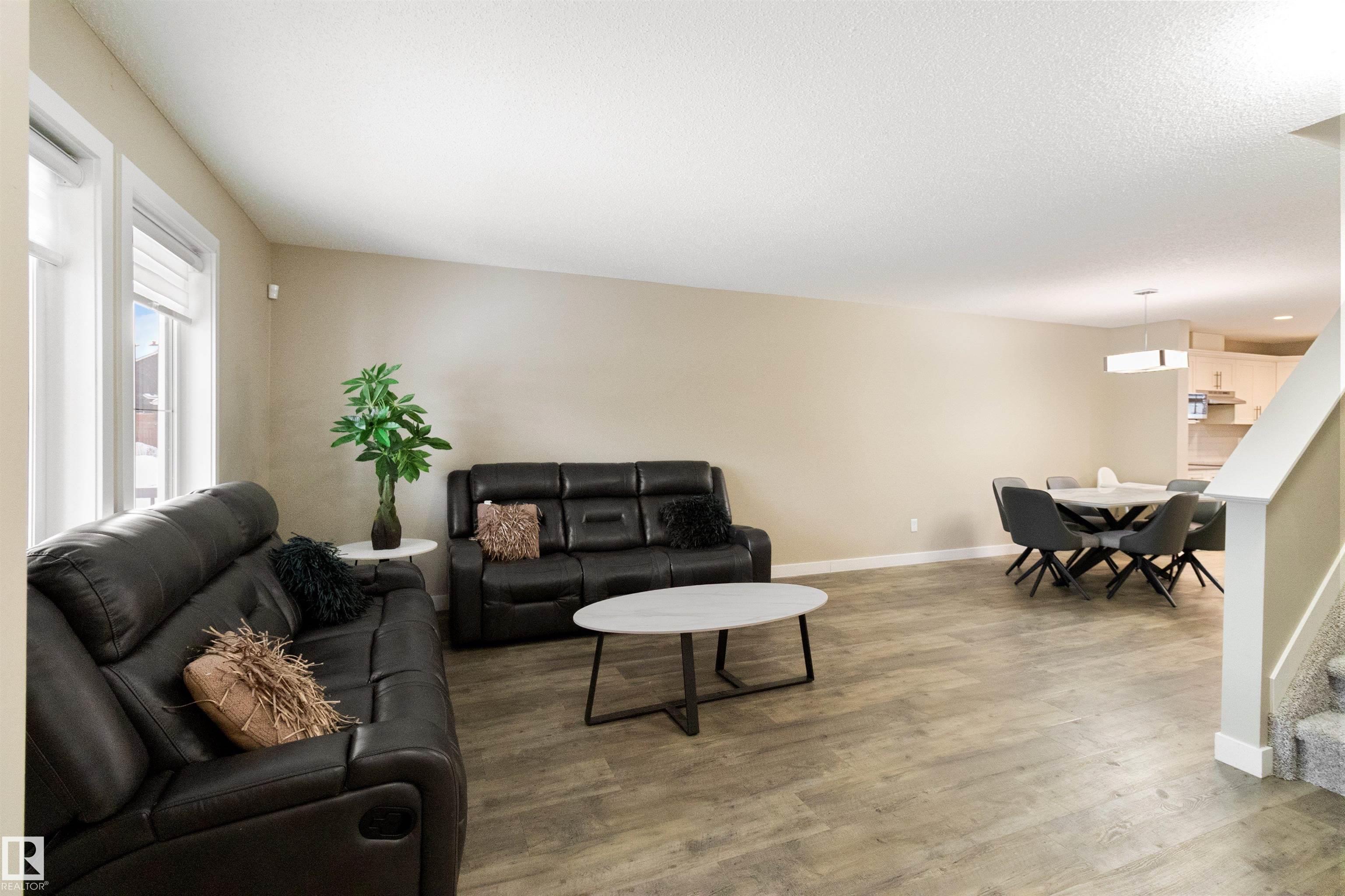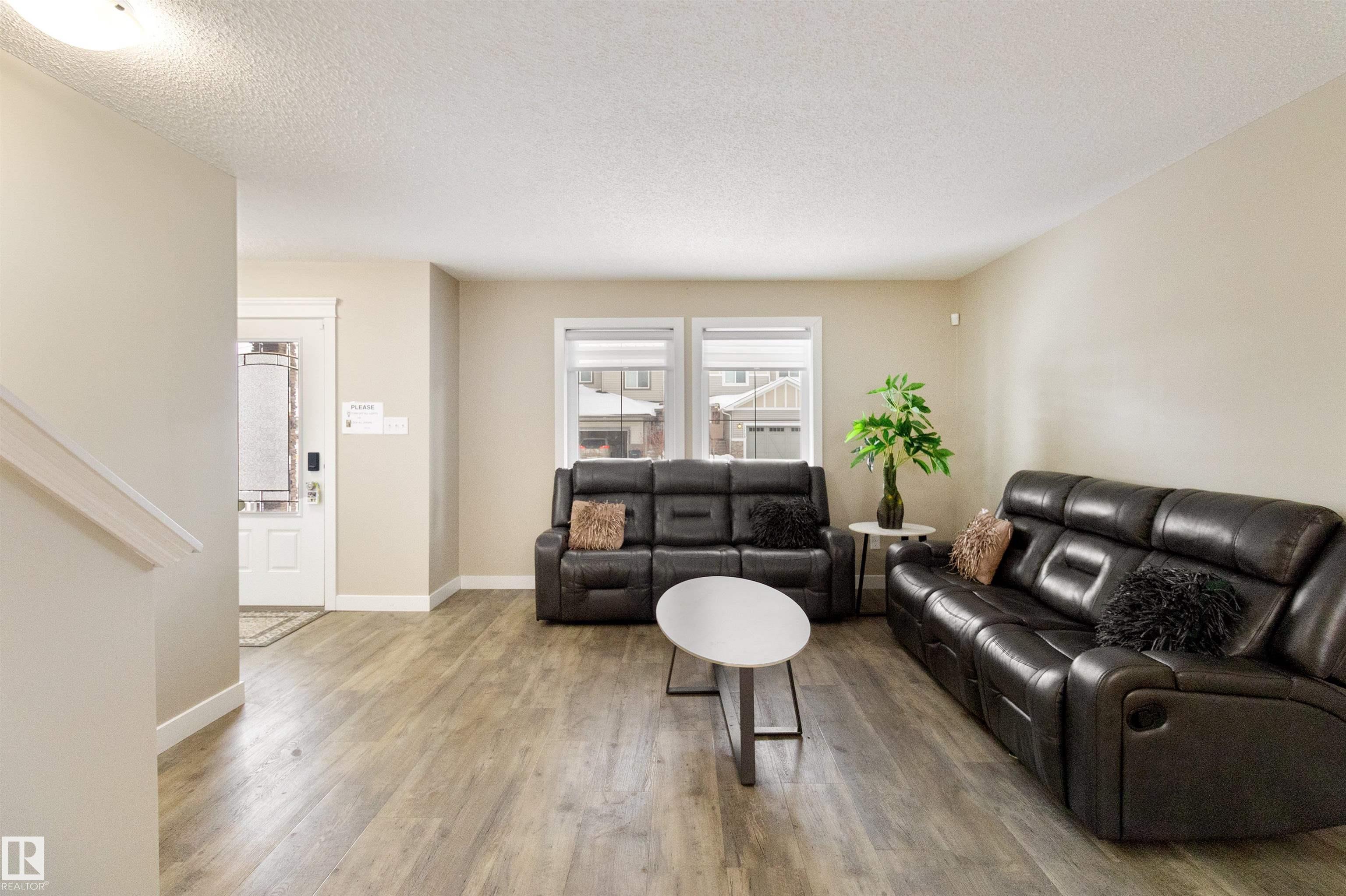 Welcome to this beautiful open-concept home in sought-after McConachie! Featuring a charming front porch, this property offers both style and functionality. The main floor boasts a bright, open layout with a spacious living room, eating nook, and a modern kitchen complete with quartz countertops, stainless steel appliances, ample cabinetry, and a large island with drawers?perfect for everyday living and entertaining. Additional main-floor conveniences include a 2-piece bath, laundry area, and rear entrance. Durable vinyl plank flooring complements the main level, with carpet throughout the upper floor. Upstairs, the generous primary bedroom features a walk-in closet and a 5-piece ensuite. Two additional well-sized bedrooms and a 4-piece main bath complete the second level. The unfinished basement offers excellent future development potential. Outside, the yard includes side fencing and a cement parking pad with power. Close to parks, schools, shopping, and amenities in a family-friendly area.