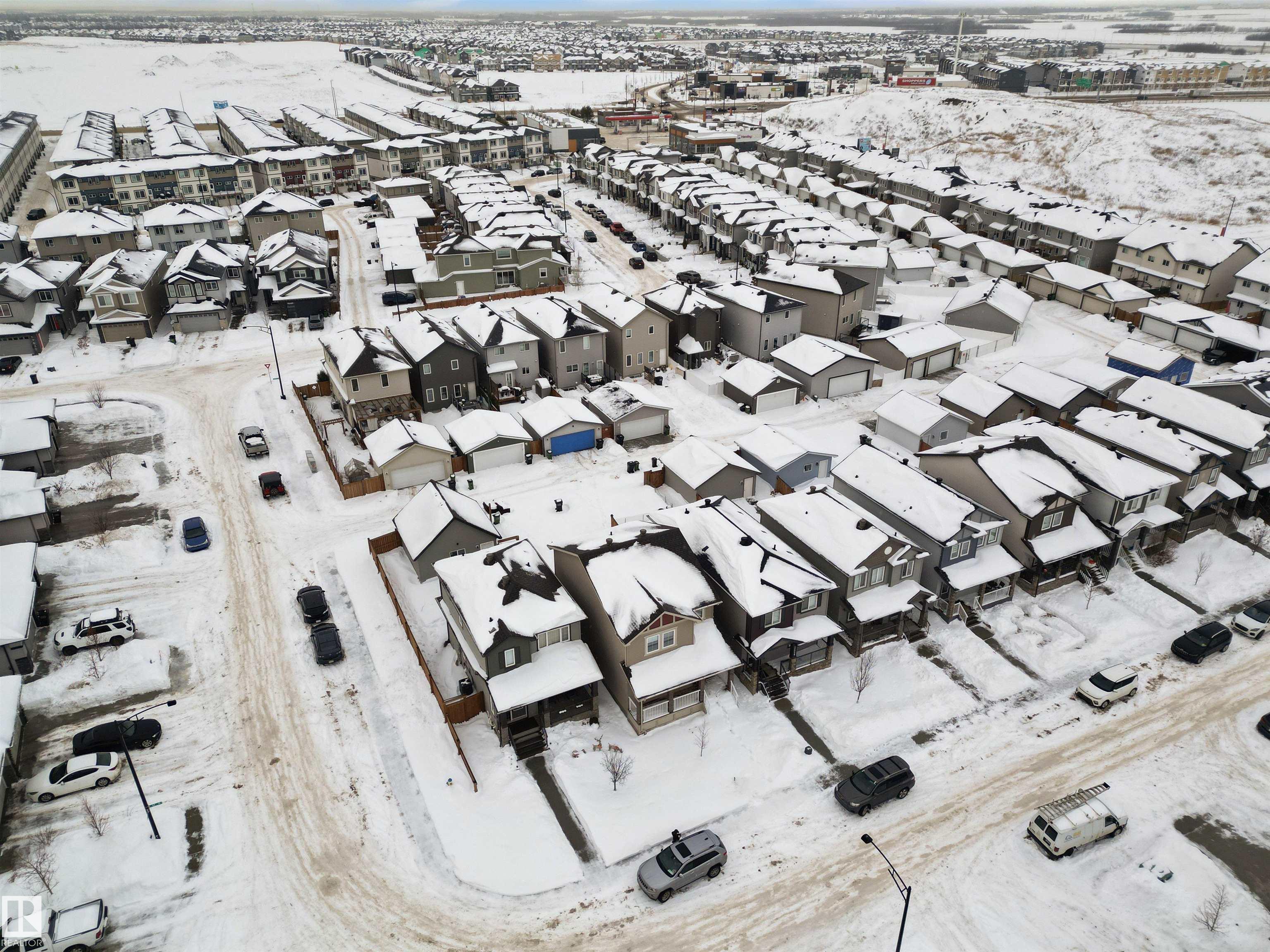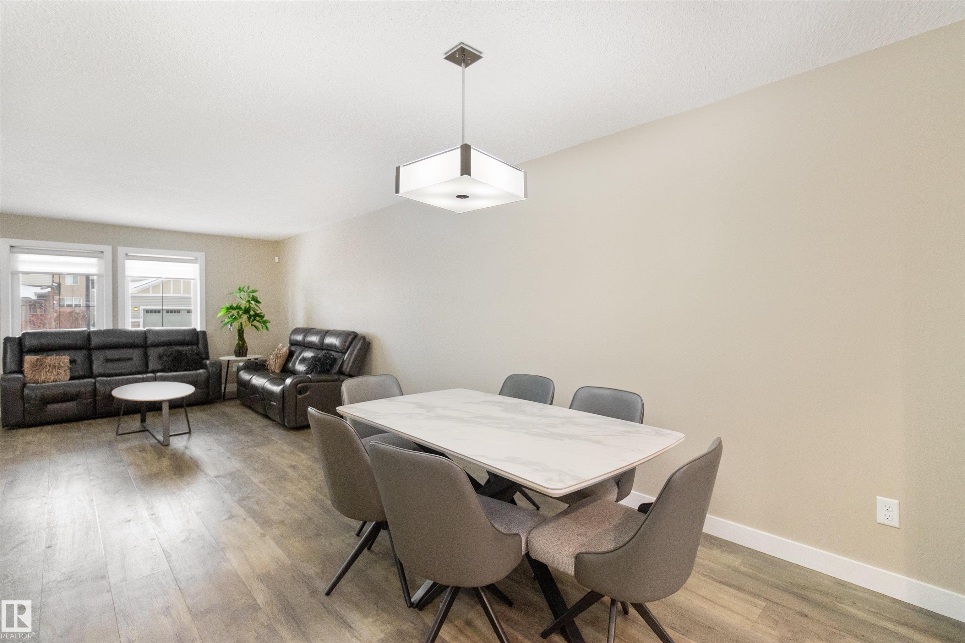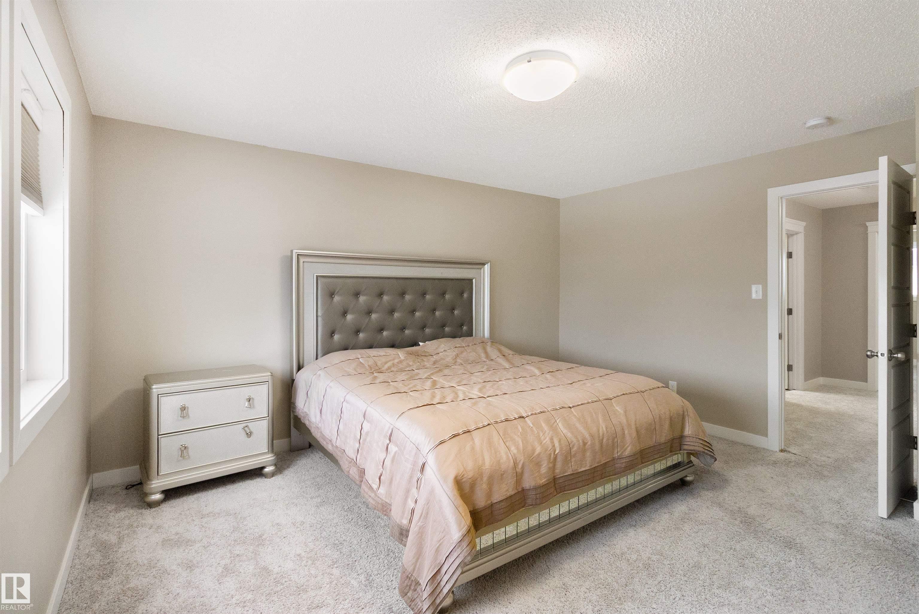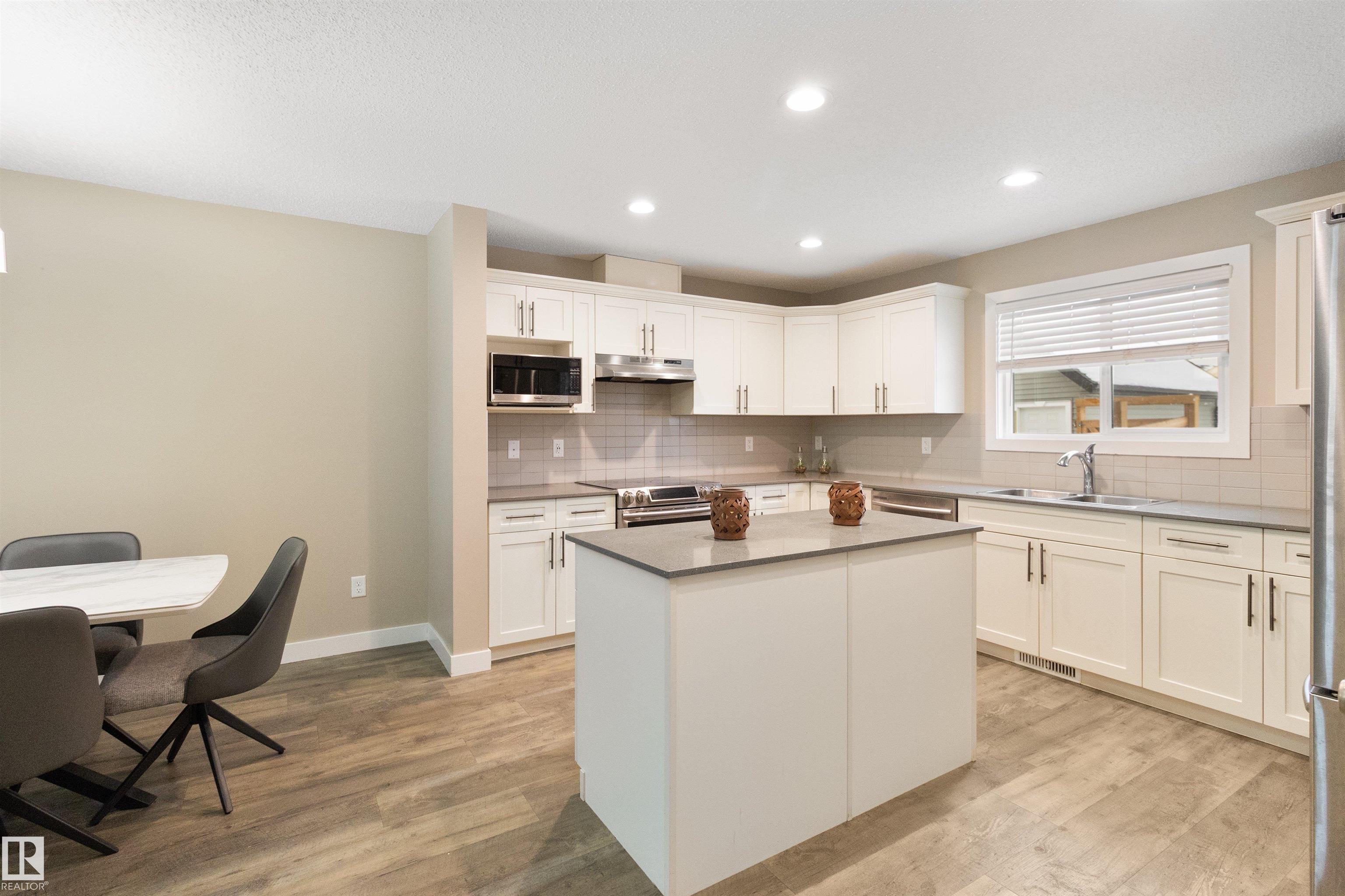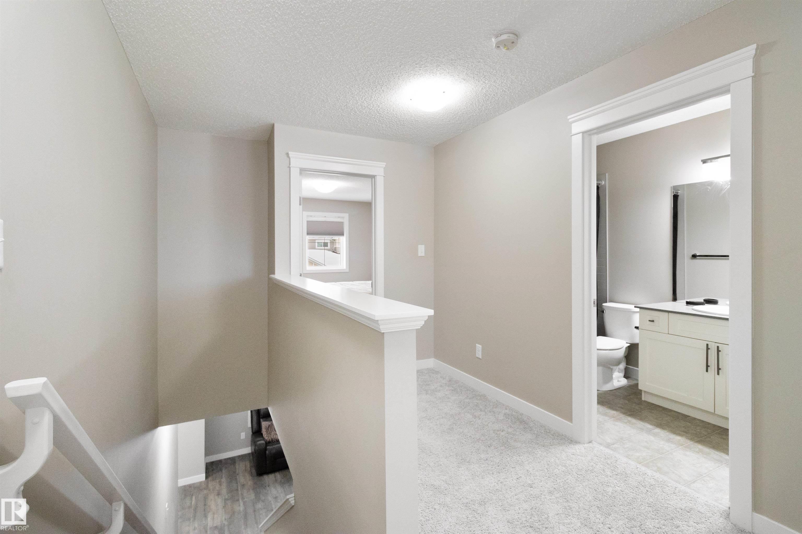 Welcome to this beautiful open-concept home in sought-after McConachie! Featuring a charming front porch, this property offers both style and functionality. The main floor boasts a bright, open layout with a spacious living room, eating nook, and a modern kitchen complete with quartz countertops, stainless steel appliances, ample cabinetry, and a large island with drawers?perfect for everyday living and entertaining. Additional main-floor conveniences include a 2-piece bath, laundry area, and rear entrance. Durable vinyl plank flooring complements the main level, with carpet throughout the upper floor. Upstairs, the generous primary bedroom features a walk-in closet and a 5-piece ensuite. Two additional well-sized bedrooms and a 4-piece main bath complete the second level. The unfinished basement offers excellent future development potential. Outside, the yard includes side fencing and a cement parking pad with power. Close to parks, schools, shopping, and amenities in a family-friendly area.