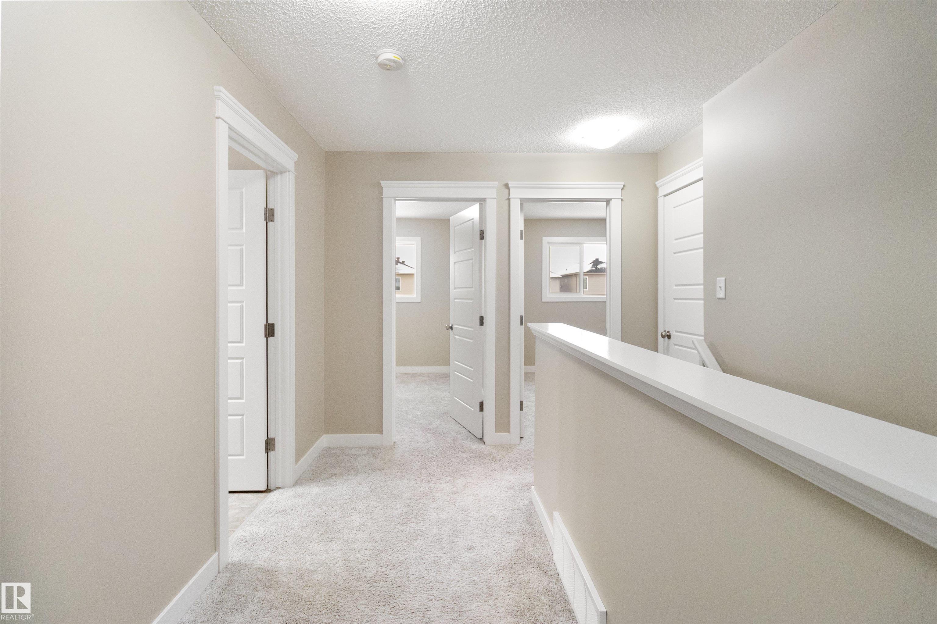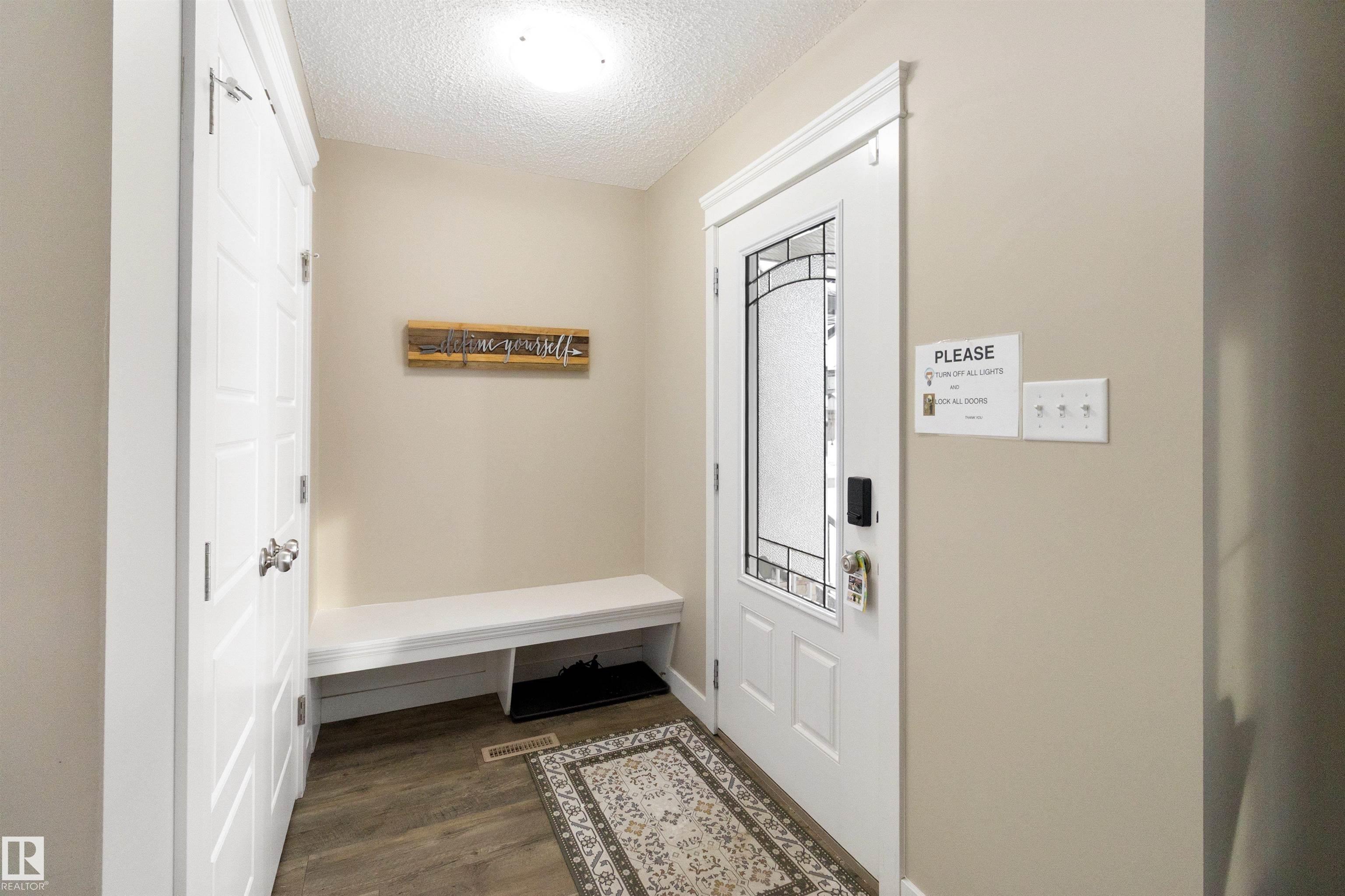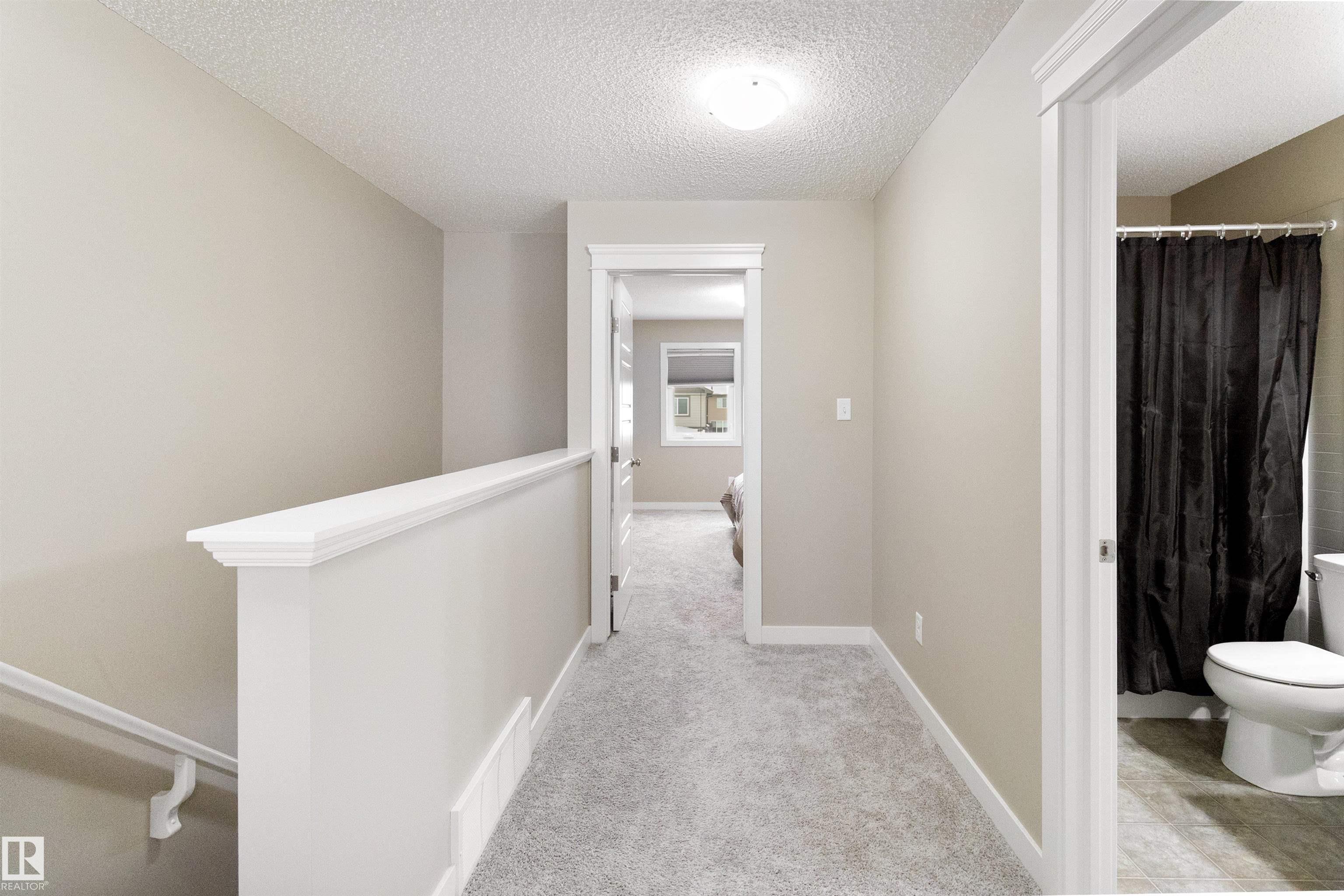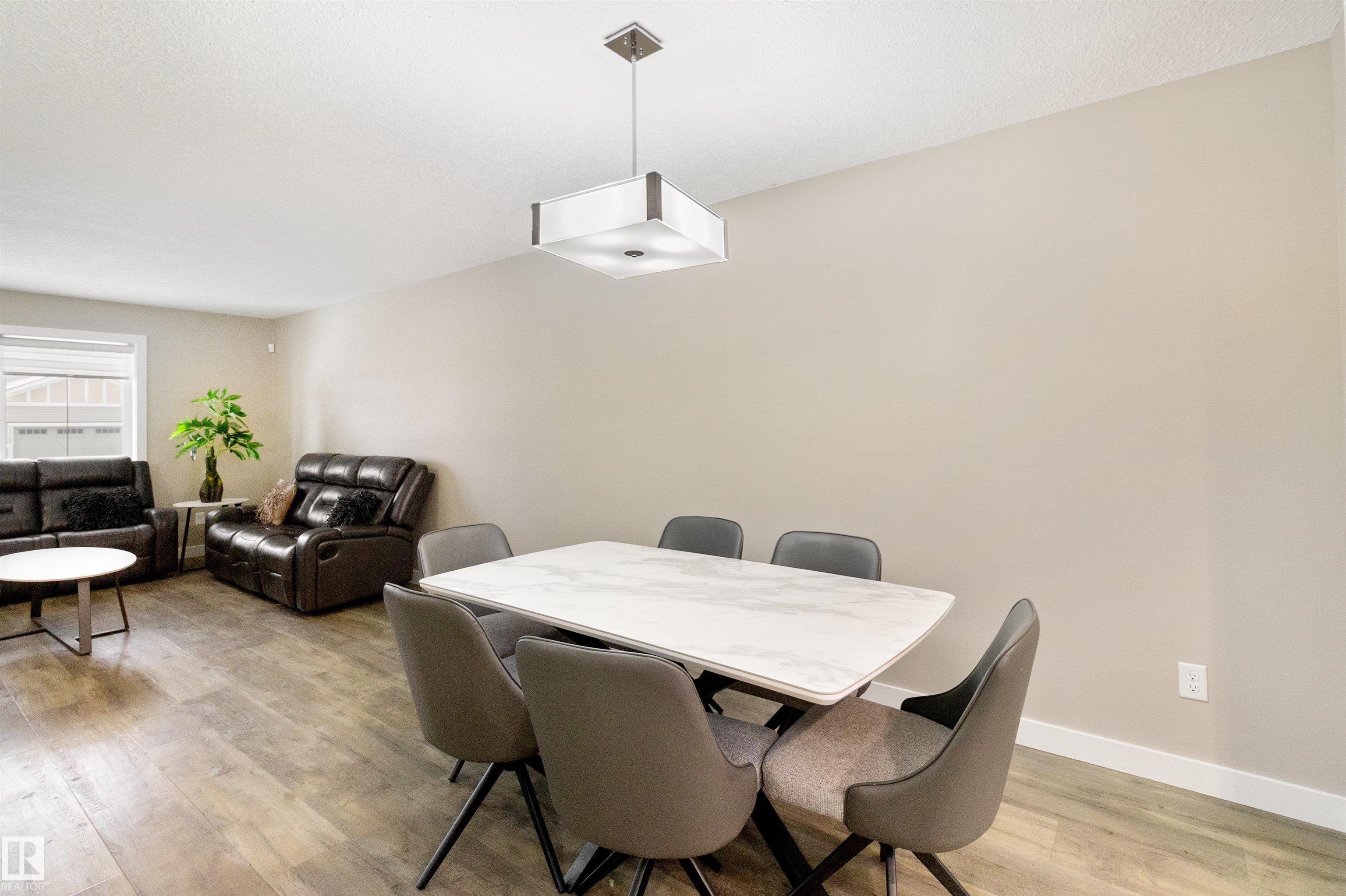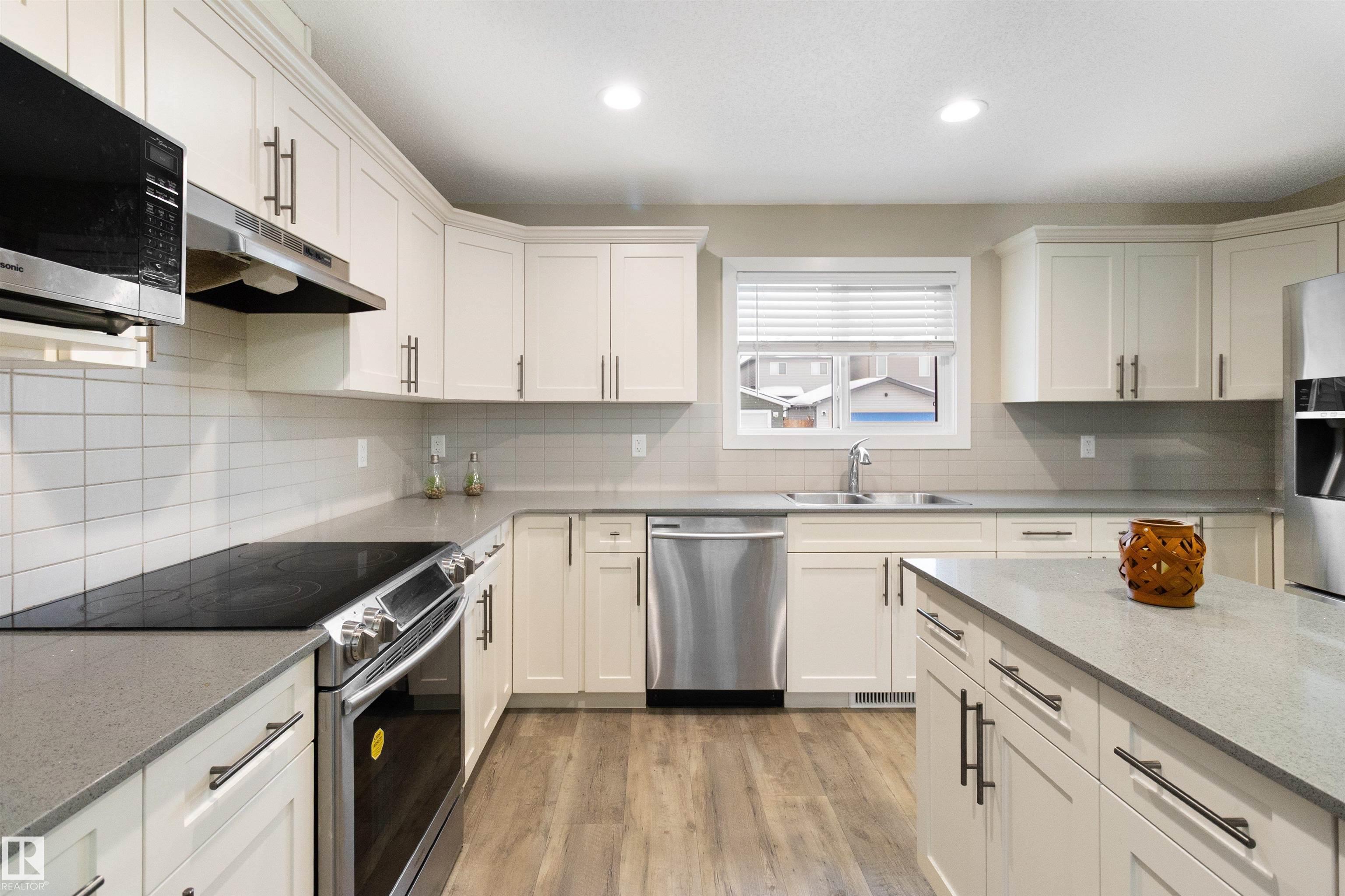 Welcome to this beautiful open-concept home in sought-after McConachie! Featuring a charming front porch, this property offers both style and functionality. The main floor boasts a bright, open layout with a spacious living room, eating nook, and a modern kitchen complete with quartz countertops, stainless steel appliances, ample cabinetry, and a large island with drawers?perfect for everyday living and entertaining. Additional main-floor conveniences include a 2-piece bath, laundry area, and rear entrance. Durable vinyl plank flooring complements the main level, with carpet throughout the upper floor. Upstairs, the generous primary bedroom features a walk-in closet and a 5-piece ensuite. Two additional well-sized bedrooms and a 4-piece main bath complete the second level. The unfinished basement offers excellent future development potential. Outside, the yard includes side fencing and a cement parking pad with power. Close to parks, schools, shopping, and amenities in a family-friendly area.