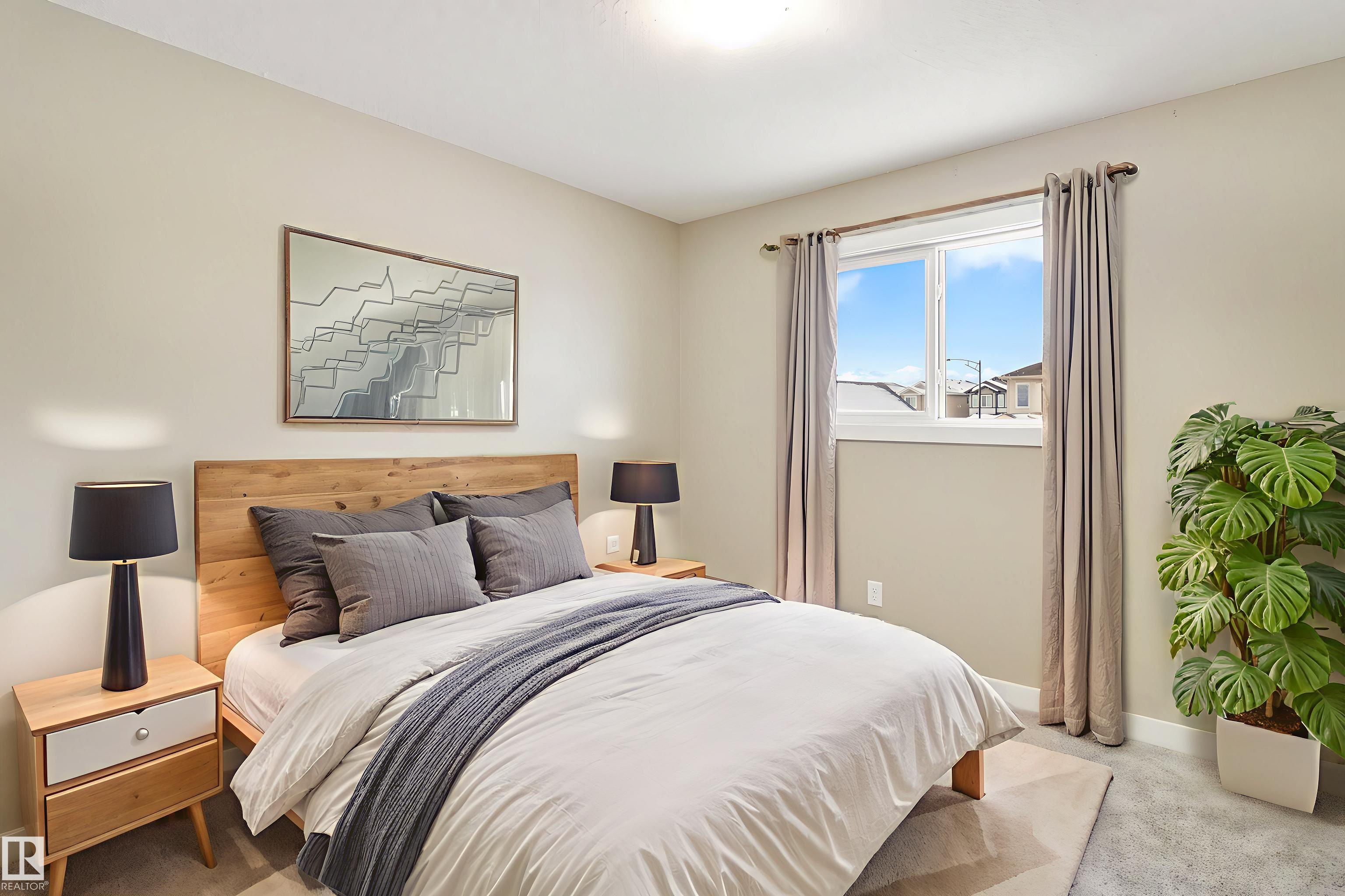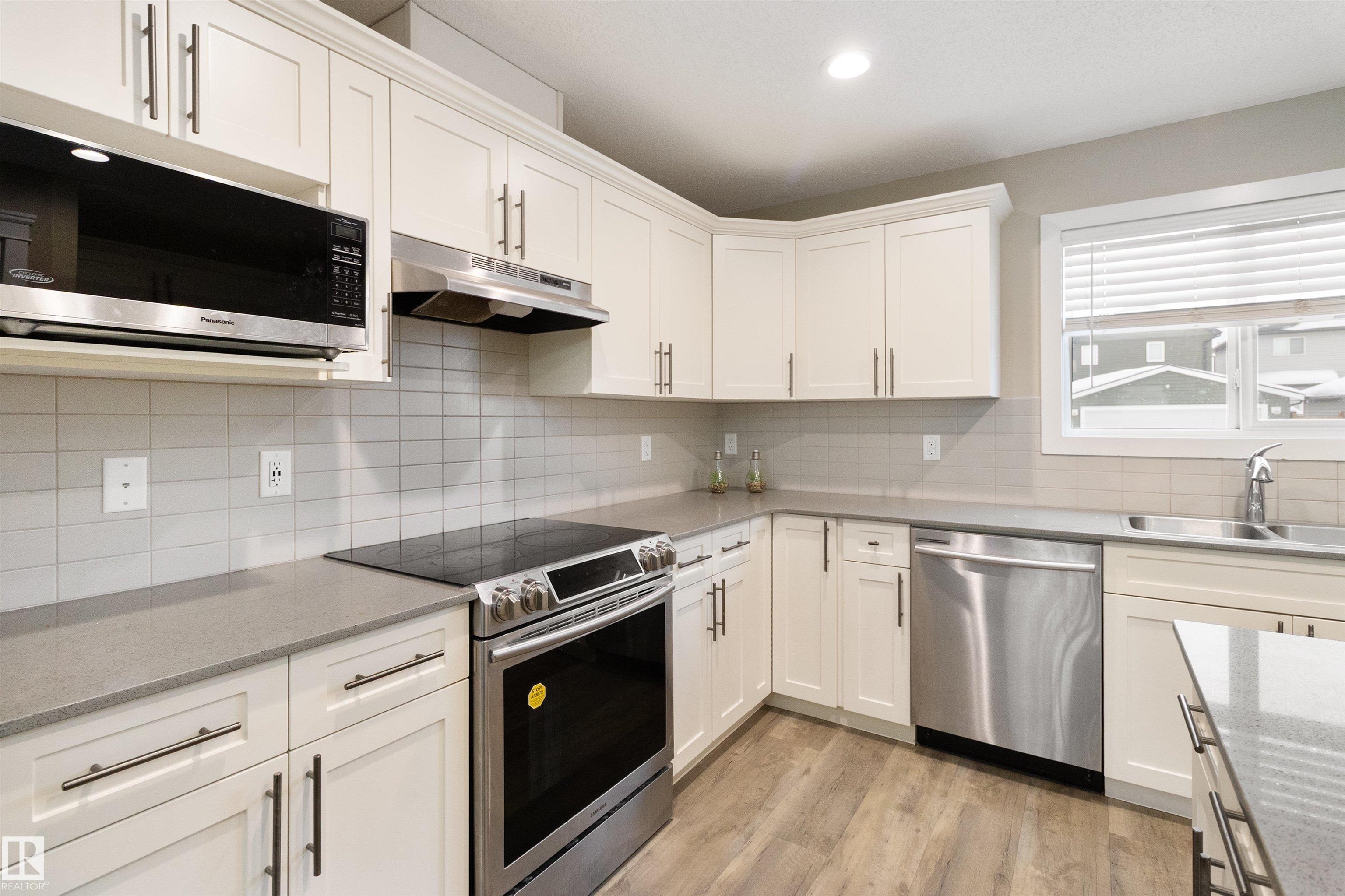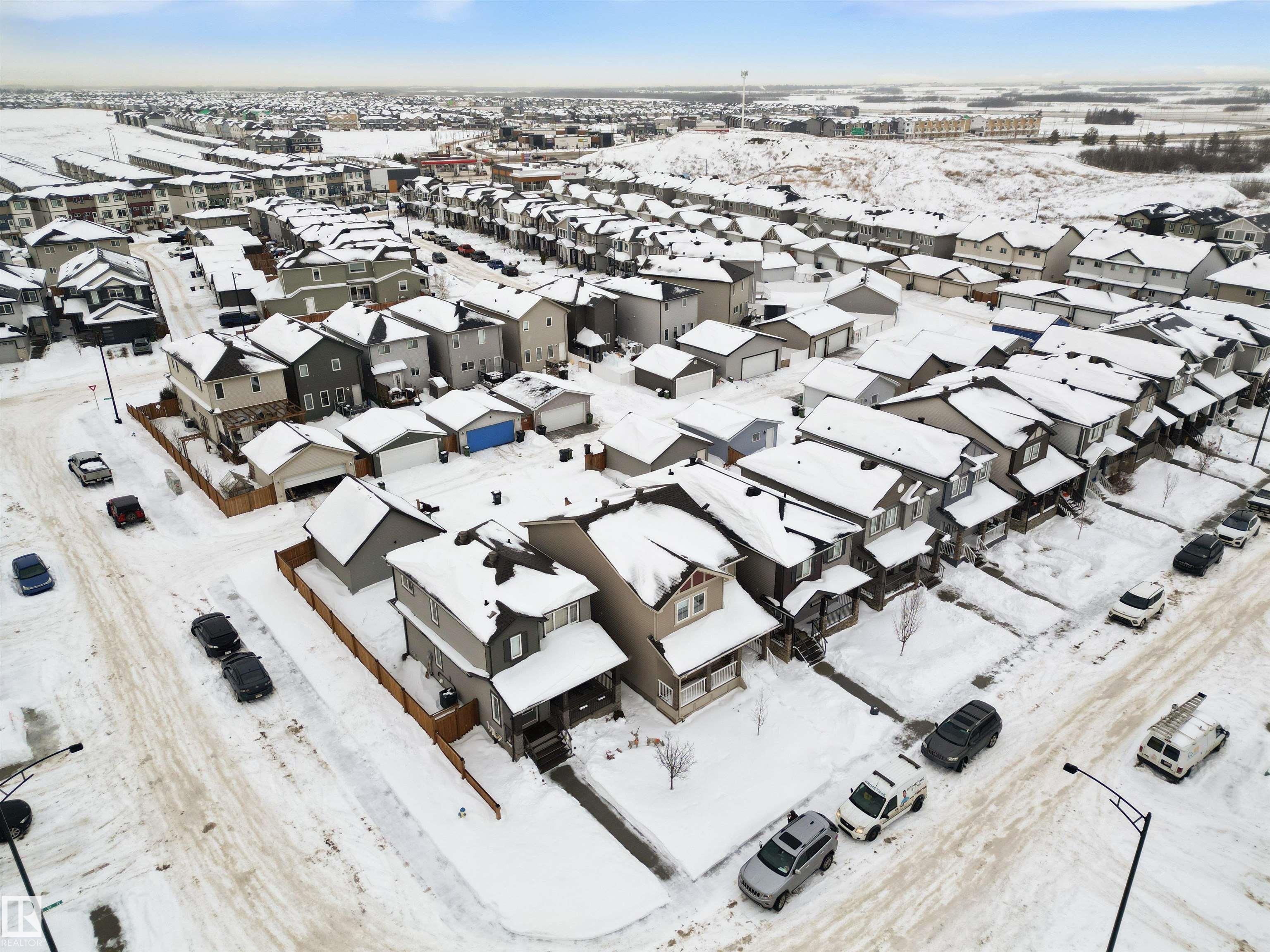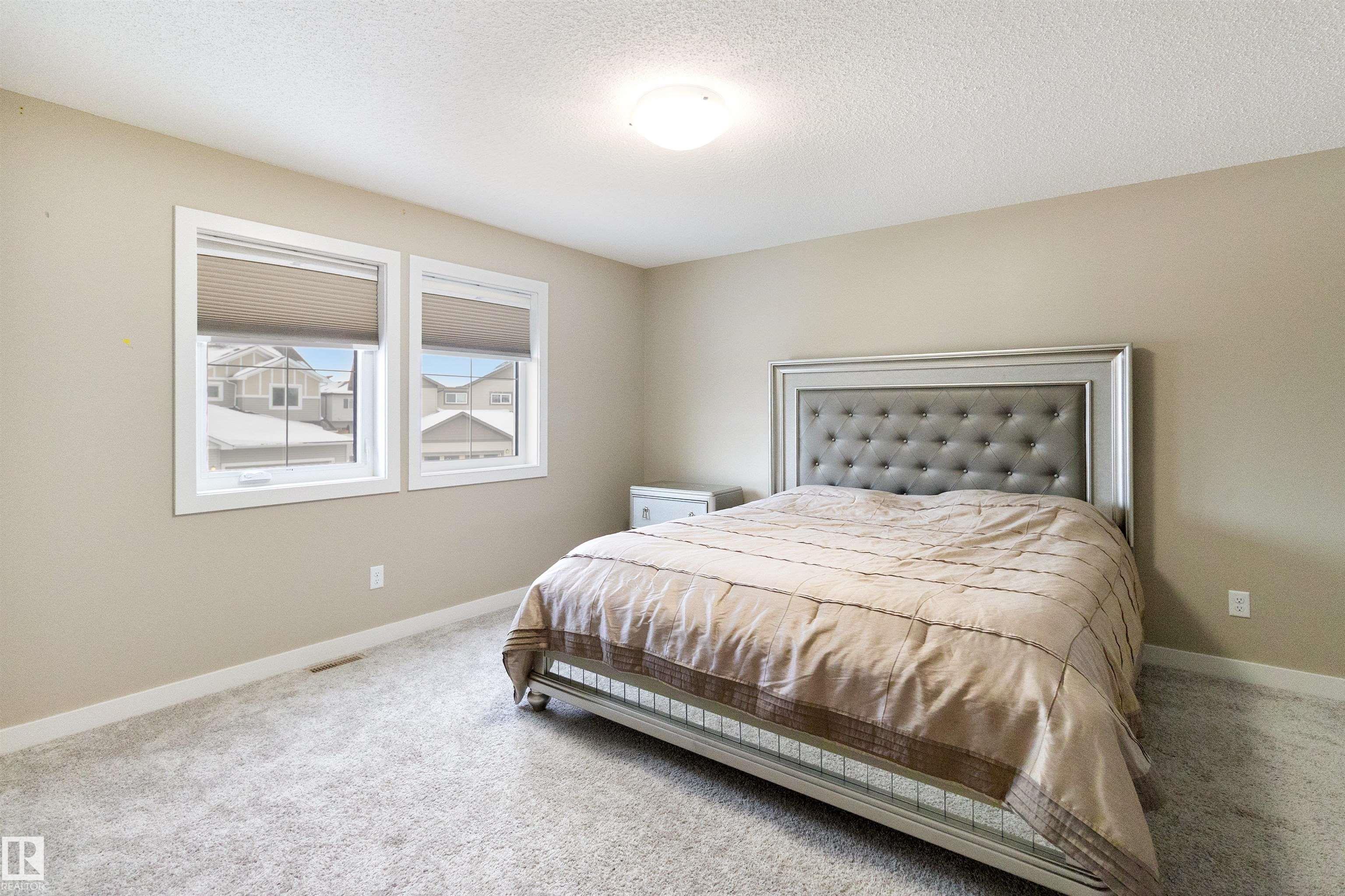 Welcome to this beautiful open-concept home in sought-after McConachie! Featuring a charming front porch, this property offers both style and functionality. The main floor boasts a bright, open layout with a spacious living room, eating nook, and a modern kitchen complete with quartz countertops, stainless steel appliances, ample cabinetry, and a large island with drawers?perfect for everyday living and entertaining. Additional main-floor conveniences include a 2-piece bath, laundry area, and rear entrance. Durable vinyl plank flooring complements the main level, with carpet throughout the upper floor. Upstairs, the generous primary bedroom features a walk-in closet and a 5-piece ensuite. Two additional well-sized bedrooms and a 4-piece main bath complete the second level. The unfinished basement offers excellent future development potential. Outside, the yard includes side fencing and a cement parking pad with power. Close to parks, schools, shopping, and amenities in a family-friendly area.