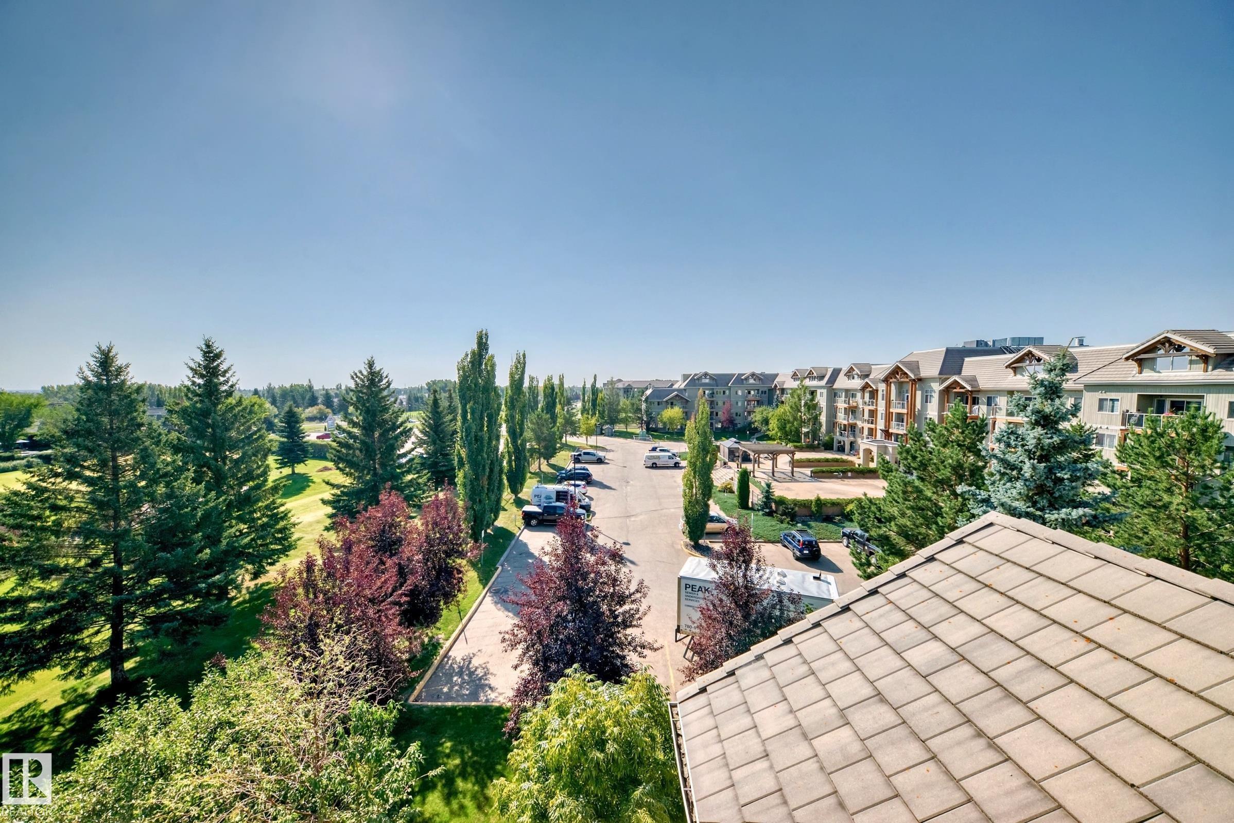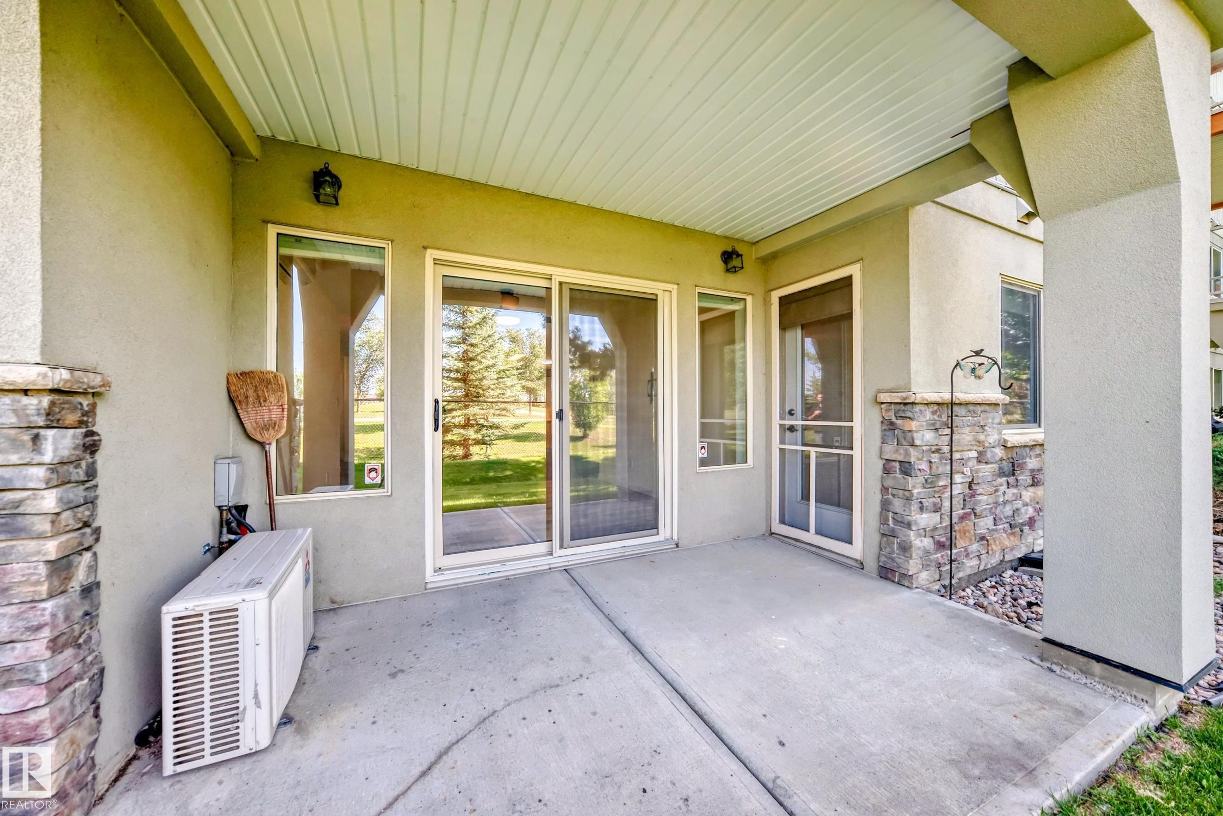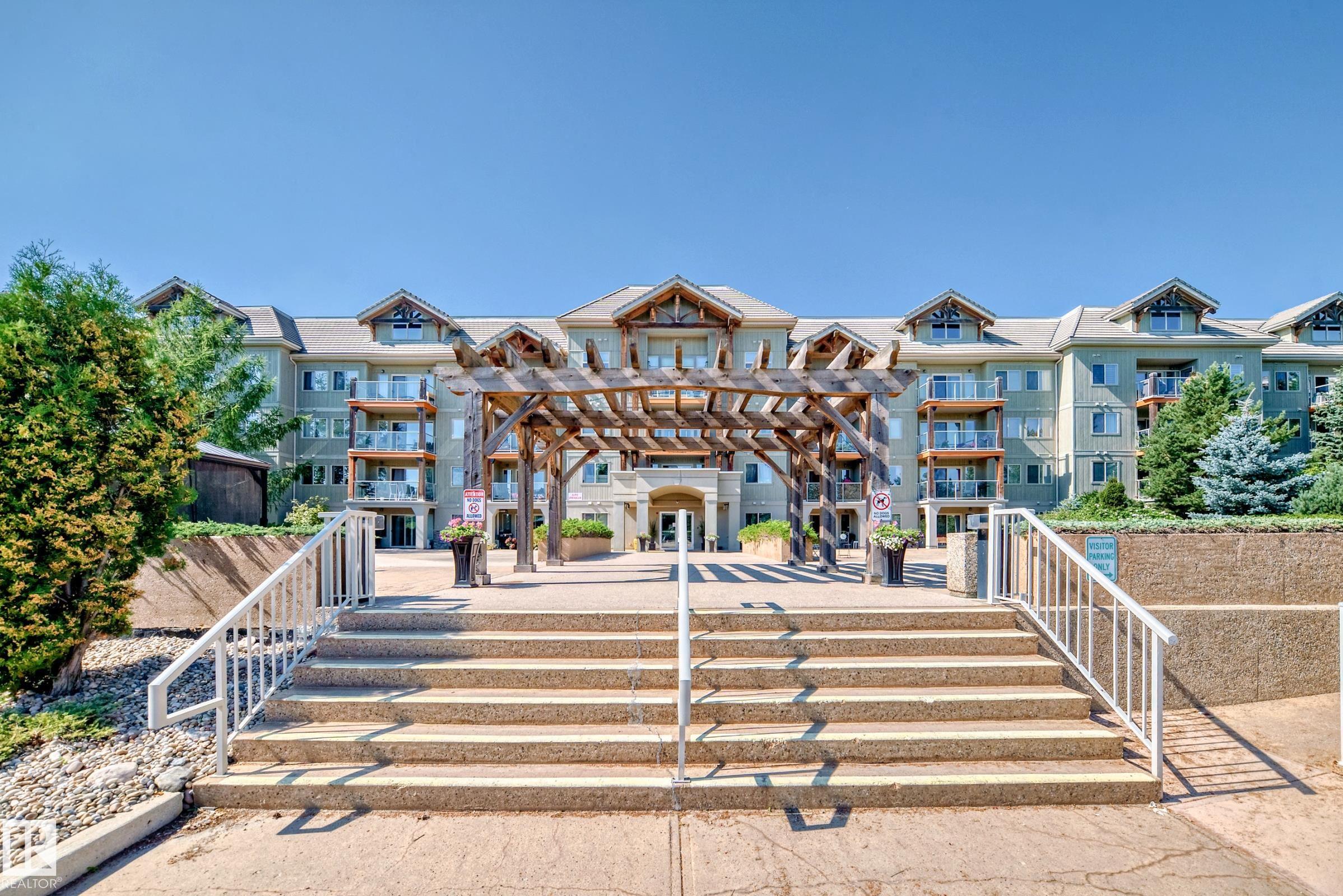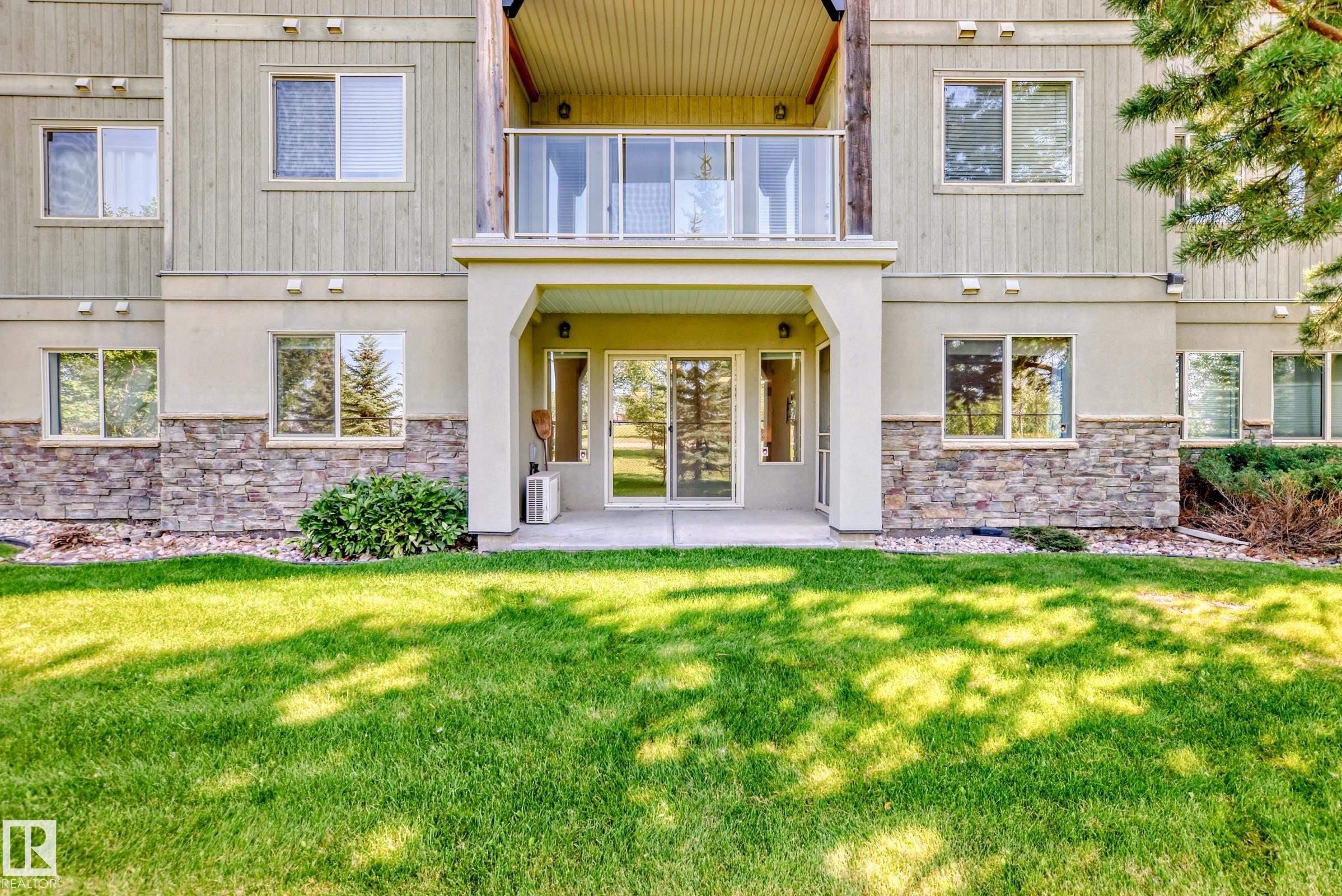 Welcome to The Lodge at Lewis Estates! This sought-after 30+ adult living complex feels like a mountain lodge retreat, complete with fitness centre, hot tub, steam room, party room, theatre, two rooftop patios, and a car wash ? all just steps from the golf course. TIHIS UNIT FEATURES A RARE TITLED STORAGE UNIT! This main-floor condo offers 2 bedrooms and 2 bathrooms with a bright, open floor plan. The chef-inspired kitchen features Decorastone resurfaced granite countertops, abundant cabinetry, and a large island. The spacious bedrooms are separated by the living room, which opens to a west-facing covered patio with park views ? the ideal spot to enjoy warm summer evenings. Highlights include a 3-pc main bath, 4-pc ensuite, in-floor heating, in-suite laundry, and storage. Complete with A titled parking stall very close to the elevators. Cats, birds & fish permitted with board approval (sorry, no dogs). Conveniently located near Transit, shopping, WEM, and with easy access to the Anthony Henday.