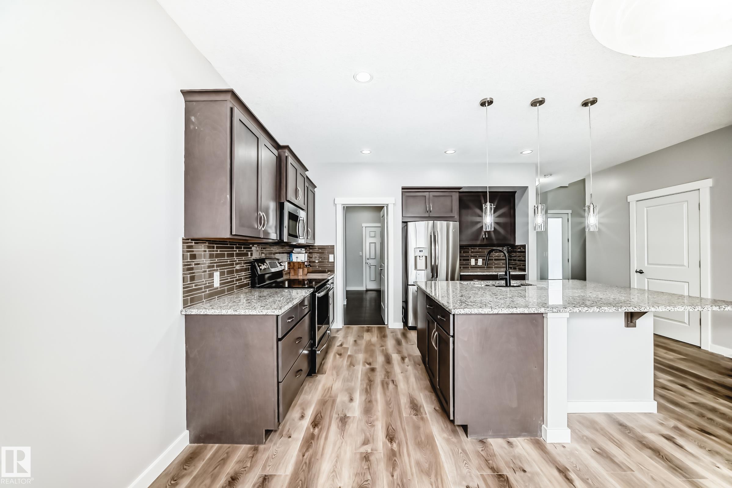 Wow Factor!!! This decidedly different 2180 sq ft Homes by Avi is immaculate. This modern functional floorplan is perfect for family living. Features include, on trend colors and contemporary design elements, 10 ft ceilings, granite countertops, stainless steel appliances, new gorgeous luxury vinyl plank flooring and a handy main floor office. Enjoy the cozy gas fireplace that anchors the living room on cold winter days. A large island kitchen with a ton of counter and cupboard space and walk-thru pantry. Upstairs you'll find 3 large bedrooms, including a master retreat boasting a spa-like 5 pc ensuite. The second and third bedrooms share a well appointed 4 pc bathroom. The top floor is rounded off with an awesome bonus room. The yard is fully landscaped with a huge deck, perfect for entertaining. All of this located in the dynamic community of Chappelle Gardens.