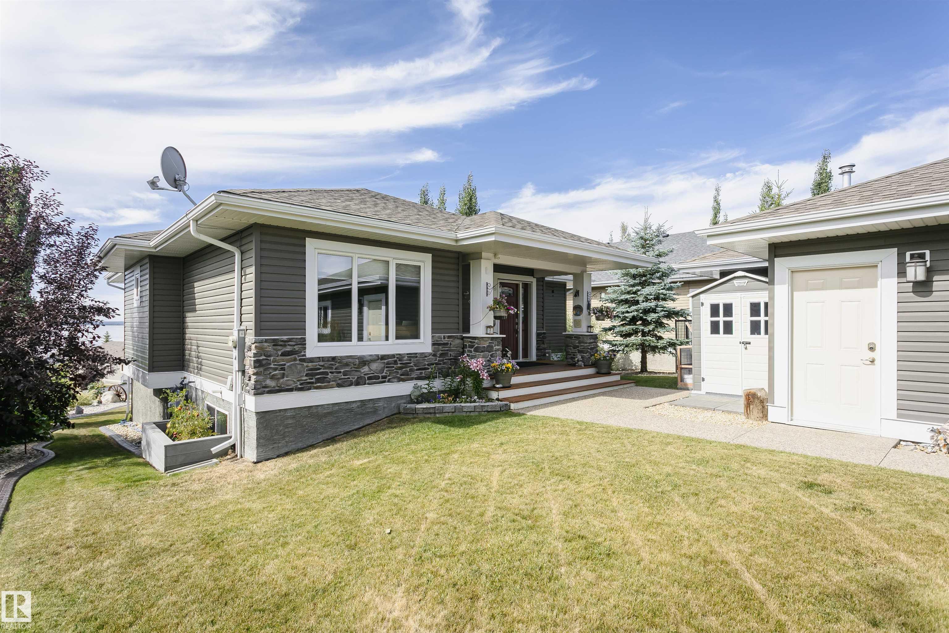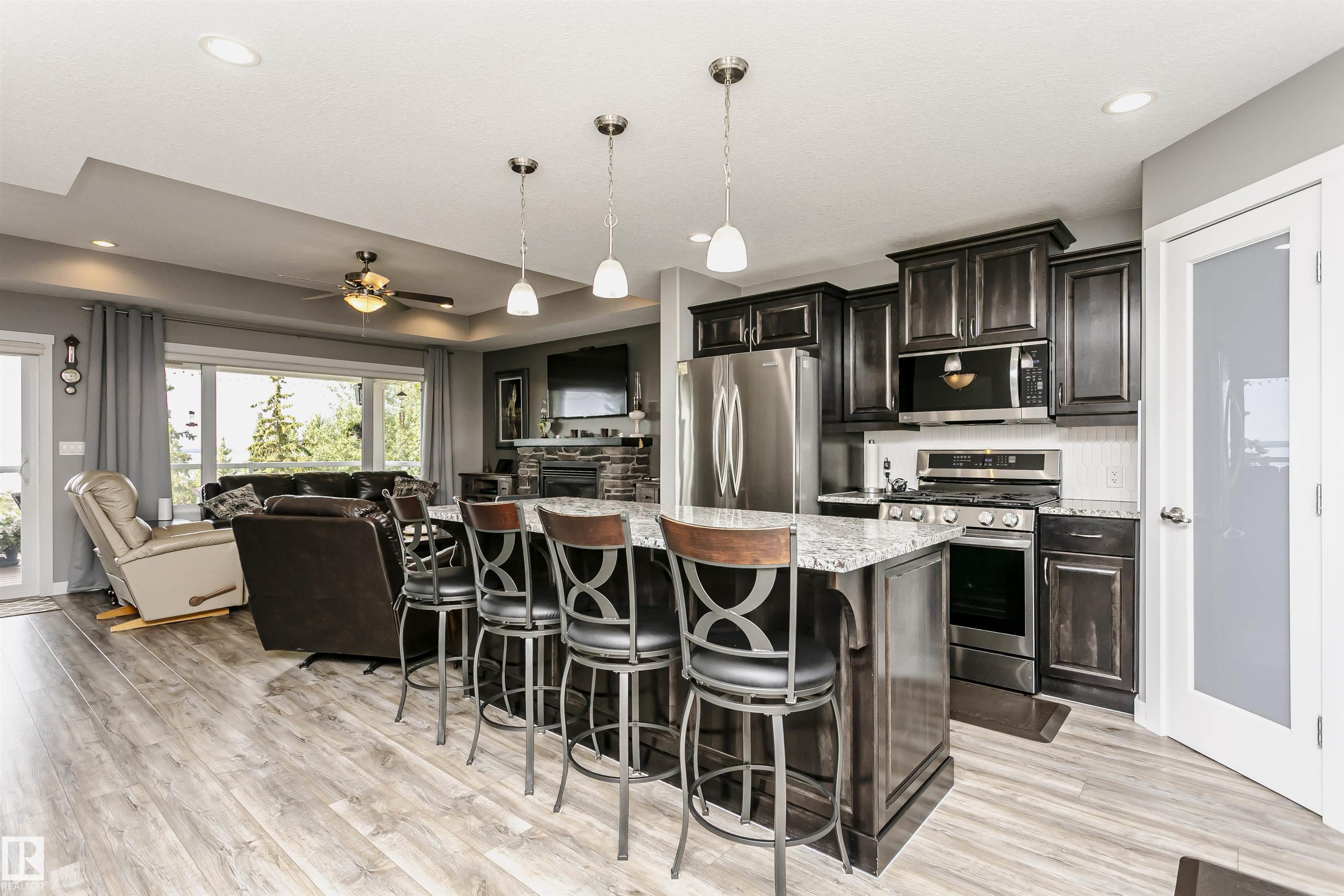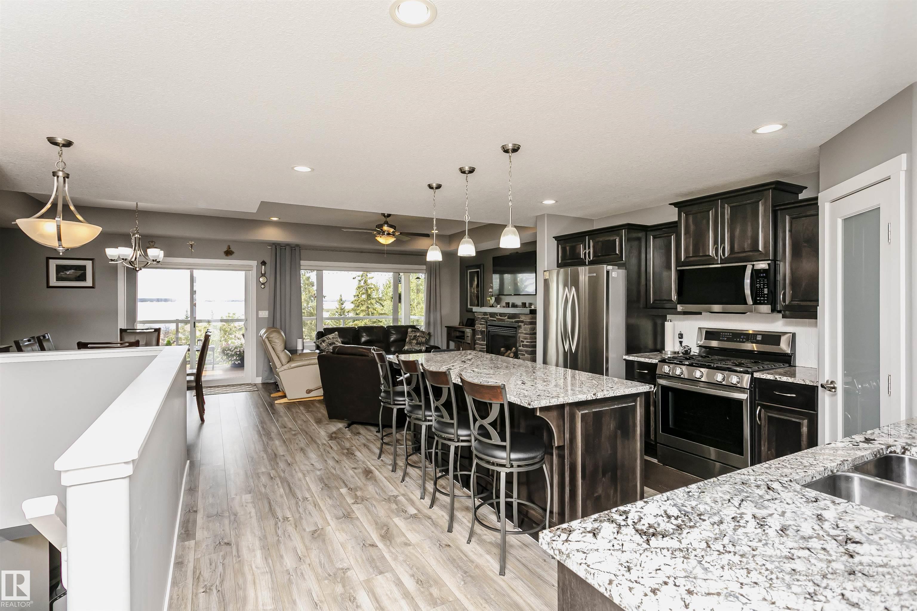 Fantastic 4 bedroom WALKOUT bungalow with THE BEST lake views!! New vinyl plank, granite counters, stainless appliances, gas stove, stone fireplace, covered deck and lower patio is just the start!! Huge Island slab in the awesome kitchen with wood cabinets opens to the living/dining room area with f/p and numerous south facing windows with patio doors that lead to the deck. The master suite takes full advantage of the lake views and features a 4 piece ensuite with glass shower. Another bedroom and 4 piece bath round out the main floor. In the fully finished walkout basement you'll find two more massive bedrooms, one with lake views of its own along with a 4 piece bath and a great family room. Garden doors from the family room lead out to the covered patio. The garage is a heated oversized double measuring 29 feet long on one side...wow! As an owner you can enjoy amenities like the private marina, swimming pool, fitness centre, clubhouse and beachfront park. New hwt and mw/hoodfan as well!