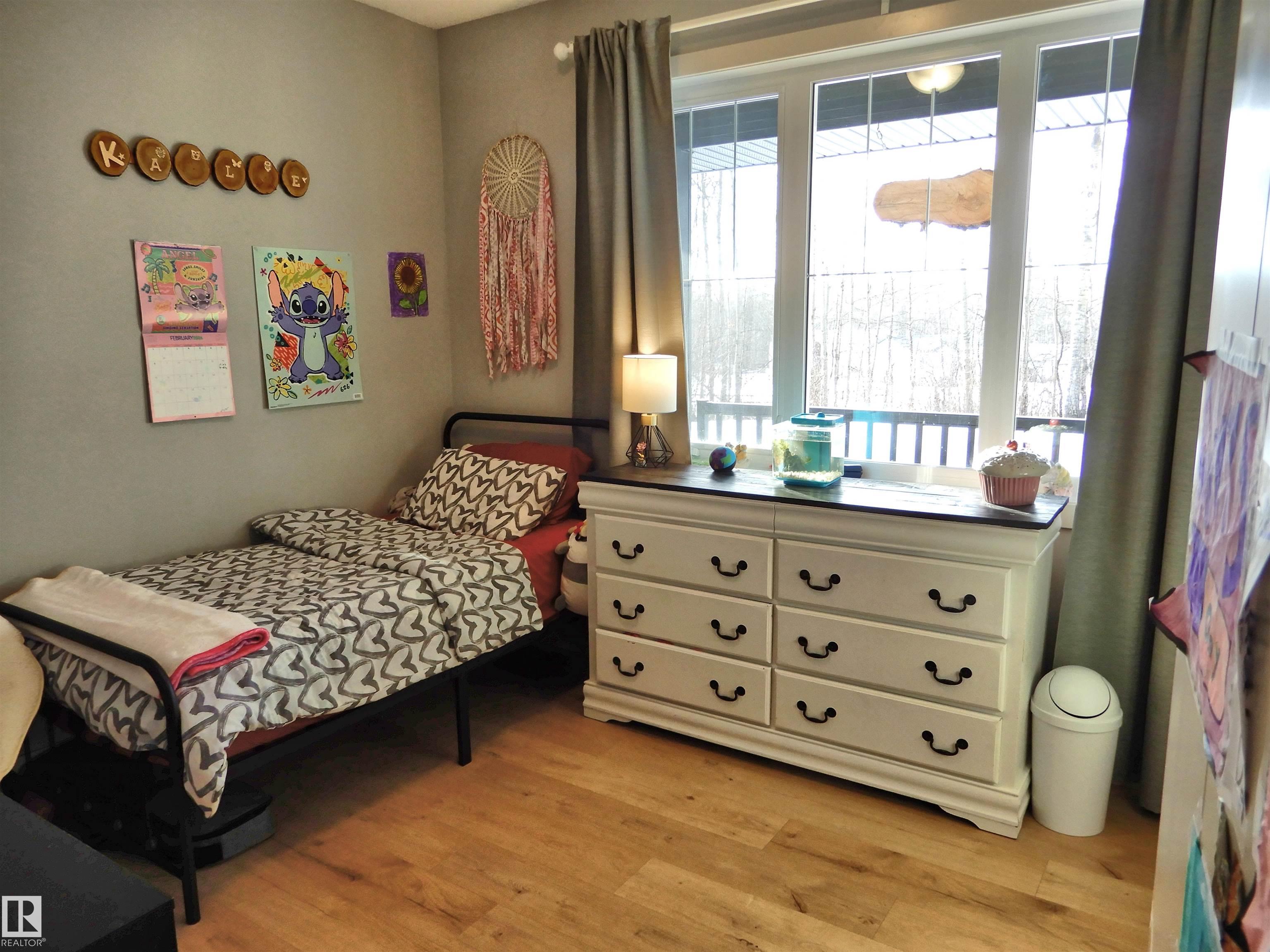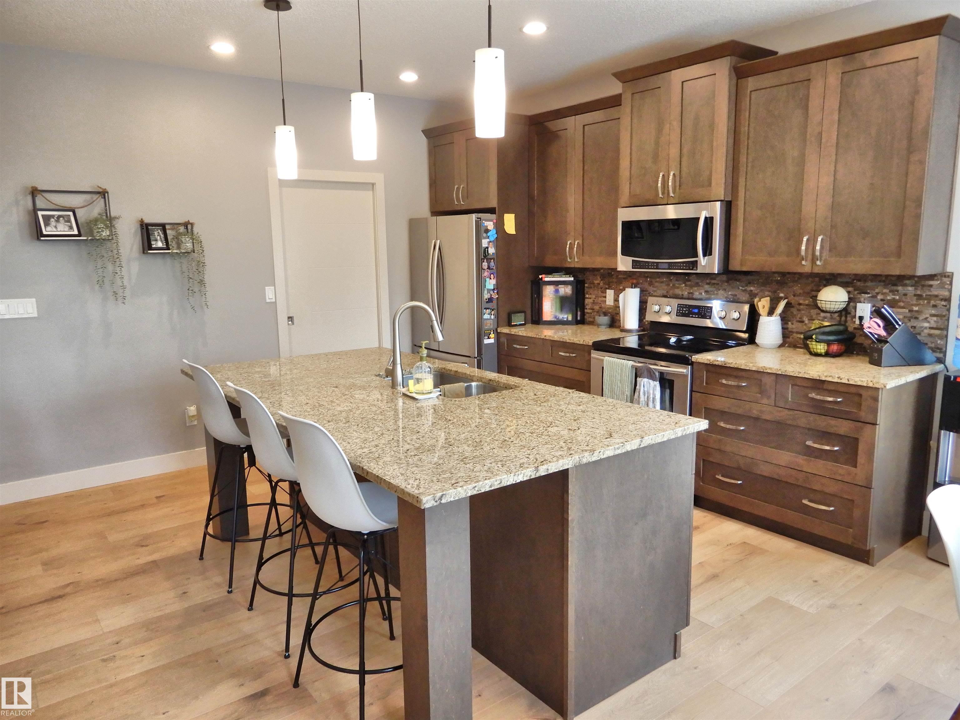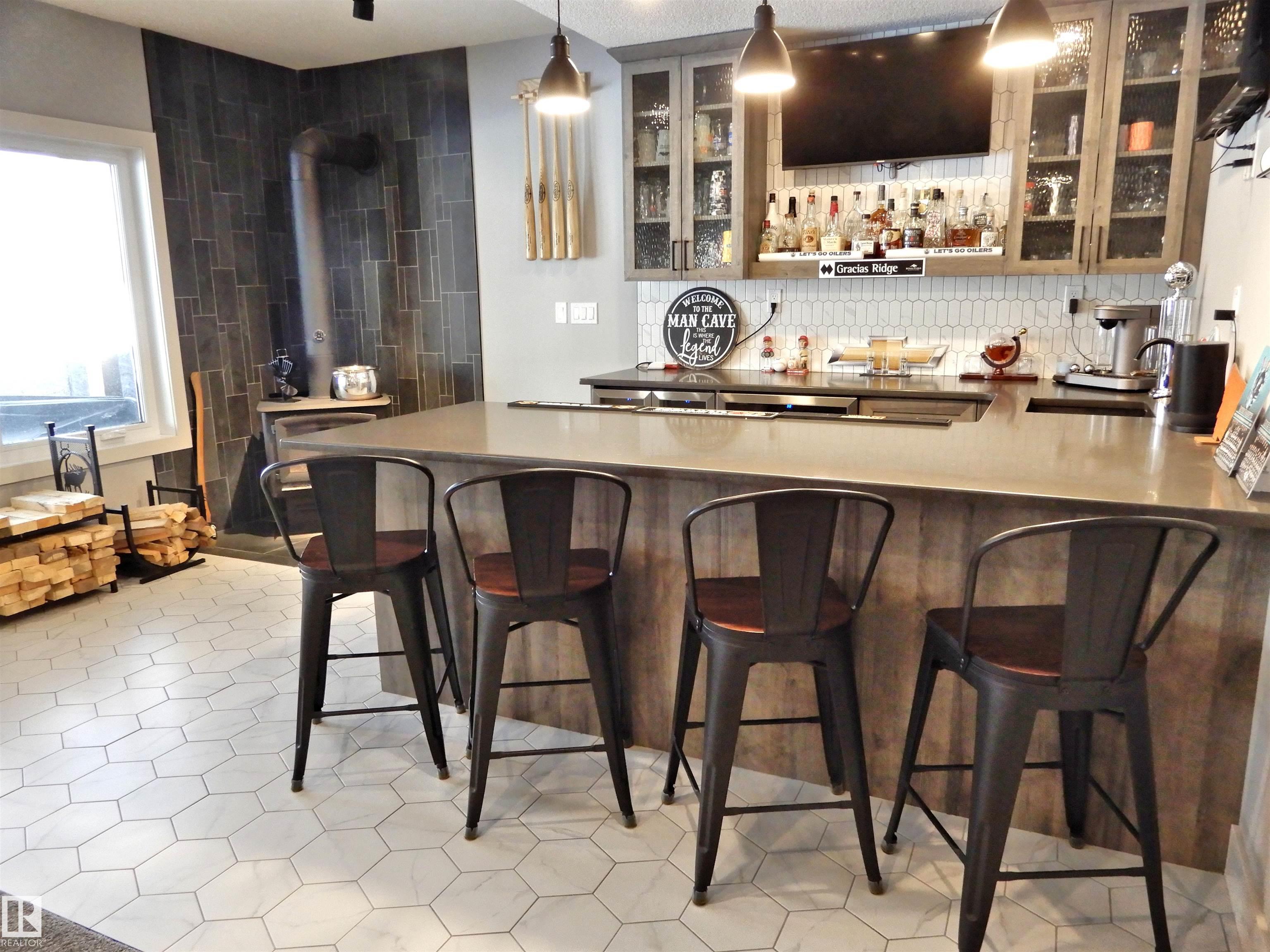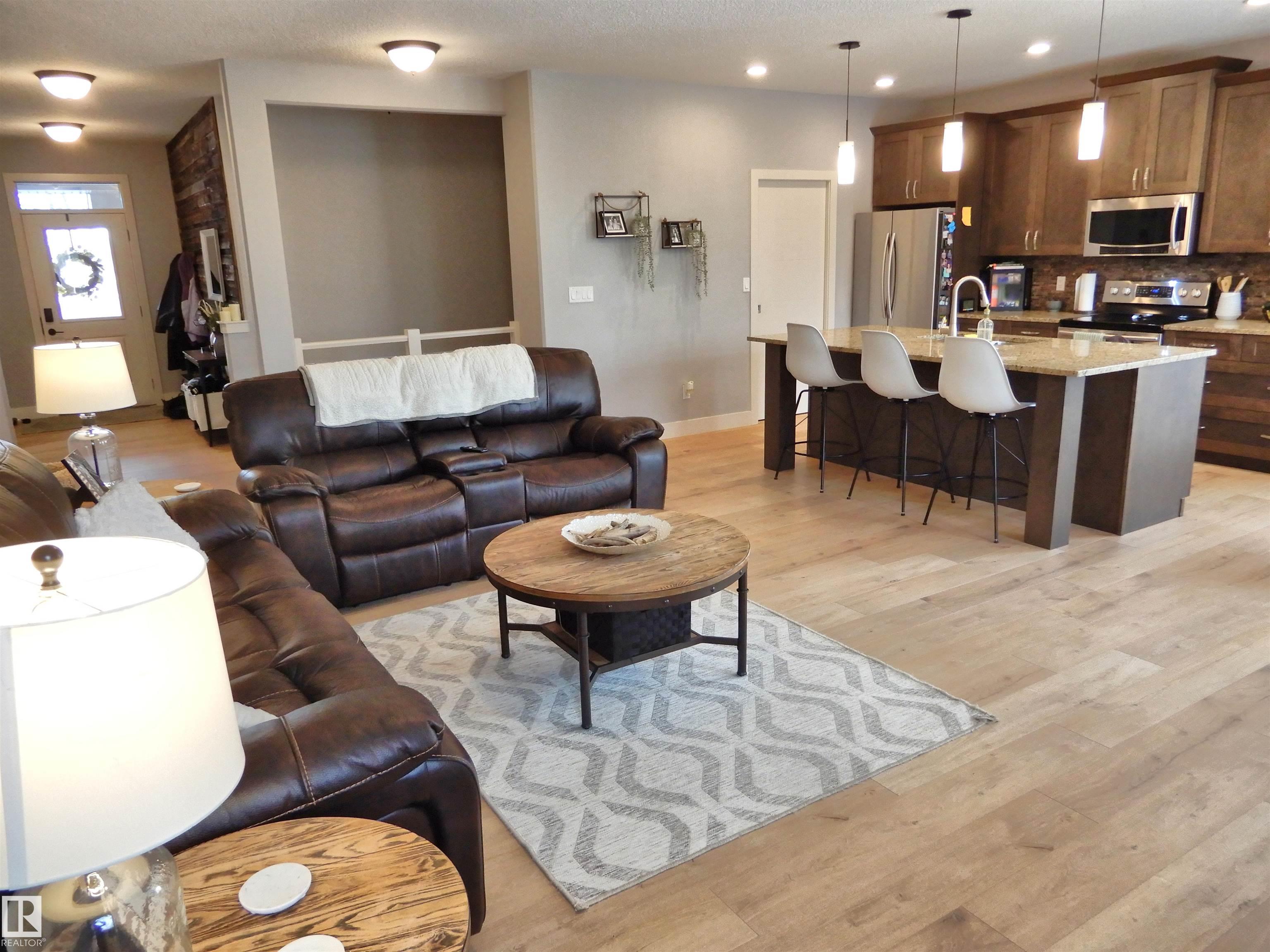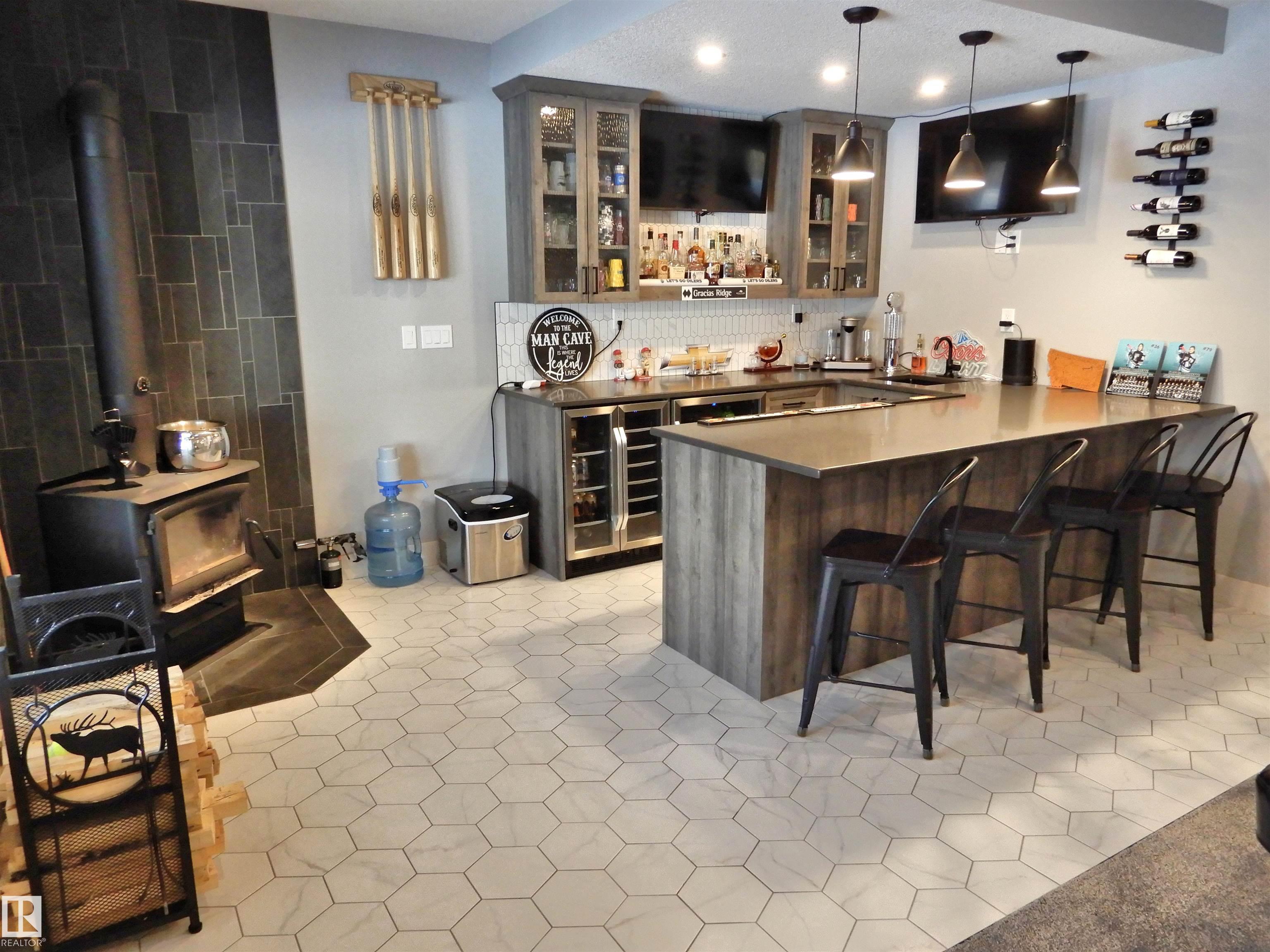 Welcome to Bridlewood Mews, where comfort, privacy, and nature come together. Built in 2014, this 1,356 sq. ft. bungalow is located in the sought-after Bridlewood Mews subdivision near Onoway. offering a serene setting with no rear neighbors and mature trees as your backdrop. The main level features a bright, open-concept layout with lots of natural light and a spacious chefs kitchen with quartz counters and tons of cabinets, ideal for entertaining. The living room is warm and inviting with a cozy fireplace, perfect for year-round relaxation. This air conditioned home offers four bedrooms and three bathrooms, including a private primary suite with a custom spa ensuite with custom shower. The fully finished walk-out basement adds value and function, complete with an incredible custom bar and wood-stove fireplace. Outside, enjoy a huge deck, large yard with a garden and fruit trees backing onto a forest for those who value outdoor living. The 25' x 23' heated garage is sure to please. Come see for yourself!