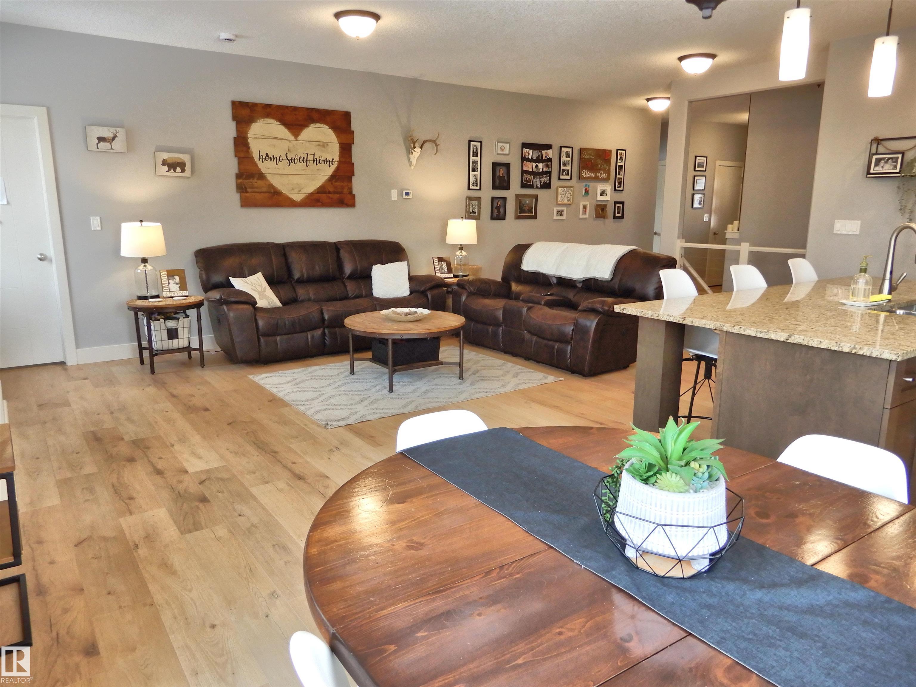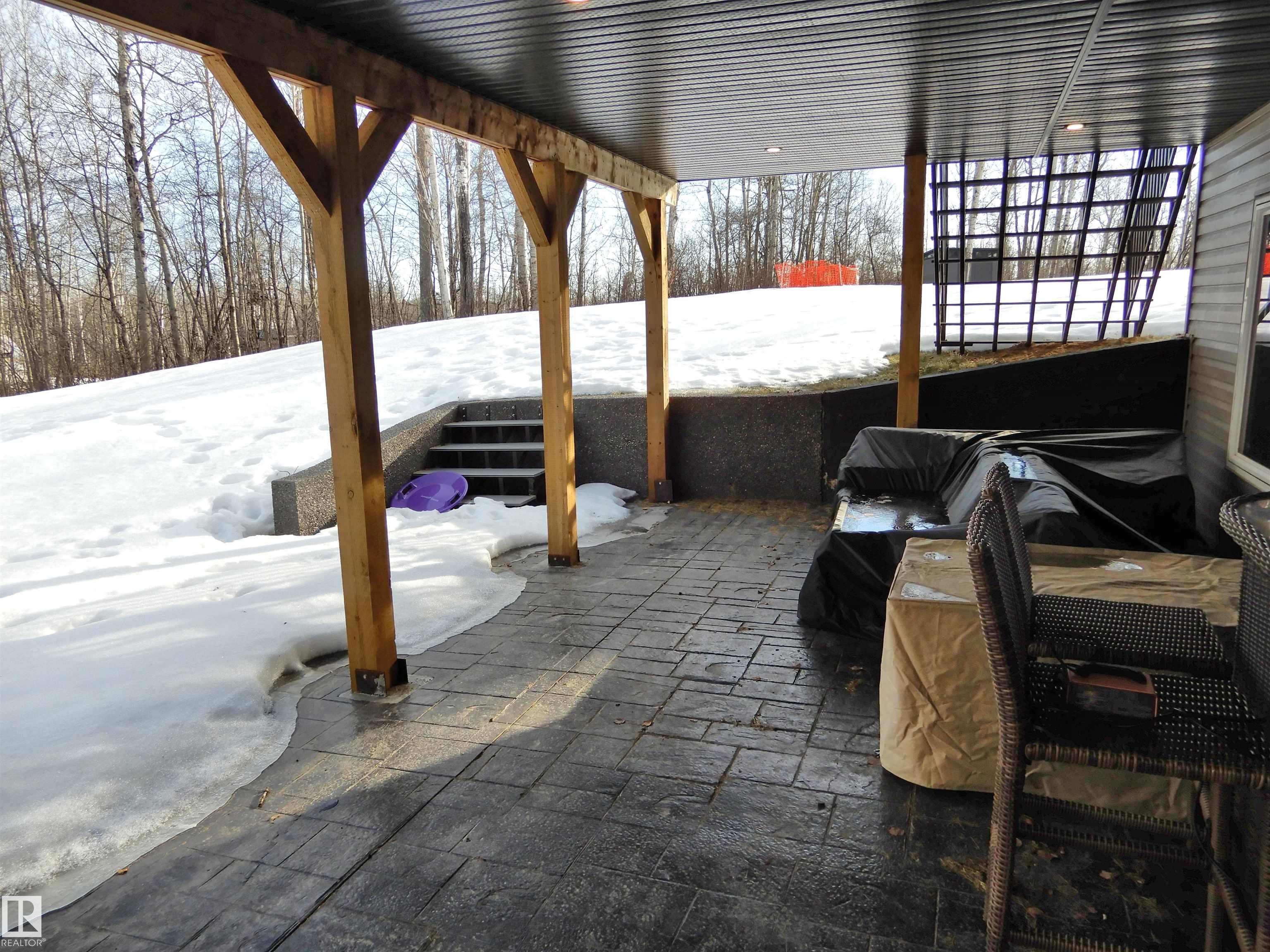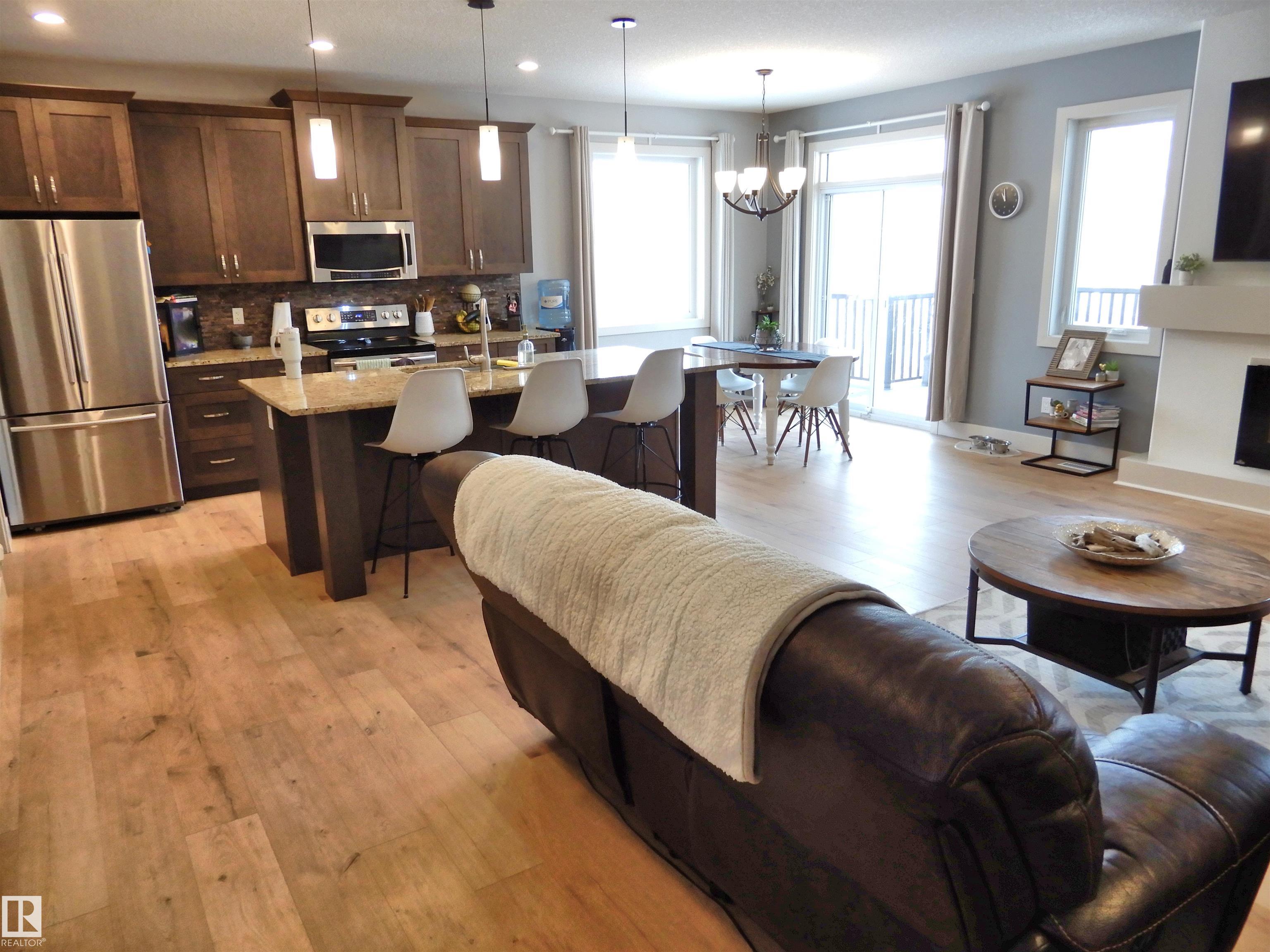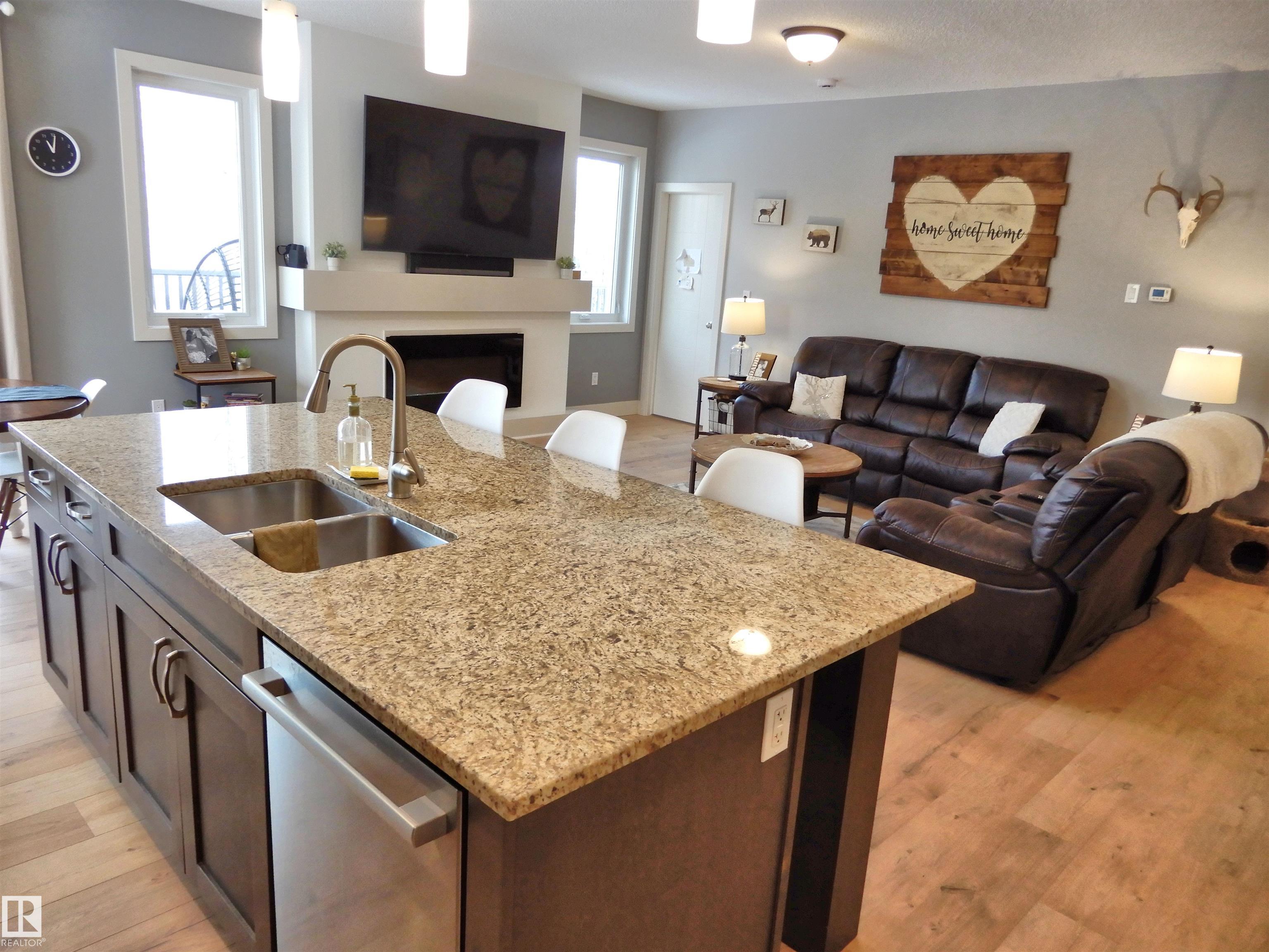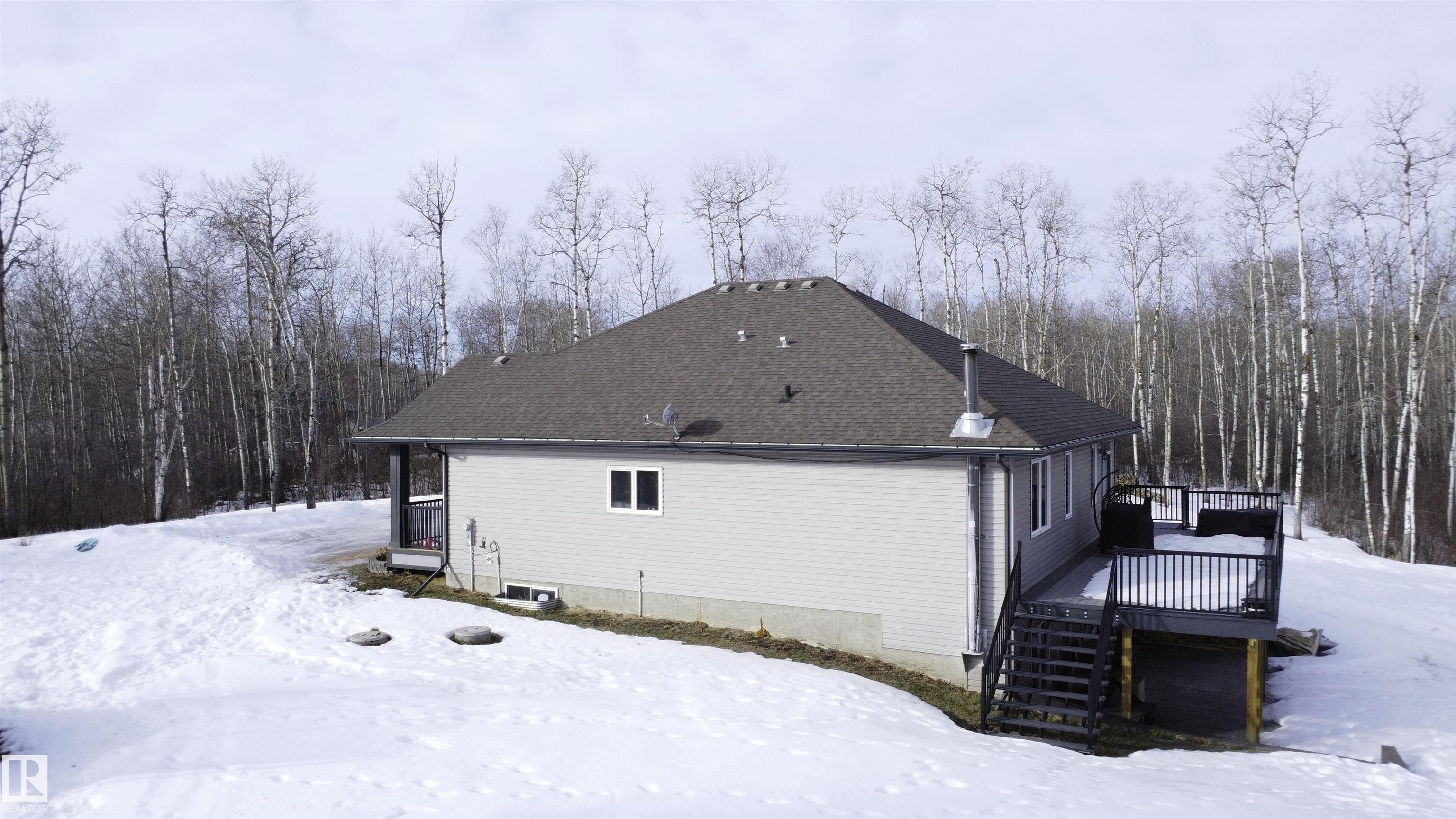 Welcome to Bridlewood Mews, where comfort, privacy, and nature come together. Built in 2014, this 1,356 sq. ft. bungalow is located in the sought-after Bridlewood Mews subdivision near Onoway. offering a serene setting with no rear neighbors and mature trees as your backdrop. The main level features a bright, open-concept layout with lots of natural light and a spacious chefs kitchen with quartz counters and tons of cabinets, ideal for entertaining. The living room is warm and inviting with a cozy fireplace, perfect for year-round relaxation. This air conditioned home offers four bedrooms and three bathrooms, including a private primary suite with a custom spa ensuite with custom shower. The fully finished walk-out basement adds value and function, complete with an incredible custom bar and wood-stove fireplace. Outside, enjoy a huge deck, large yard with a garden and fruit trees backing onto a forest for those who value outdoor living. The 25' x 23' heated garage is sure to please. Come see for yourself!
