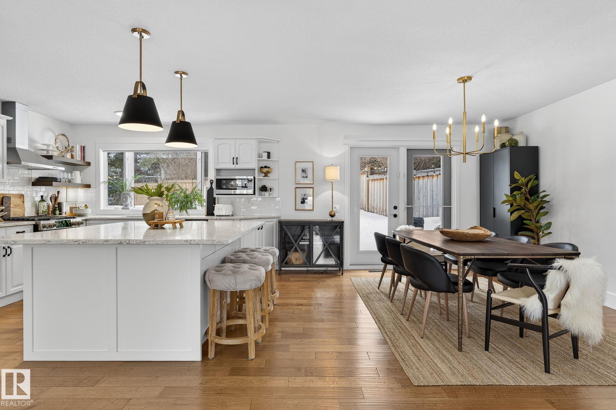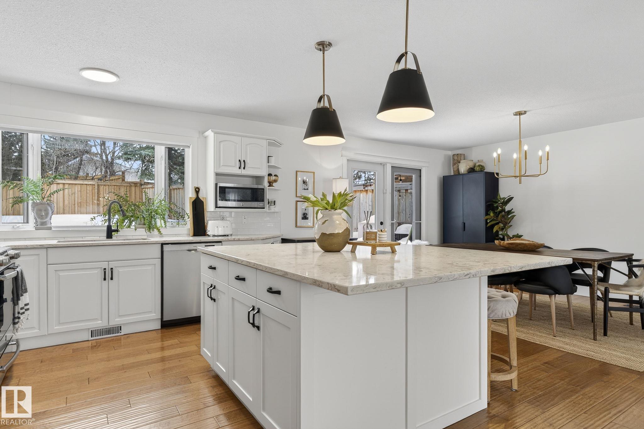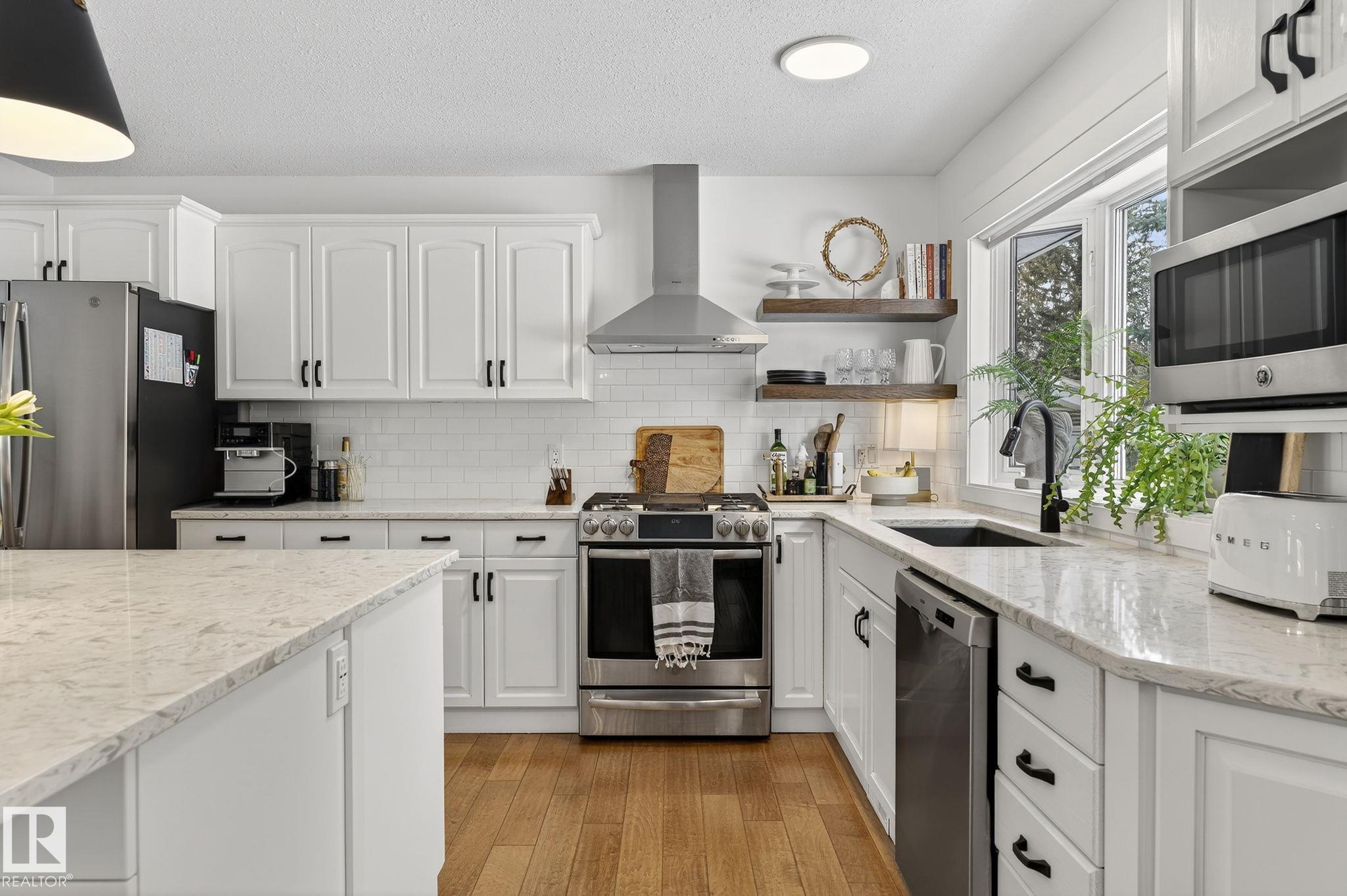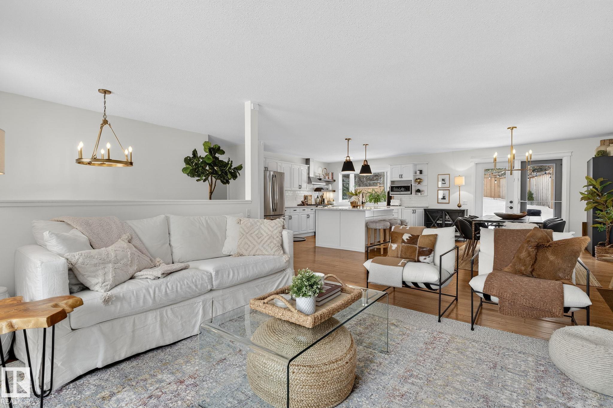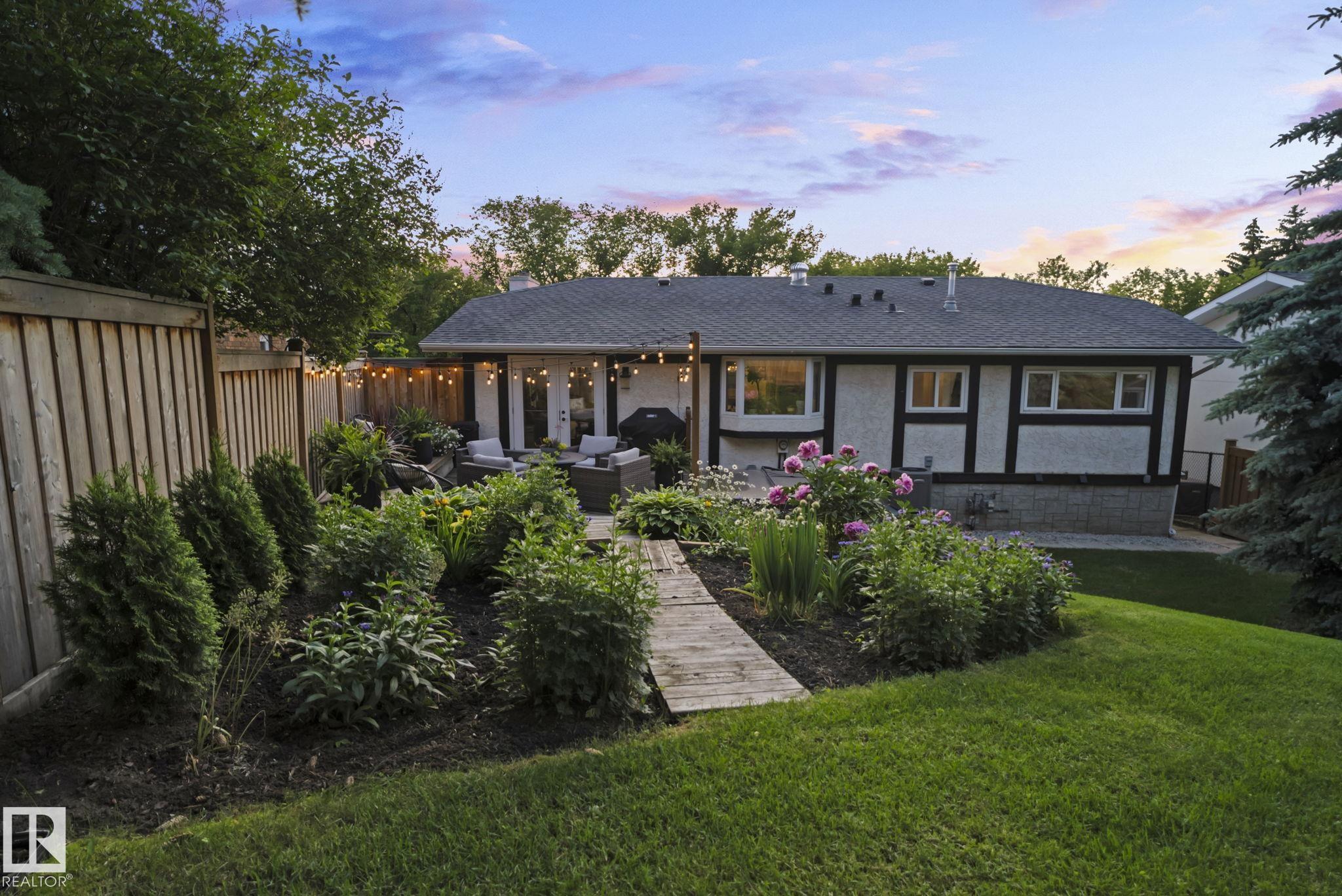 Set on a quiet, tree-lined street in the desirable Gardens neighbourhood of St. Albert, this meticulously renovated bi-level offers 4 bedrooms, 2.1 bathrooms, and 1,402 sq ft of thoughtfully designed living space, complete with a heated oversized double attached garage w/ epoxy flooring. The sun-filled main floor features an open living and dining area, highlighted by rich hardwood flooring & refined contemporary finishes. The fully renovated kitchen showcases quartz countertops, stainless steel appliances, a central island, & a charming bay window overlooking the private backyard. The finished lower level offers additional living space with a bright family room centered around an electric fireplace, fourth bedroom, laundry, and convenient 2-piece bath?perfect for families or guests. Enjoy the beautifully landscaped backyard complete with a hot tub, ideal for entertaining or relaxing. New furnace/AC (2024), HWT & shingles (2020), newer windows. The perfect family home in the desirable Gardens community.