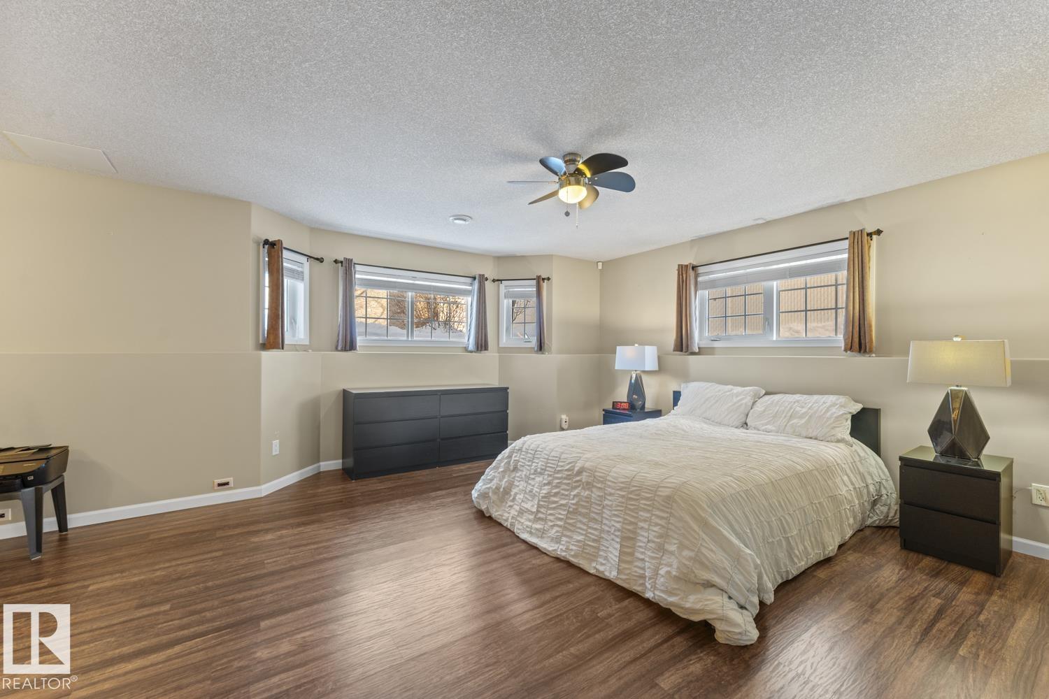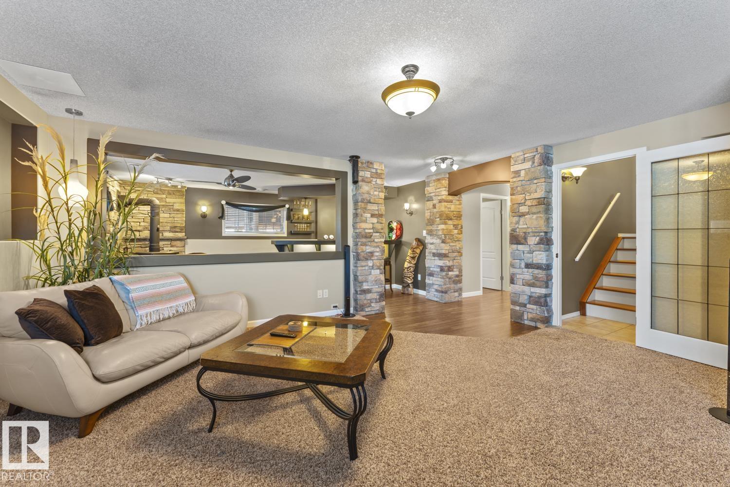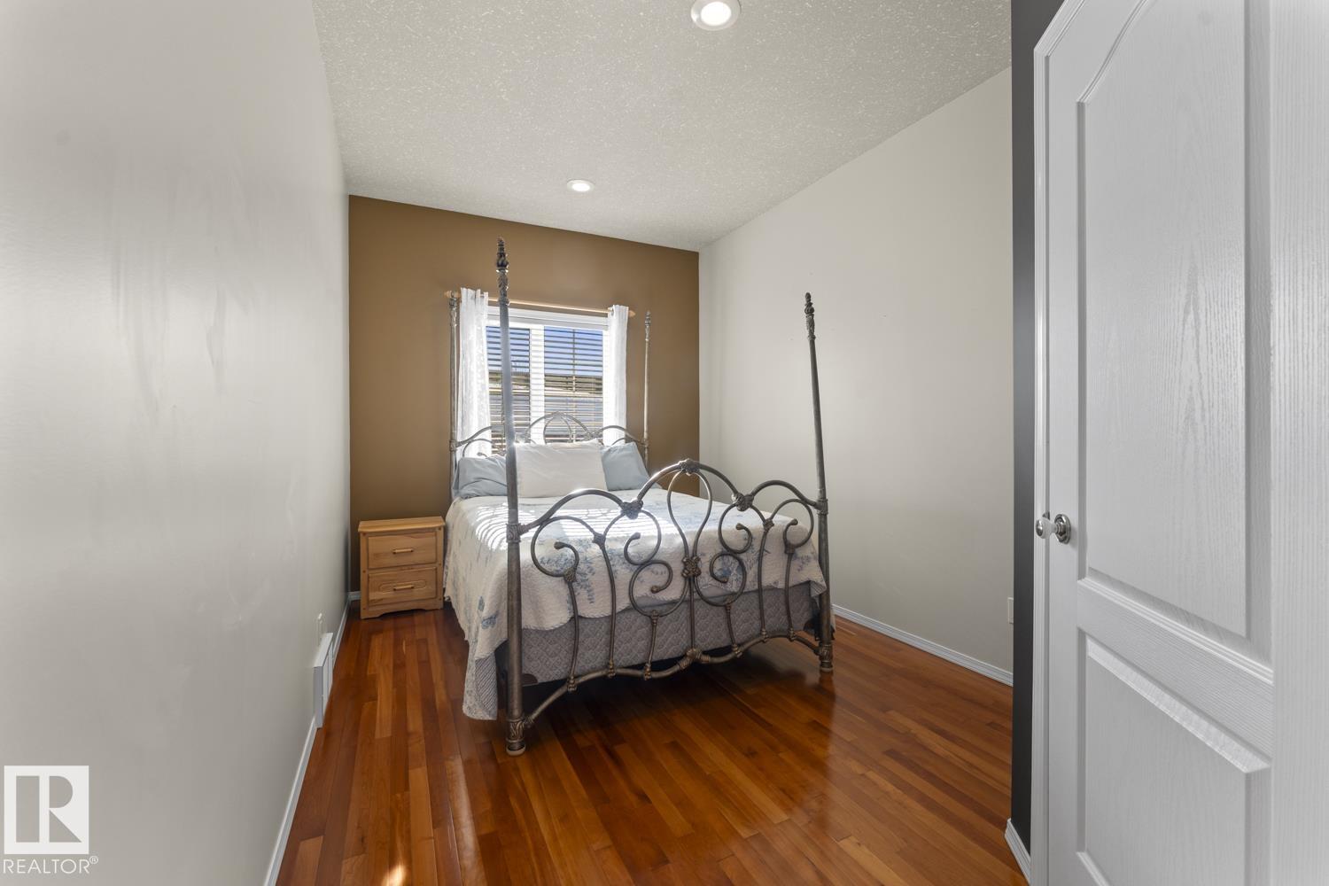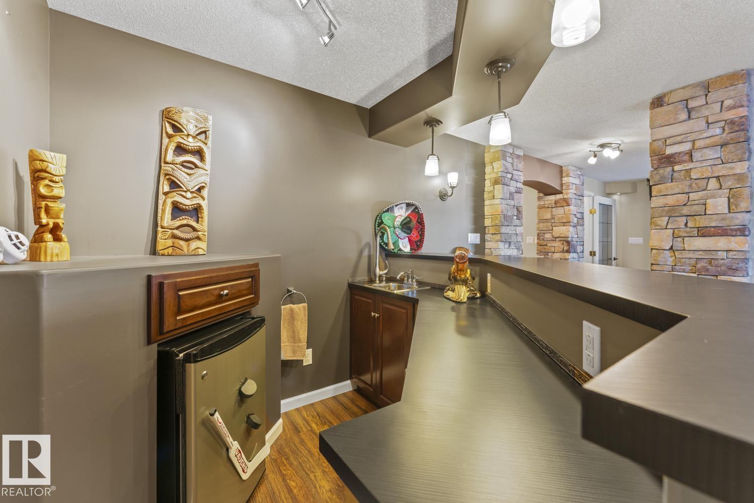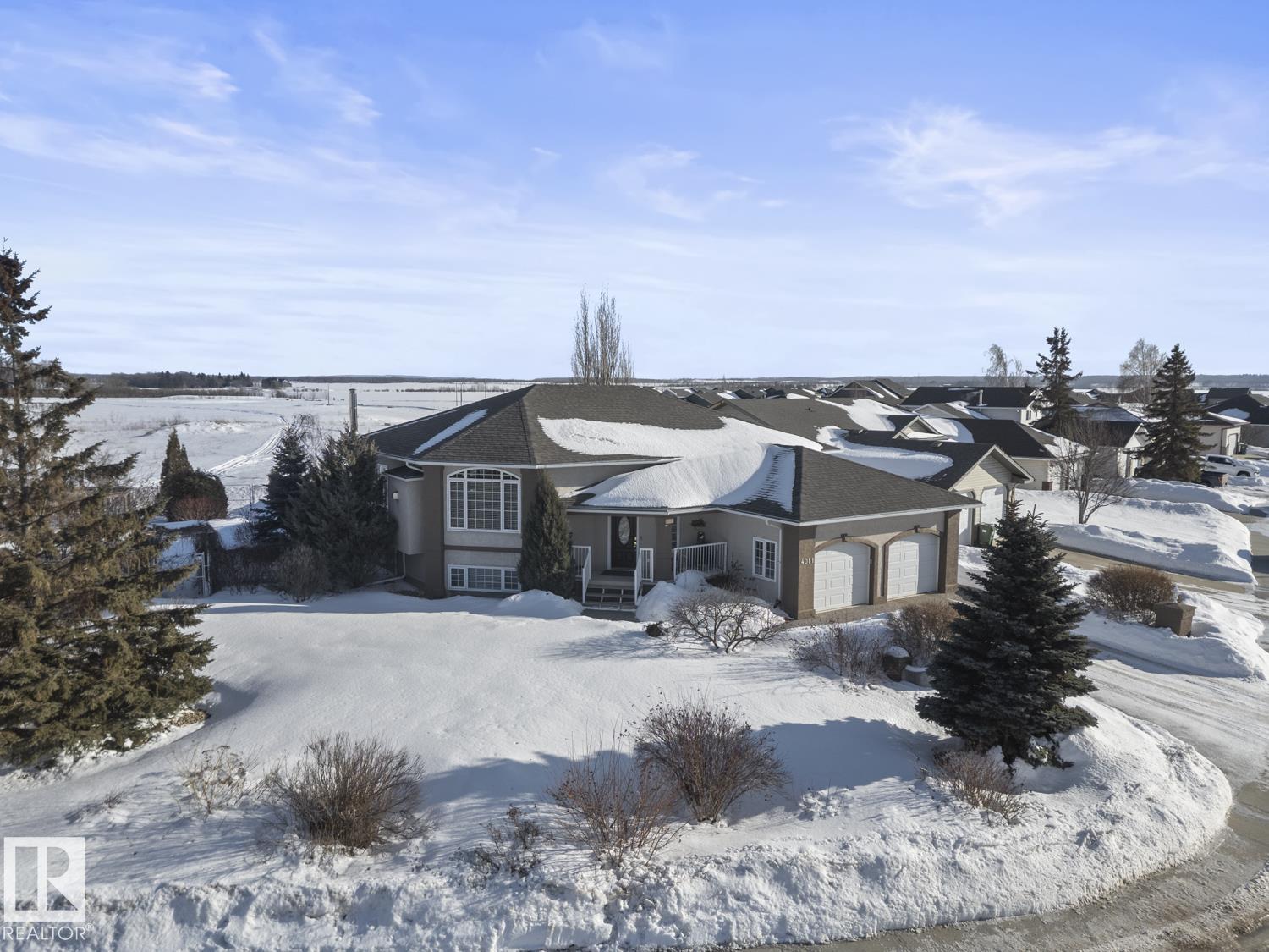 This custom-built home sits on two landscaped lots and offers exceptional space inside and out. The main floor features a modern kitchen with quartz countertops, stainless steel appliances, and a bright, open living area with a fireplace. The primary bedroom includes a 4-piece ensuite with jacuzzi tub, separate 4-ft shower, and his-and-hers walk-in closets. A second bedroom can function as a home office. The lower level has in-floor heating, a large family/games room with wood stove, full wet bar, a spacious third bedroom with access to a 3-piece bathroom, plus dedicated laundry and storage areas. An oversized heated double attached garage and an additional heated double detached garage provide ample parking and workspace. Professionally landscaped yard with underground sprinklers and mature trees completes this one-of-a-kind property.