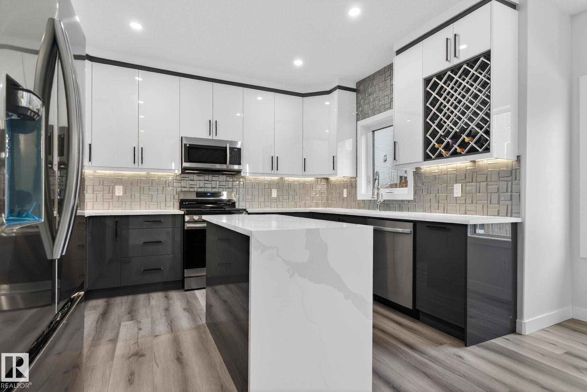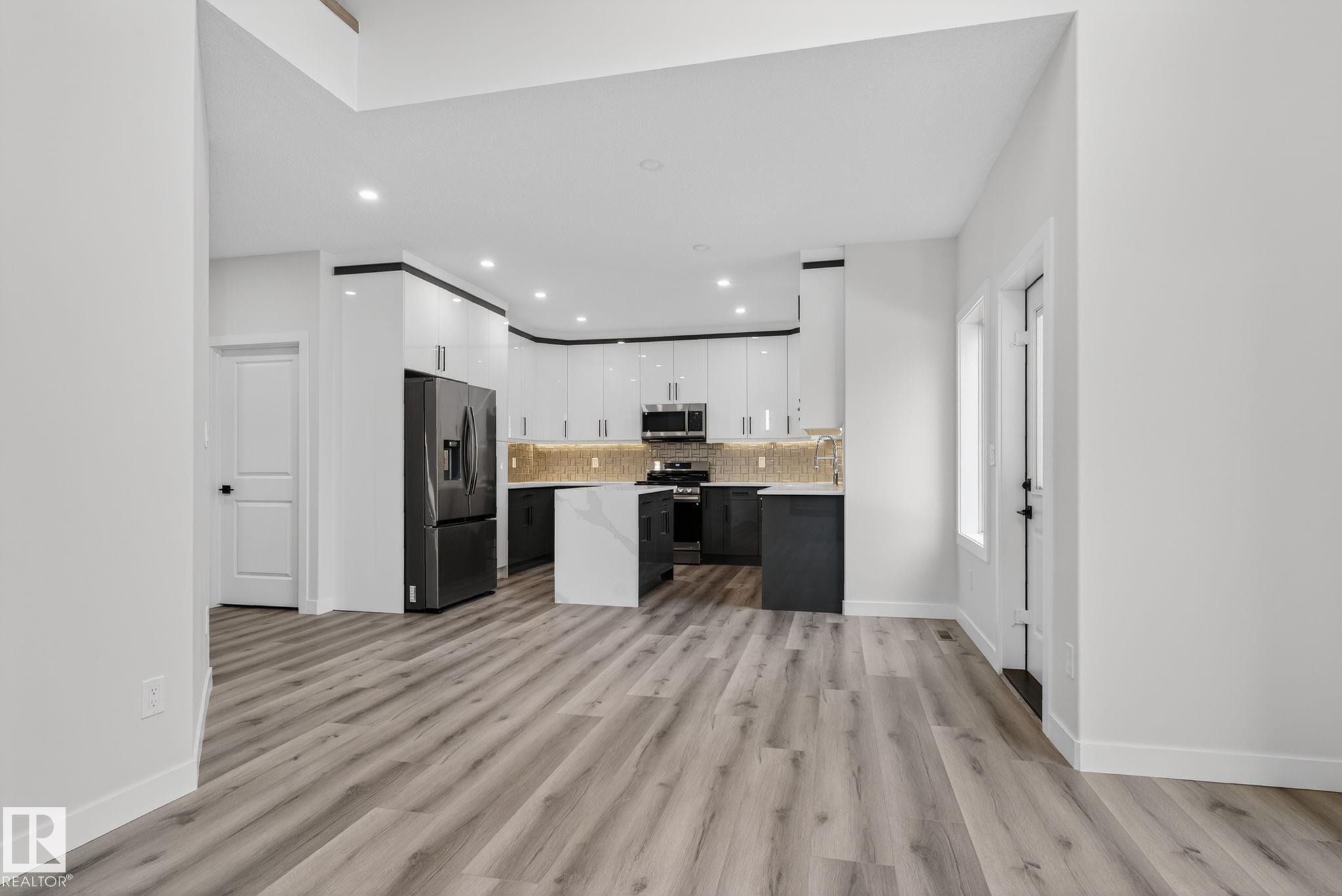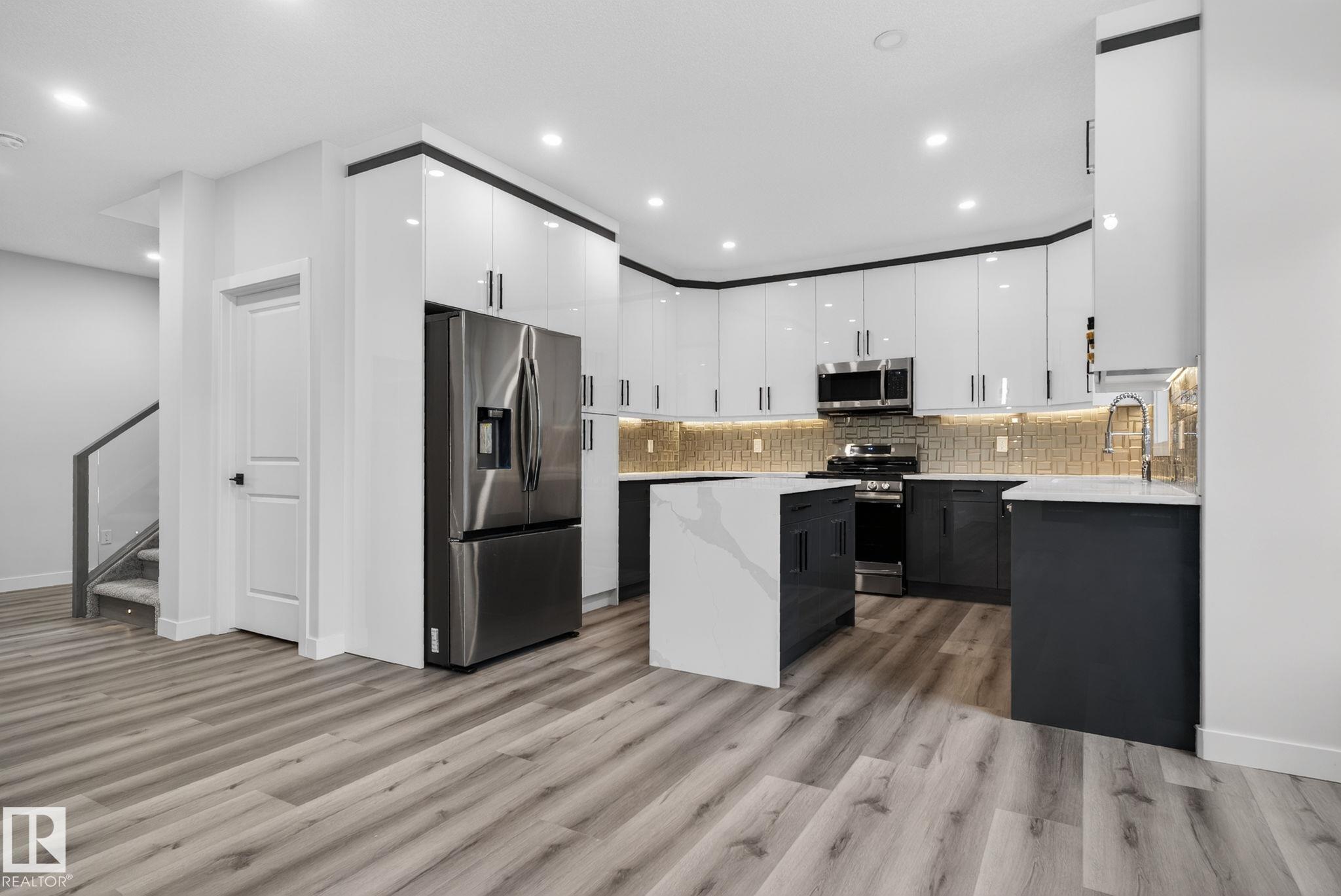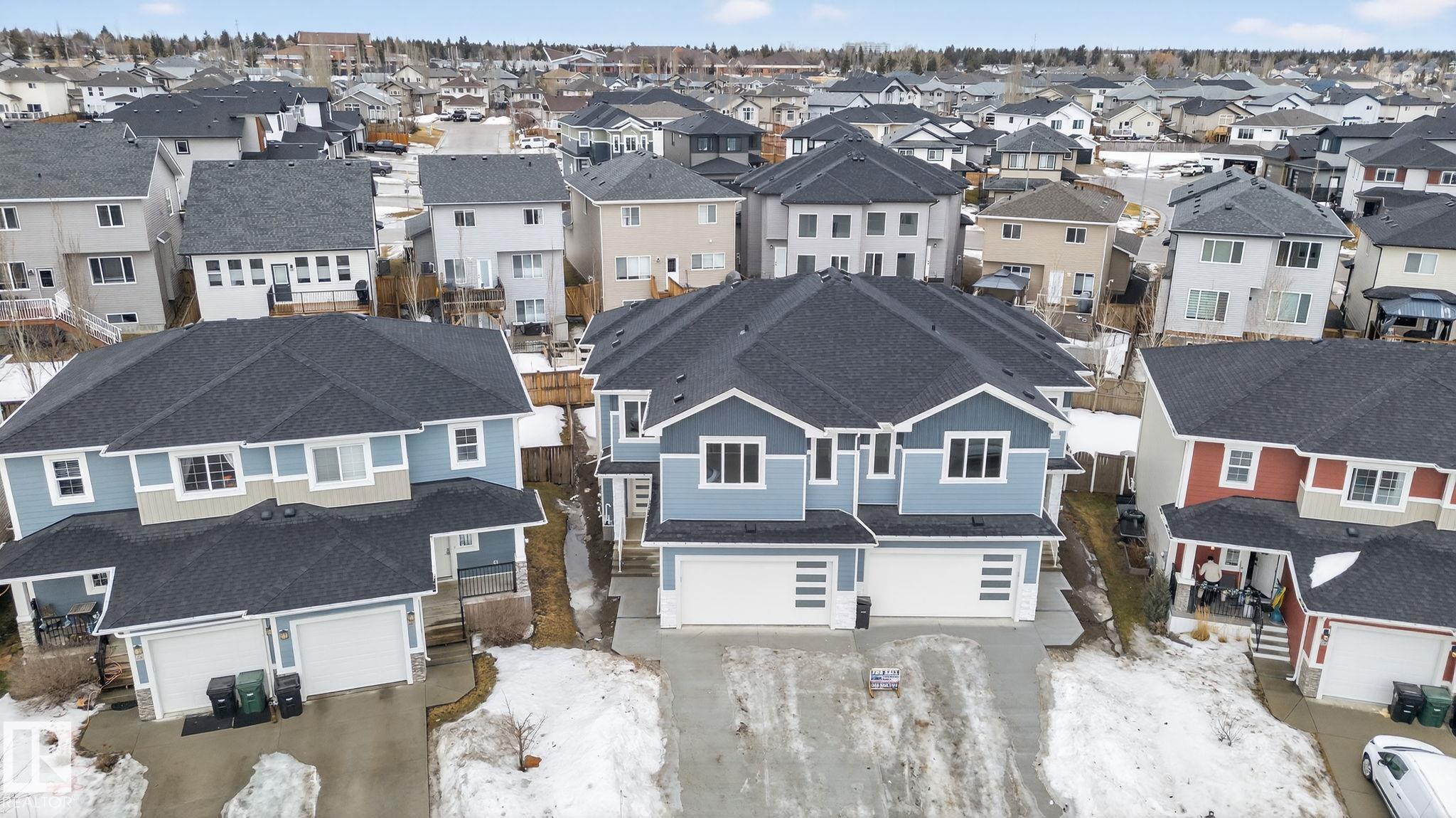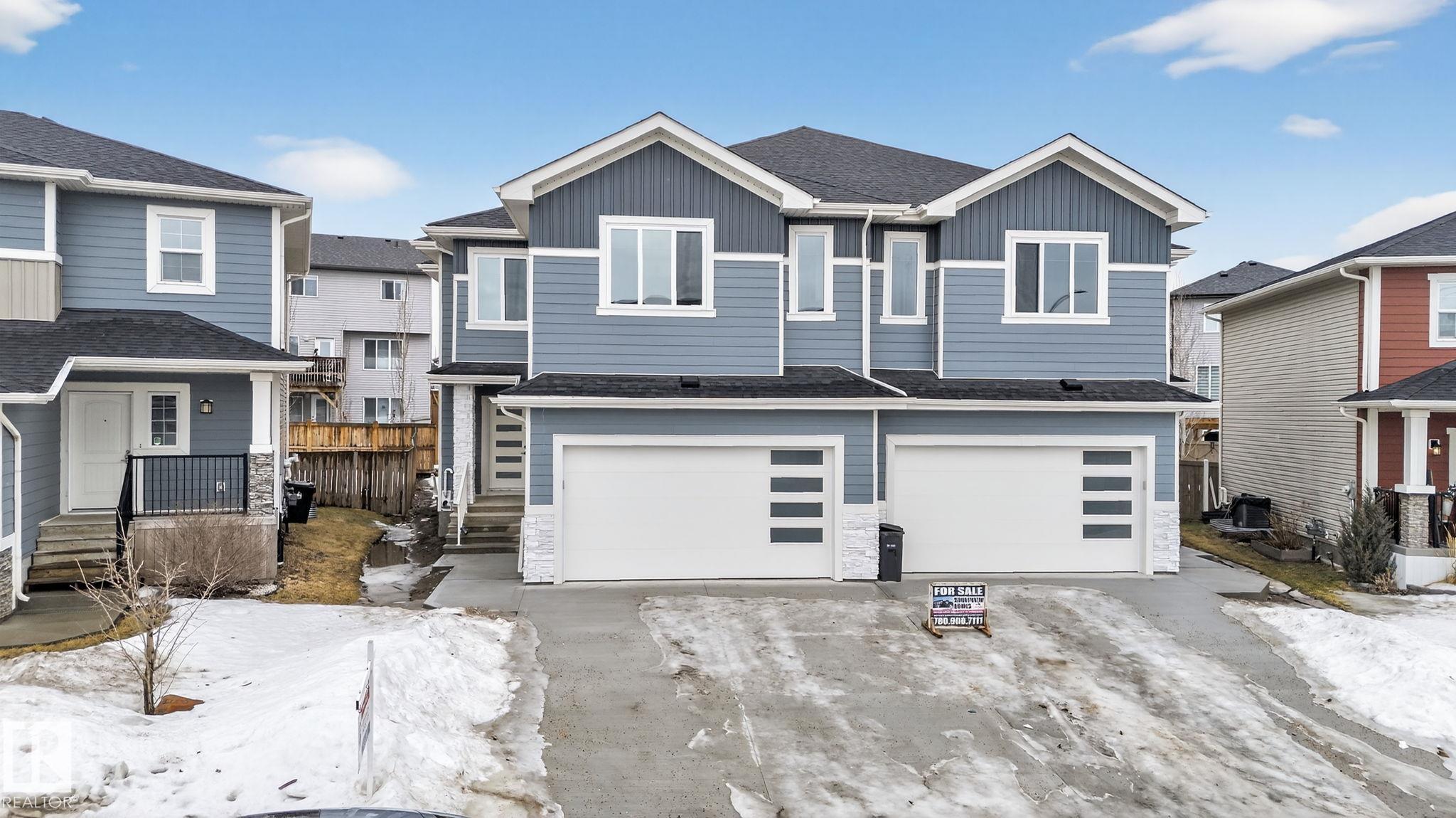 RARE FIND! Built by Sunnyview Homes this half duplex boasts over 2100sqft. OVERSIZED double attached garage with a HUGE 4 car driveway. Main floor den/bedroom with a 3-piece bathroom. The U-shaped kitchen features, upgraded ceiling height cabinets with quartz countertops. The open to below living space has a feature wall with an electric fireplace. The glass railing with step lights leads upstairs to a good sized bonus room over looking the living room. Primary bedroom features a WIC and 5-piece ensuite with double vanity, jacuzzi and custom shower w/bench for added convenience. Additionally there are 2 good sized bedrooms that share a 4-piece bathroom. Features upper level laundry, a separate side entrance to the basement, large backyard, 3 gas lines, garage drain, plush carpet, premium lighting package, MDF shelving and much more. Plenty of large windows throughout. Close to shopping, schools, and public transportation. The size and upgrades are a rare find for a duplex! Must see.