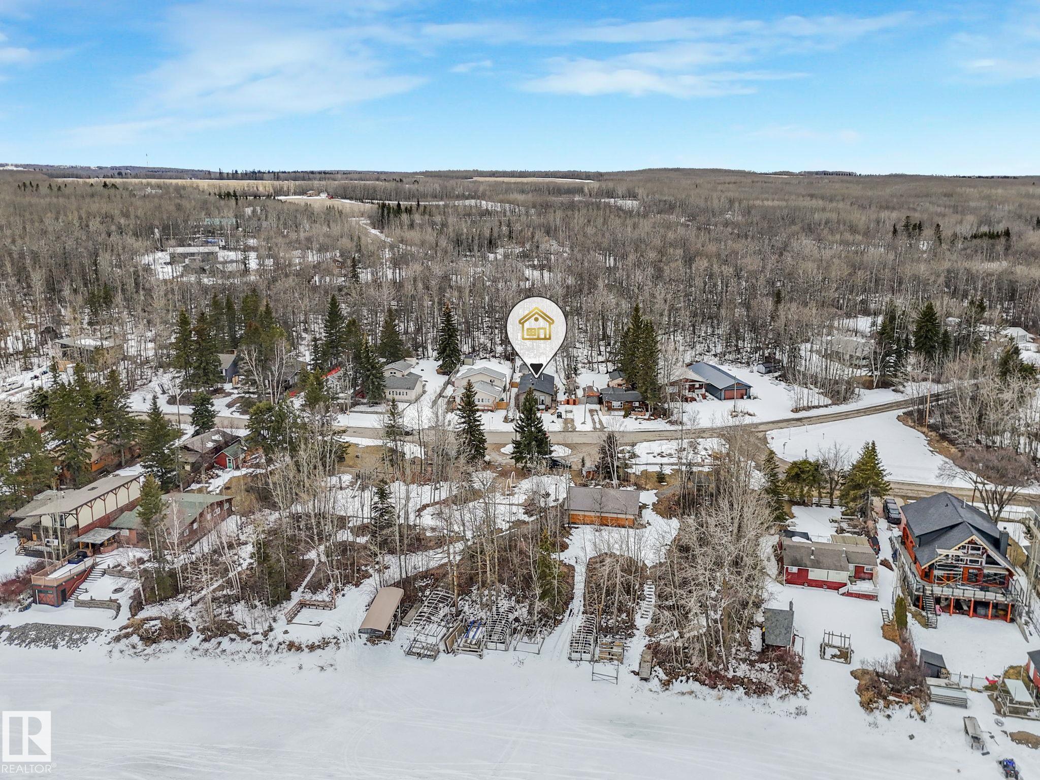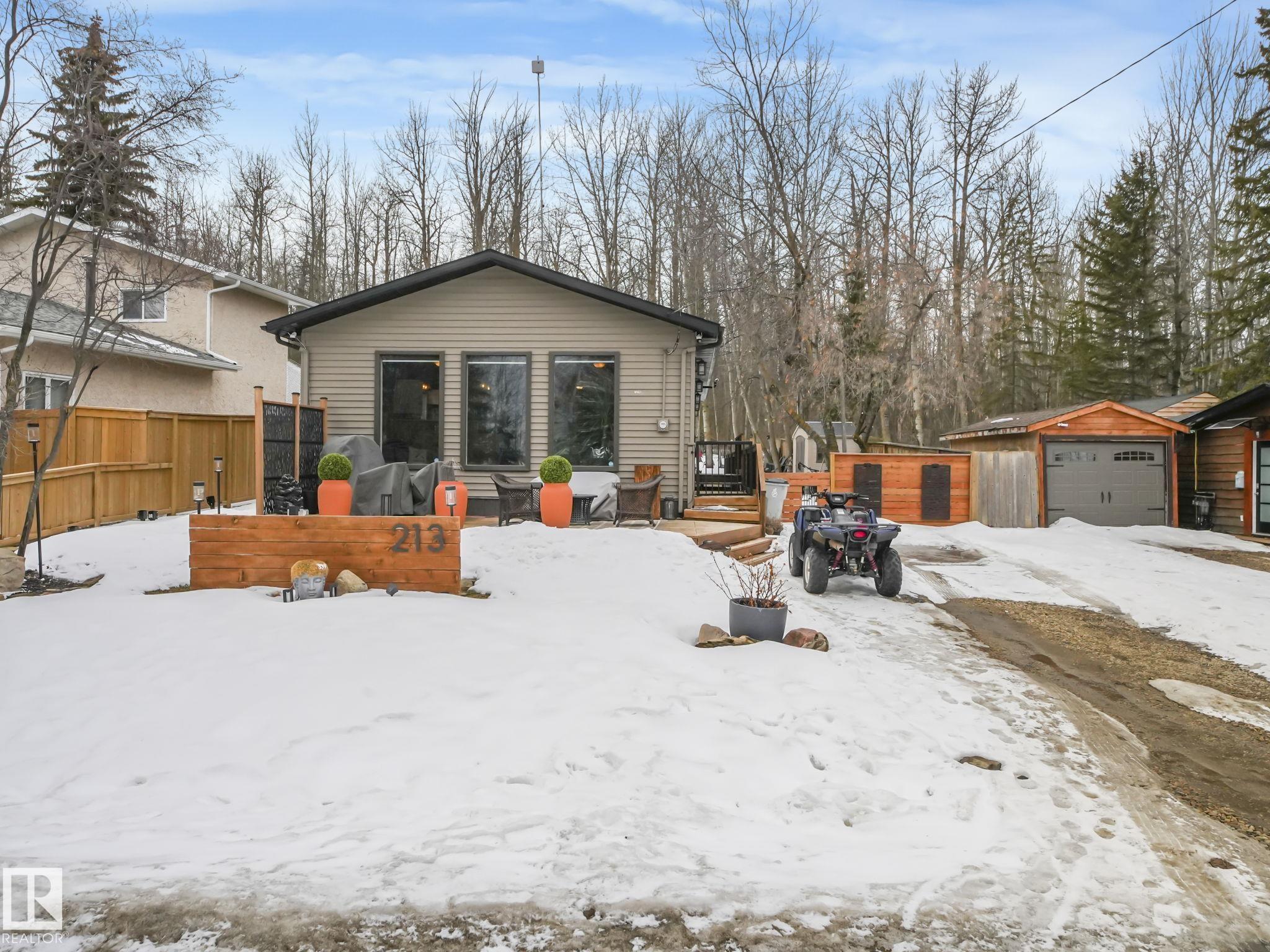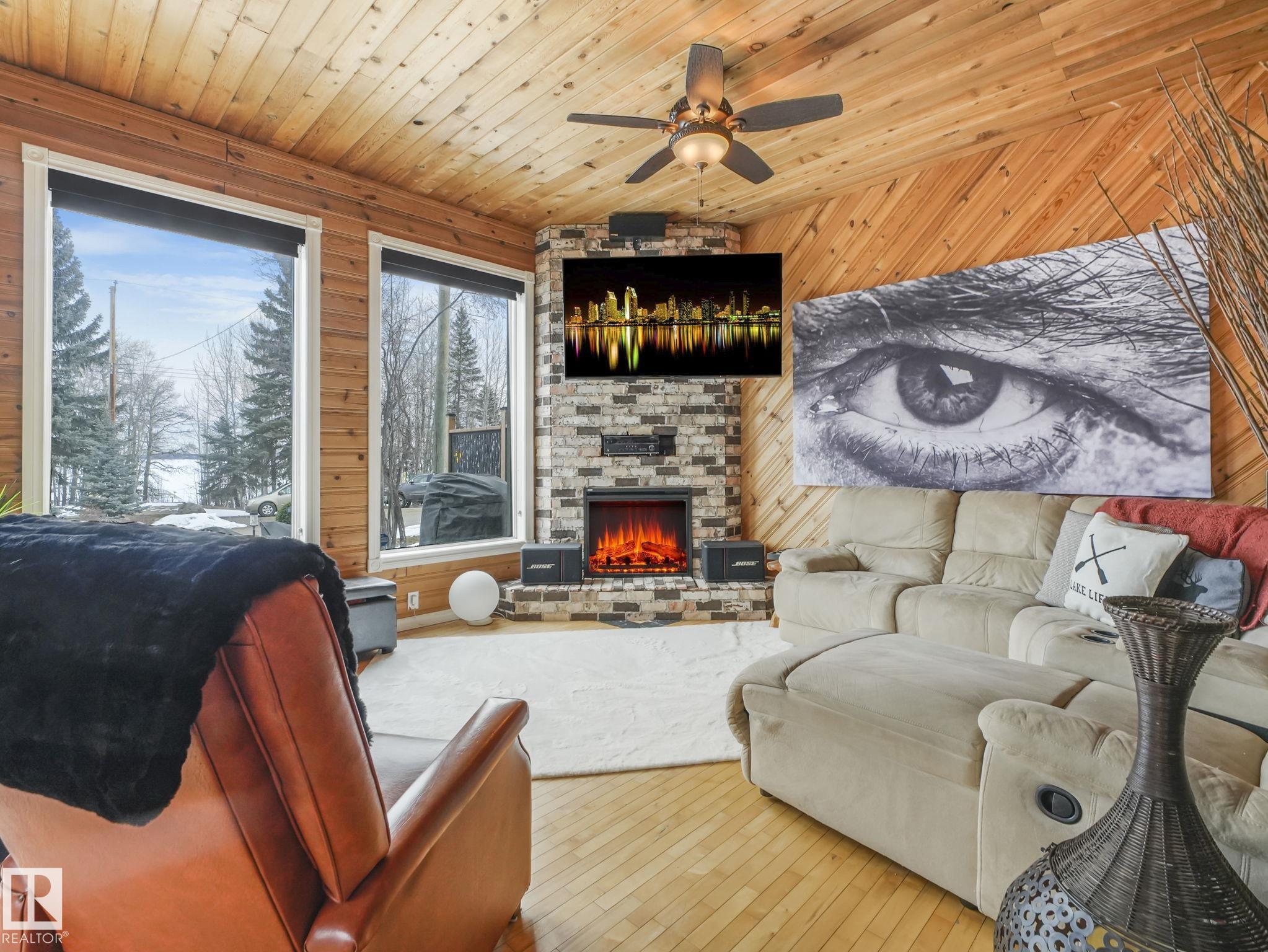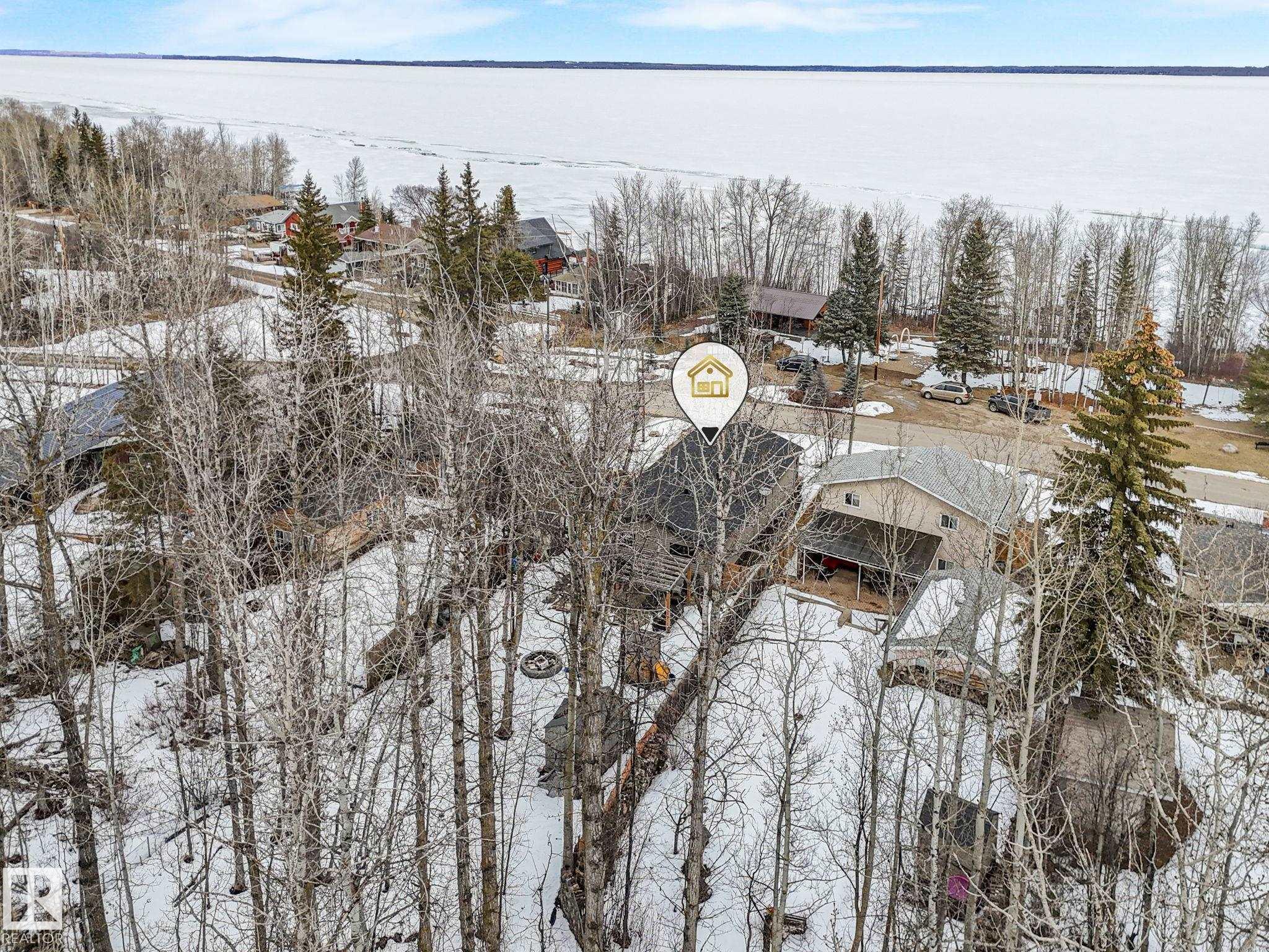 Welcome to this inviting 1,260 sq. ft. bungalow offering year round living in a sought-after location across from the playground, second row lake property, gorgeous lake view and boat access right out front! This 3-bedroom home showcases an updated bathroom and tasteful finishes throughout, including newer flooring, modern lighting, and warm cedar accents. The sunken living room features a cozy fireplace, vaulted ceiling, and large windows that capture beautiful lake views. Outside, enjoy a private, treed backyard complete with a patio, pergola, and firepit, plus direct access to scenic trails leading to Pigeon Lake Village. Recent upgrades include a new roof, municipal sewer, newer siding, updated mechanical systems, and crawl space improvements. Additional highlights include a front deck, storage sheds, and easy access to the lake with a shared dock just a short walk away. A perfect blend of comfort, privacy, and lakeside living. Also minutes to the Village at Pigeon Lake!