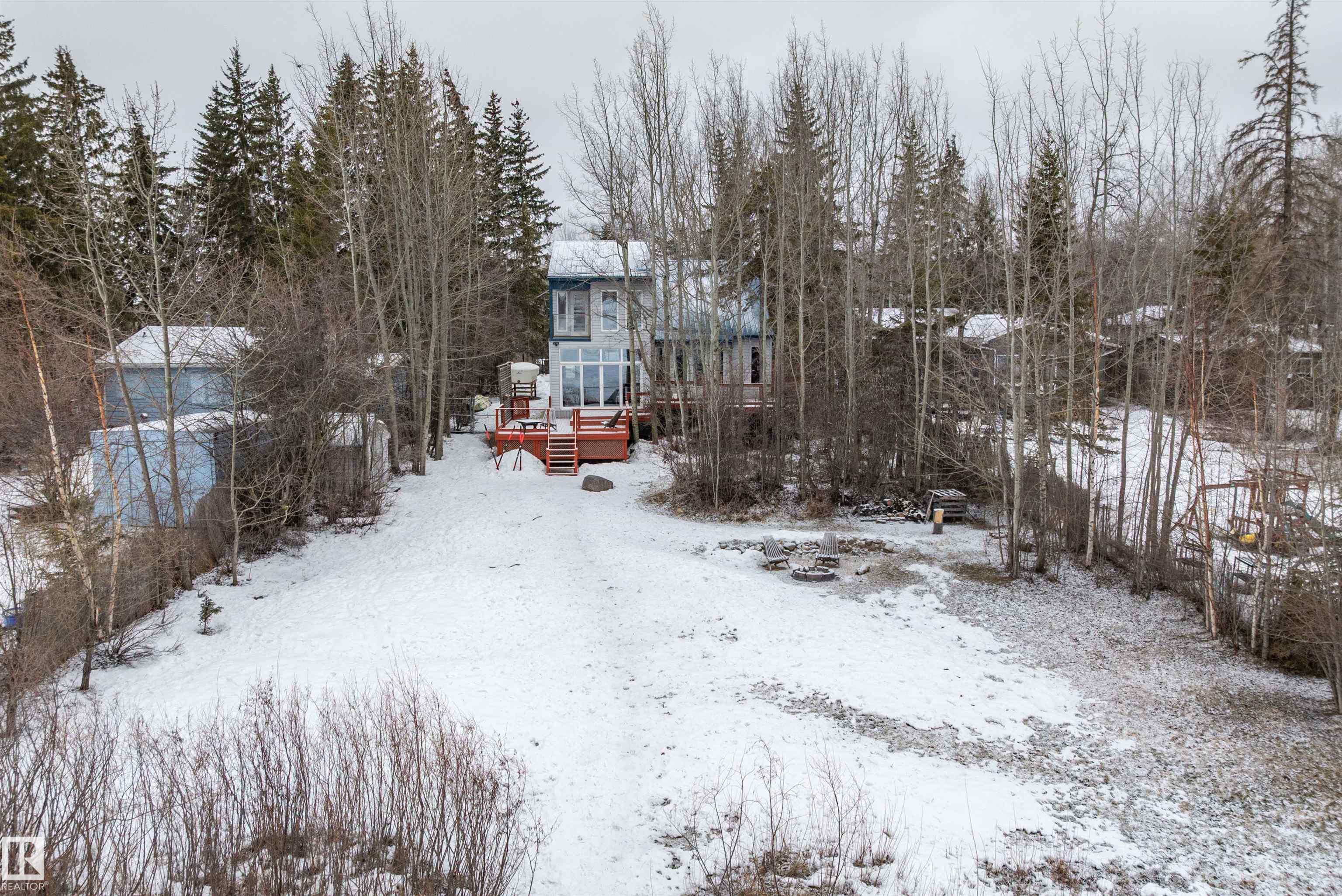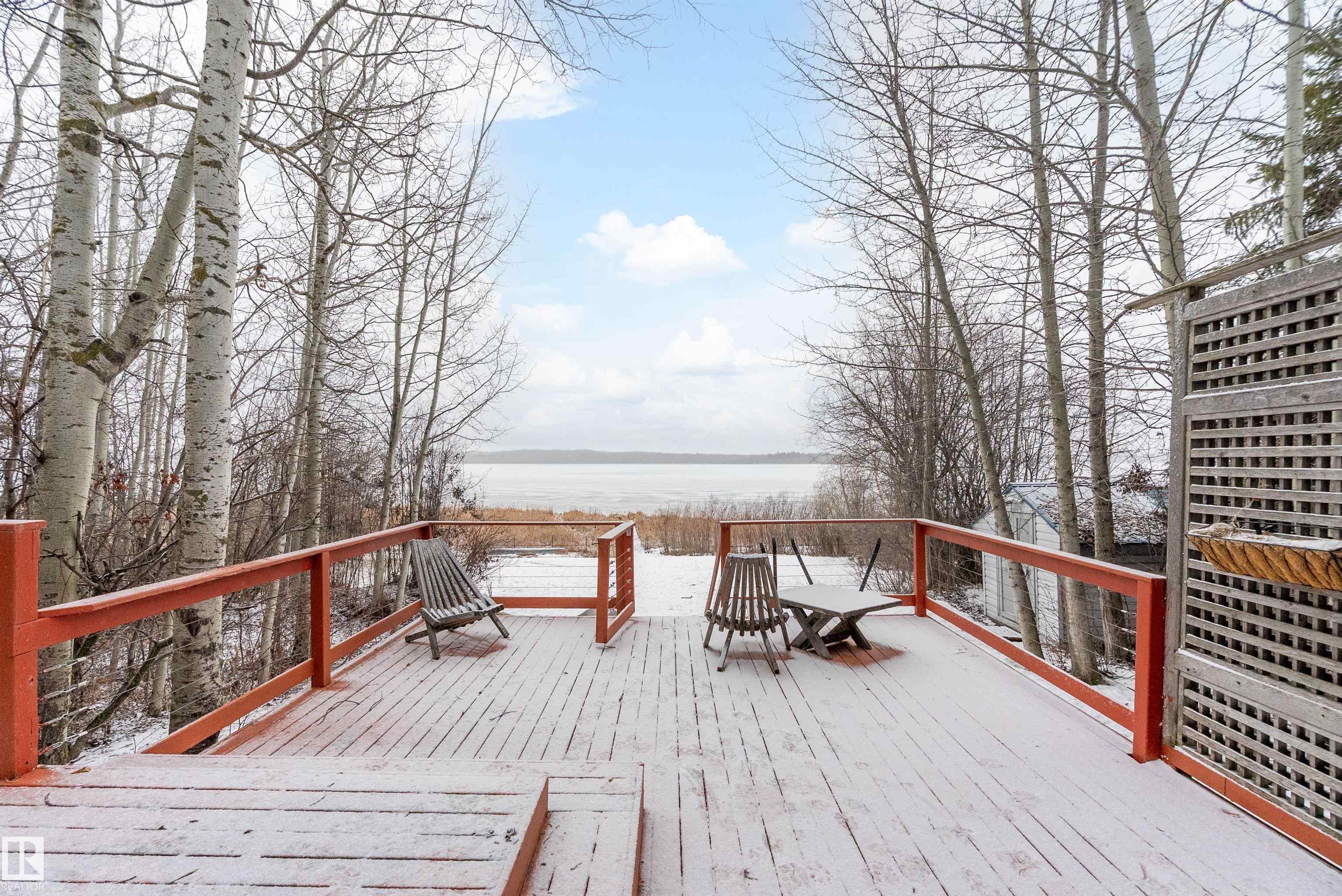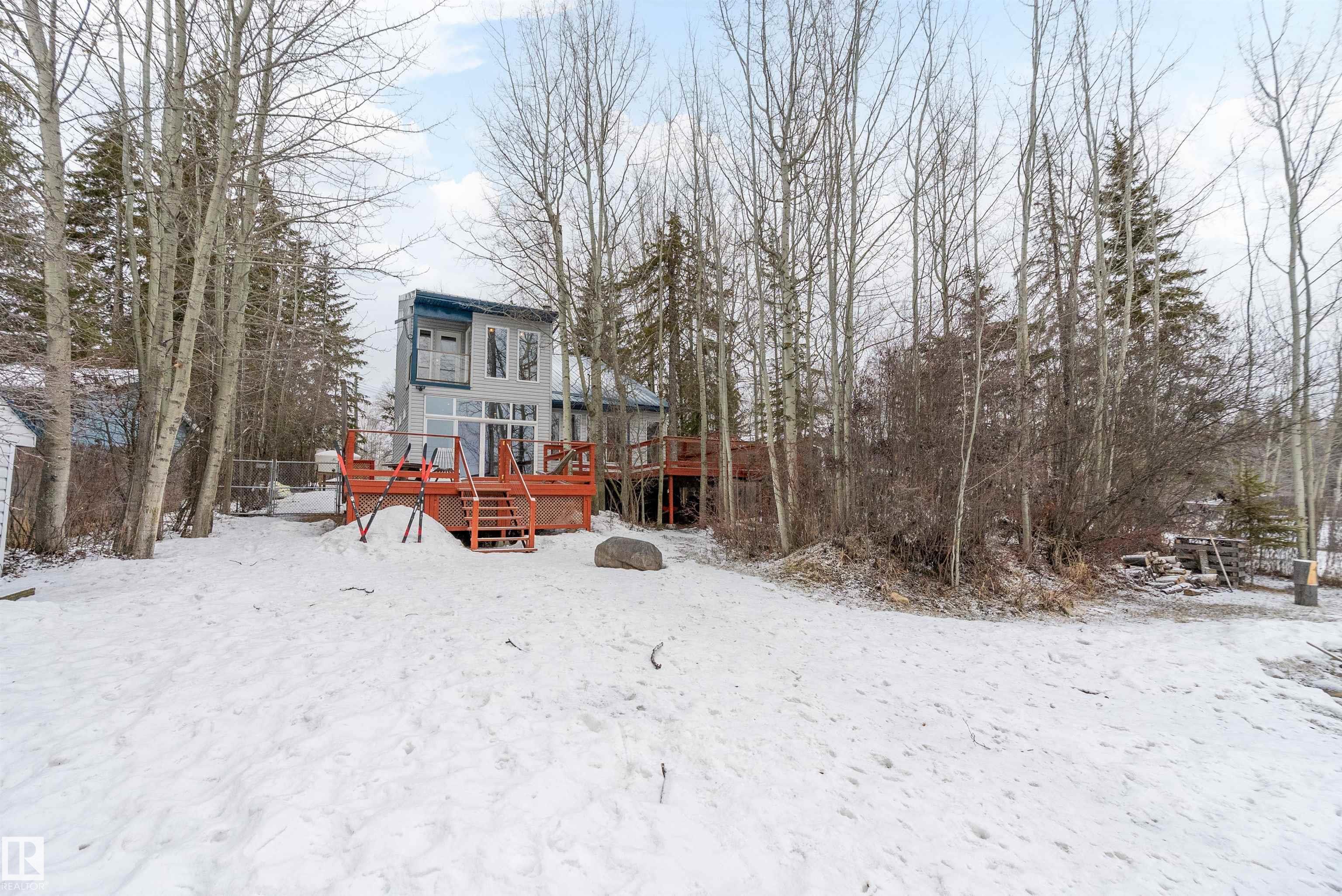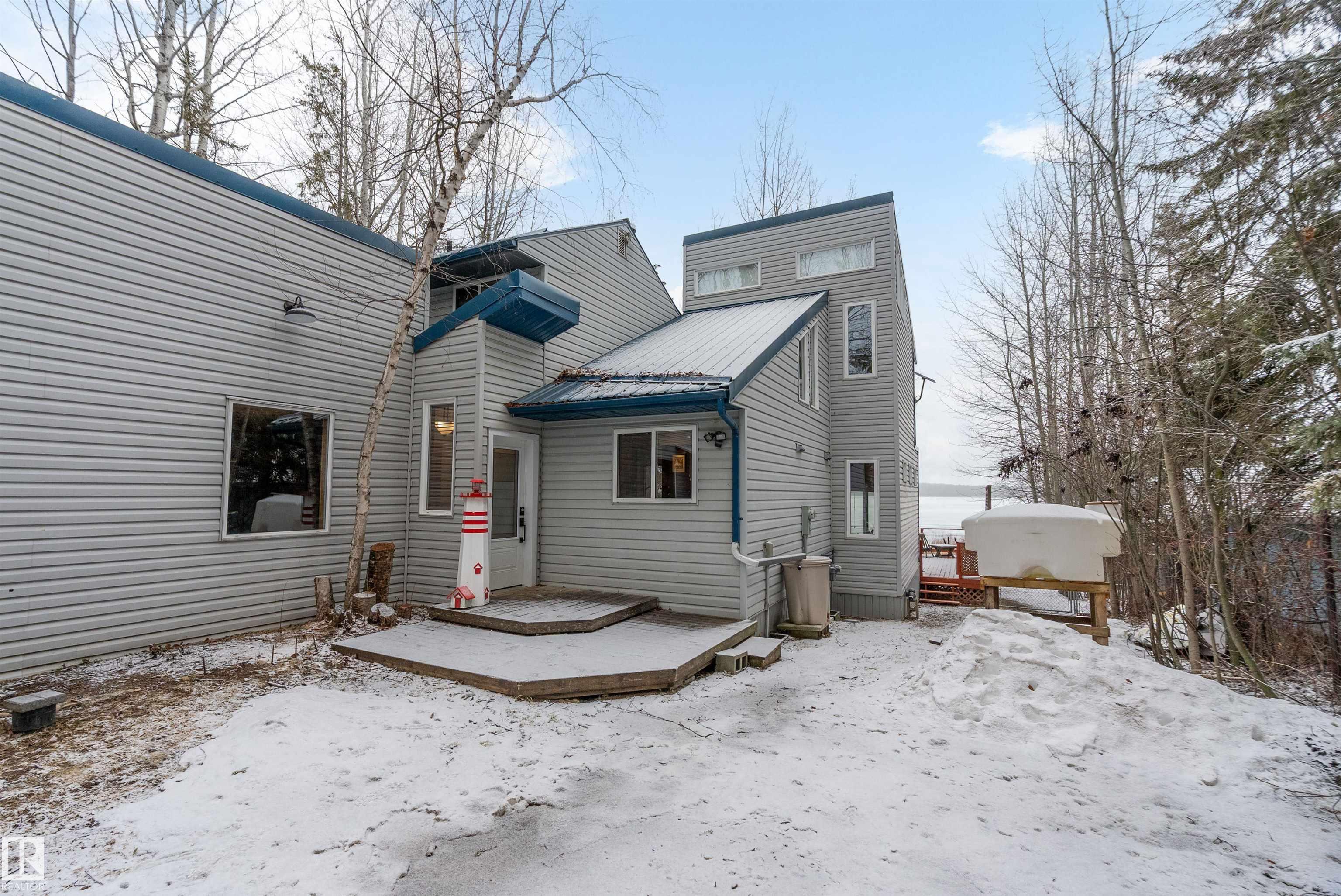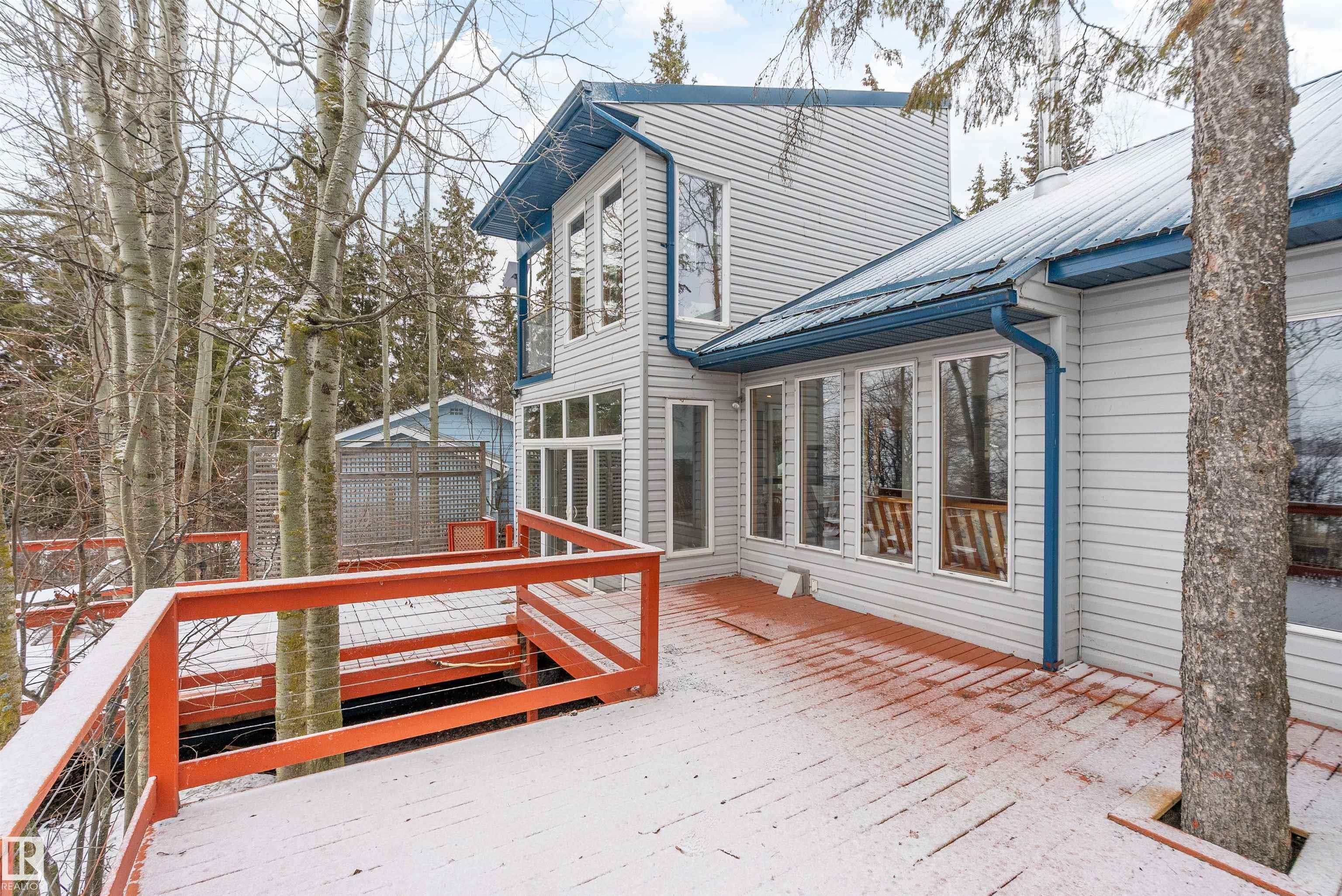 Beautiful, secluded lakefront home! Backing onto quiet Sandy Lake just 30 minutes from Edmonton, at the end of a cul-de-sac with walls of windows to appreciate the serene views over the tiered decks, through the sheltering trees & lawn, to the reeds of your own lake access. Inside, this 1991 2-storey has soaring open vault ceilings so that the views can be appreciated from both floors. Gorgeous slate counters & tile floors, a wood stove for cozy winter nights, gas range in the kitchen, main floor laundry & bathroom, as well as a main floor bedroom. The primary bedroom upstairs has it?s own private balcony looking onto the lake; there?s a 3rd bedroom upstairs, and a quaint bathroom with tiled steam shower & soaker tub. Comes with an attached double tandem garage with additional storage above, work bench, cabinets and additional parking in front for boat/RV/trailer. With a low maintenance metal roof & cistern with potable water, you?ve got all the amenities with the lifestyle you?ve been dreaming of!