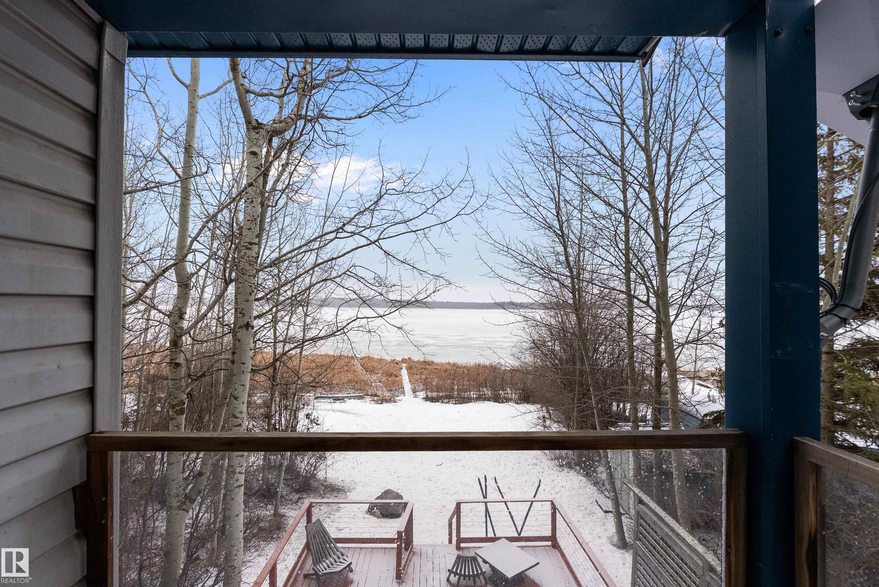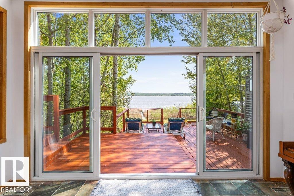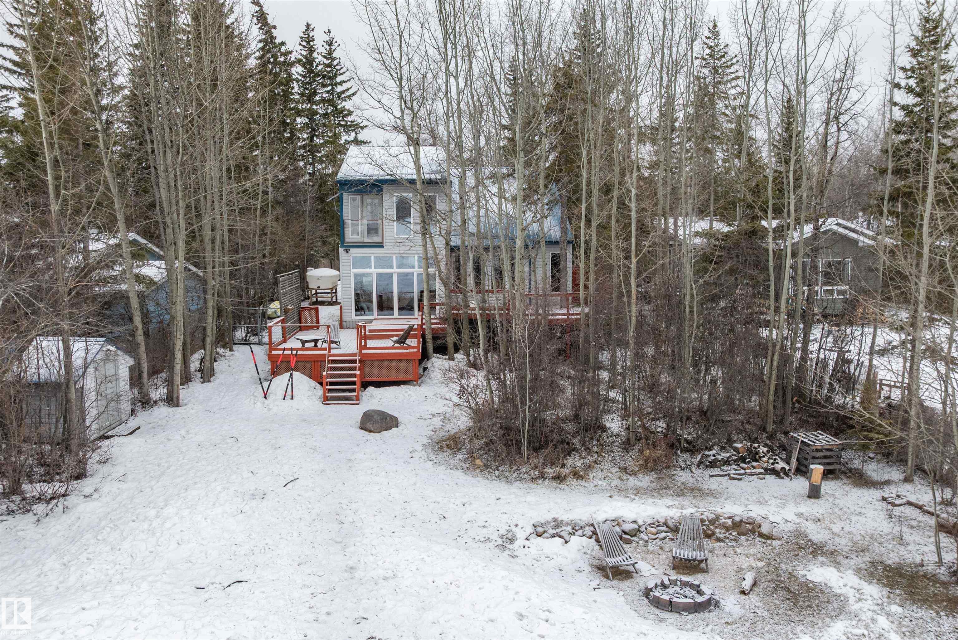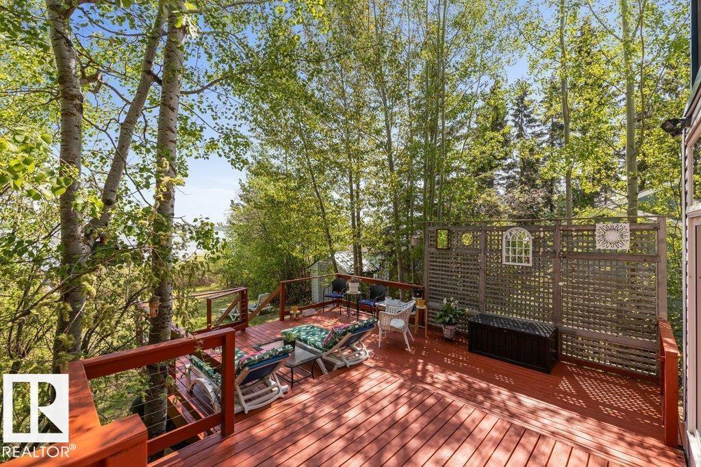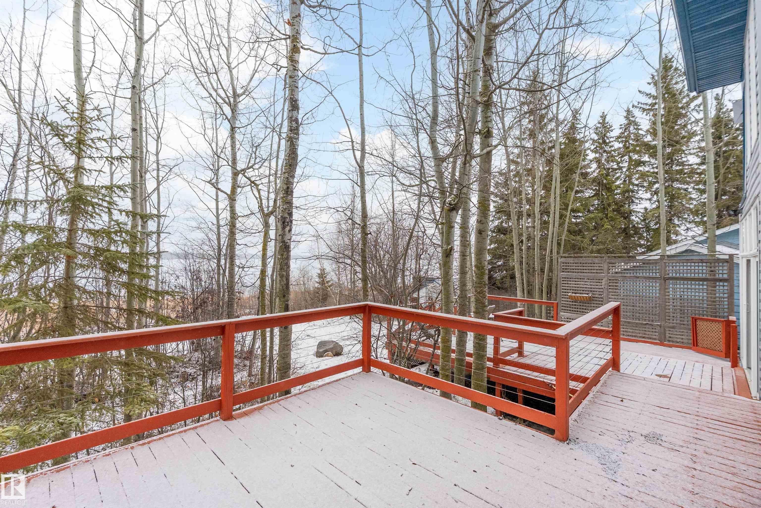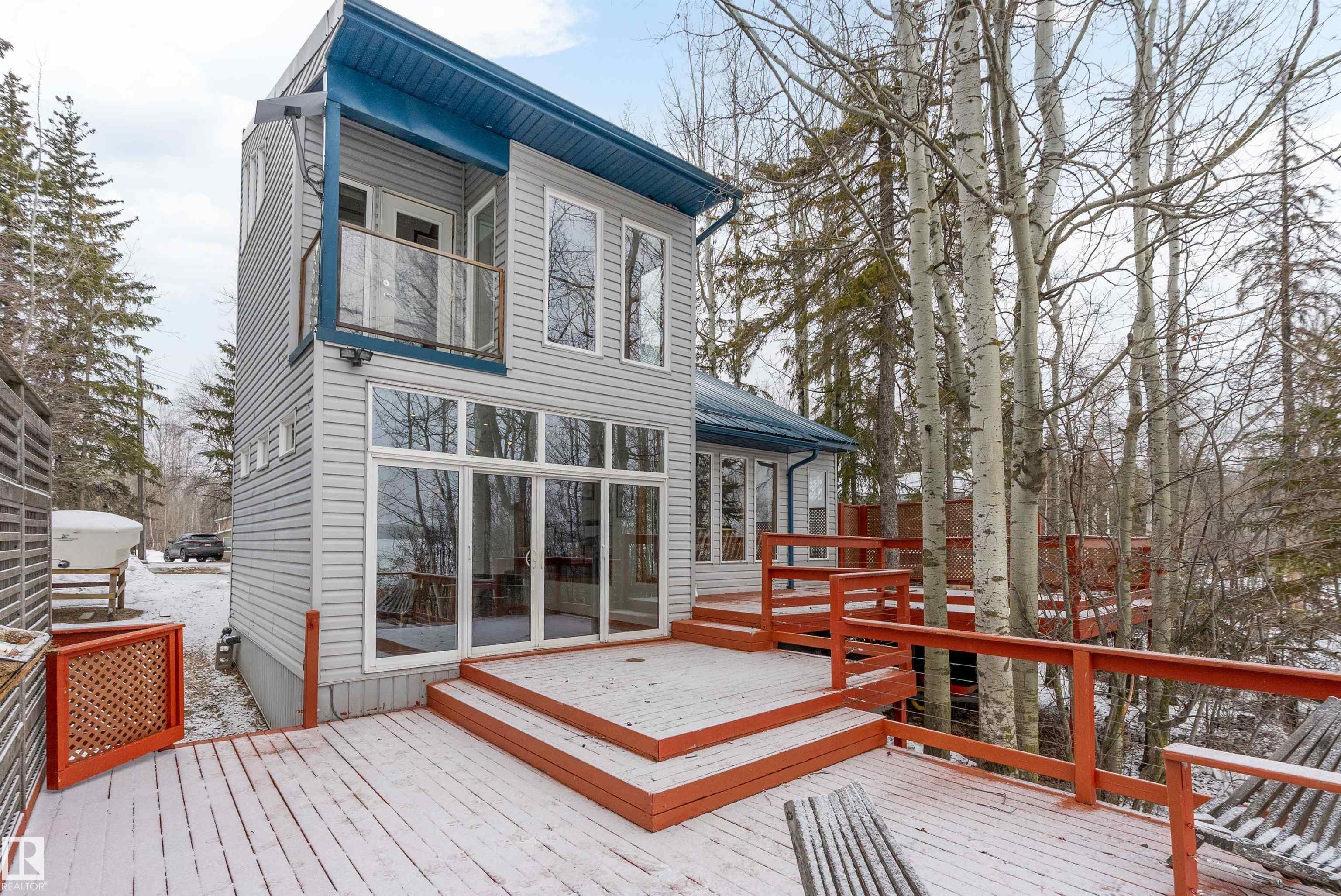 Beautiful, secluded lakefront home! Backing onto quiet Sandy Lake just 30 minutes from Edmonton, at the end of a cul-de-sac with walls of windows to appreciate the serene views over the tiered decks, through the sheltering trees & lawn, to the reeds of your own lake access. Inside, this 1991 2-storey has soaring open vault ceilings so that the views can be appreciated from both floors. Gorgeous slate counters & tile floors, a wood stove for cozy winter nights, gas range in the kitchen, main floor laundry & bathroom, as well as a main floor bedroom. The primary bedroom upstairs has it?s own private balcony looking onto the lake; there?s a 3rd bedroom upstairs, and a quaint bathroom with tiled steam shower & soaker tub. Comes with an attached double tandem garage with additional storage above, work bench, cabinets and additional parking in front for boat/RV/trailer. With a low maintenance metal roof & cistern with potable water, you?ve got all the amenities with the lifestyle you?ve been dreaming of!