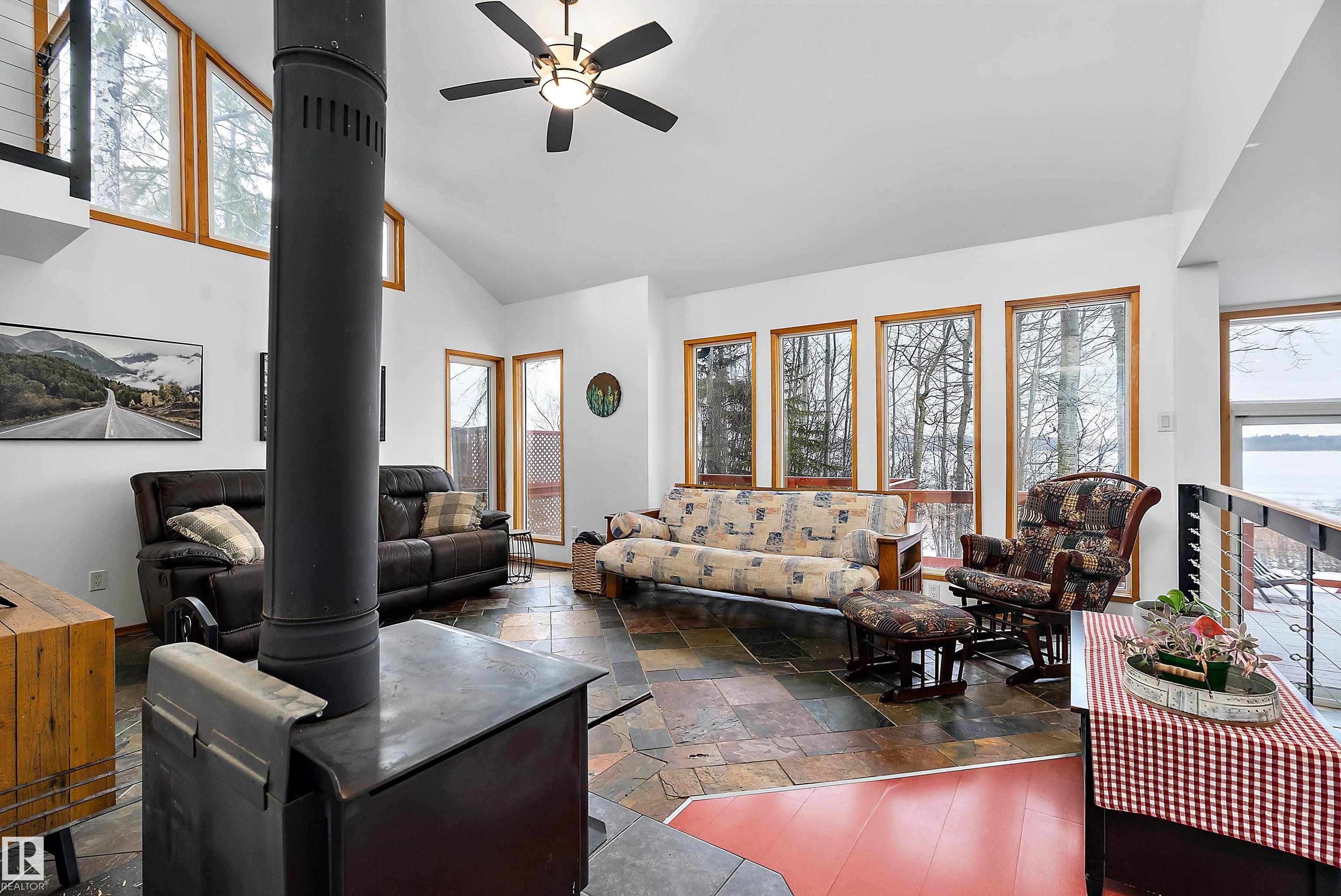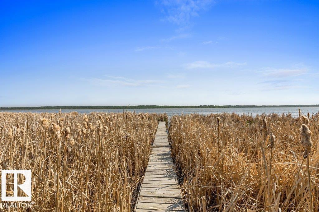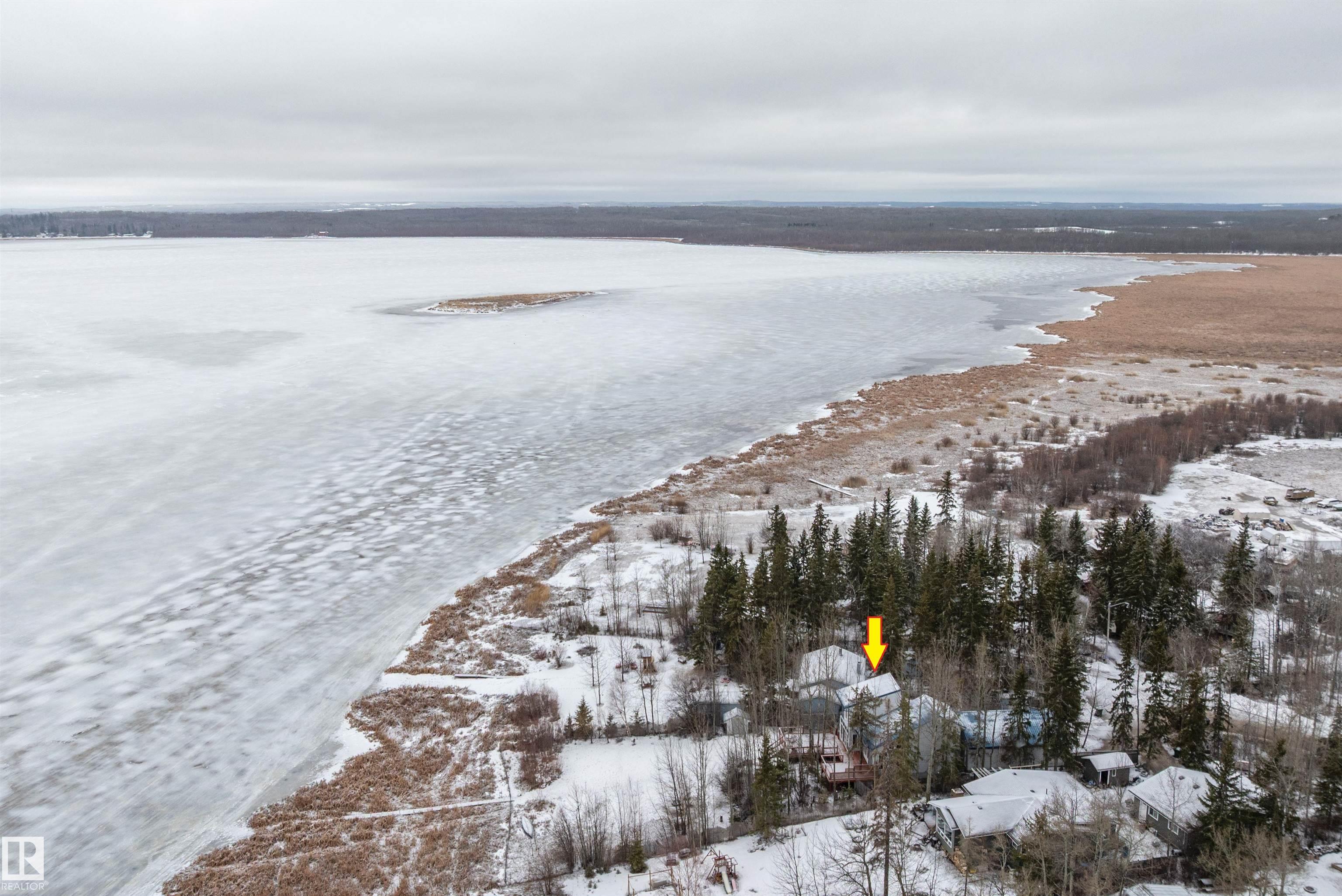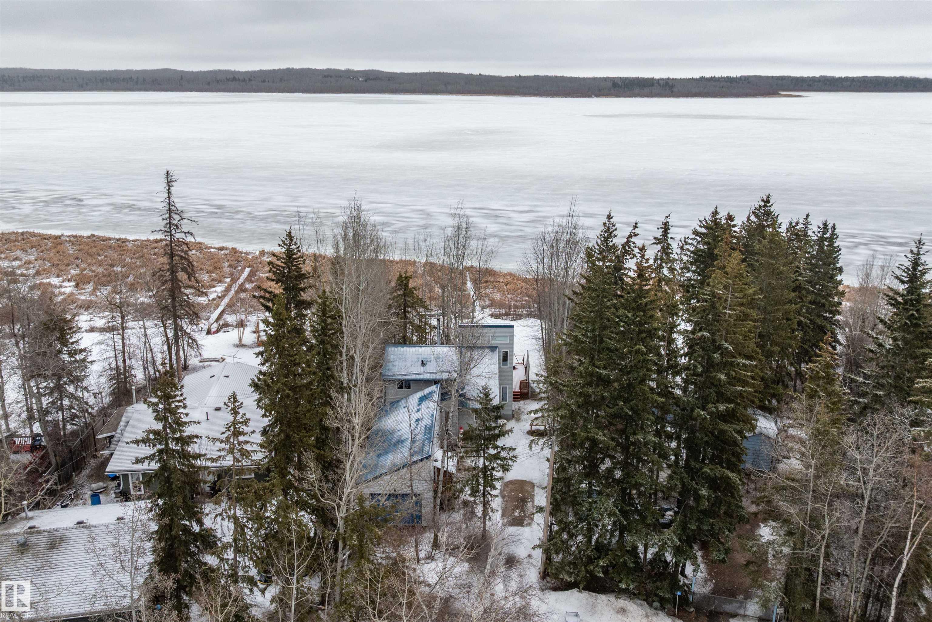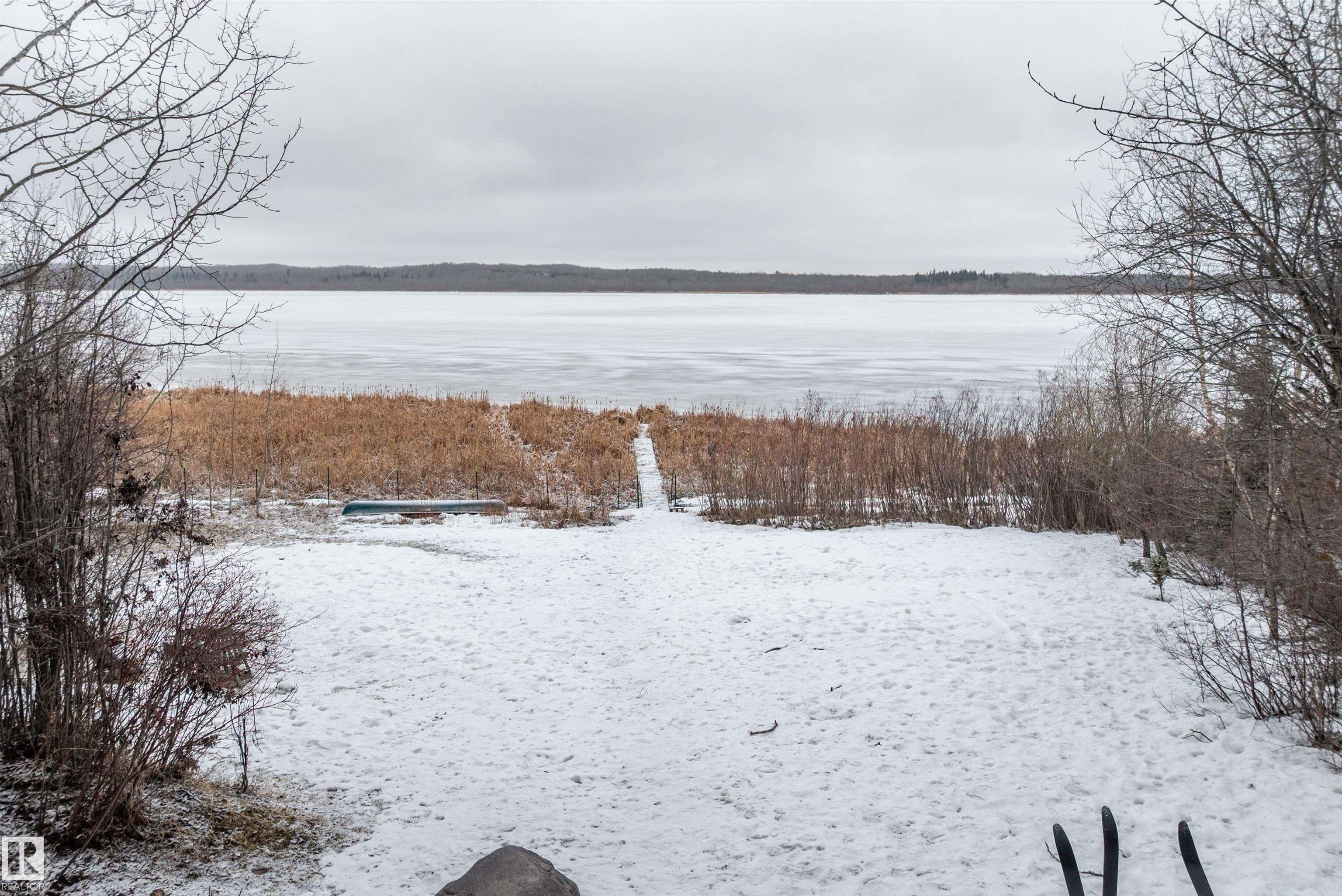 Beautiful, secluded lakefront home! Backing onto quiet Sandy Lake just 30 minutes from Edmonton, at the end of a cul-de-sac with walls of windows to appreciate the serene views over the tiered decks, through the sheltering trees & lawn, to the reeds of your own lake access. Inside, this 1991 2-storey has soaring open vault ceilings so that the views can be appreciated from both floors. Gorgeous slate counters & tile floors, a wood stove for cozy winter nights, gas range in the kitchen, main floor laundry & bathroom, as well as a main floor bedroom. The primary bedroom upstairs has it?s own private balcony looking onto the lake; there?s a 3rd bedroom upstairs, and a quaint bathroom with tiled steam shower & soaker tub. Comes with an attached double tandem garage with additional storage above, work bench, cabinets and additional parking in front for boat/RV/trailer. With a low maintenance metal roof & cistern with potable water, you?ve got all the amenities with the lifestyle you?ve been dreaming of!