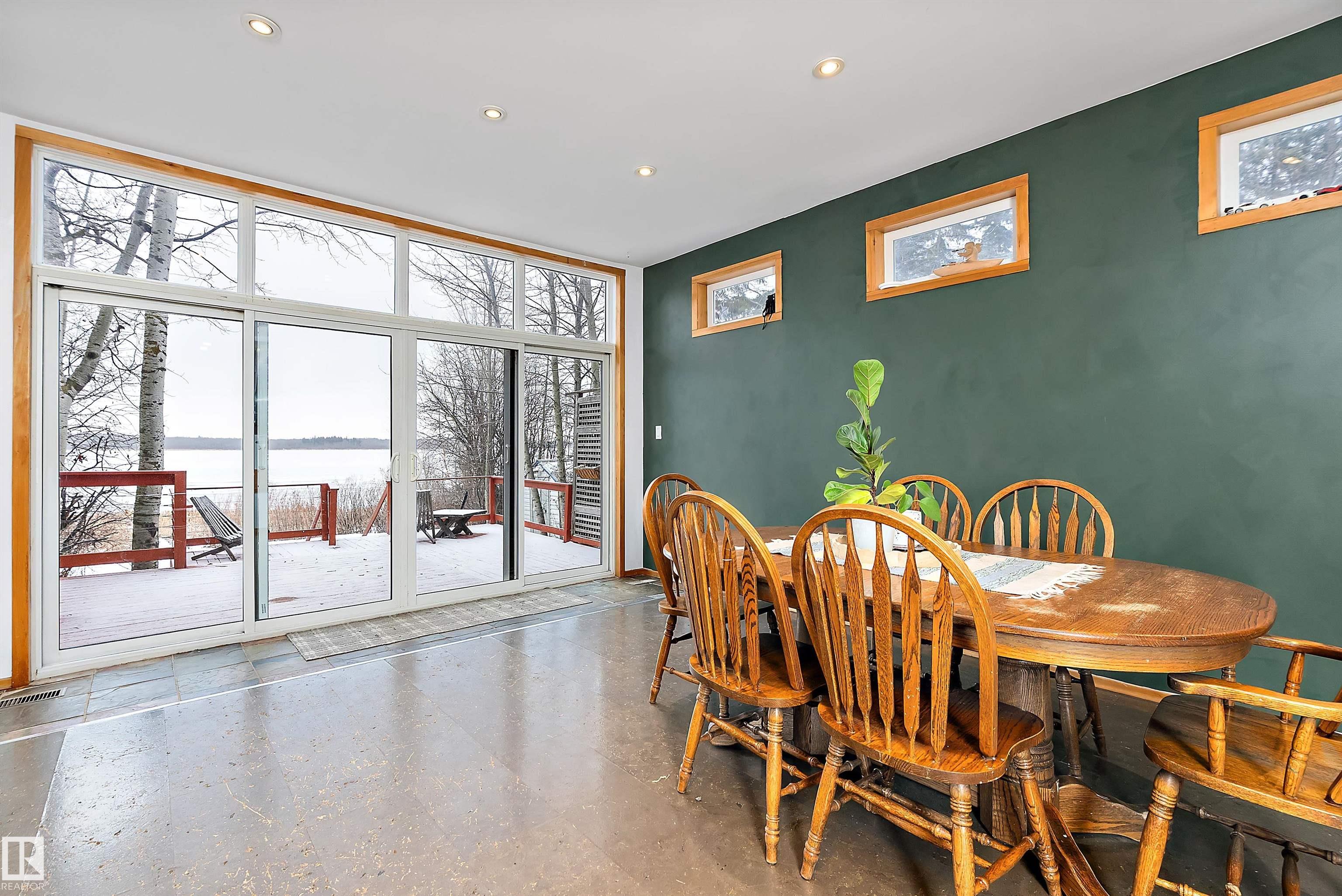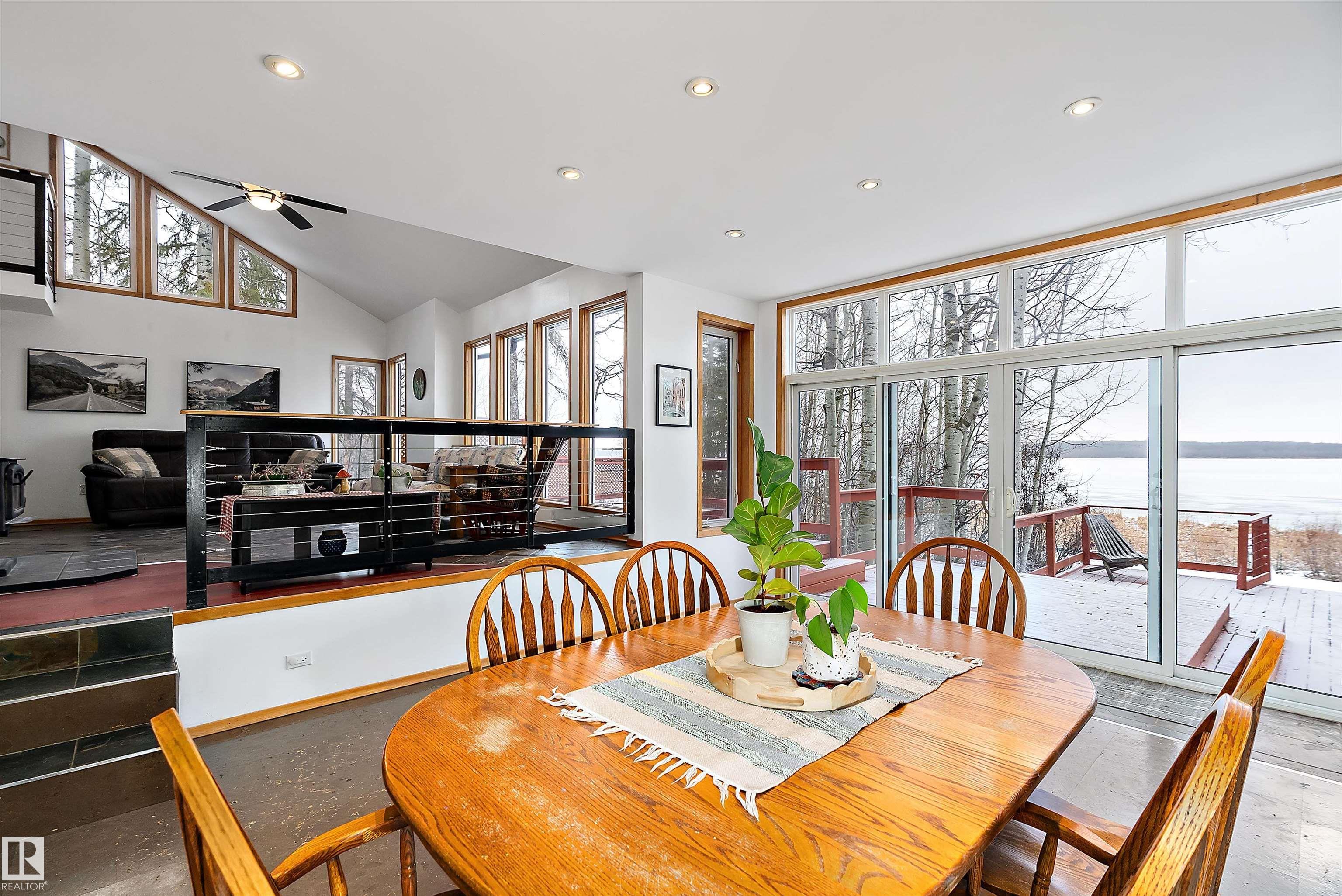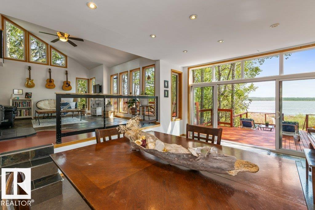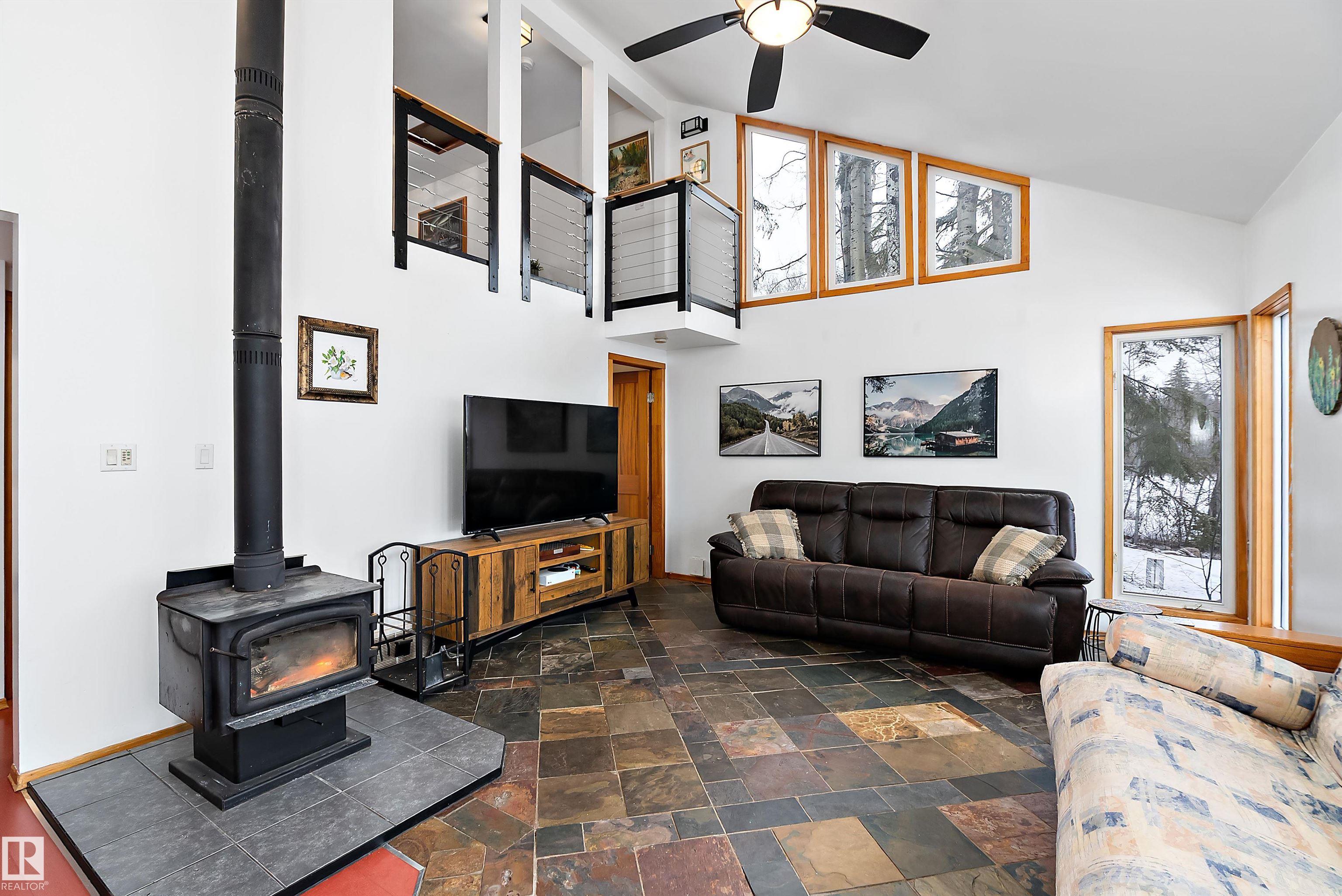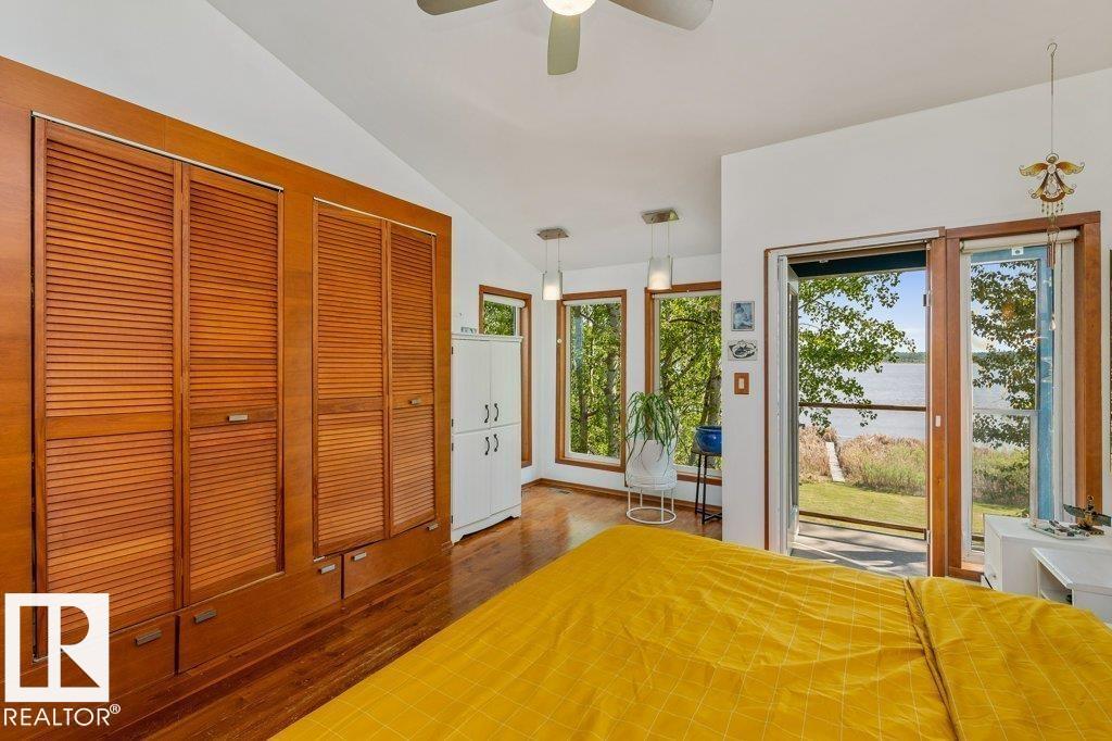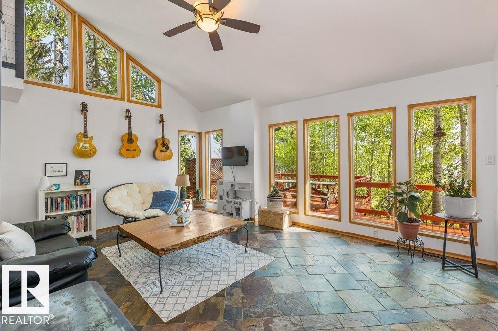Beautiful, secluded lakefront home! Backing onto quiet Sandy Lake just 30 minutes from Edmonton, at the end of a cul-de-sac with walls of windows to appreciate the serene views over the tiered decks, through the sheltering trees & lawn, to the reeds of your own lake access. Inside, this 1991 2-storey has soaring open vault ceilings so that the views can be appreciated from both floors. Gorgeous slate counters & tile floors, a wood stove for cozy winter nights, gas range in the kitchen, main floor laundry & bathroom, as well as a main floor bedroom. The primary bedroom upstairs has it?s own private balcony looking onto the lake; there?s a 3rd bedroom upstairs, and a quaint bathroom with tiled steam shower & soaker tub. Comes with an attached double tandem garage with additional storage above, work bench, cabinets and additional parking in front for boat/RV/trailer. With a low maintenance metal roof & cistern with potable water, you?ve got all the amenities with the lifestyle you?ve been dreaming of!