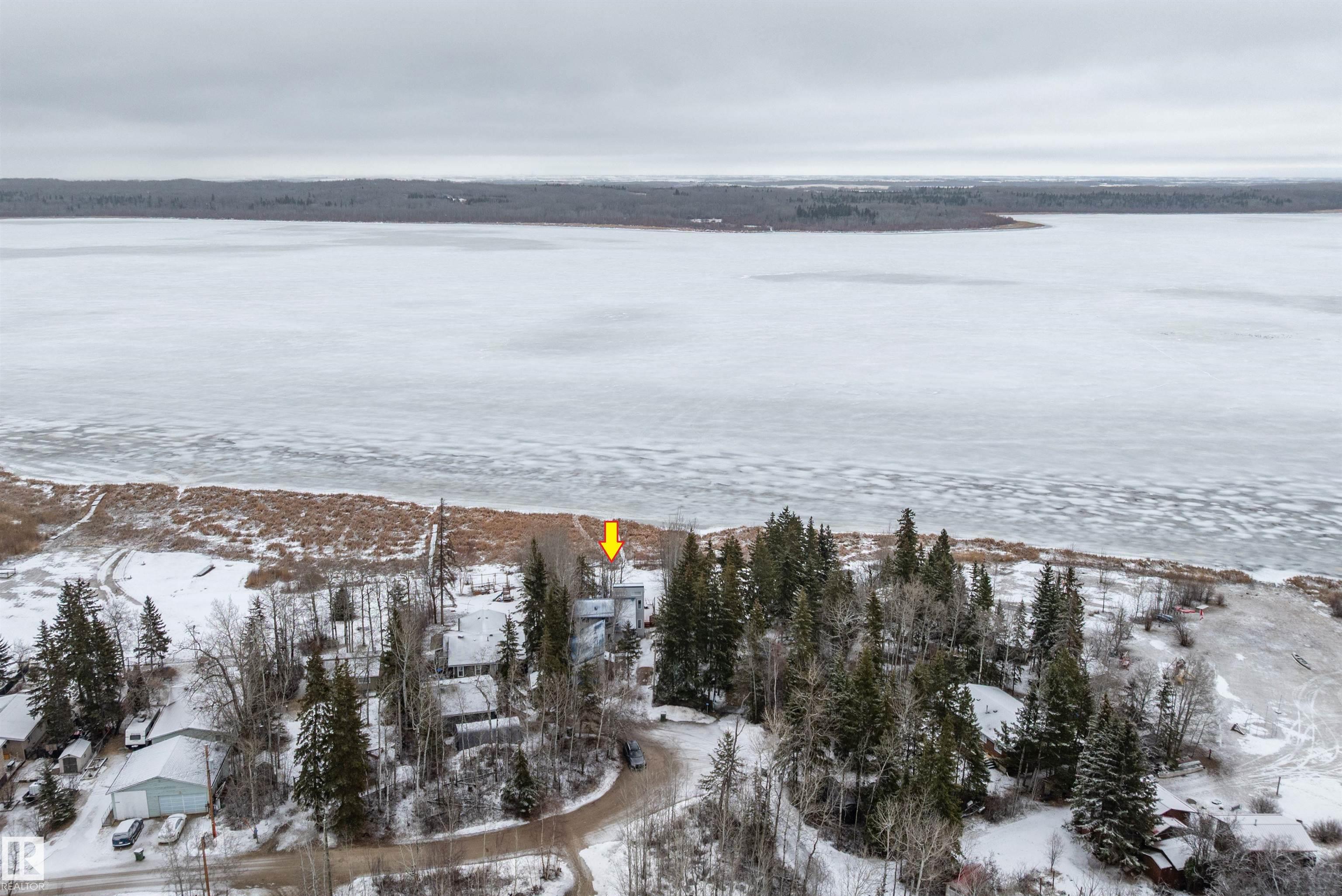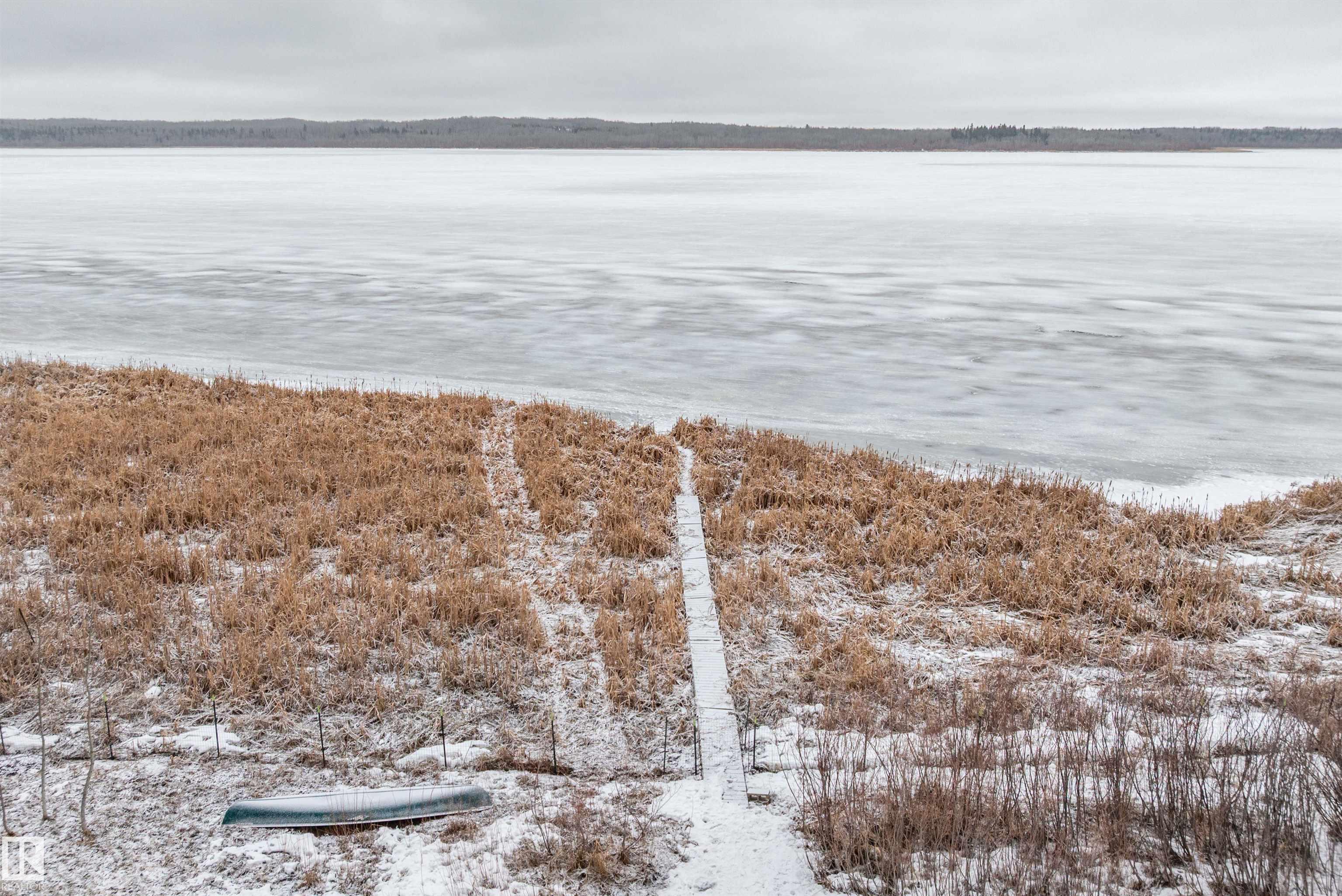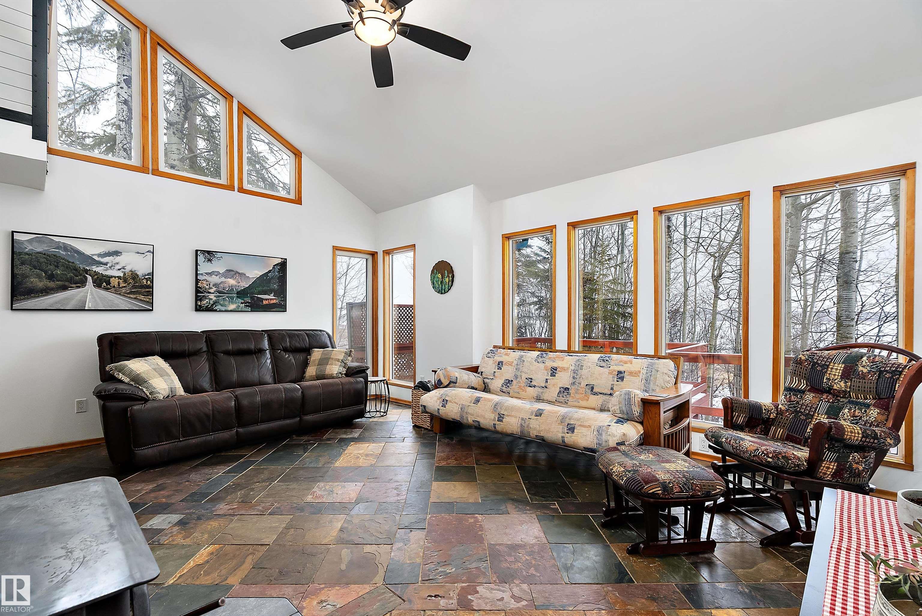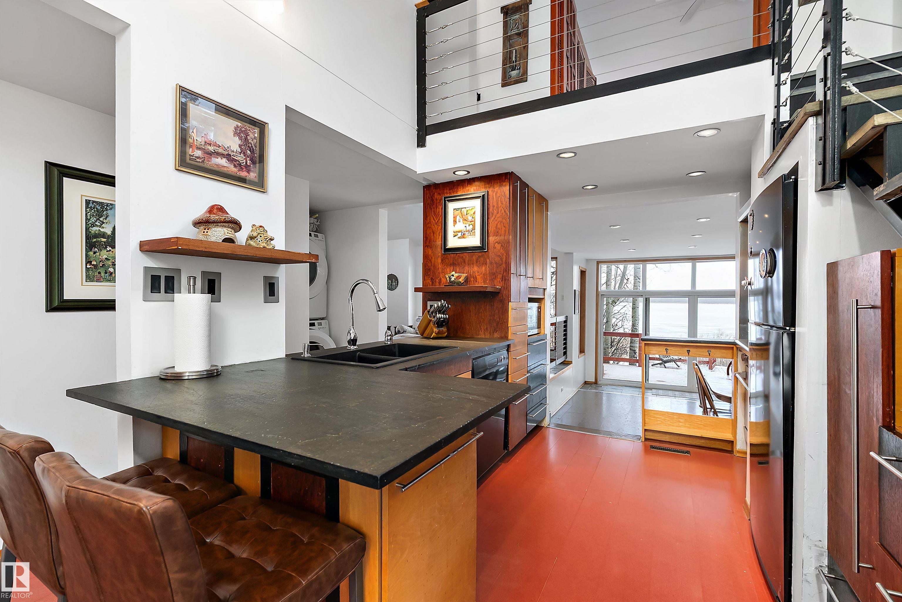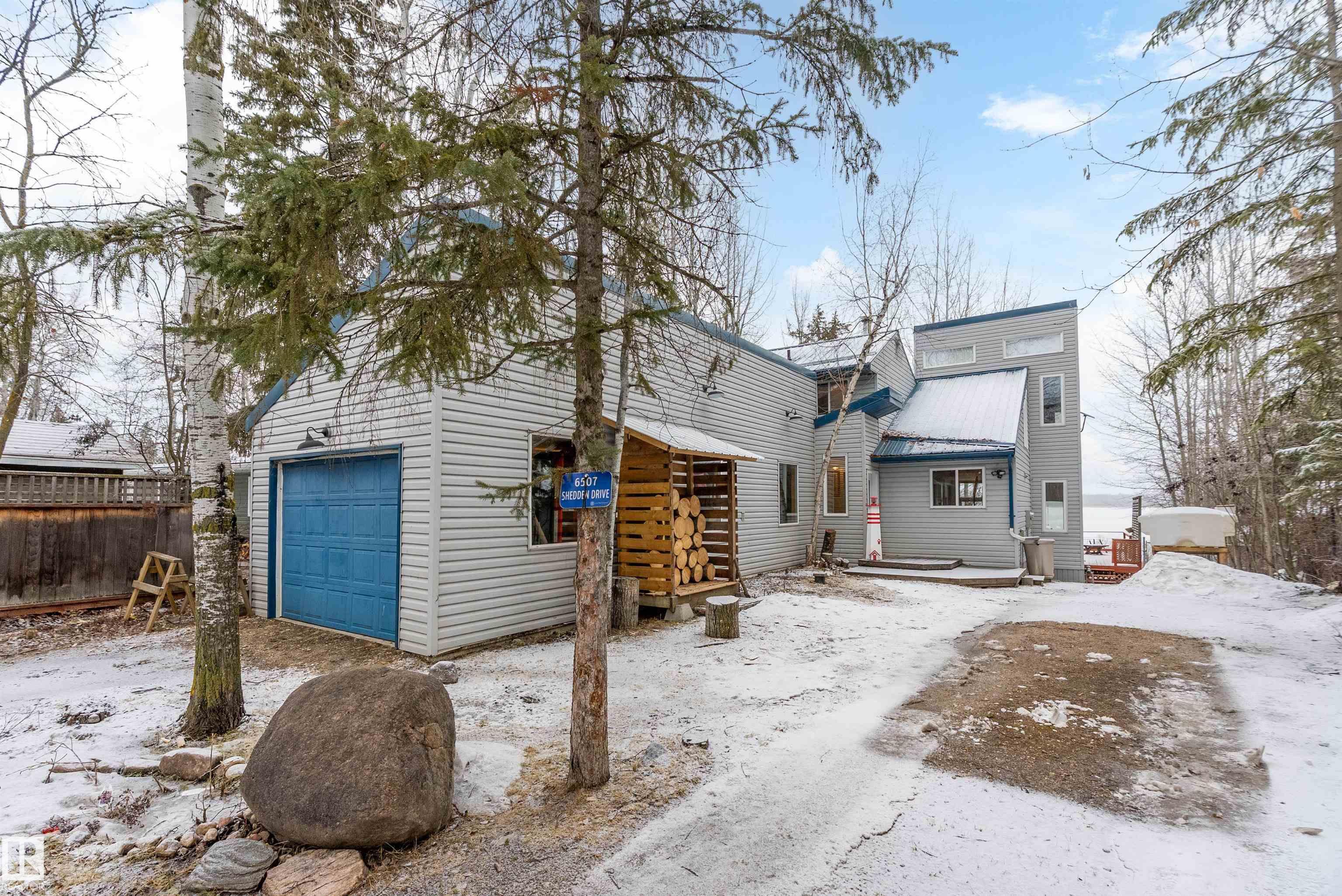 Beautiful, secluded lakefront home! Backing onto quiet Sandy Lake just 30 minutes from Edmonton, at the end of a cul-de-sac with walls of windows to appreciate the serene views over the tiered decks, through the sheltering trees & lawn, to the reeds of your own lake access. Inside, this 1991 2-storey has soaring open vault ceilings so that the views can be appreciated from both floors. Gorgeous slate counters & tile floors, a wood stove for cozy winter nights, gas range in the kitchen, main floor laundry & bathroom, as well as a main floor bedroom. The primary bedroom upstairs has it?s own private balcony looking onto the lake; there?s a 3rd bedroom upstairs, and a quaint bathroom with tiled steam shower & soaker tub. Comes with an attached double tandem garage with additional storage above, work bench, cabinets and additional parking in front for boat/RV/trailer. With a low maintenance metal roof & cistern with potable water, you?ve got all the amenities with the lifestyle you?ve been dreaming of!