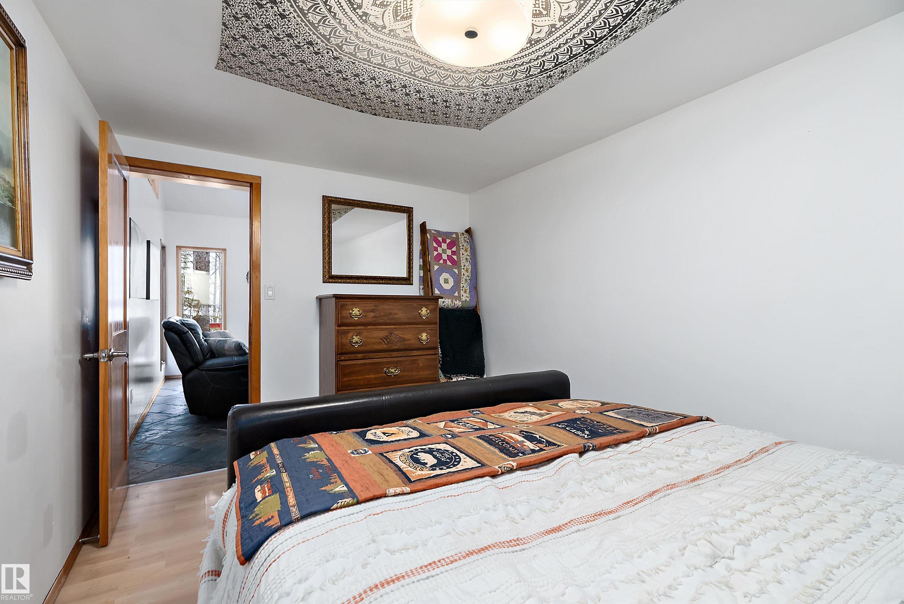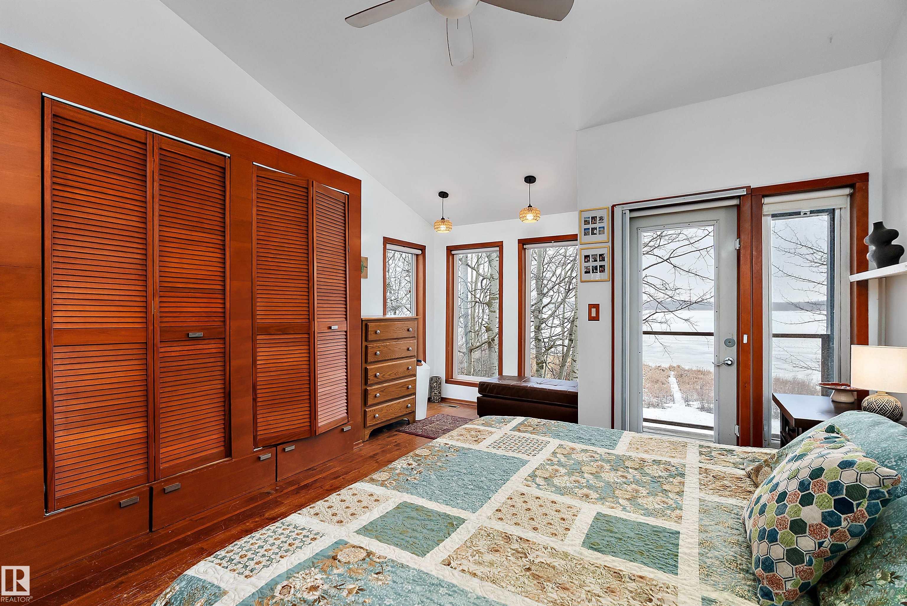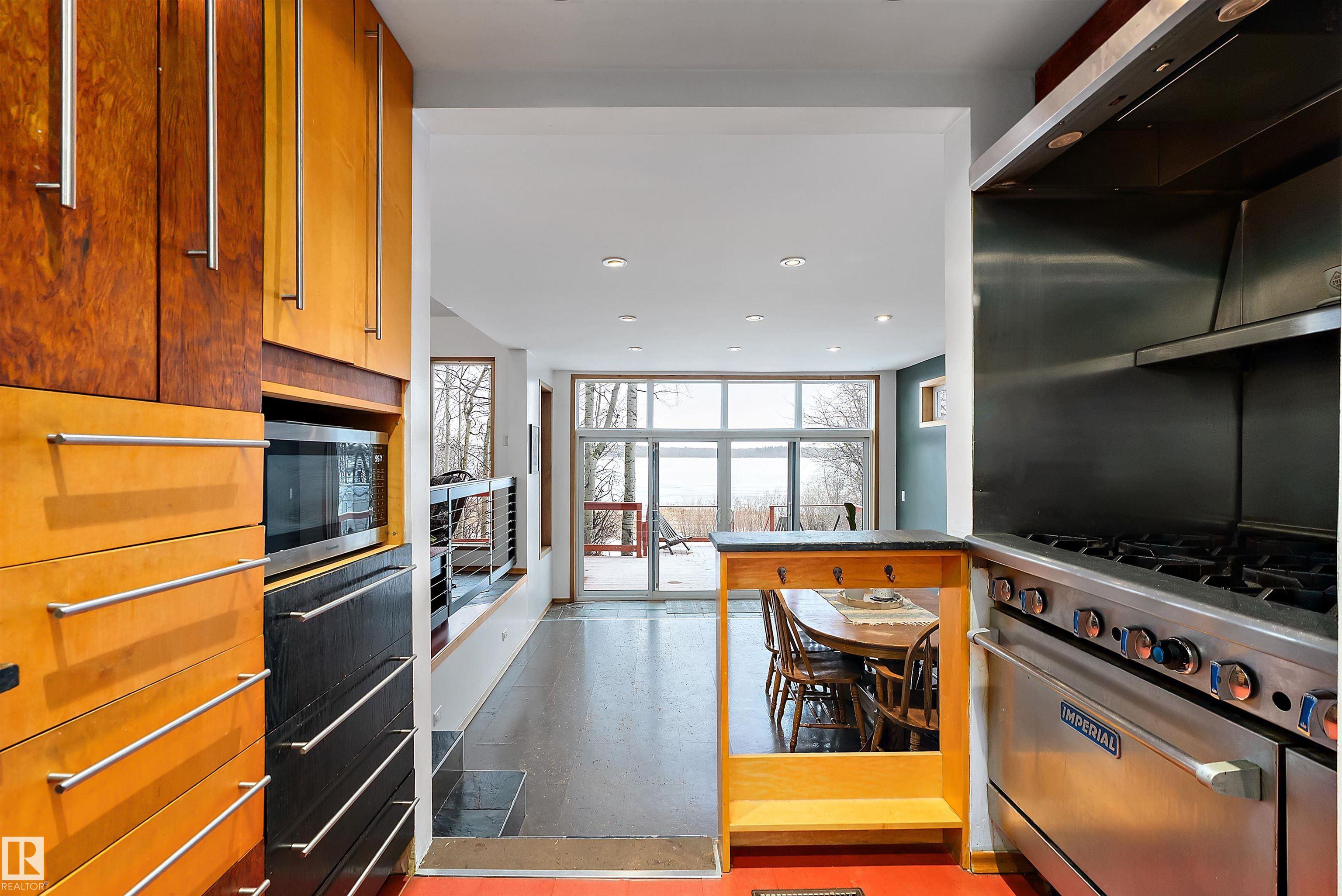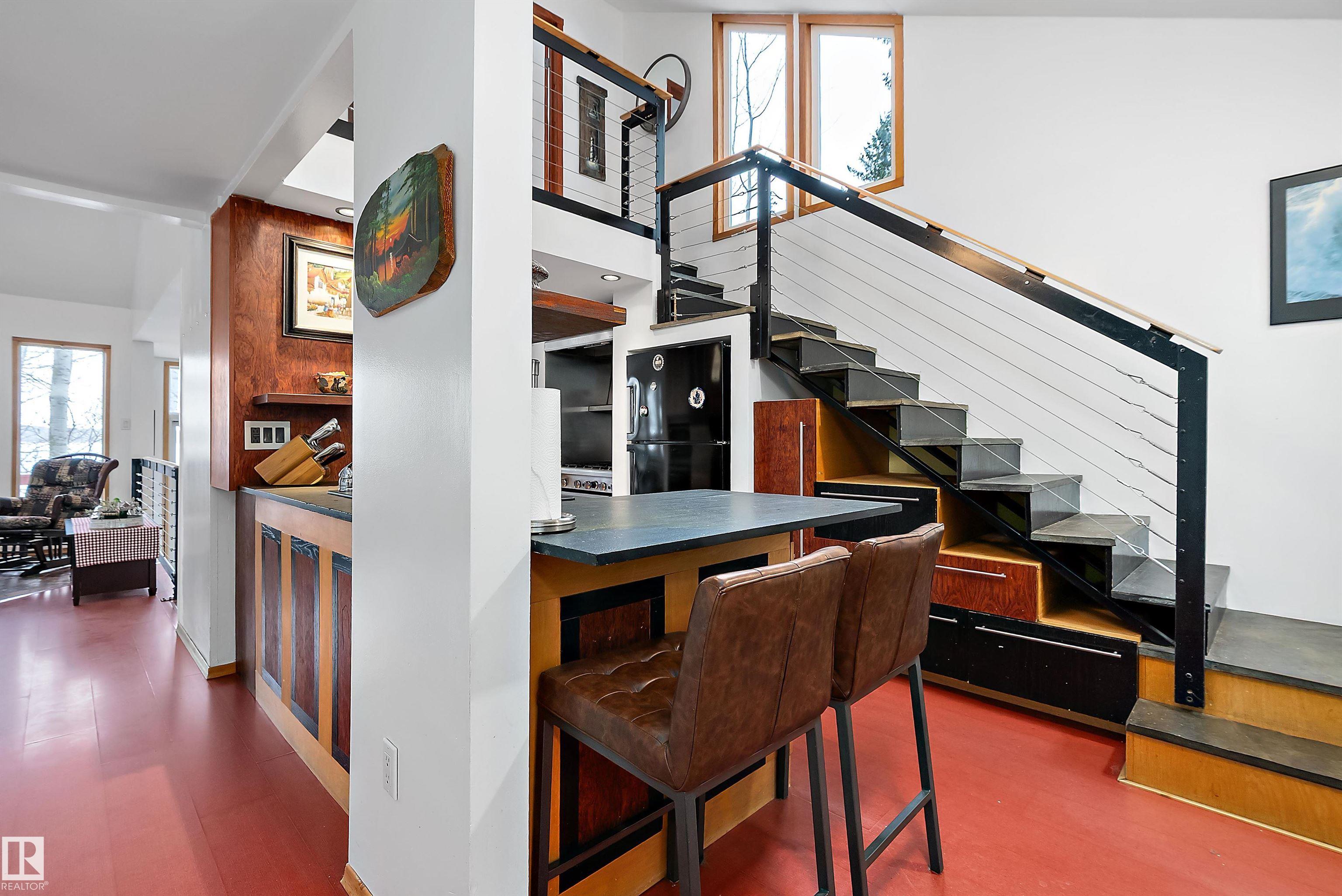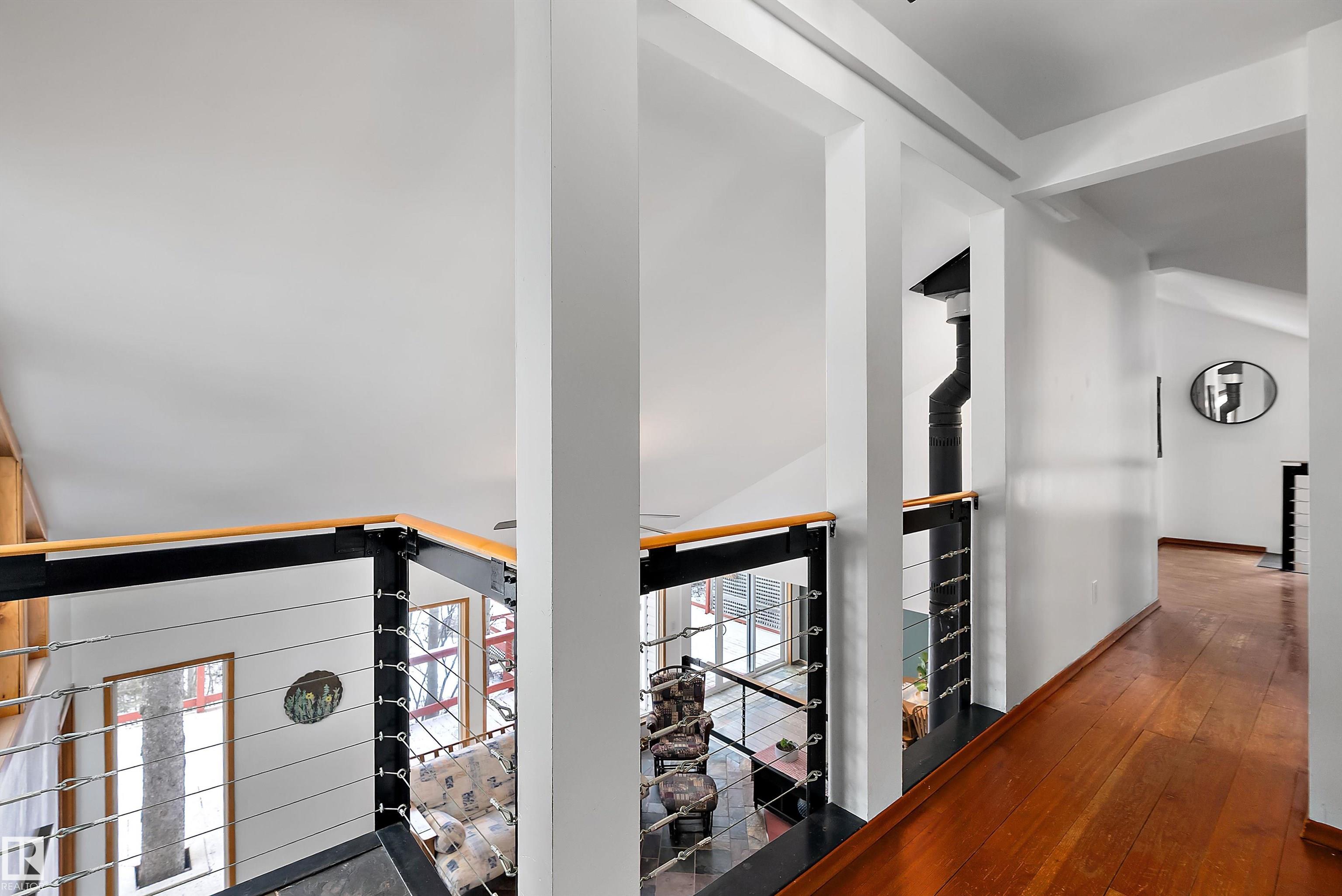 Beautiful, secluded lakefront home! Backing onto quiet Sandy Lake just 30 minutes from Edmonton, at the end of a cul-de-sac with walls of windows to appreciate the serene views over the tiered decks, through the sheltering trees & lawn, to the reeds of your own lake access. Inside, this 1991 2-storey has soaring open vault ceilings so that the views can be appreciated from both floors. Gorgeous slate counters & tile floors, a wood stove for cozy winter nights, gas range in the kitchen, main floor laundry & bathroom, as well as a main floor bedroom. The primary bedroom upstairs has it?s own private balcony looking onto the lake; there?s a 3rd bedroom upstairs, and a quaint bathroom with tiled steam shower & soaker tub. Comes with an attached double tandem garage with additional storage above, work bench, cabinets and additional parking in front for boat/RV/trailer. With a low maintenance metal roof & cistern with potable water, you?ve got all the amenities with the lifestyle you?ve been dreaming of!