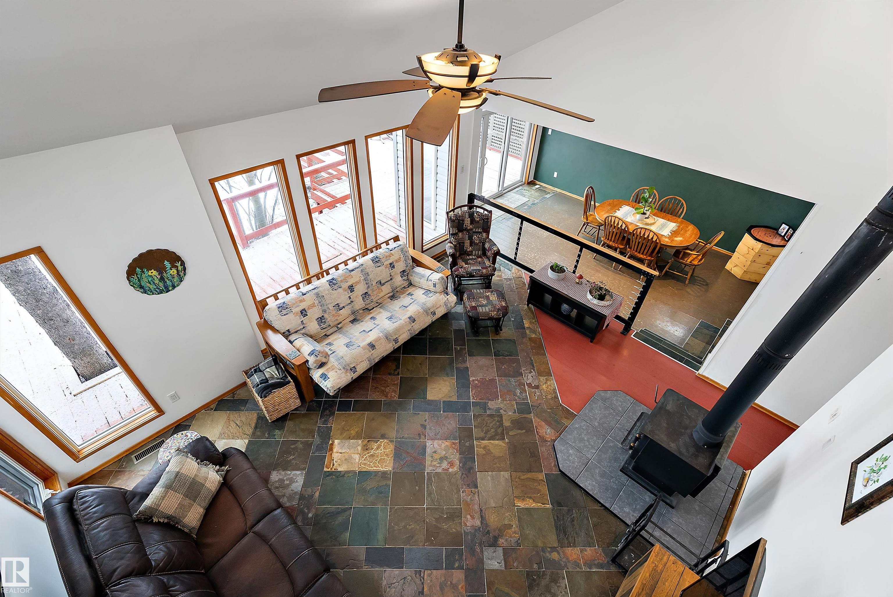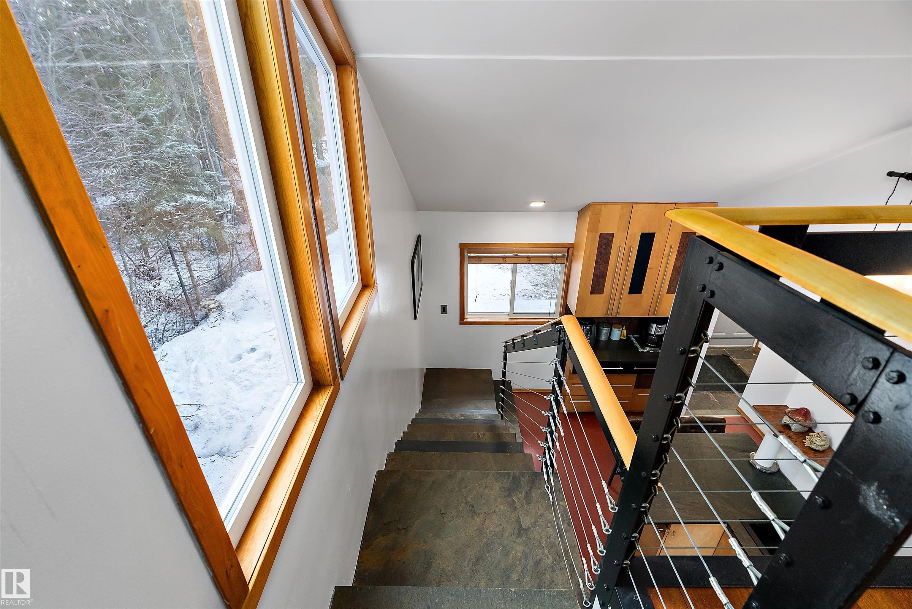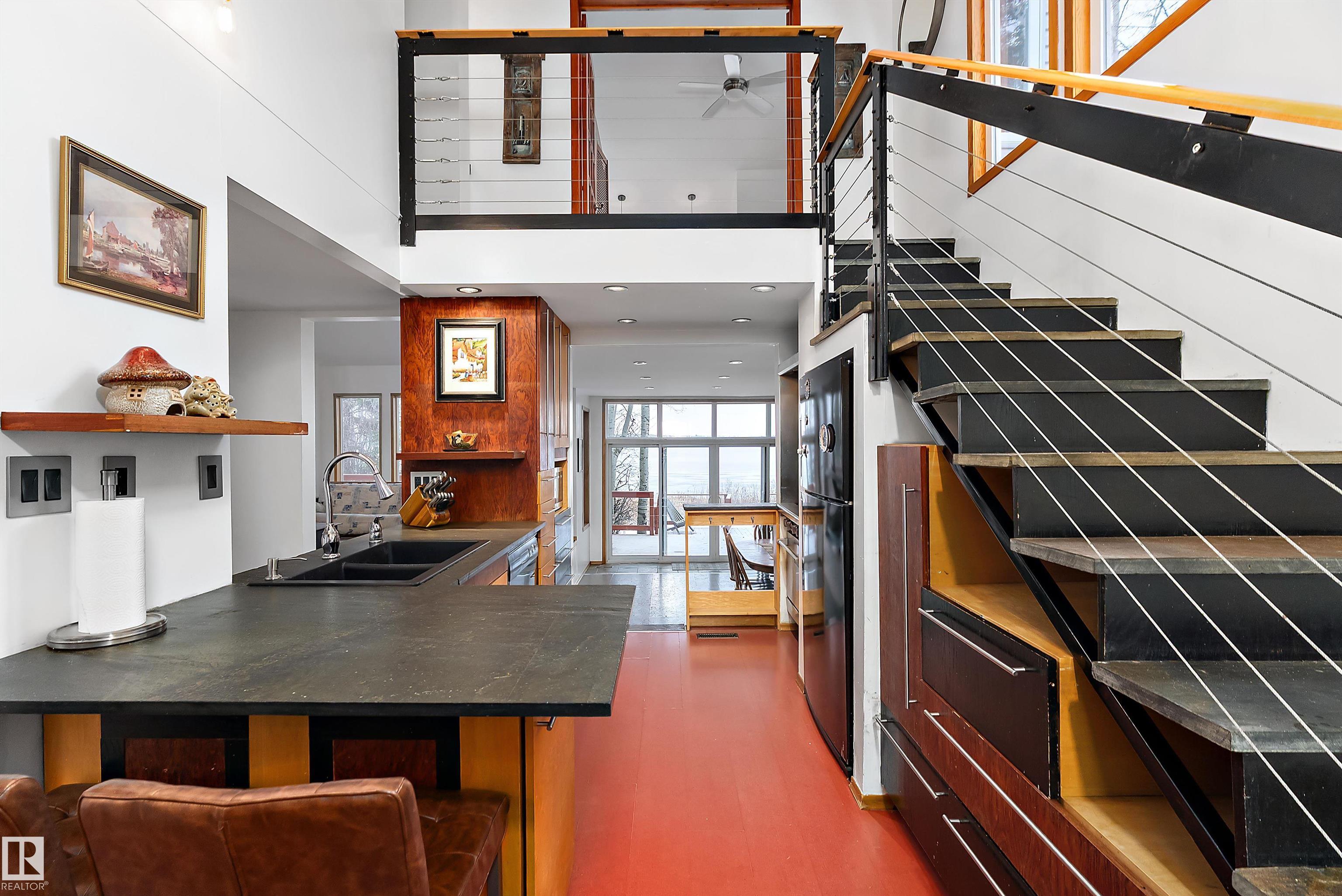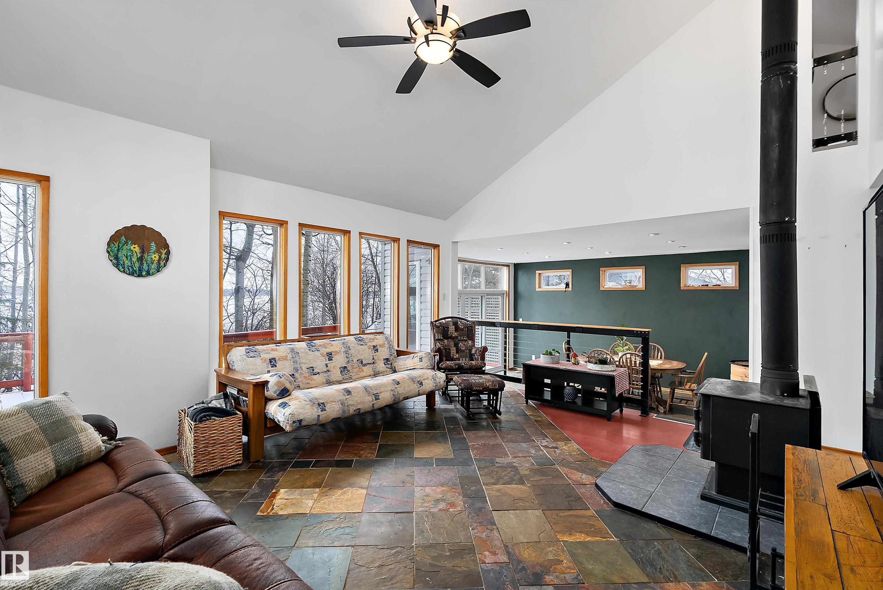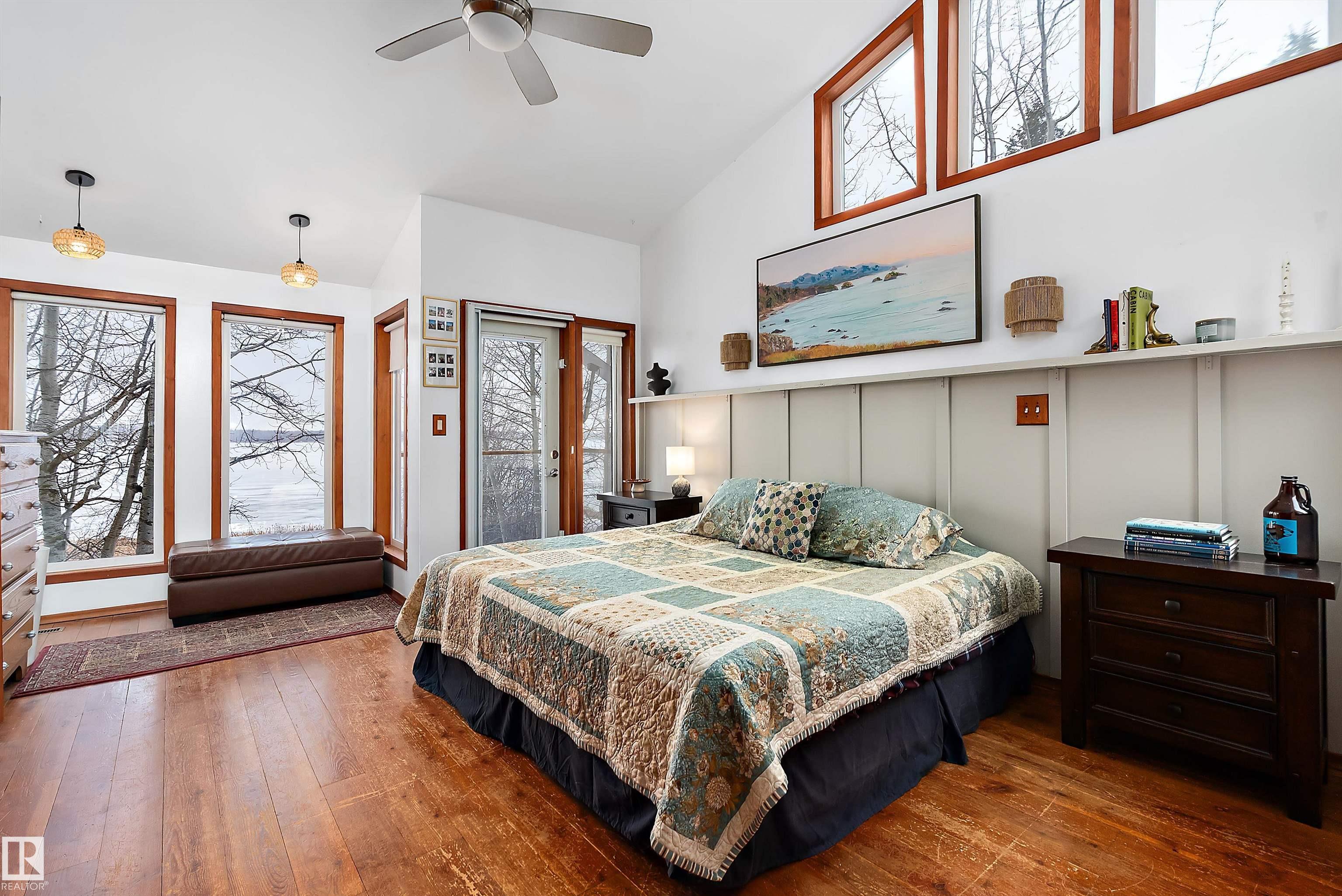 Beautiful, secluded lakefront home! Backing onto quiet Sandy Lake just 30 minutes from Edmonton, at the end of a cul-de-sac with walls of windows to appreciate the serene views over the tiered decks, through the sheltering trees & lawn, to the reeds of your own lake access. Inside, this 1991 2-storey has soaring open vault ceilings so that the views can be appreciated from both floors. Gorgeous slate counters & tile floors, a wood stove for cozy winter nights, gas range in the kitchen, main floor laundry & bathroom, as well as a main floor bedroom. The primary bedroom upstairs has it?s own private balcony looking onto the lake; there?s a 3rd bedroom upstairs, and a quaint bathroom with tiled steam shower & soaker tub. Comes with an attached double tandem garage with additional storage above, work bench, cabinets and additional parking in front for boat/RV/trailer. With a low maintenance metal roof & cistern with potable water, you?ve got all the amenities with the lifestyle you?ve been dreaming of!