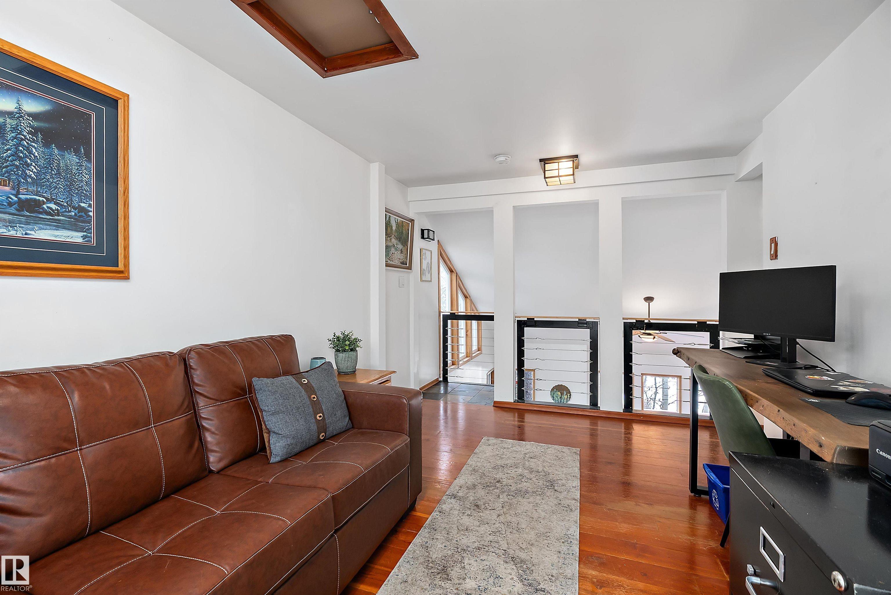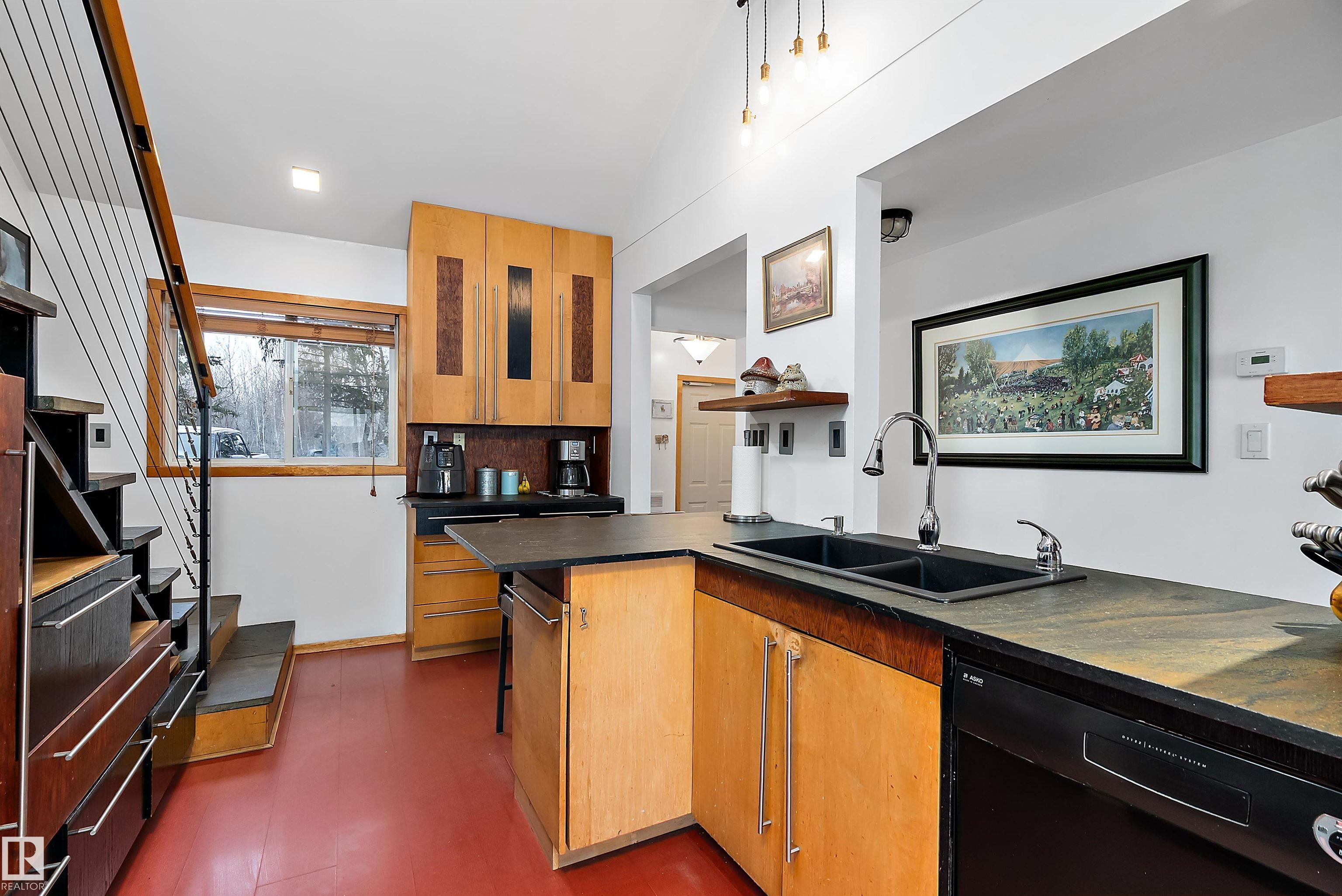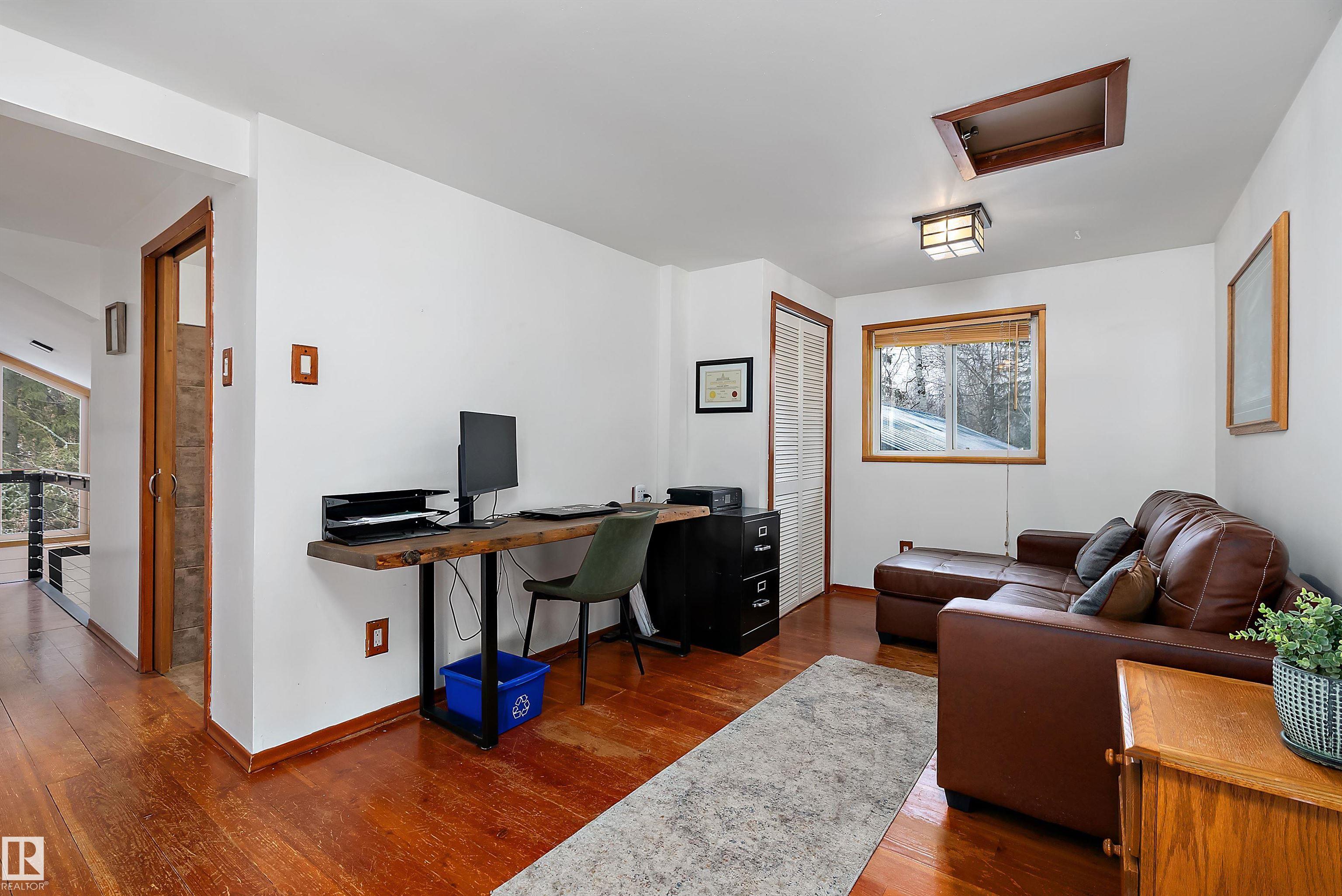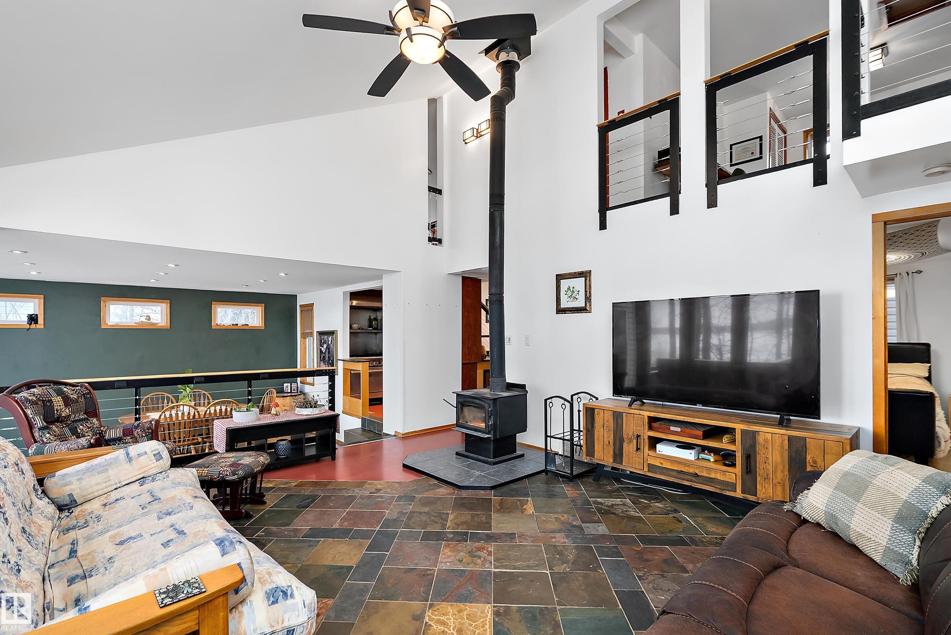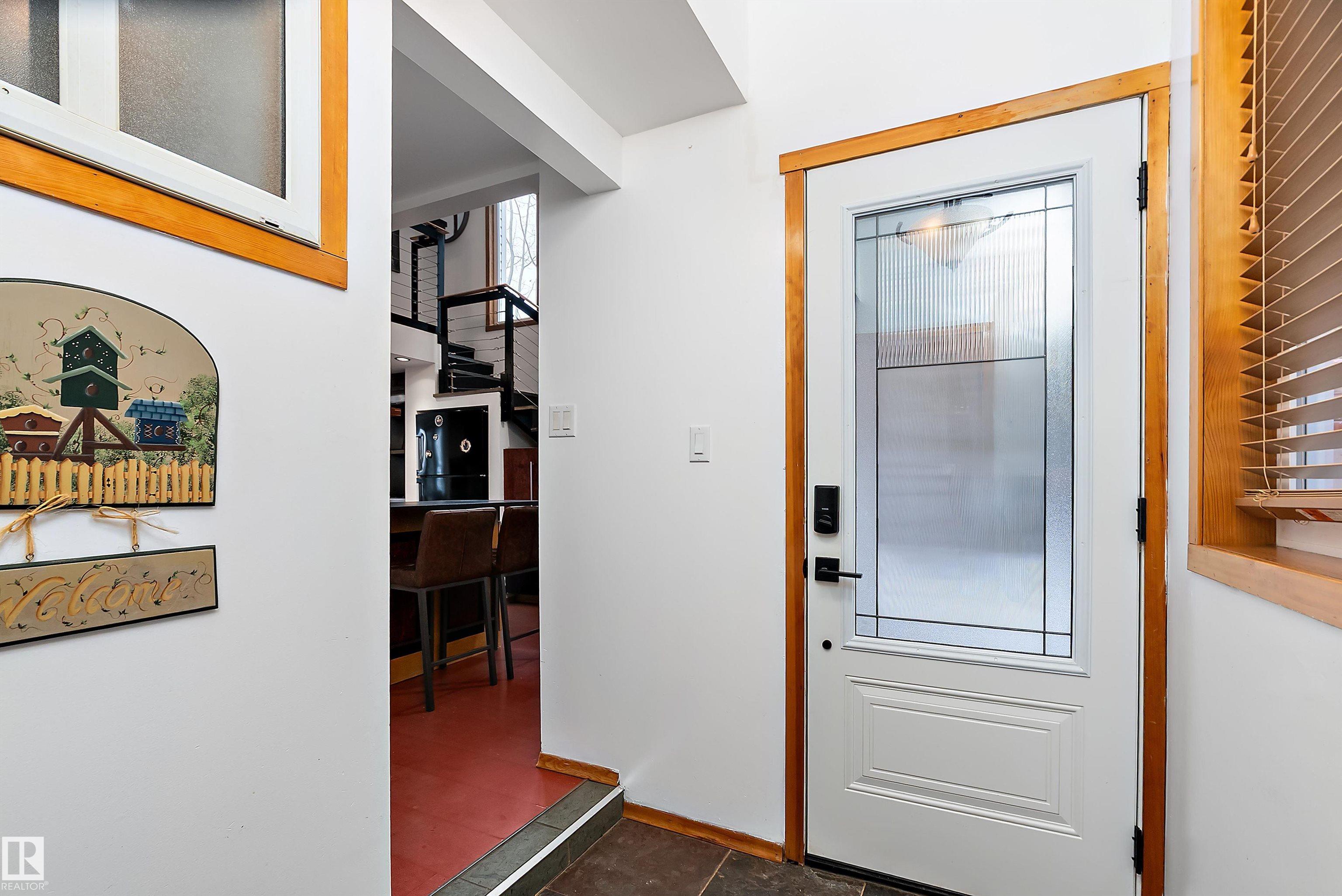Beautiful, secluded lakefront home! Backing onto quiet Sandy Lake just 30 minutes from Edmonton, at the end of a cul-de-sac with walls of windows to appreciate the serene views over the tiered decks, through the sheltering trees & lawn, to the reeds of your own lake access. Inside, this 1991 2-storey has soaring open vault ceilings so that the views can be appreciated from both floors. Gorgeous slate counters & tile floors, a wood stove for cozy winter nights, gas range in the kitchen, main floor laundry & bathroom, as well as a main floor bedroom. The primary bedroom upstairs has it?s own private balcony looking onto the lake; there?s a 3rd bedroom upstairs, and a quaint bathroom with tiled steam shower & soaker tub. Comes with an attached double tandem garage with additional storage above, work bench, cabinets and additional parking in front for boat/RV/trailer. With a low maintenance metal roof & cistern with potable water, you?ve got all the amenities with the lifestyle you?ve been dreaming of!