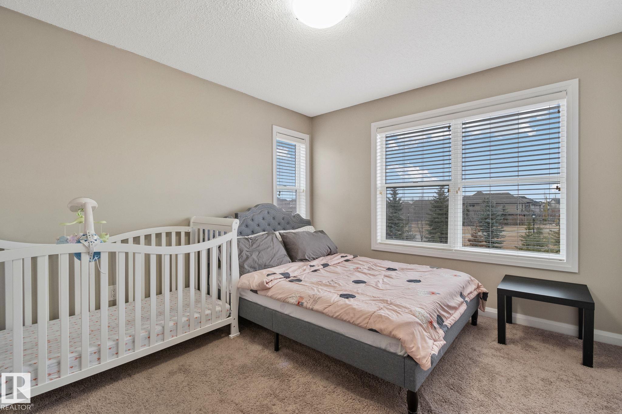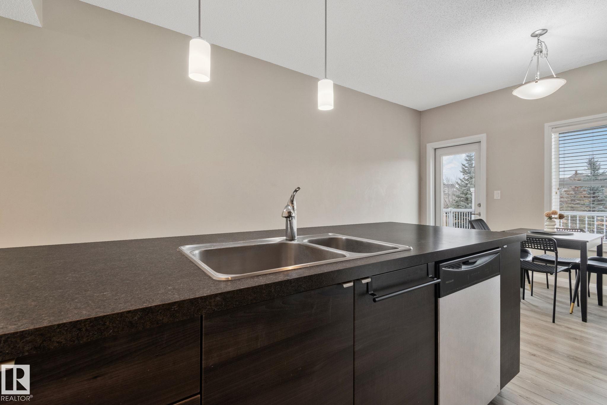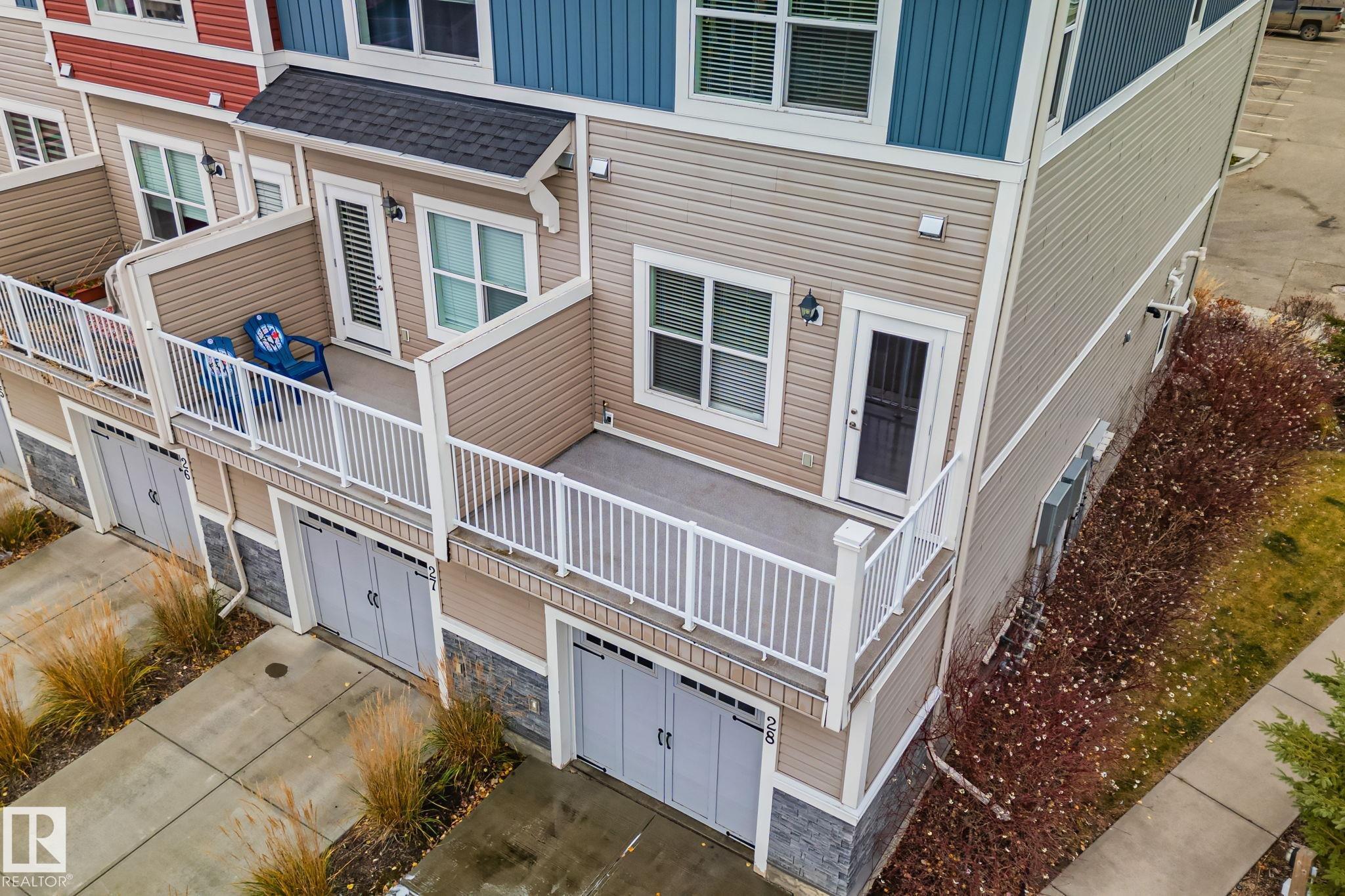 WELCOME to this modern and affordable 2 bedroom + den townhouse, ideally located across from Dr. Margaret-Ann Armour School. This corner unit features extra windows and 9-foot ceilings on two levels, creating a bright, open living space. The kitchen offers stainless steel appliances, a large island, and extended cabinetry which is perfect for daily living or entertaining. The dining area opens to a balcony overlooking a park/trail. Upstairs, two spacious bedrooms each feature a 4-piece ensuite and his/her dual closets. Ground-level den/home office is great for remote work or study. Enjoy the convenience of an attached heated garage (23x13) and driveway parking. Steps from public transit and minutes to the Currents of Windermere, schools, shopping, and the Anthony Henday. An exceptional choice for first-time buyers, downsizers, or investors!