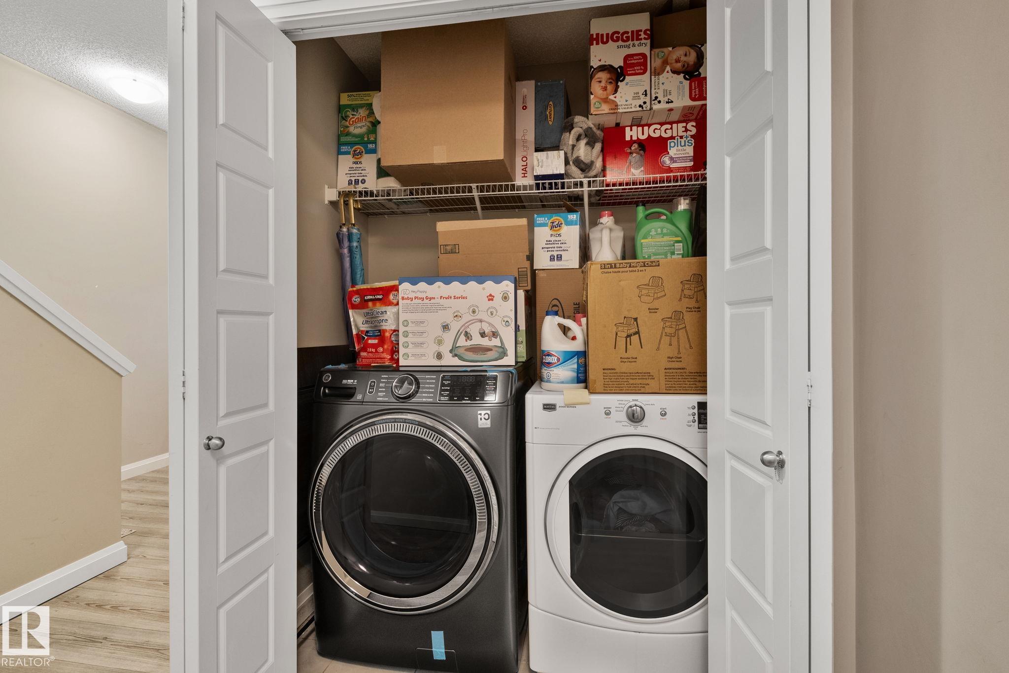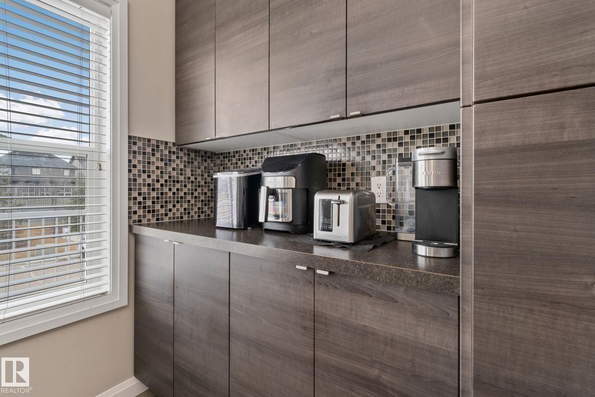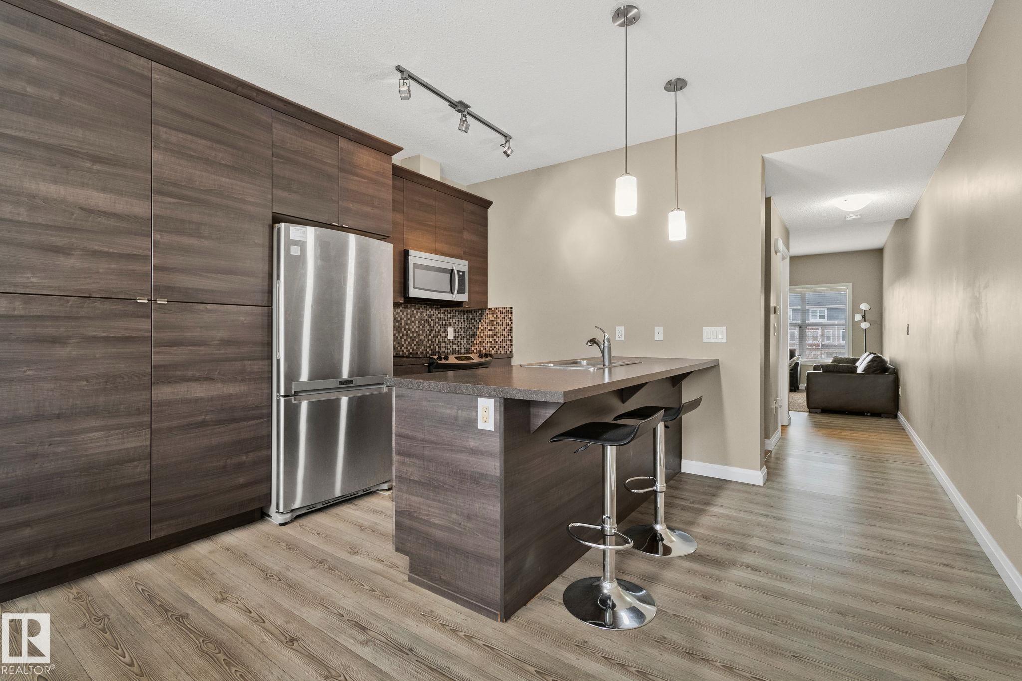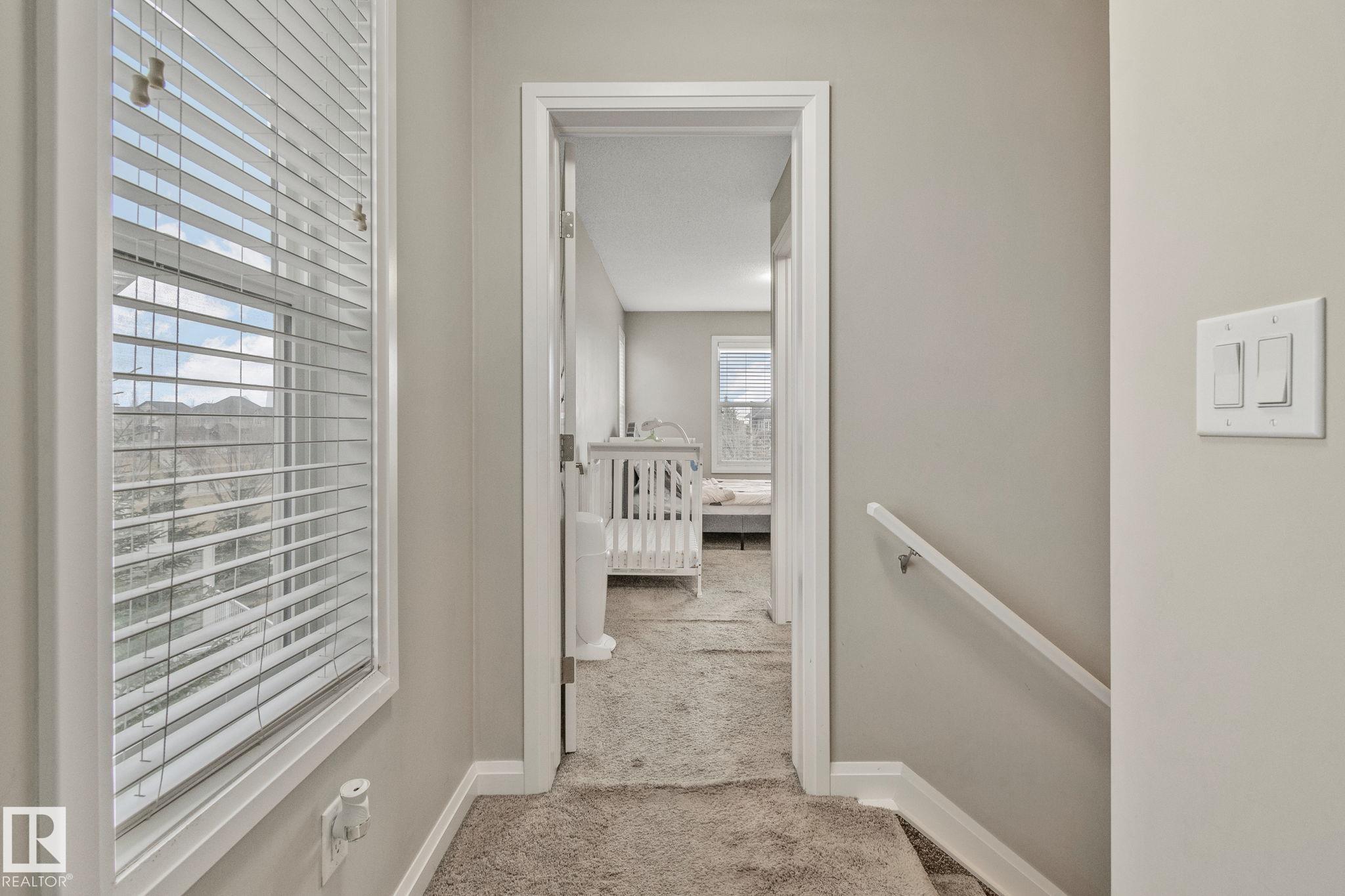 WELCOME to this modern and affordable 2 bedroom + den townhouse, ideally located across from Dr. Margaret-Ann Armour School. This corner unit features extra windows and 9-foot ceilings on two levels, creating a bright, open living space. The kitchen offers stainless steel appliances, a large island, and extended cabinetry which is perfect for daily living or entertaining. The dining area opens to a balcony overlooking a park/trail. Upstairs, two spacious bedrooms each feature a 4-piece ensuite and his/her dual closets. Ground-level den/home office is great for remote work or study. Enjoy the convenience of an attached heated garage (23x13) and driveway parking. Steps from public transit and minutes to the Currents of Windermere, schools, shopping, and the Anthony Henday. An exceptional choice for first-time buyers, downsizers, or investors!