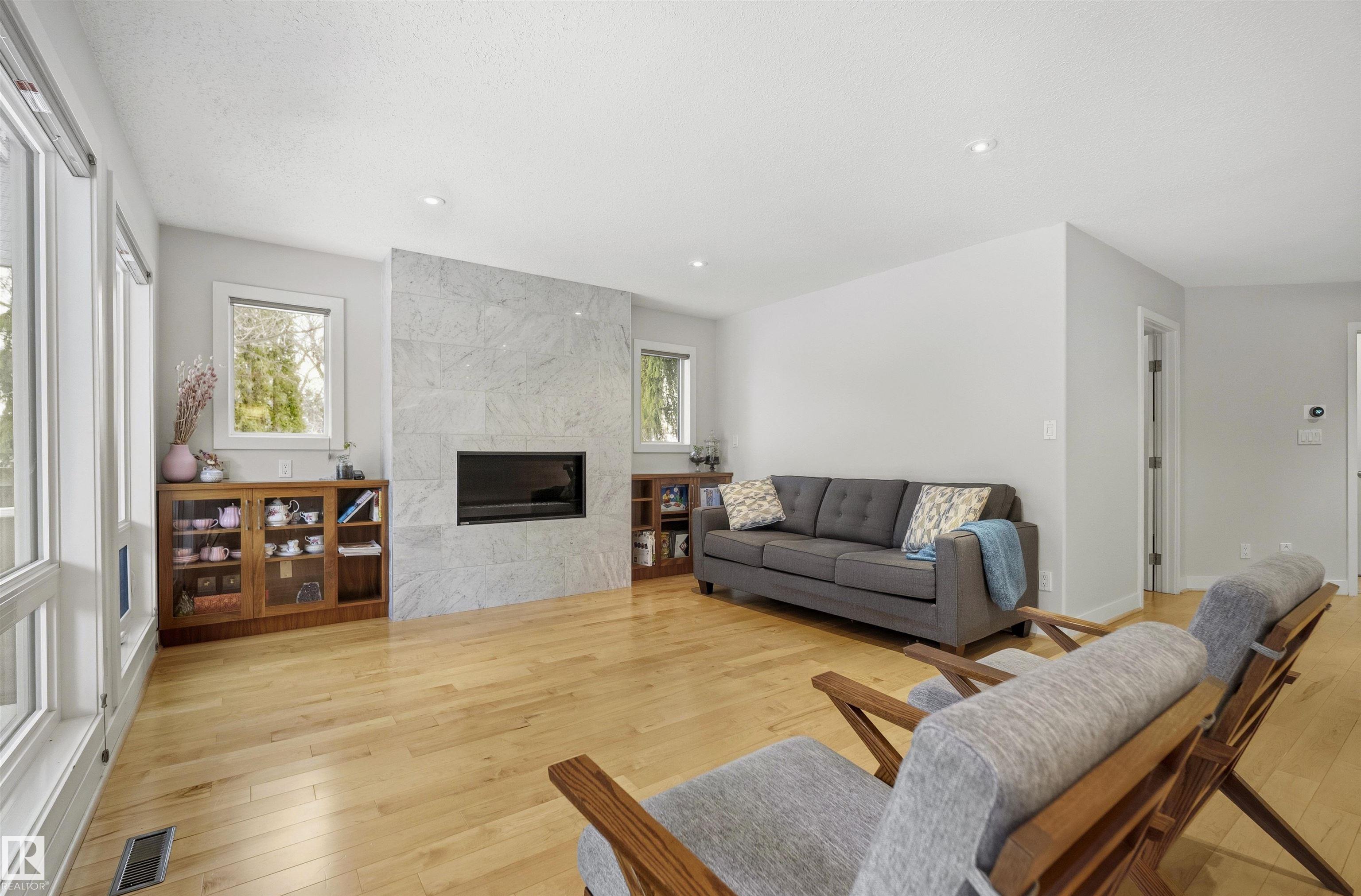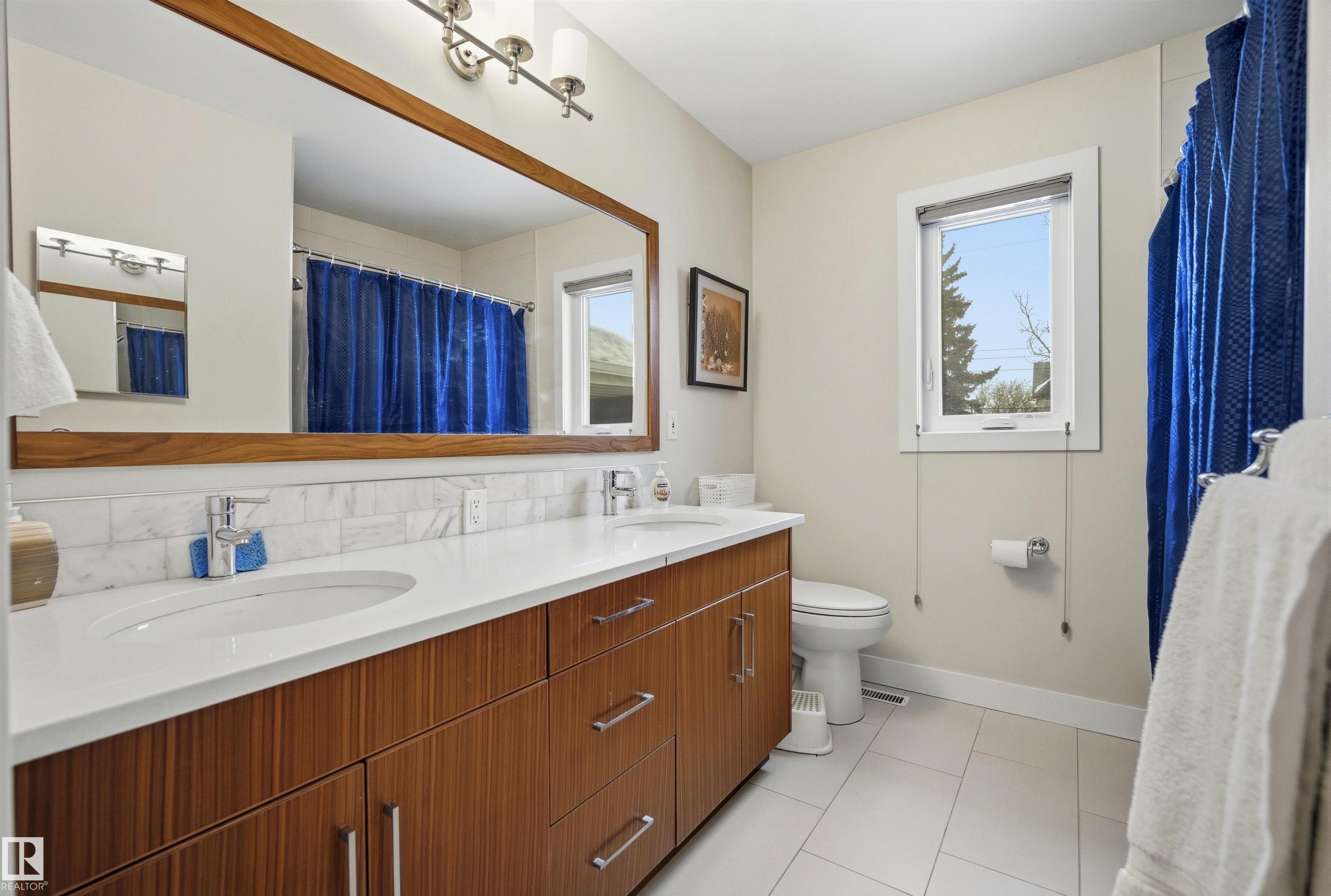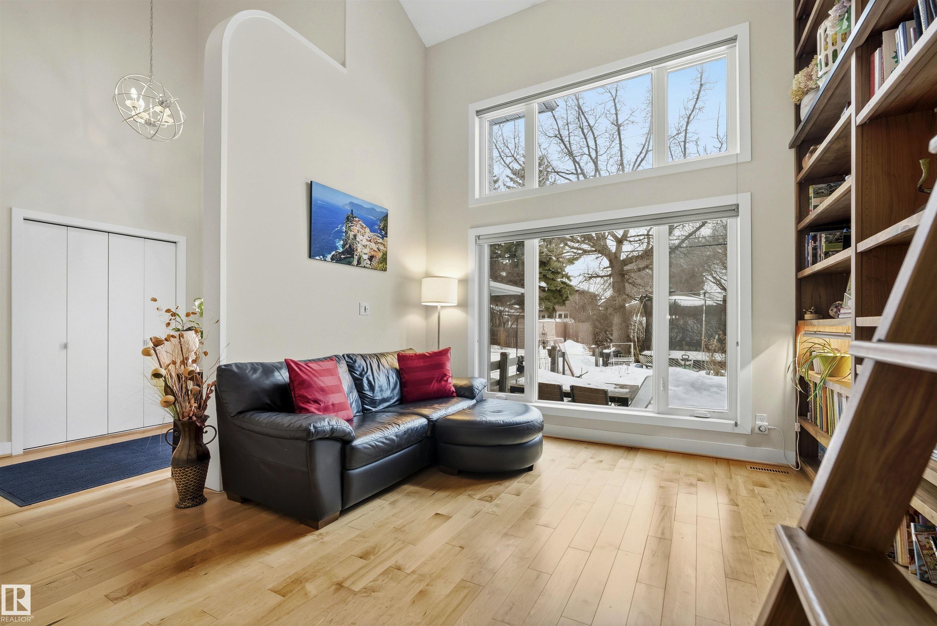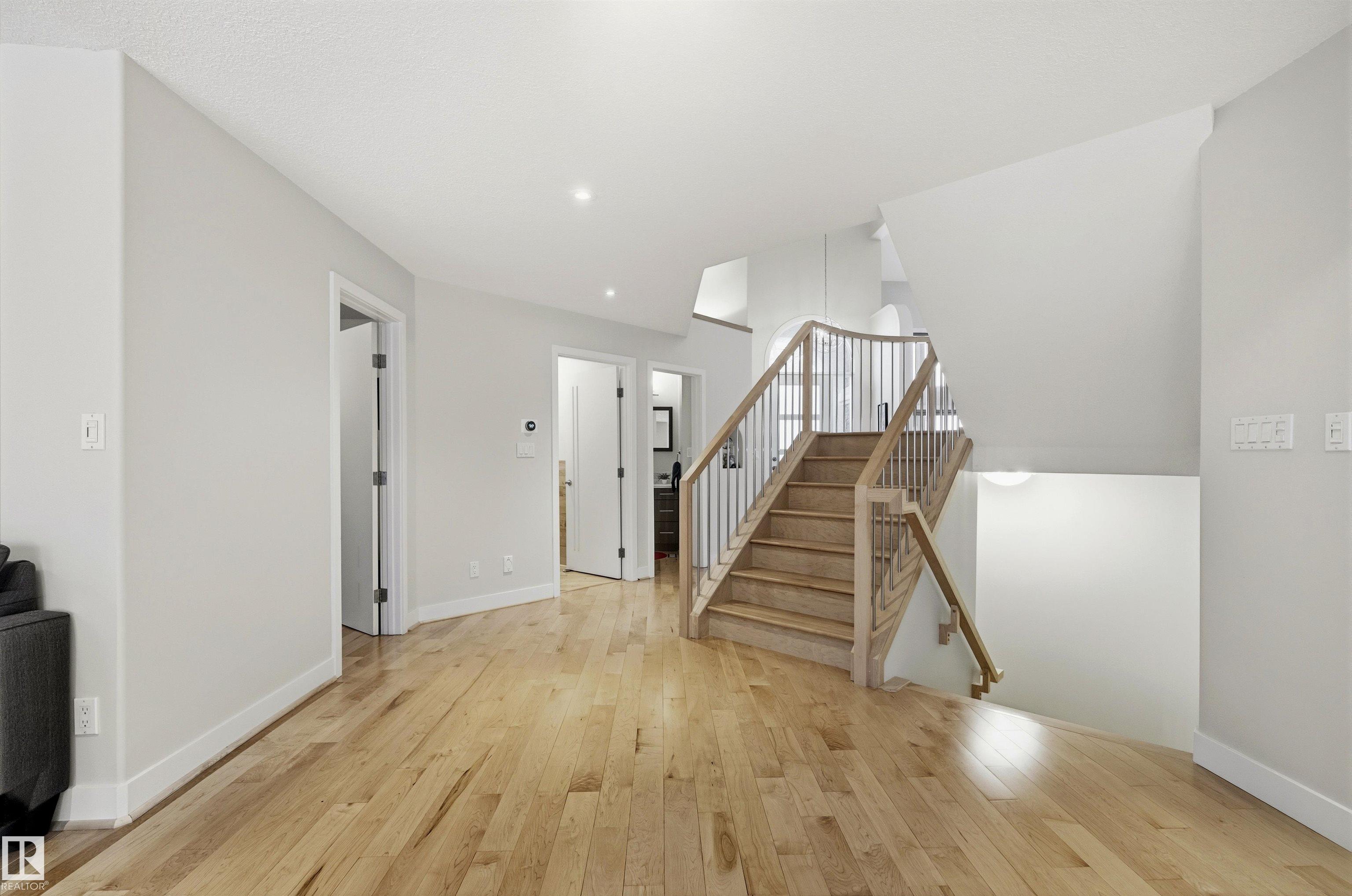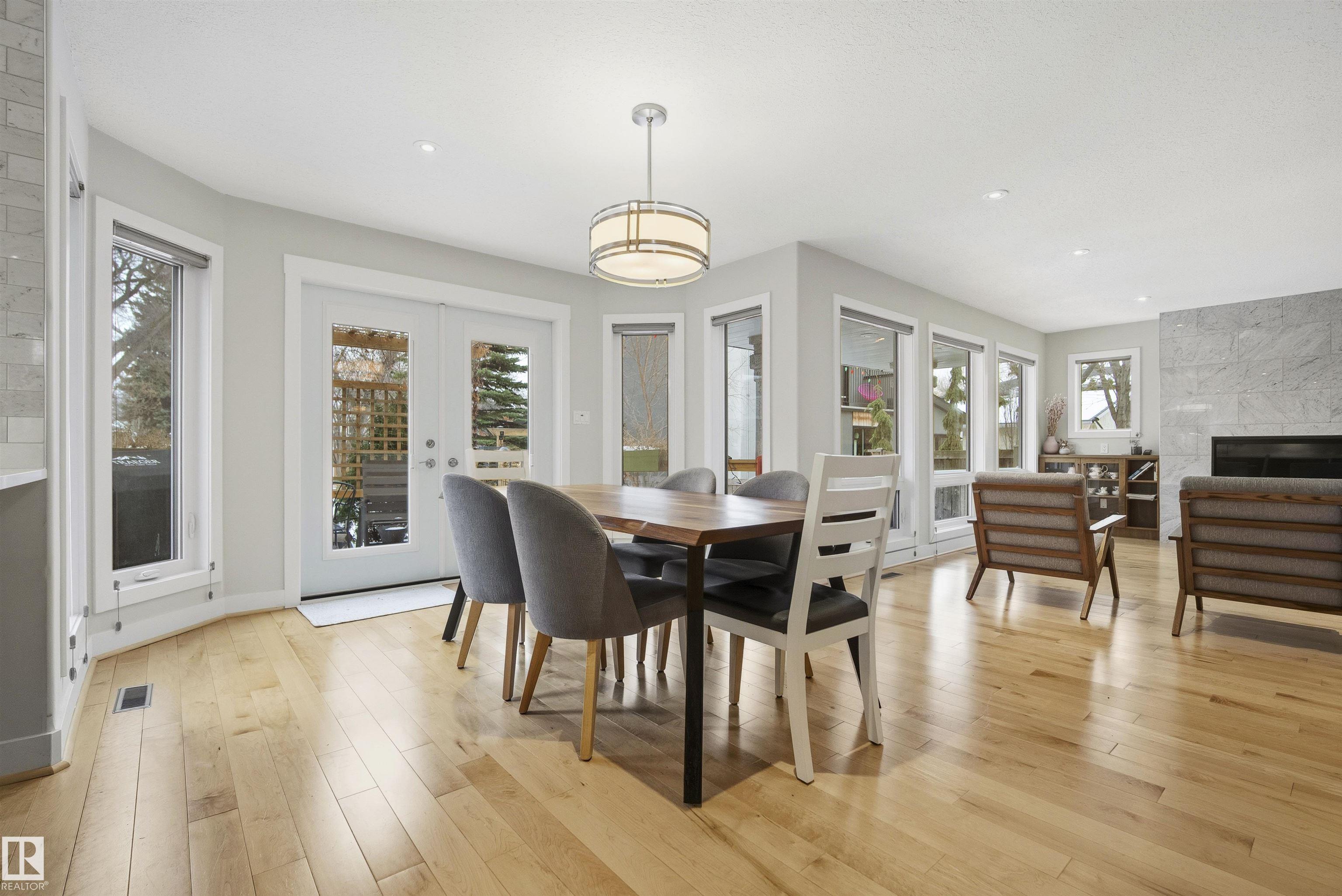 Modern traditional 2-storey in the heart of Bonnie Doon, steps to Mill Creek Ravine. Offering over 4,000 sq ft of living space, the warm hardwood floors and elevated modern finishes carry through every level. Soaring 20 ft ceilings, stacked windows, and open staircase create a dramatic first impression. The kitchen features quartz countertops, stainless steel appliances, and flat-panel cabinetry, flowing into the dining area with patio doors to a tree-lined yard and entertaining deck. A second living room wrapped in windows with a gas fireplace anchors the main floor, alongside an office and mudroom with access to the double attached garage. Upstairs, the primary retreat impresses with a spa-inspired ensuite and walk-in closet, joined by two additional bedrooms, a 5-piece bath, and laundry. The lower level has a family room with wet bar, gym space, 4th bedroom, full bath, and storage with garage access. Set on an expansive 50x185 lot ? steps to schools, ravine trails, and the best of Bonnie Doon living.
