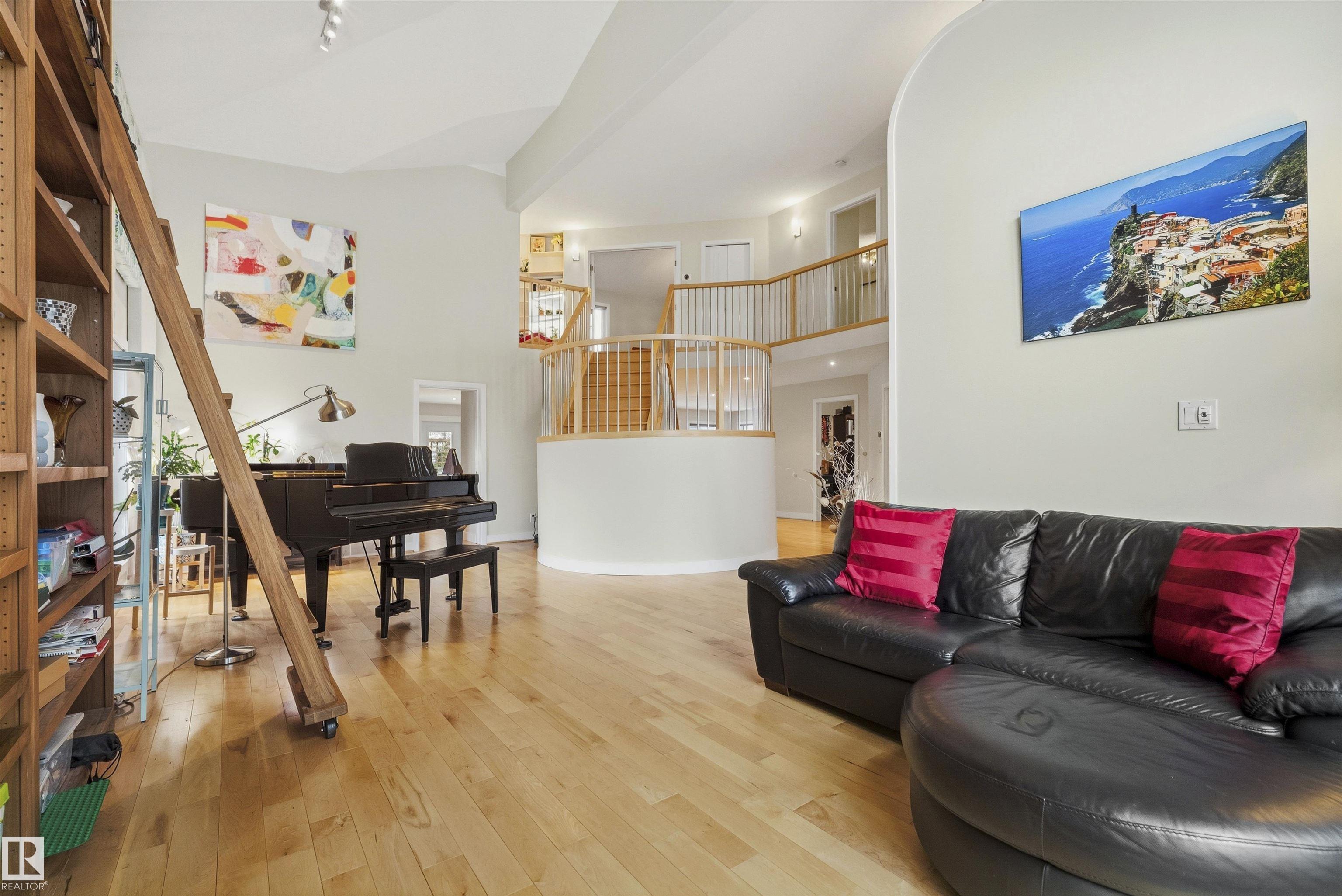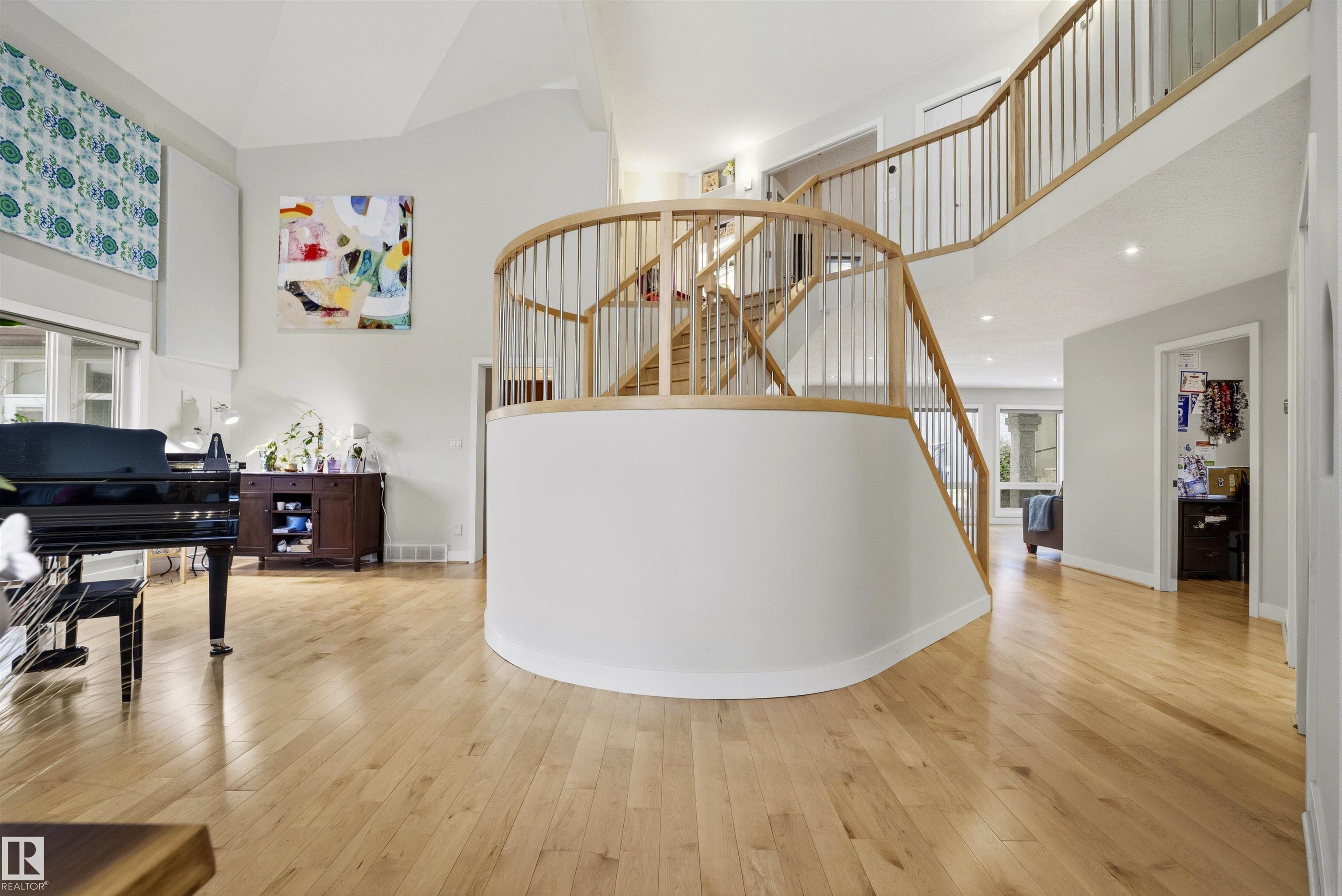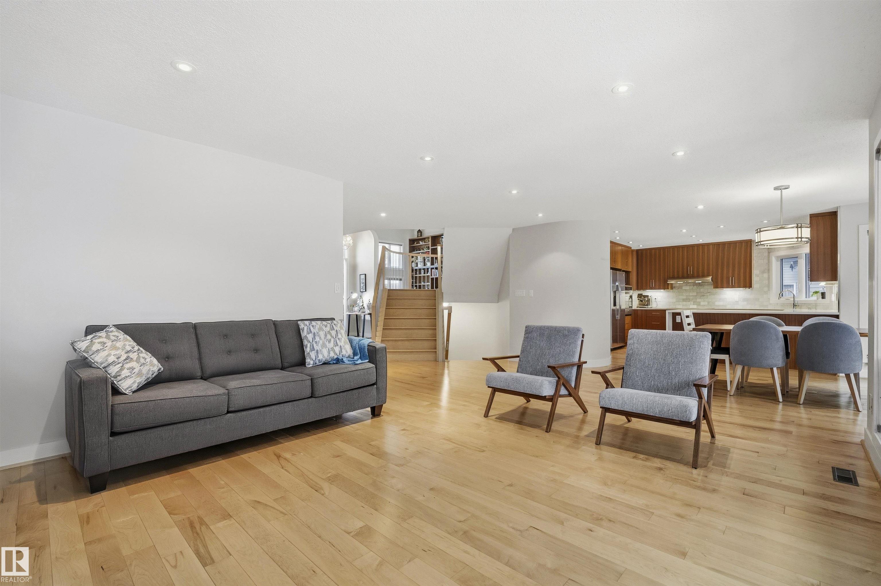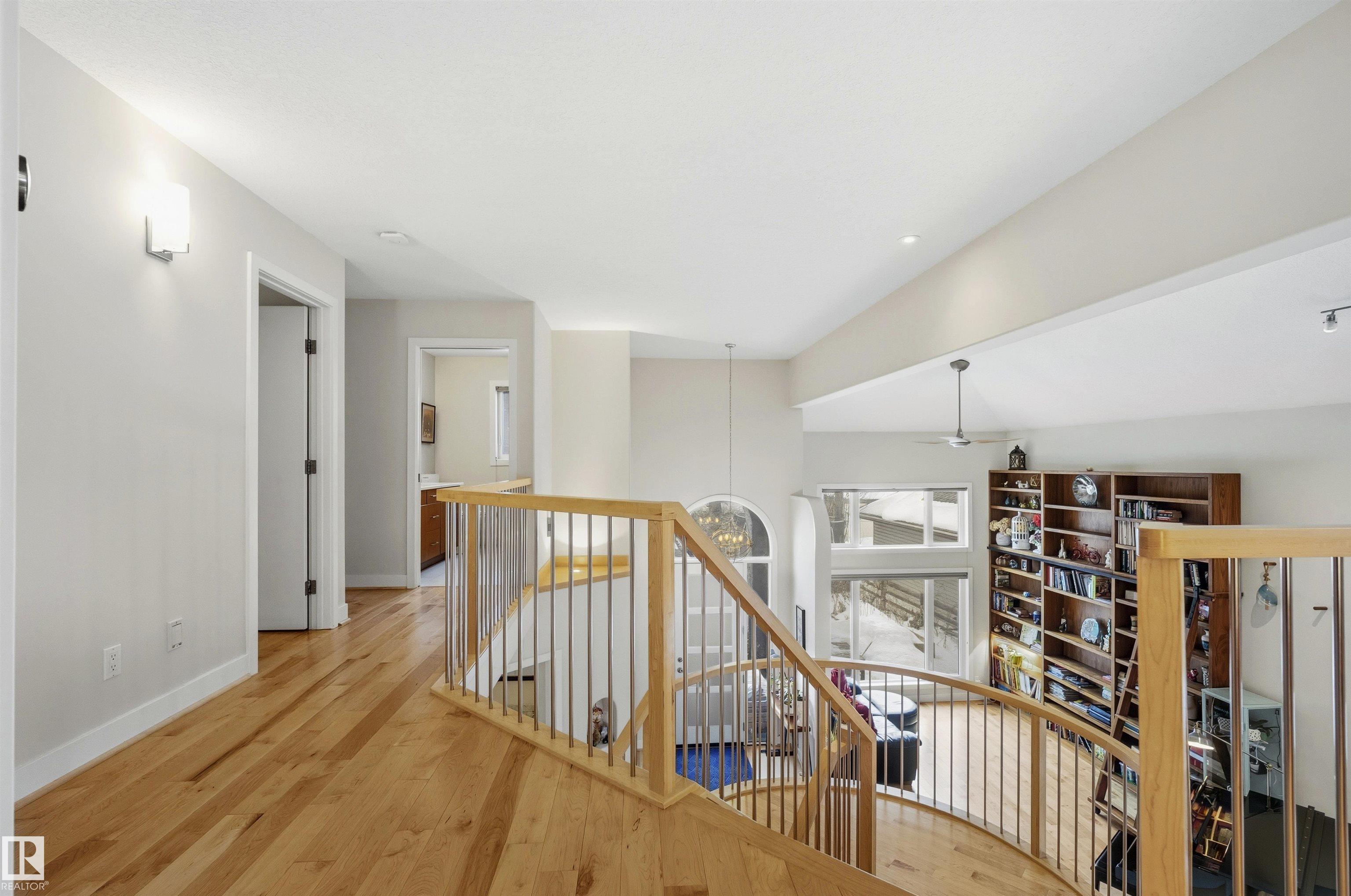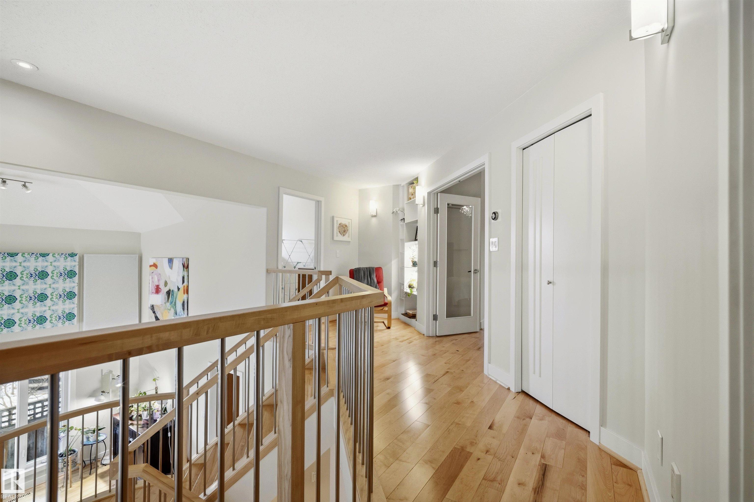 Modern traditional 2-storey in the heart of Bonnie Doon, steps to Mill Creek Ravine. Offering over 4,000 sq ft of living space, the warm hardwood floors and elevated modern finishes carry through every level. Soaring 20 ft ceilings, stacked windows, and open staircase create a dramatic first impression. The kitchen features quartz countertops, stainless steel appliances, and flat-panel cabinetry, flowing into the dining area with patio doors to a tree-lined yard and entertaining deck. A second living room wrapped in windows with a gas fireplace anchors the main floor, alongside an office and mudroom with access to the double attached garage. Upstairs, the primary retreat impresses with a spa-inspired ensuite and walk-in closet, joined by two additional bedrooms, a 5-piece bath, and laundry. The lower level has a family room with wet bar, gym space, 4th bedroom, full bath, and storage with garage access. Set on an expansive 50x185 lot ? steps to schools, ravine trails, and the best of Bonnie Doon living.