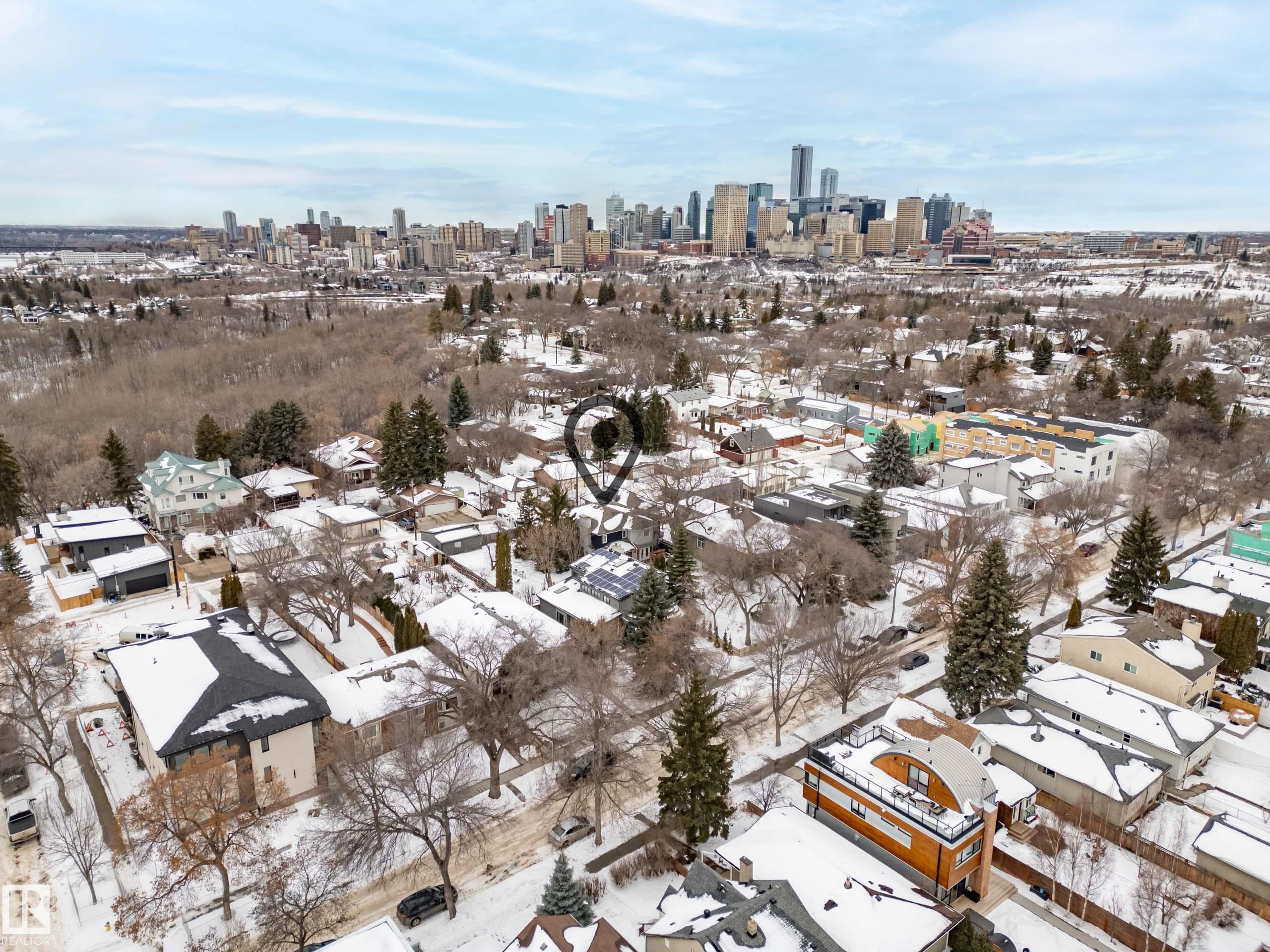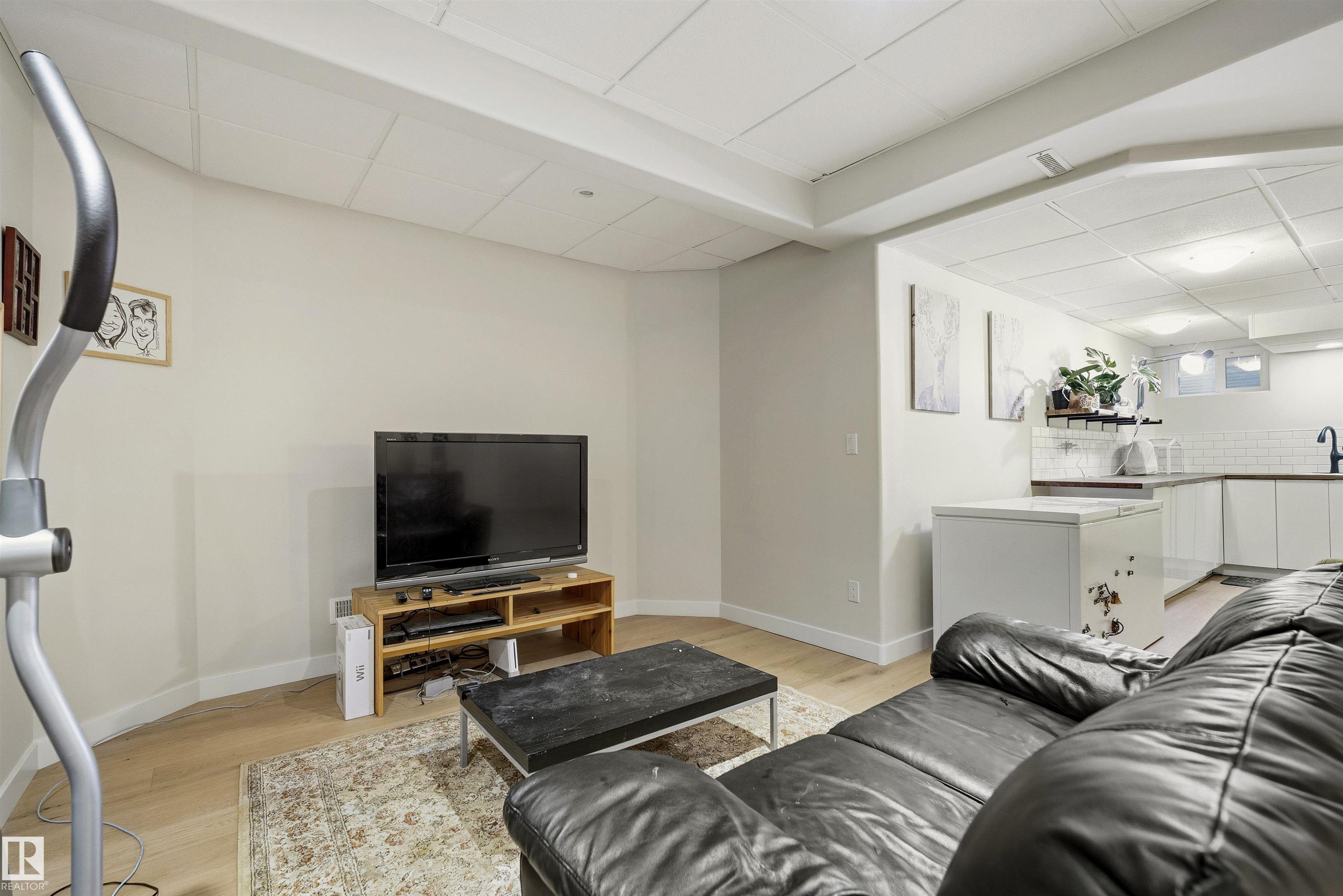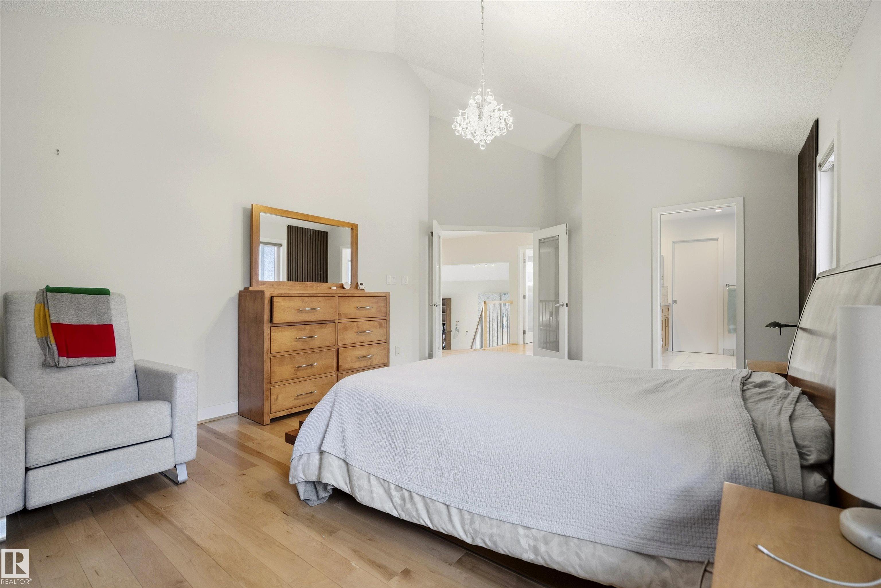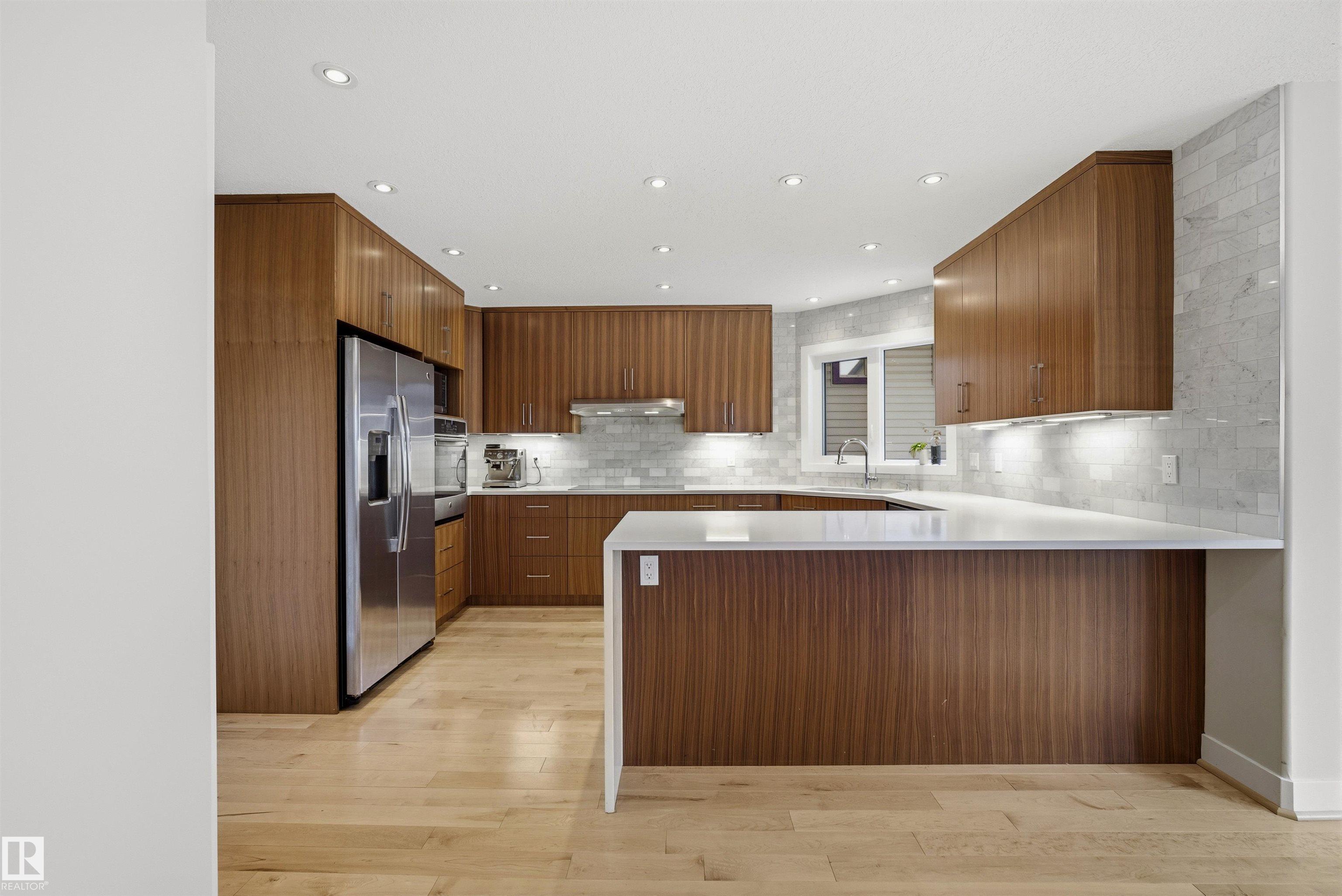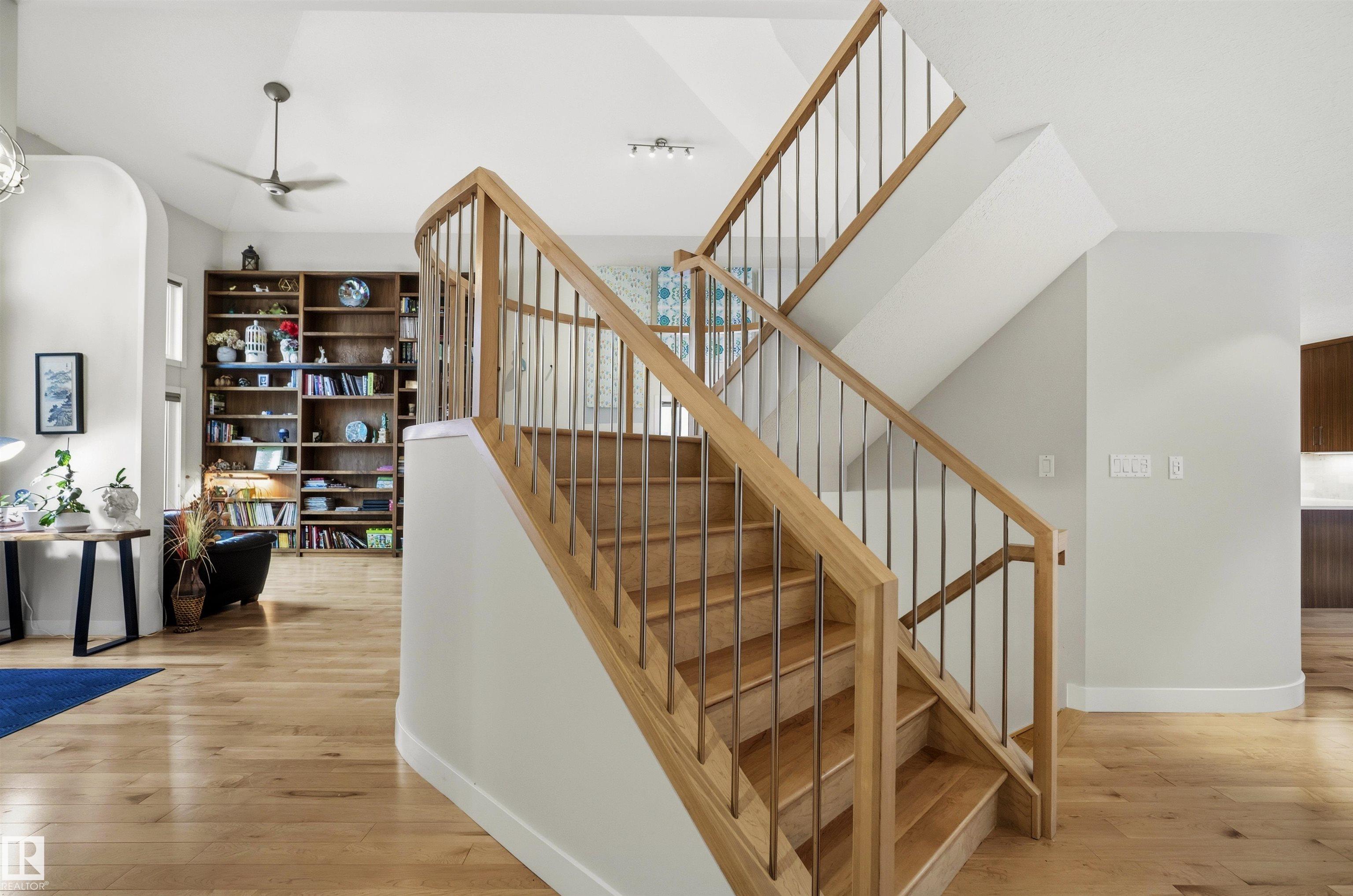 Modern traditional 2-storey in the heart of Bonnie Doon, steps to Mill Creek Ravine. Offering over 4,000 sq ft of living space, the warm hardwood floors and elevated modern finishes carry through every level. Soaring 20 ft ceilings, stacked windows, and open staircase create a dramatic first impression. The kitchen features quartz countertops, stainless steel appliances, and flat-panel cabinetry, flowing into the dining area with patio doors to a tree-lined yard and entertaining deck. A second living room wrapped in windows with a gas fireplace anchors the main floor, alongside an office and mudroom with access to the double attached garage. Upstairs, the primary retreat impresses with a spa-inspired ensuite and walk-in closet, joined by two additional bedrooms, a 5-piece bath, and laundry. The lower level has a family room with wet bar, gym space, 4th bedroom, full bath, and storage with garage access. Set on an expansive 50x185 lot ? steps to schools, ravine trails, and the best of Bonnie Doon living.