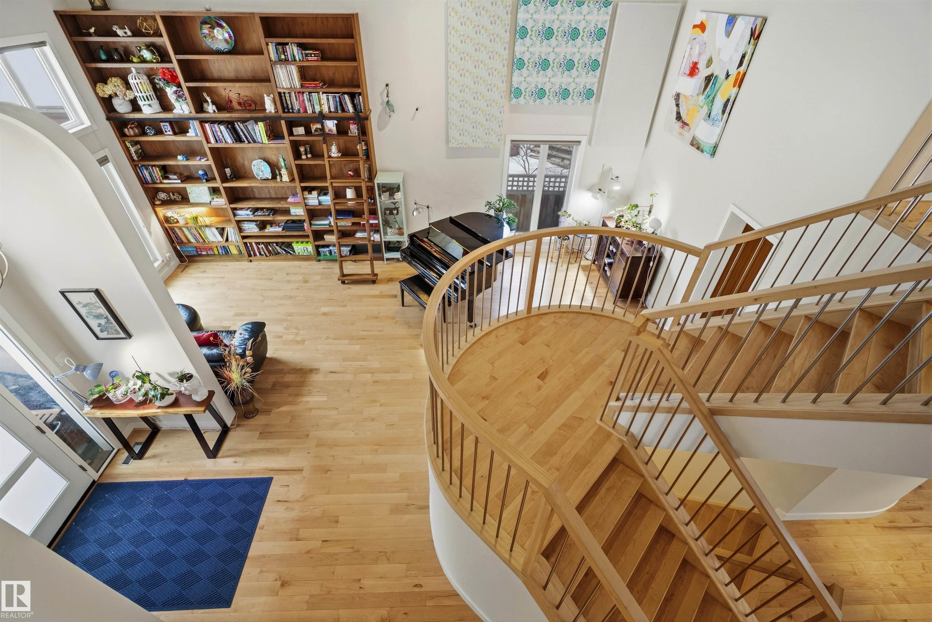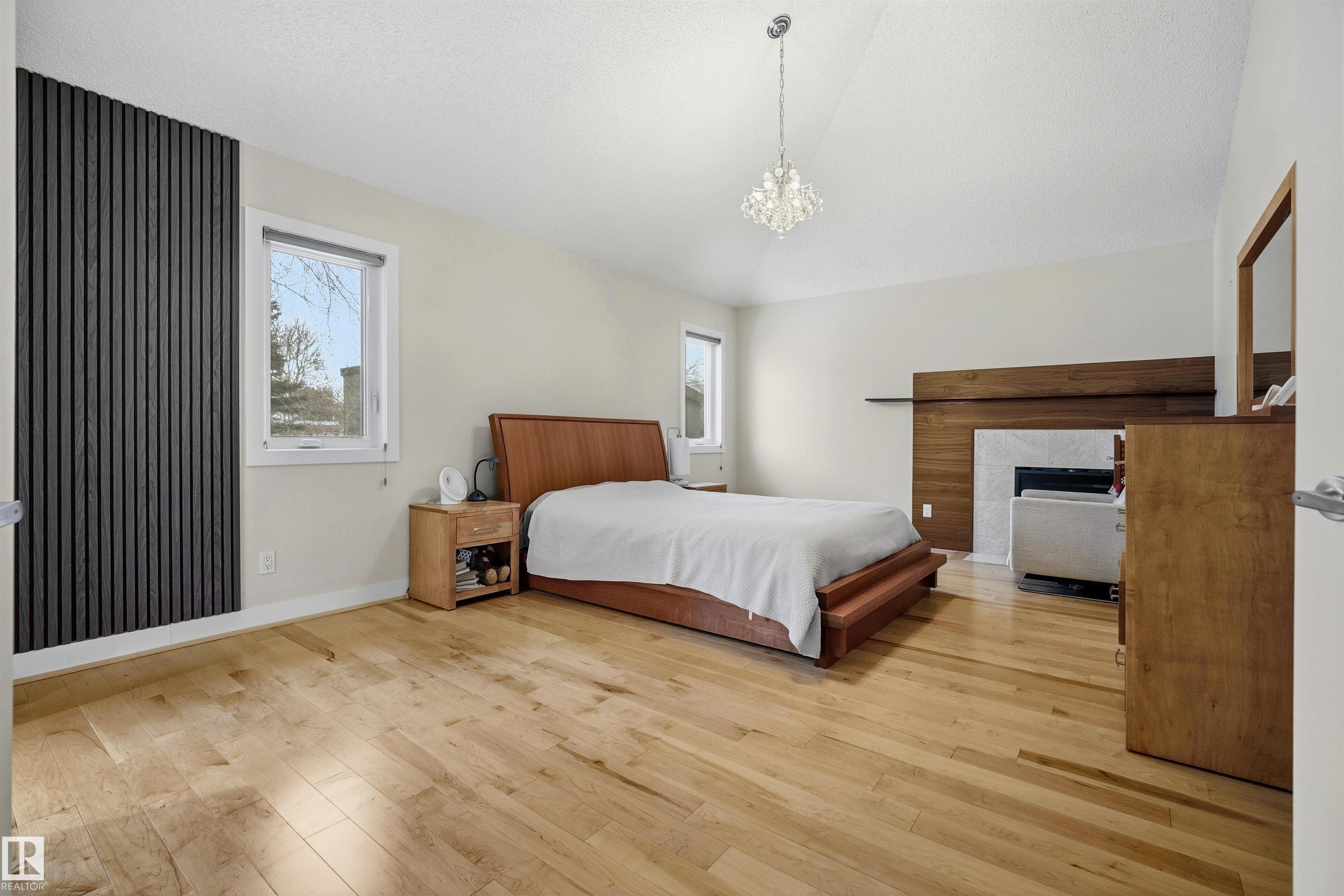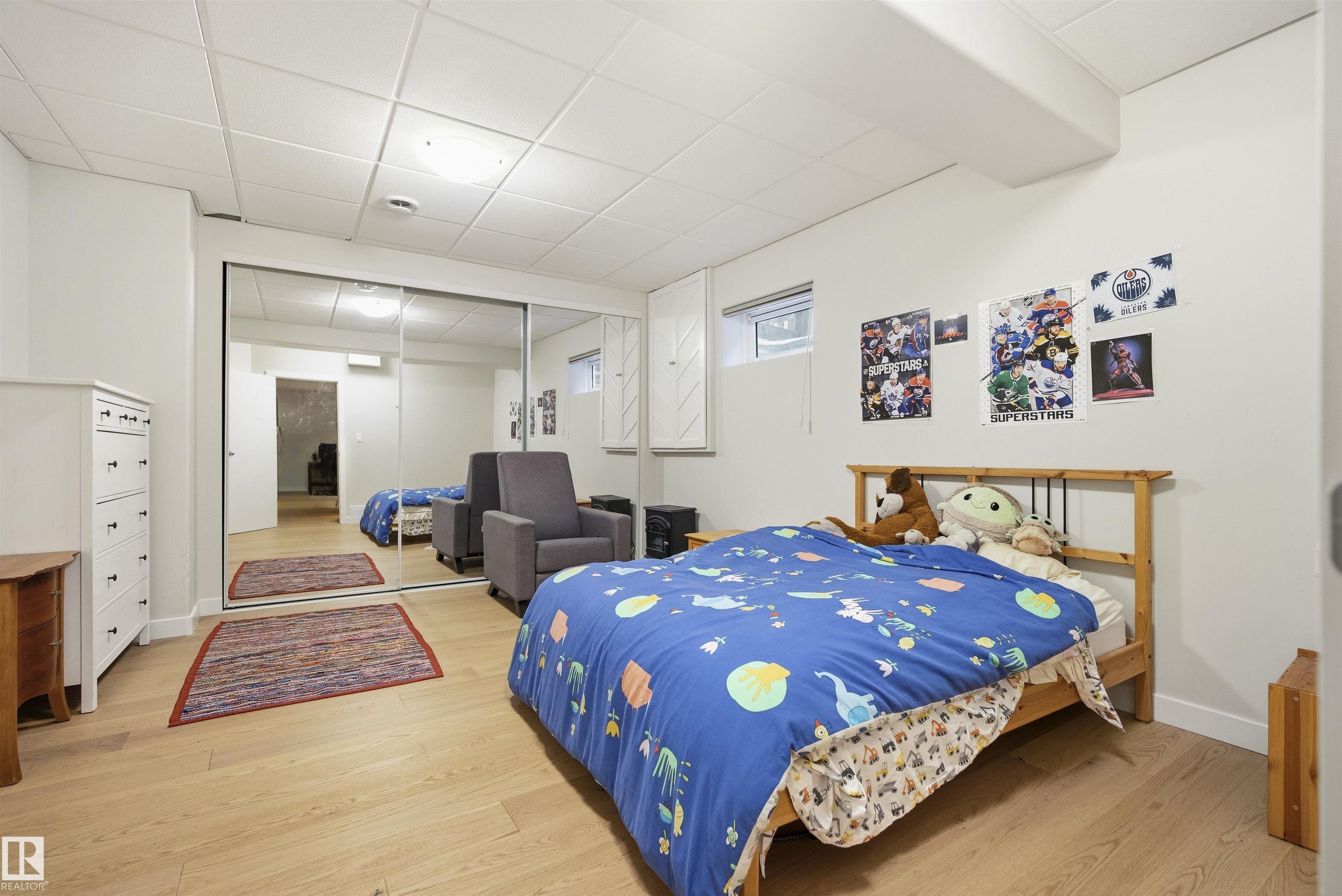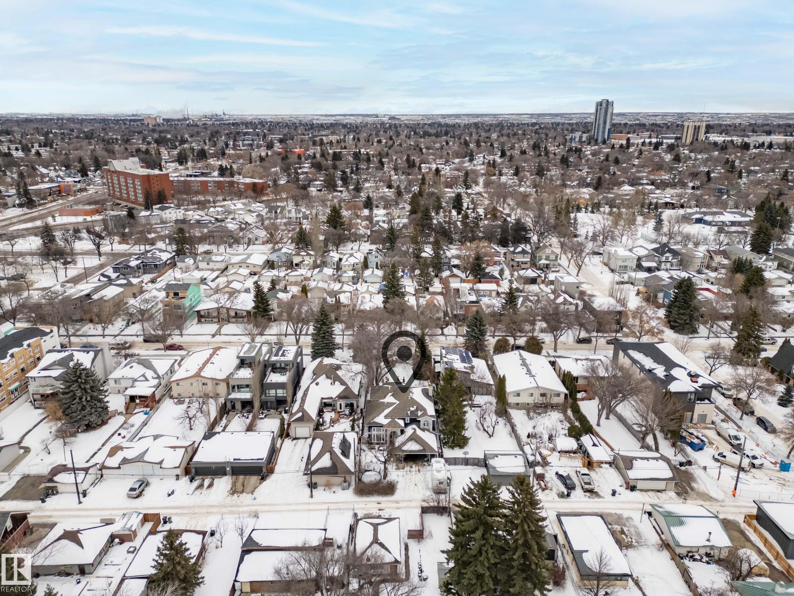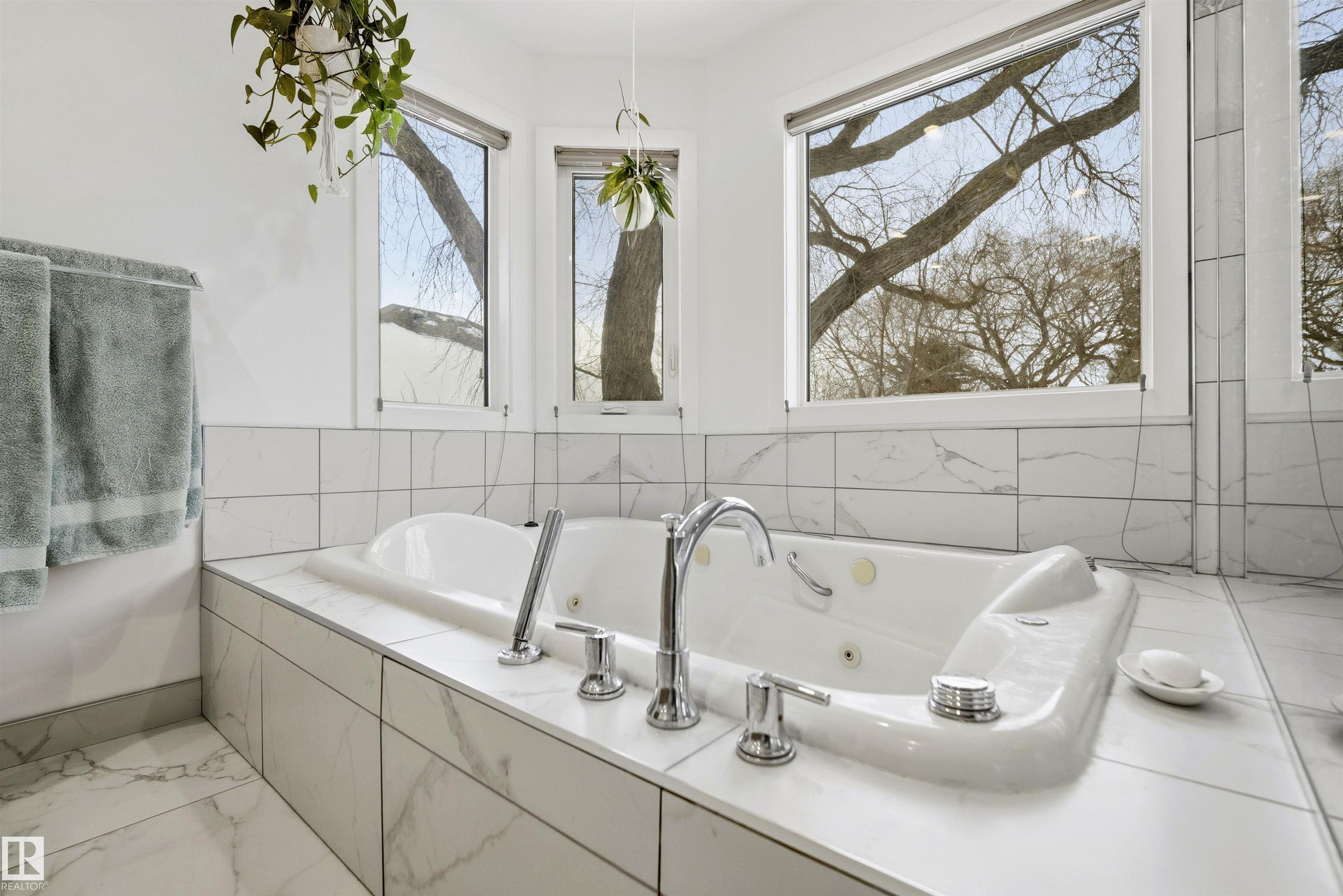 Modern traditional 2-storey in the heart of Bonnie Doon, steps to Mill Creek Ravine. Offering over 4,000 sq ft of living space, the warm hardwood floors and elevated modern finishes carry through every level. Soaring 20 ft ceilings, stacked windows, and open staircase create a dramatic first impression. The kitchen features quartz countertops, stainless steel appliances, and flat-panel cabinetry, flowing into the dining area with patio doors to a tree-lined yard and entertaining deck. A second living room wrapped in windows with a gas fireplace anchors the main floor, alongside an office and mudroom with access to the double attached garage. Upstairs, the primary retreat impresses with a spa-inspired ensuite and walk-in closet, joined by two additional bedrooms, a 5-piece bath, and laundry. The lower level has a family room with wet bar, gym space, 4th bedroom, full bath, and storage with garage access. Set on an expansive 50x185 lot ? steps to schools, ravine trails, and the best of Bonnie Doon living.