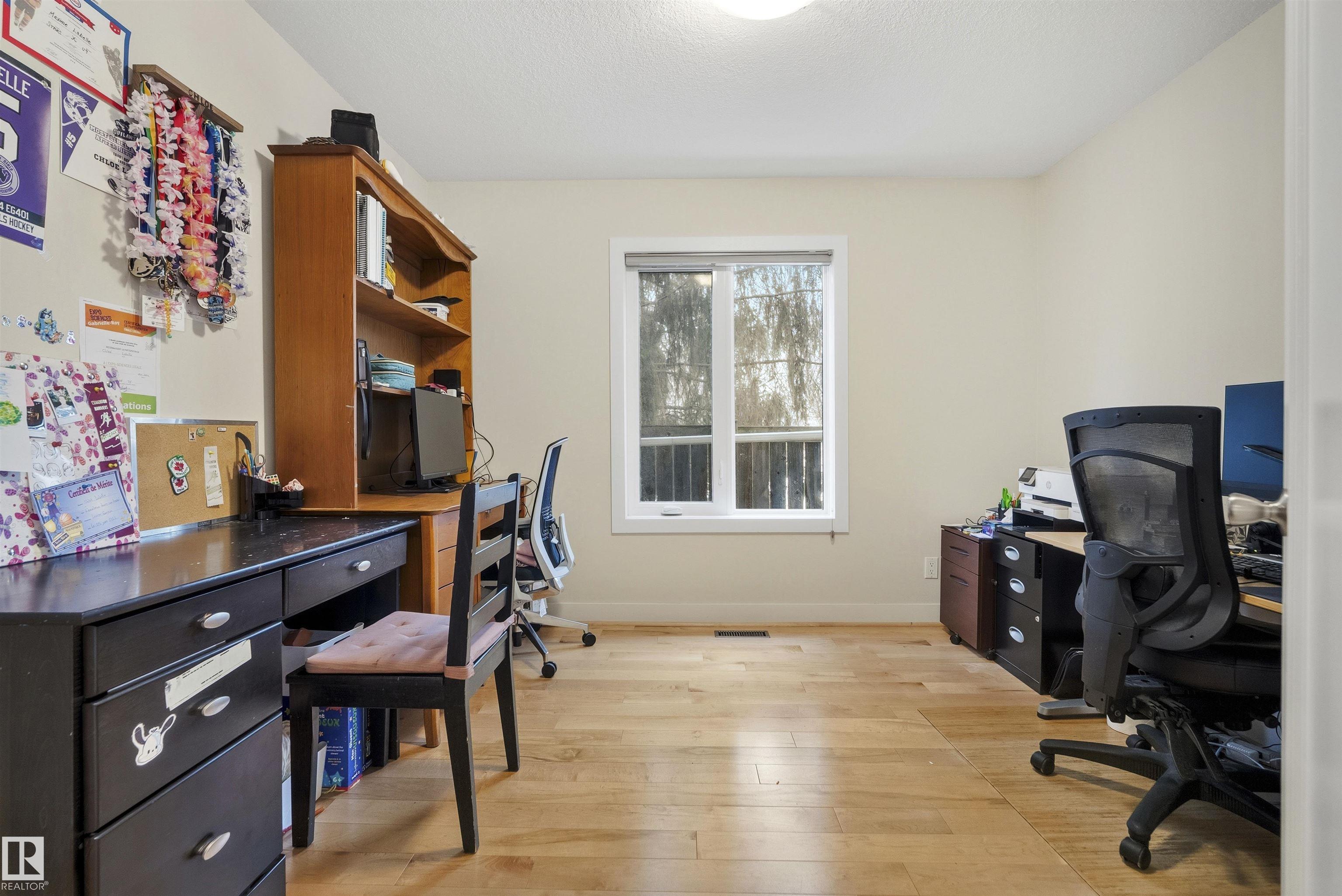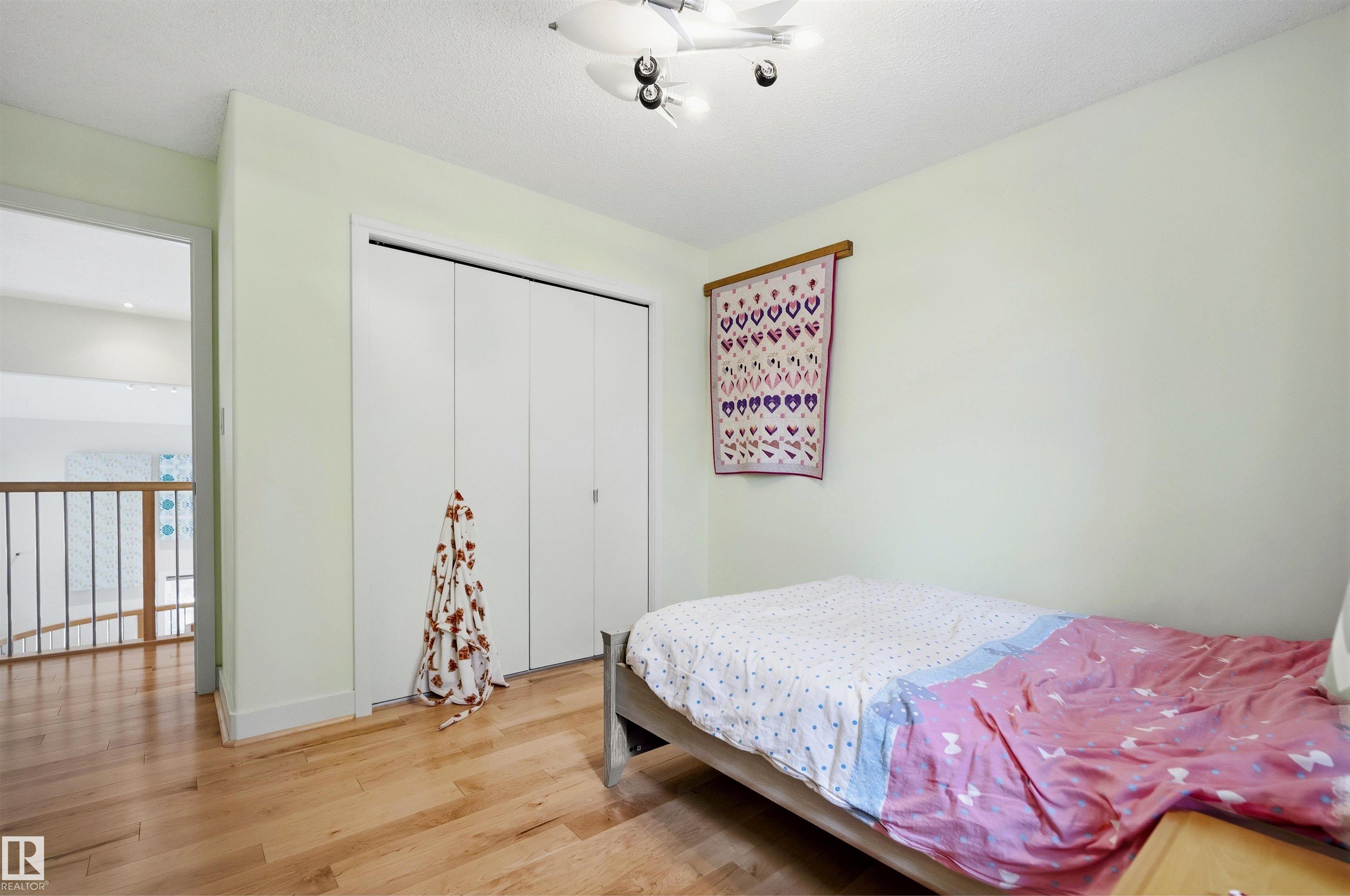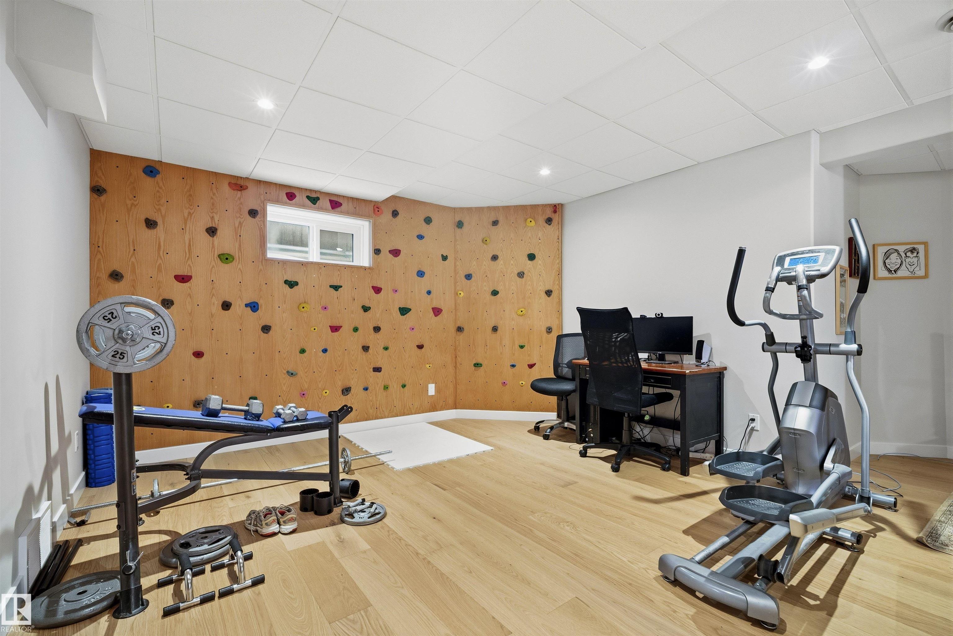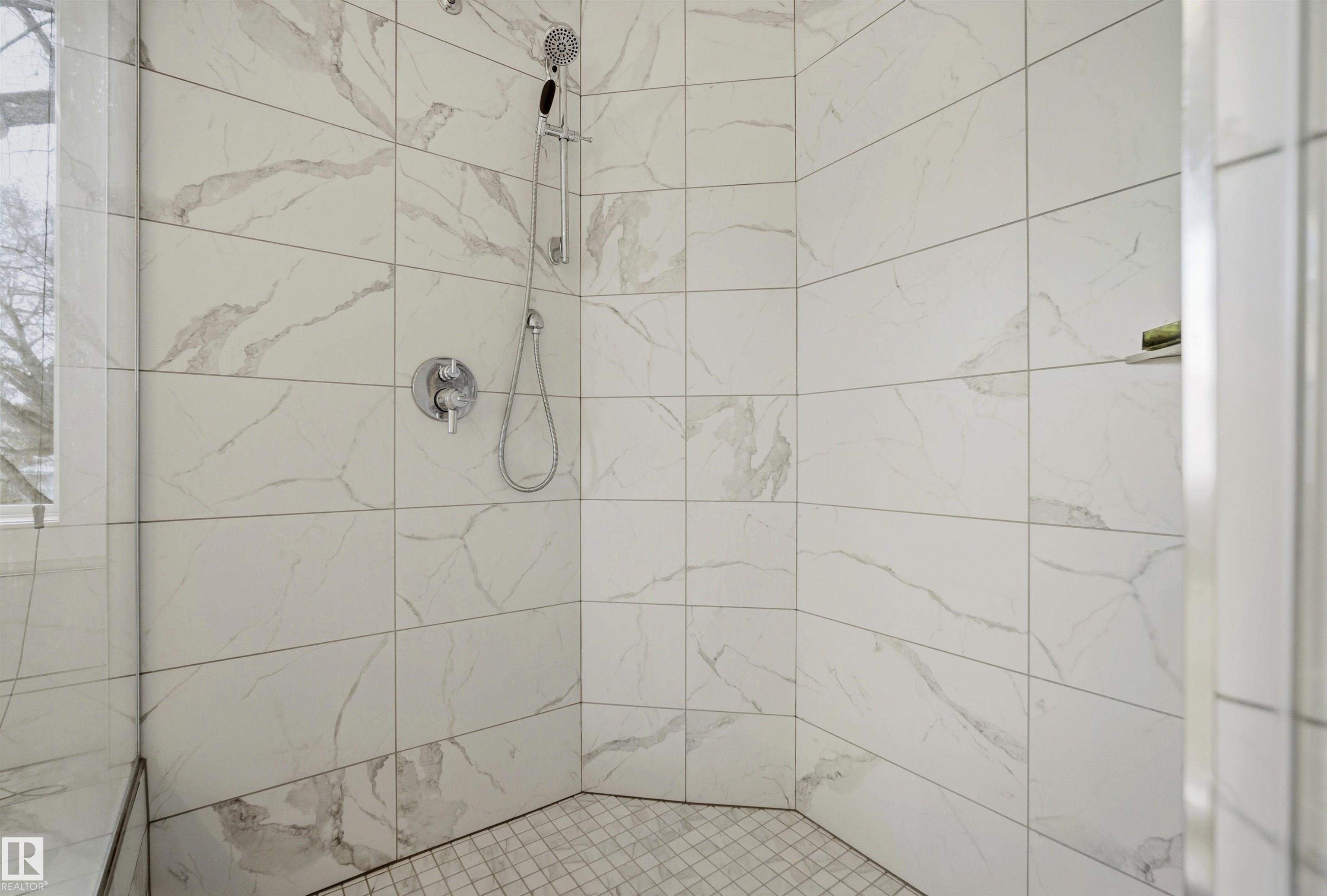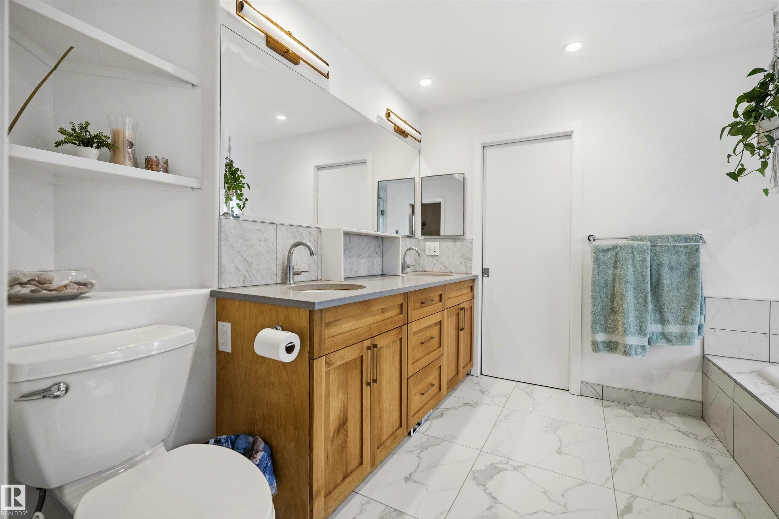 Modern traditional 2-storey in the heart of Bonnie Doon, steps to Mill Creek Ravine. Offering over 4,000 sq ft of living space, the warm hardwood floors and elevated modern finishes carry through every level. Soaring 20 ft ceilings, stacked windows, and open staircase create a dramatic first impression. The kitchen features quartz countertops, stainless steel appliances, and flat-panel cabinetry, flowing into the dining area with patio doors to a tree-lined yard and entertaining deck. A second living room wrapped in windows with a gas fireplace anchors the main floor, alongside an office and mudroom with access to the double attached garage. Upstairs, the primary retreat impresses with a spa-inspired ensuite and walk-in closet, joined by two additional bedrooms, a 5-piece bath, and laundry. The lower level has a family room with wet bar, gym space, 4th bedroom, full bath, and storage with garage access. Set on an expansive 50x185 lot ? steps to schools, ravine trails, and the best of Bonnie Doon living.