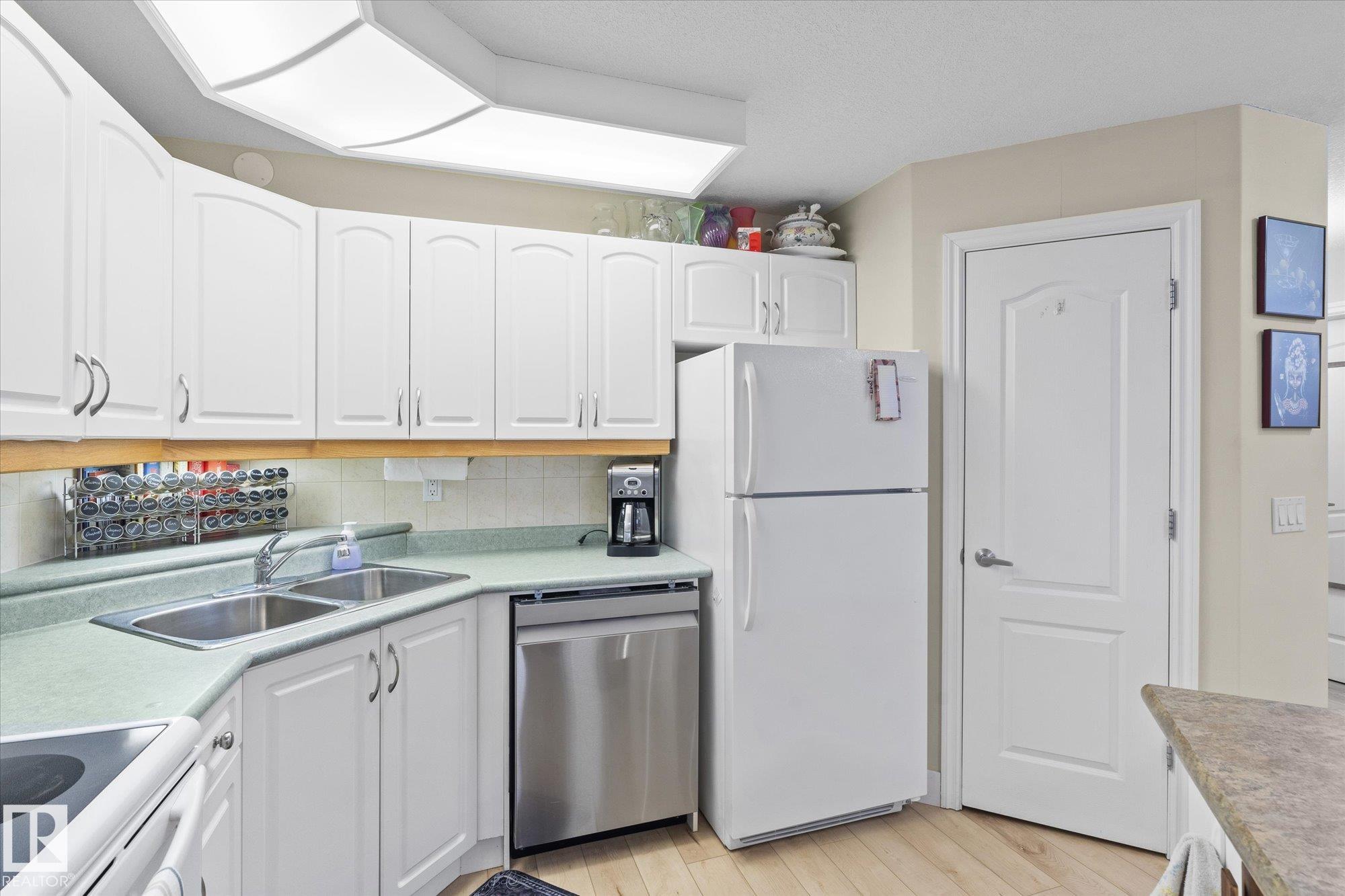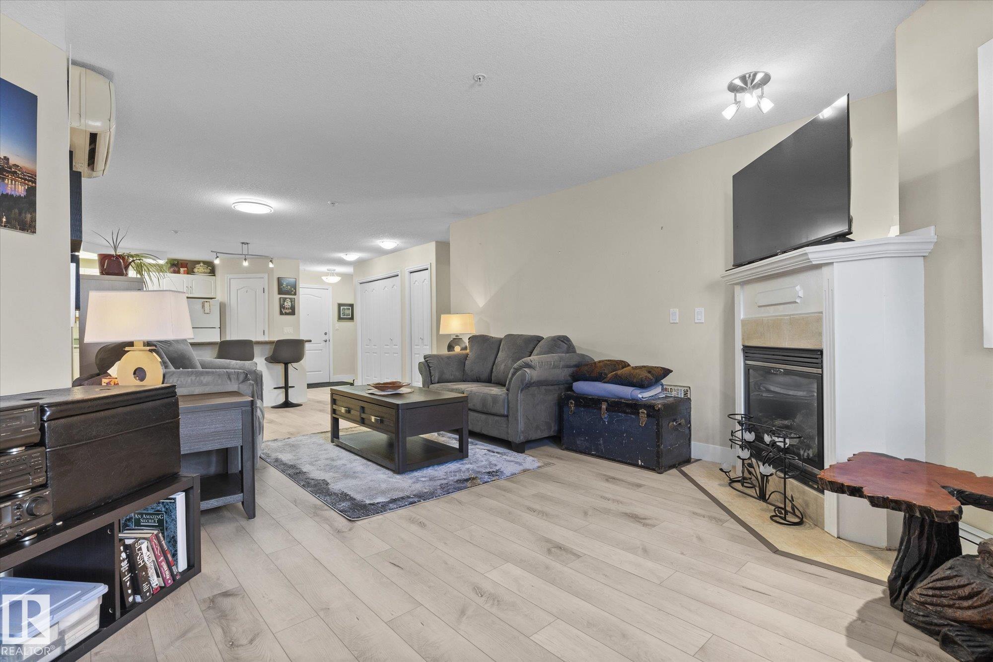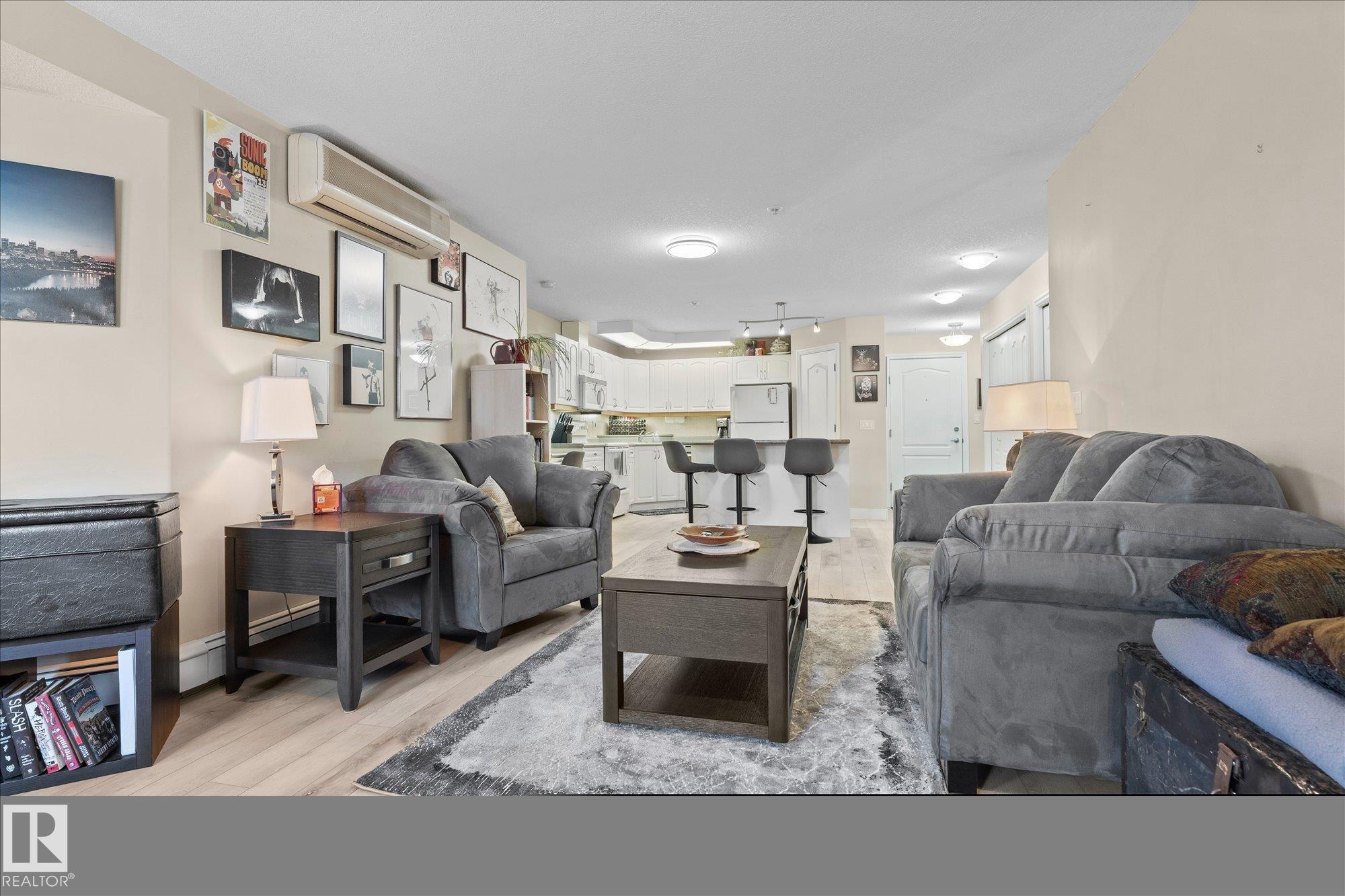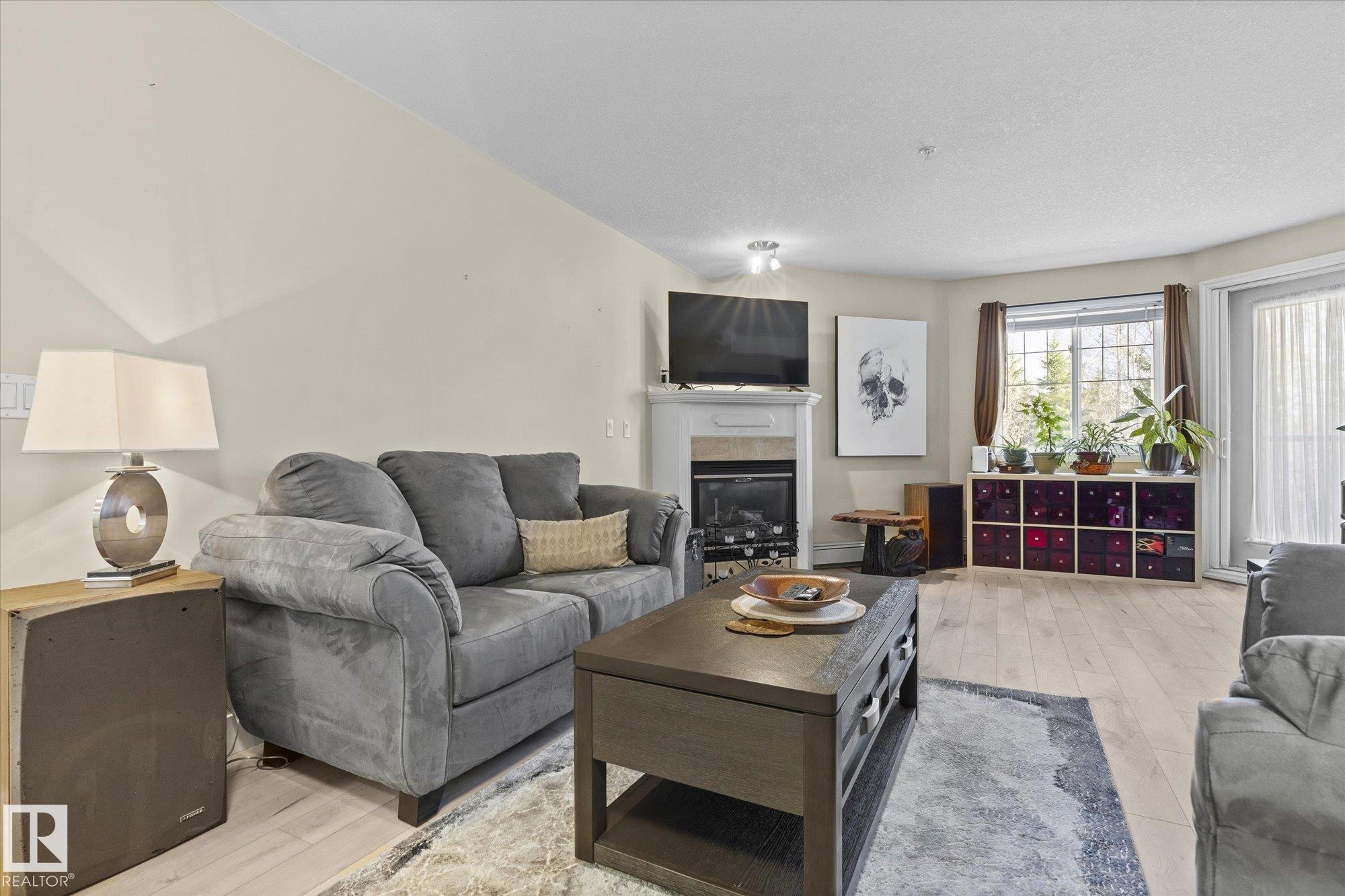 Welcome to this beautiful main floor condo in a sought-after 45+ community, offering comfort, convenience and a fantastic layout. The bright open-concept living and kitchen area is perfect for entertaining or relaxing at home. The living room and spacious primary bedroom both open onto a private patio overlooking peaceful green space, creating a quiet retreat to enjoy your morning coffee or evening unwind. The patio also features a natural gas hookup, perfect for easy outdoor grilling. This well-designed home offers 2 generous bedrooms and 2 full bathrooms, plus the convenience of in-suite laundry and ample storage. Updated vinyl plank flooring provides a modern look with easy maintenance. Enjoy the added value of heat and water included in the condo fees. A rare bonus is the extra-wide underground parking stall with additional storage. Stay comfortable year-round with air conditioning. A fantastic opportunity in a great location!